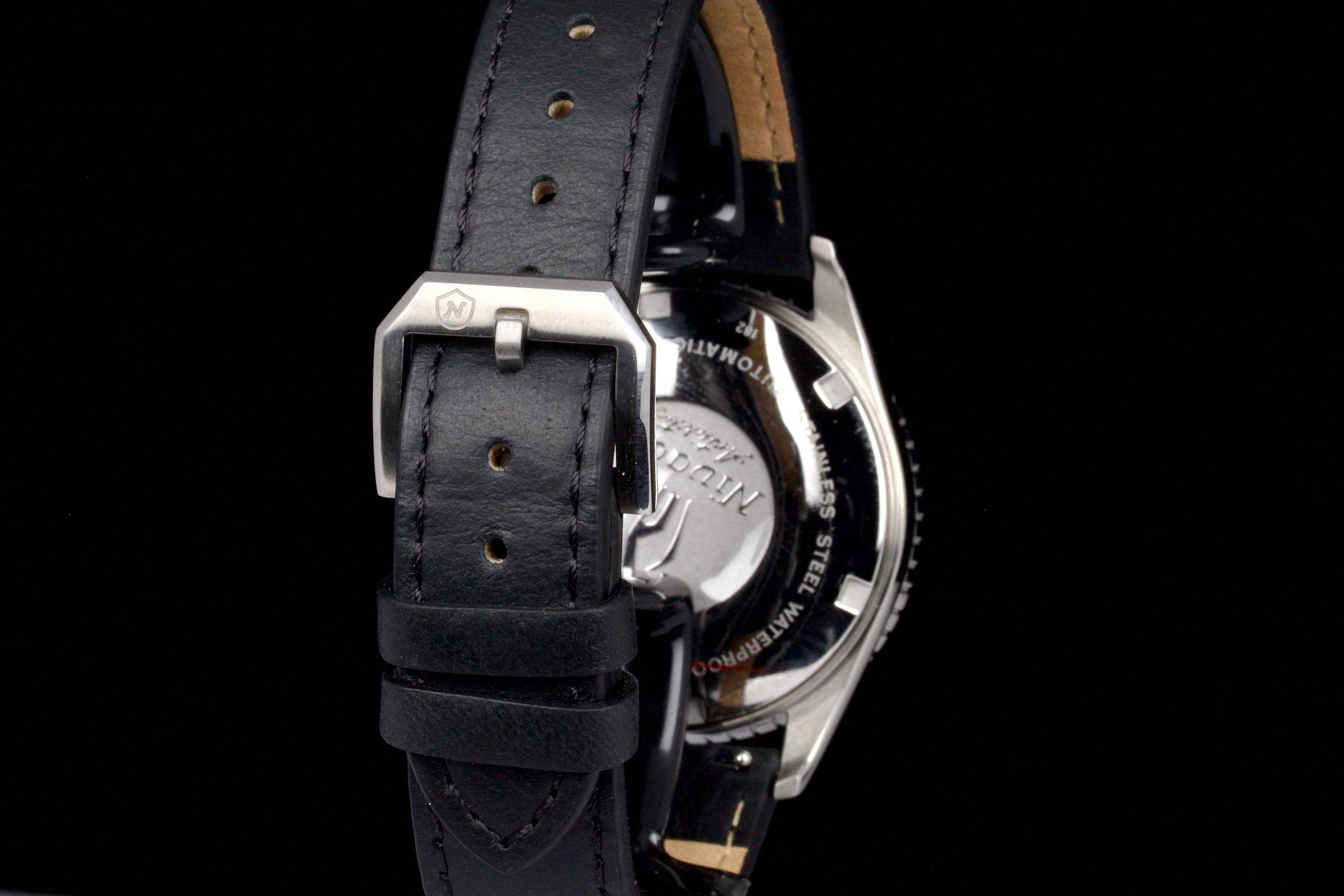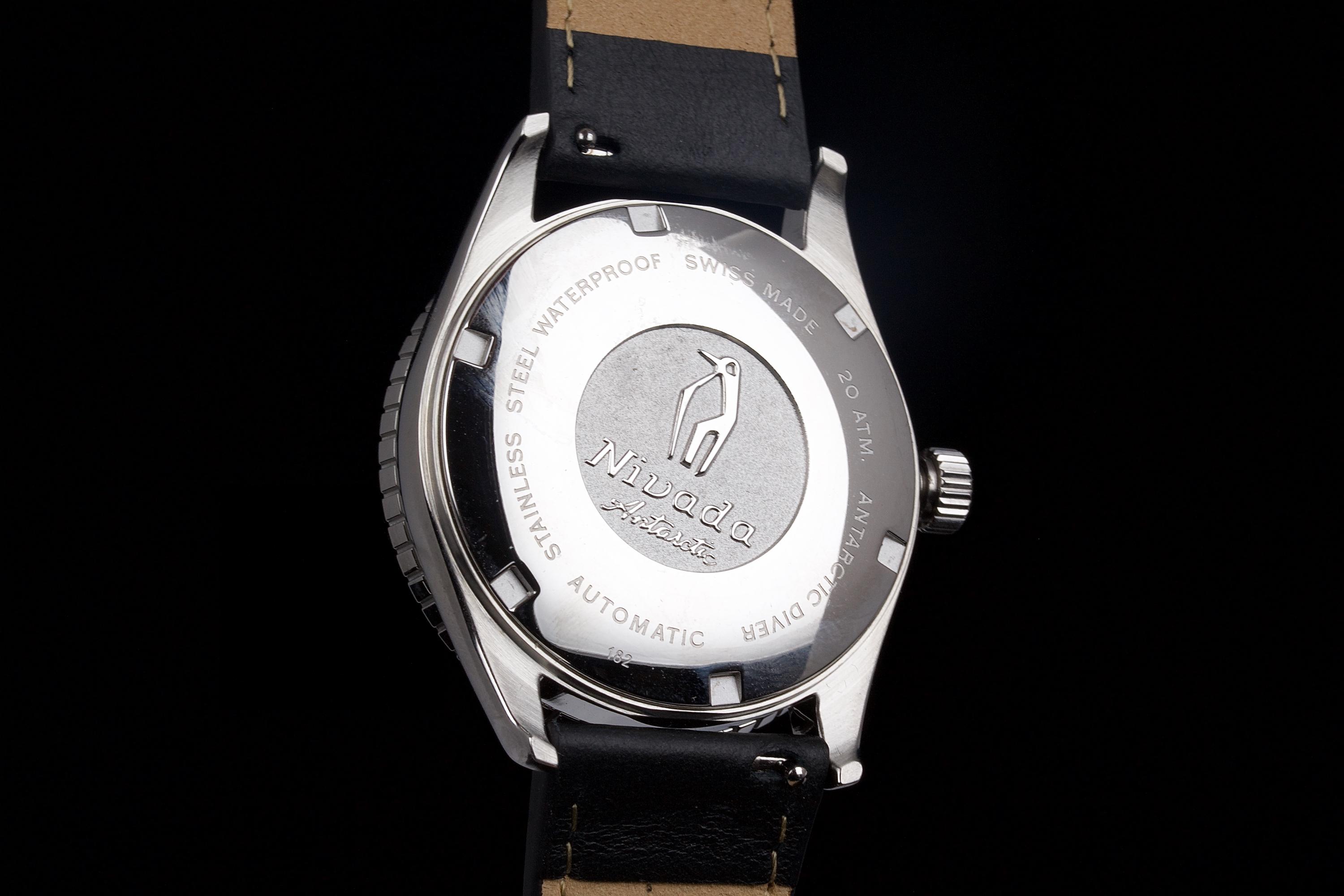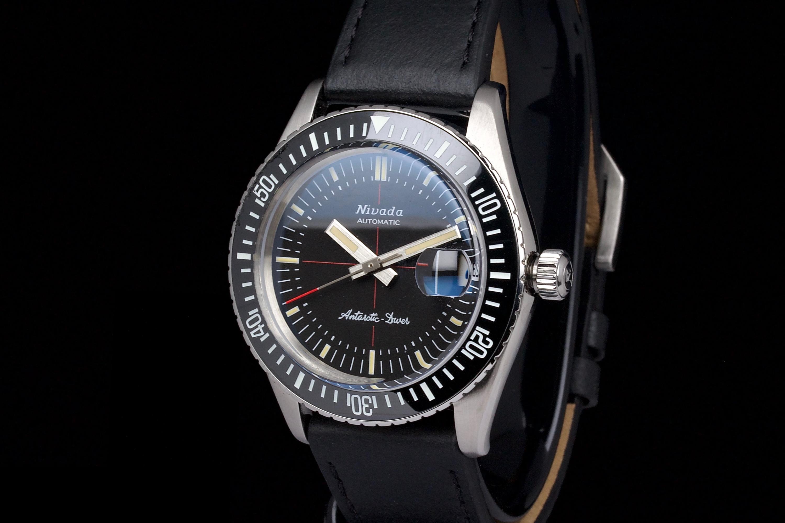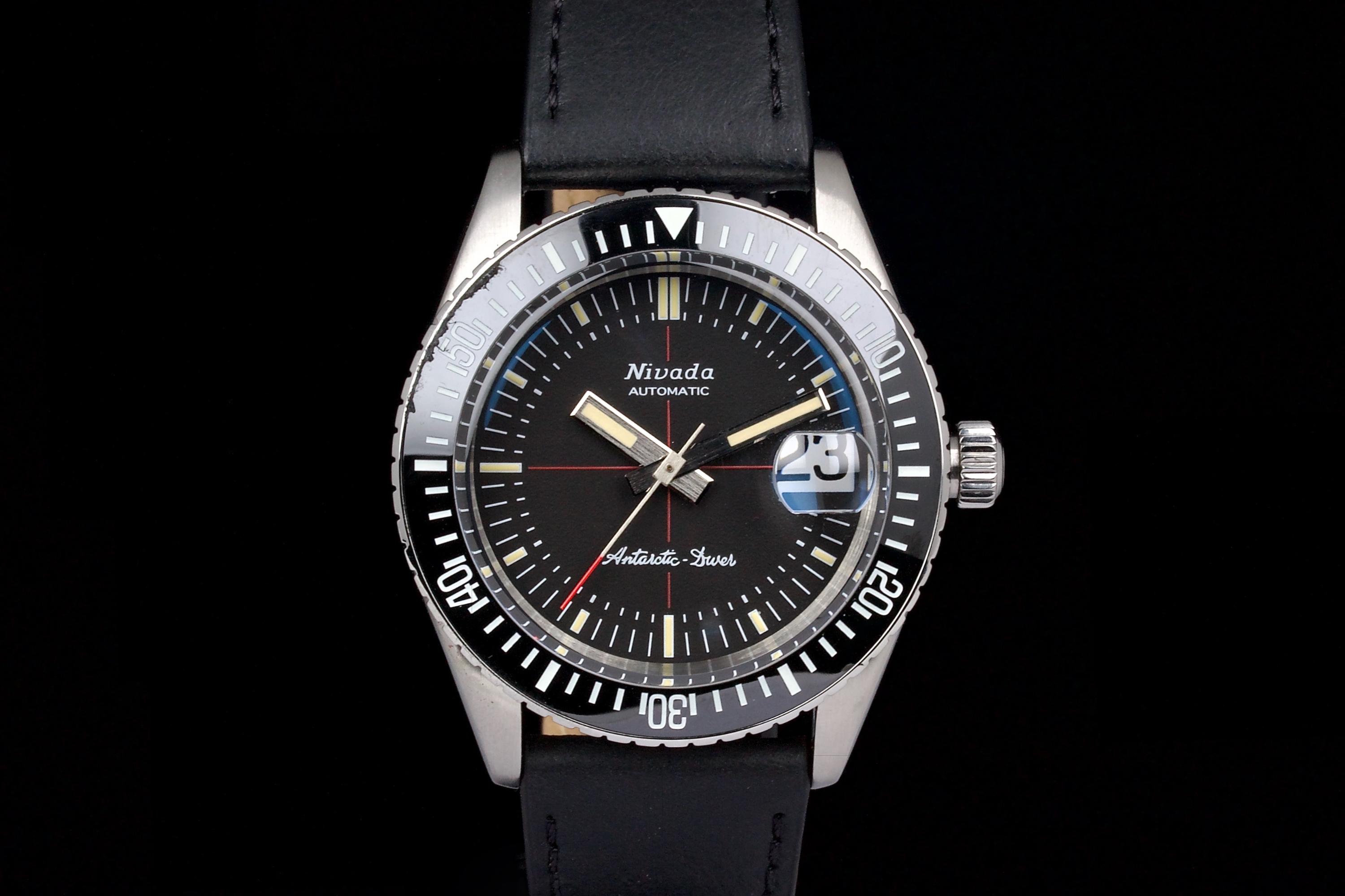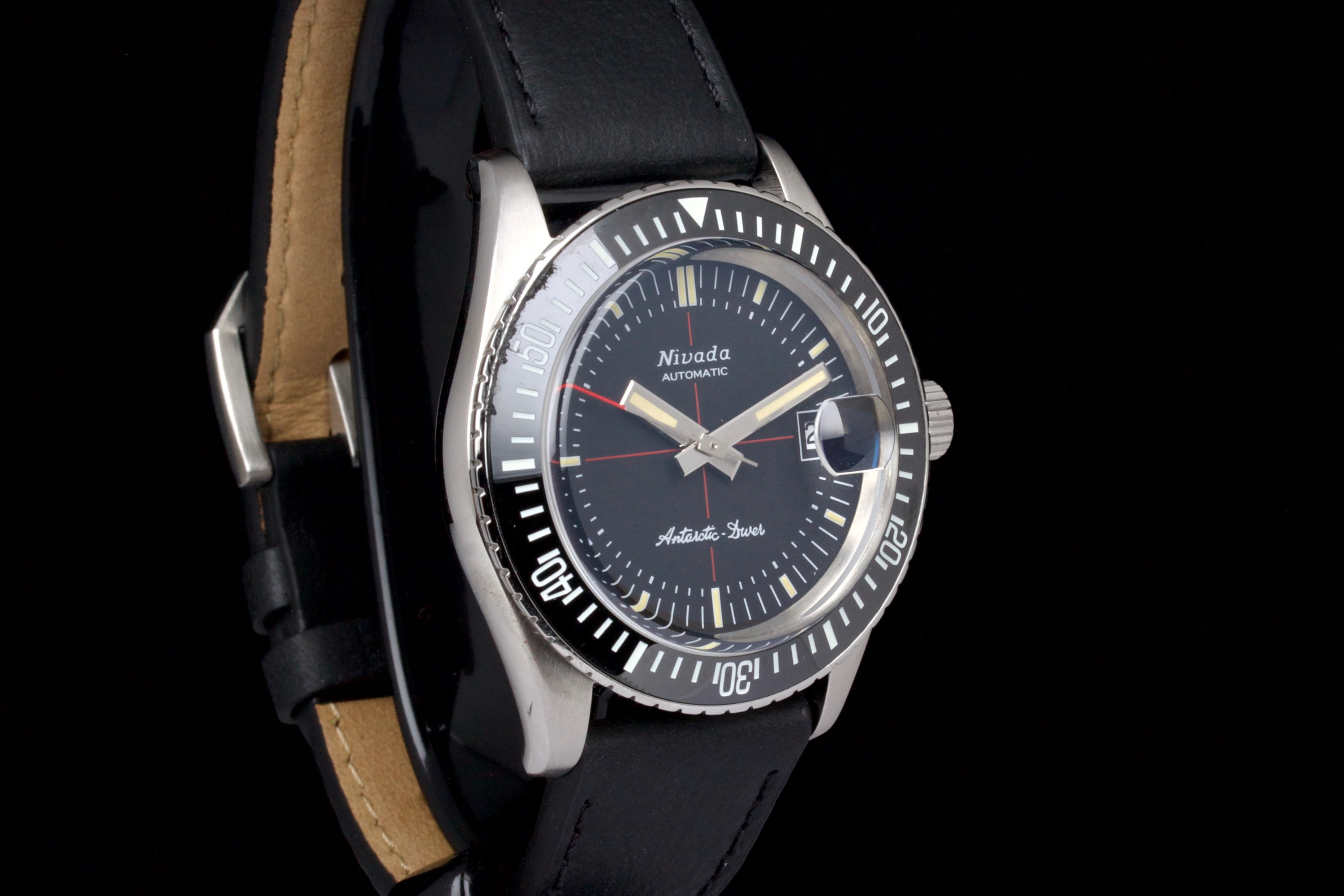 Presented in like-new condition, showing virtually no signs of wear. This modern re-edition of the historic Antarctic Diver is fitted with a black leather strap, offering a vintage-inspired look while remaining versatile for daily wear. Powered by an automatic movement and featuring a rotating dive bezel, date display at 3 o’clock, and robust stainless steel case, the watch delivers classic tool-watch charm with modern reliability. Complete with its original box, warranty card and accessories. A great opportunity to own a like-new example of this popular Nivada model, combining heritage design and contemporary build quality.