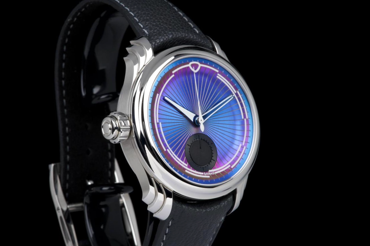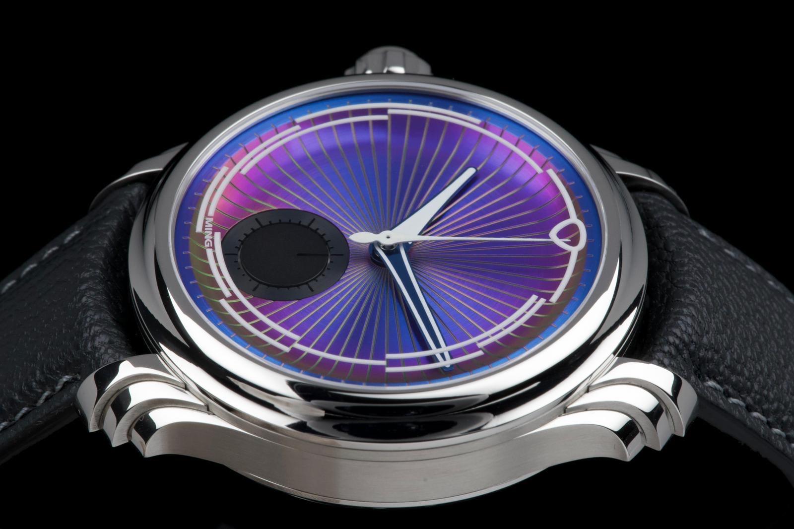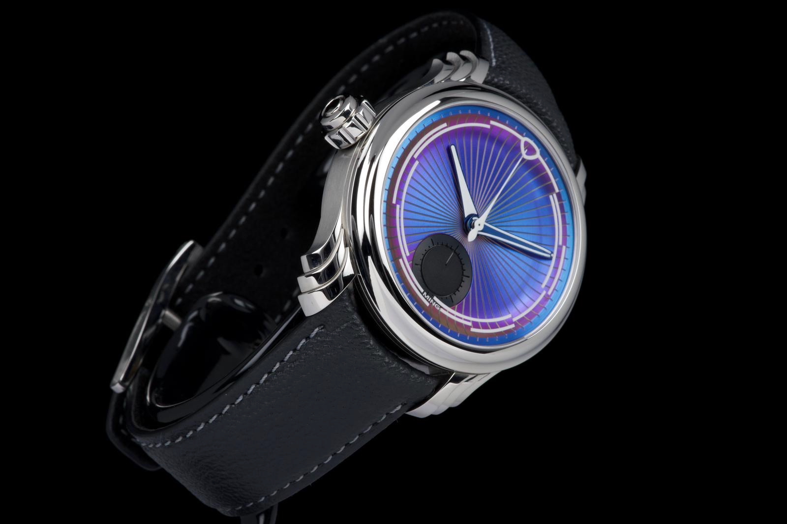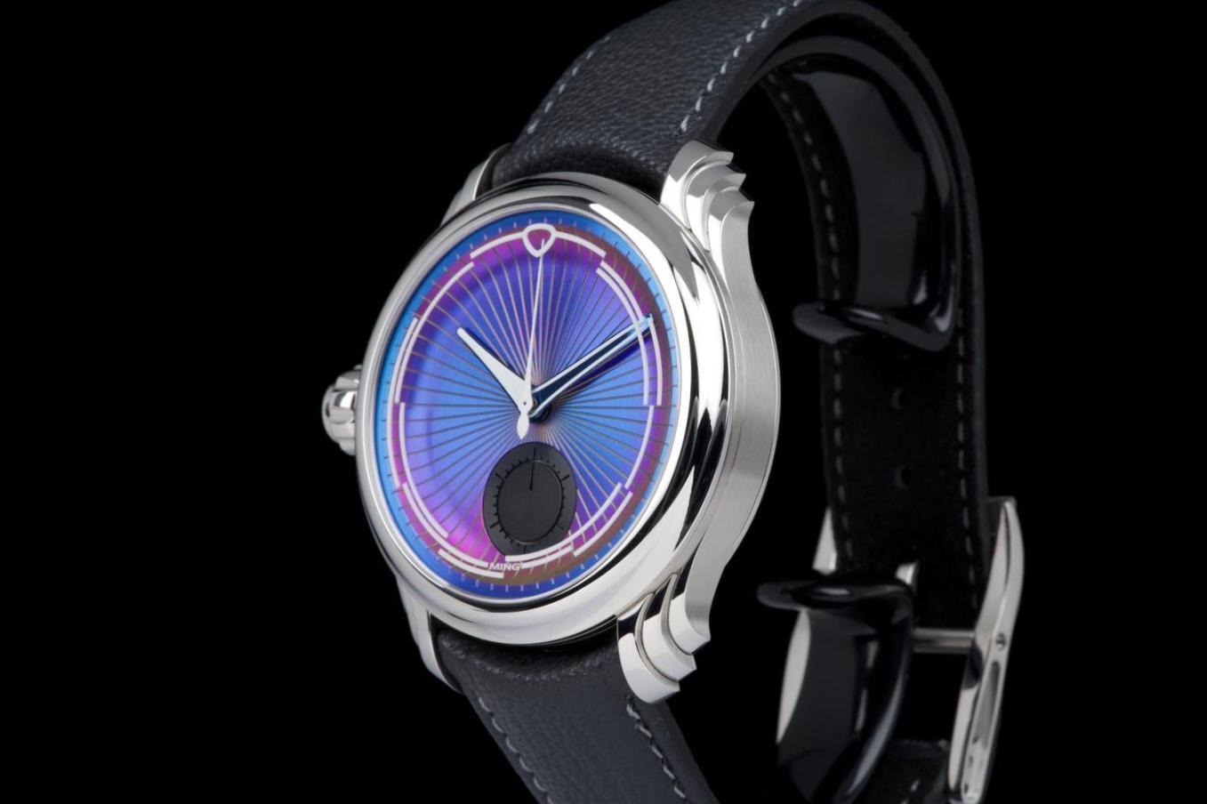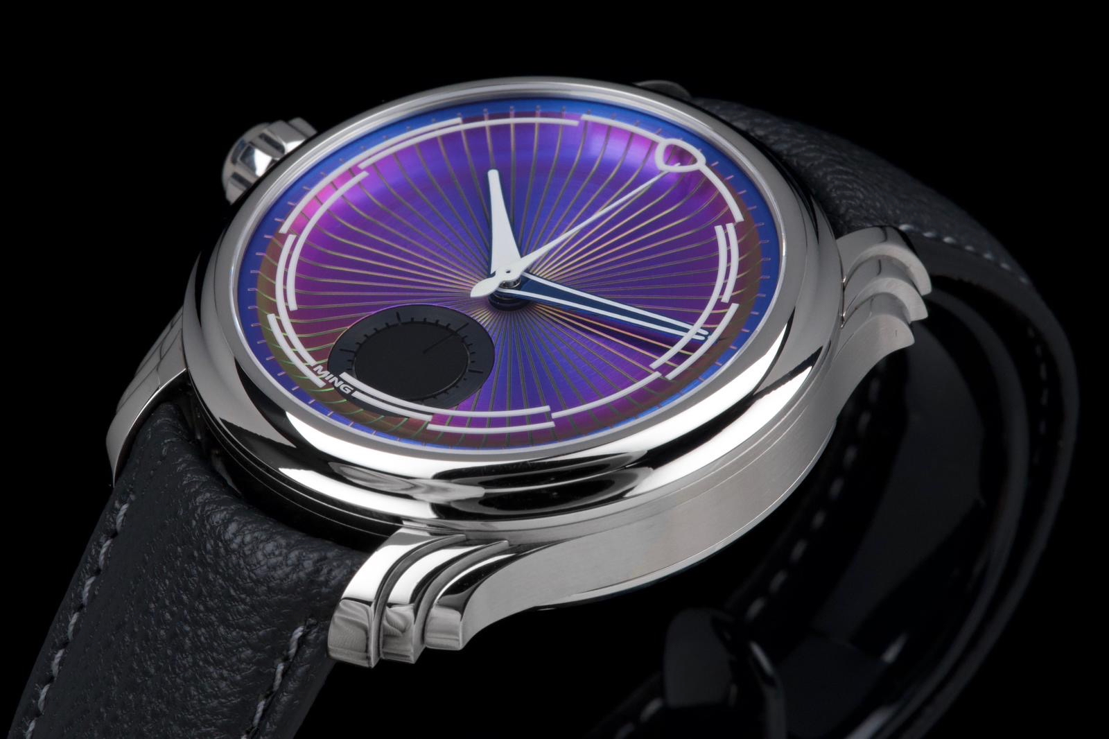 The present MING Iris is a striking and technically engaging example of the brand’s contemporary watchmaking philosophy, combining avant-garde design with classical chronograph mechanics. Conceived as a refined yet expressive monopusher chronograph, the Iris showcases MING’s distinctive approach to form, material, and light. Housed in a 40 mm stainless-steel case measuring just 11.85 mm in thickness and 47.8 mm lug-to-lug, the watch offers elegant proportions and excellent wearability. The 316L steel case features MING’s signature three-step lugs and a carefully executed polished and brushed finish. Both the front and rear sapphire crystals are fitted with double-sided anti-reflective coating, while the top crystal is laser-cut with indices filled with MING Polar White, creating a subtle yet highly legible display. The case is water-resistant to 100 meters and fitted with a 20 mm lug width. The metallic deep-dish dial is finished with a multiphasic colour-shift coating, producing remarkable depth and dynamic visual effects as the light changes. Diamond-cut hands, coated in blue and filled with Super-LumiNova X1, ensure clarity and contrast, while the chronograph minute counter disc is executed in a sandwich construction, also luminous, reinforcing the technical and functional character of the watch. Powering the Iris is the manually wound Sellita for MING calibre SW562.M1, offering approximately 60 hours of power reserve when fully wound. The movement features an anthracite mainplate contrasted by a 4N-coloured three-quarter plate, visible through the sapphire caseback and finished to reflect MING’s contemporary aesthetic. The watch is delivered with both the stainless-steel Universal Bracelet and an anthracite goat leather strap, fitted with MING’s stainless-steel tuck buckle, offering versatility between a more technical or understated look. Combining a monopusher chronograph, refined manual-wind mechanics, and MING’s unmistakable design language, the Iris stands as a compelling expression of modern independent watchmaking—distinctive, thoughtfully engineered, and visually captivating.