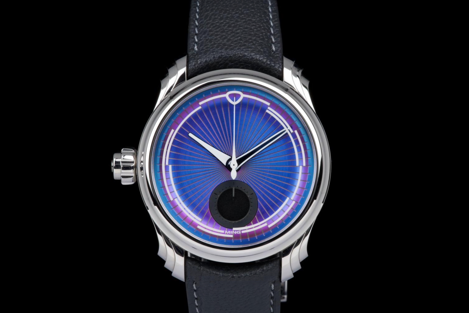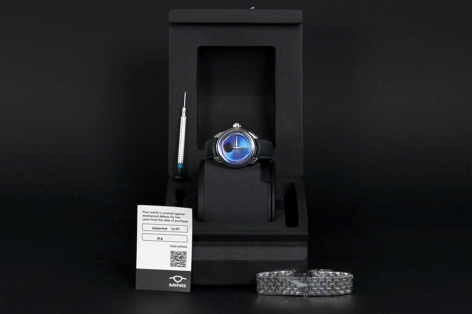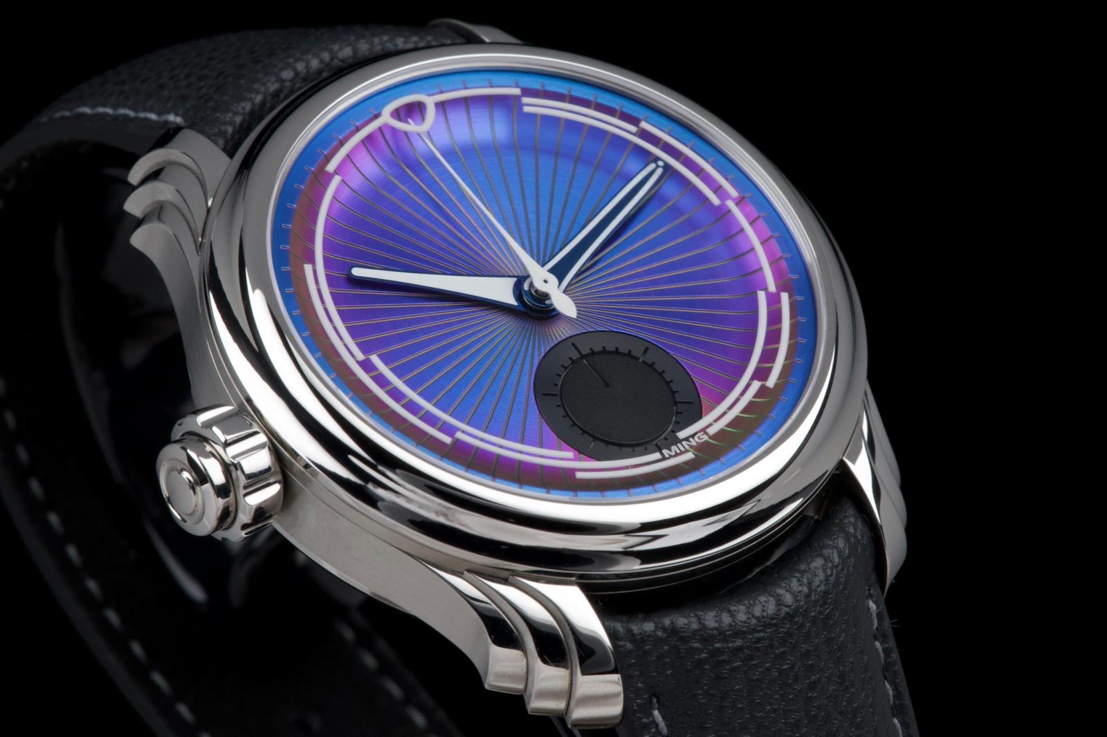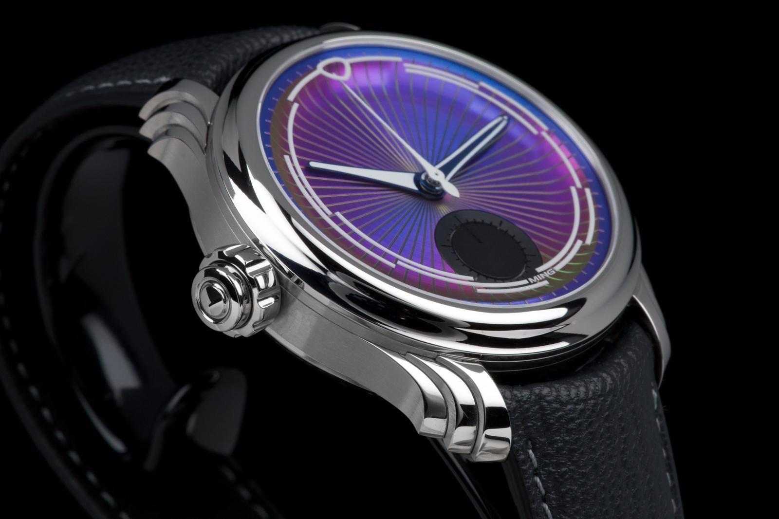 The present MING Iris is a striking and technically engaging example of the brand’s contemporary watchmaking philosophy, combining avant-garde design with classical chronograph mechanics. Conceived as a refined yet expressive monopusher chronograph, the Iris showcases MING’s distinctive approach to form, material, and light. Housed in a 40 mm stainless-steel case measuring just 11.85 mm in thickness and 47.8 mm lug-to-lug, the watch offers elegant proportions and excellent wearability. The 316L steel case features MING’s signature three-step lugs and a carefully executed polished and brushed finish. Both the front and rear sapphire crystals are fitted with double-sided anti-reflective coating, while the top crystal is laser-cut with indices filled with MING Polar White, creating a subtle yet highly legible display. The case is water-resistant to 100 meters and fitted with a 20 mm lug width. The metallic deep-dish dial is finished with a multiphasic colour-shift coating, producing remarkable depth and dynamic visual effects as the light changes. Diamond-cut hands, coated in blue and filled with Super-LumiNova X1, ensure clarity and contrast, while the chronograph minute counter disc is executed in a sandwich construction, also luminous, reinforcing the technical and functional character of the watch. Powering the Iris is the manually wound Sellita for MING calibre SW562.M1, offering approximately 60 hours of power reserve when fully wound. The movement features an anthracite mainplate contrasted by a 4N-coloured three-quarter plate, visible through the sapphire caseback and finished to reflect MING’s contemporary aesthetic. The watch is delivered with both the stainless-steel Universal Bracelet and an anthracite goat leather strap, fitted with MING’s stainless-steel tuck buckle, offering versatility between a more technical or understated look. Combining a monopusher chronograph, refined manual-wind mechanics, and MING’s unmistakable design language, the Iris stands as a compelling expression of modern independent watchmaking—distinctive, thoughtfully engineered, and visually captivating.