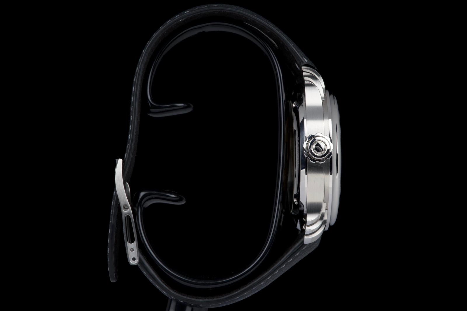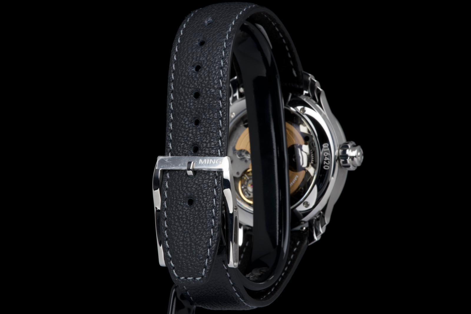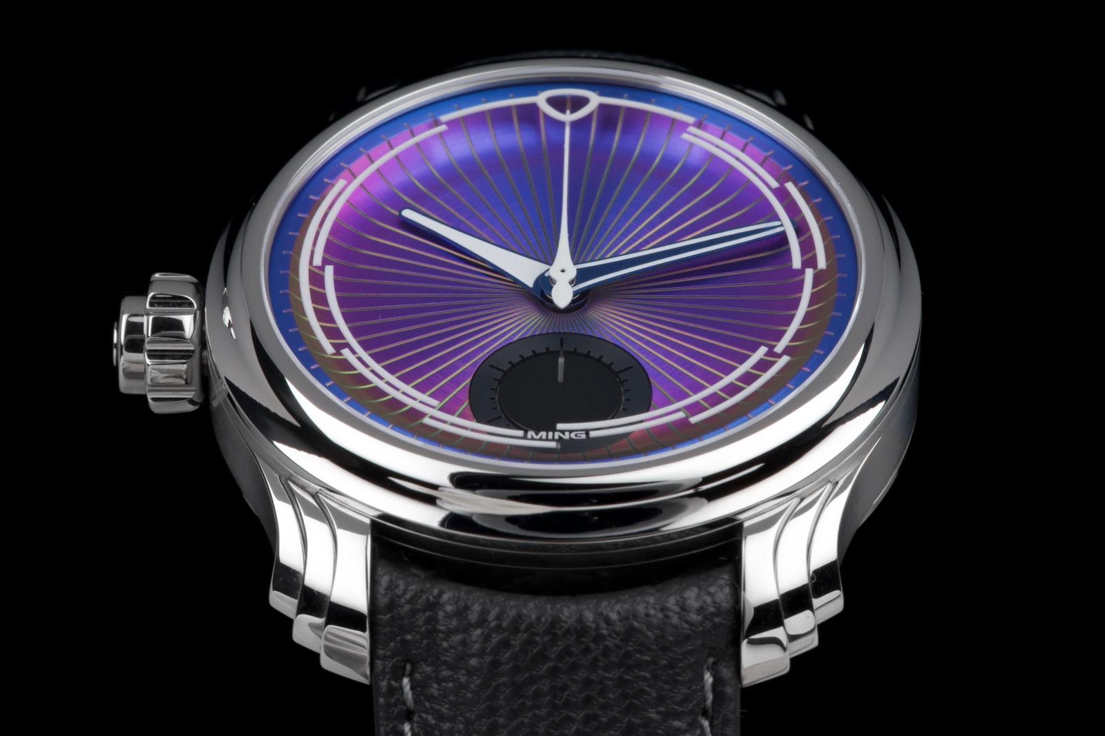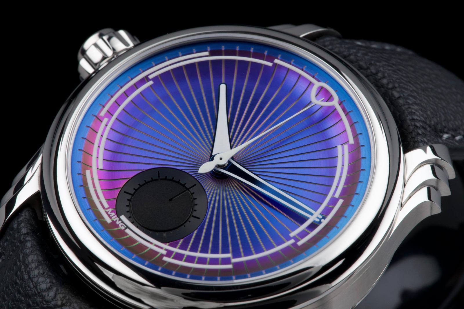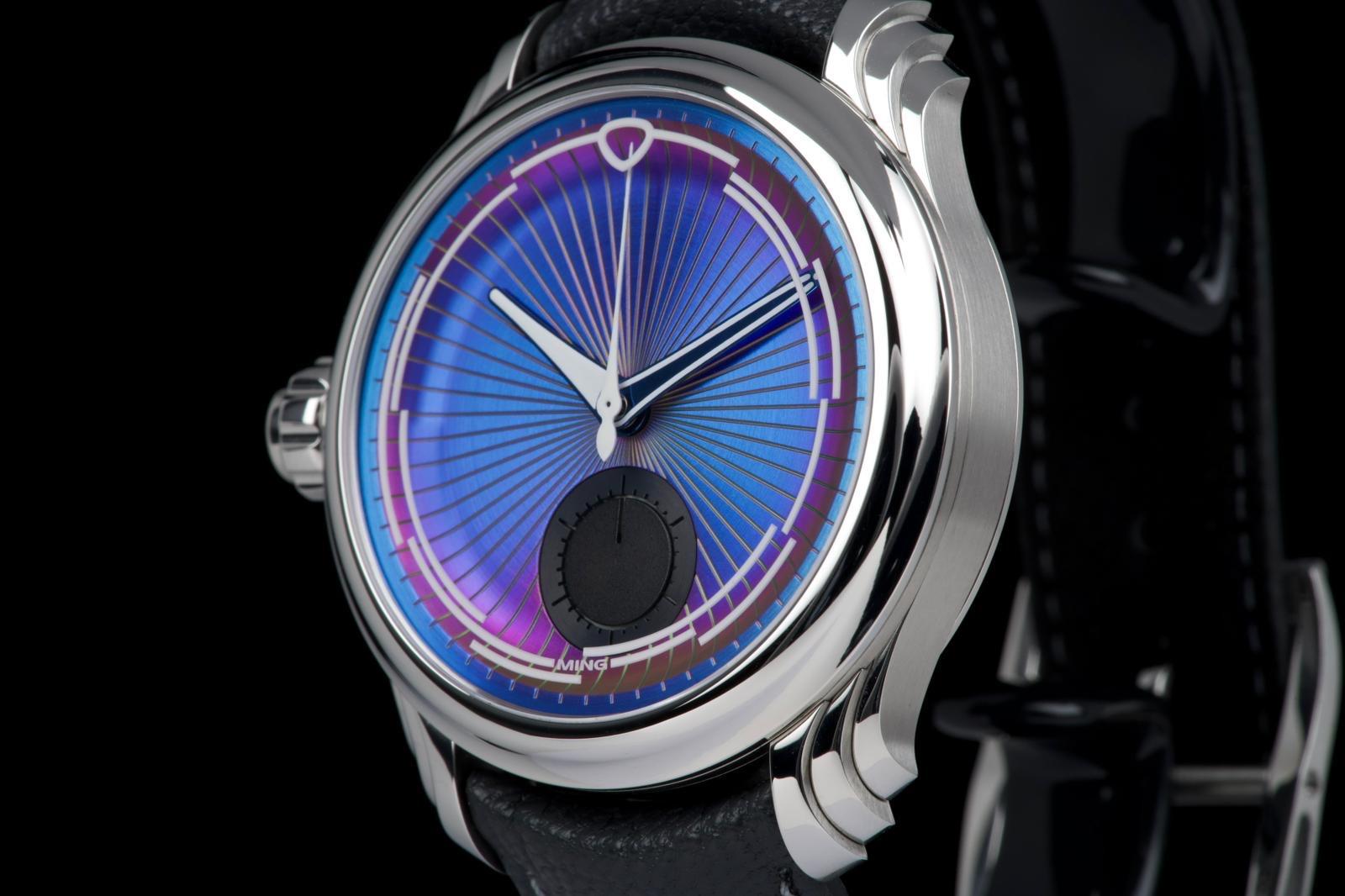 The present MING Iris is a striking and technically engaging example of the brand’s contemporary watchmaking philosophy, combining avant-garde design with classical chronograph mechanics. Conceived as a refined yet expressive monopusher chronograph, the Iris showcases MING’s distinctive approach to form, material, and light. Housed in a 40 mm stainless-steel case measuring just 11.85 mm in thickness and 47.8 mm lug-to-lug, the watch offers elegant proportions and excellent wearability. The 316L steel case features MING’s signature three-step lugs and a carefully executed polished and brushed finish. Both the front and rear sapphire crystals are fitted with double-sided anti-reflective coating, while the top crystal is laser-cut with indices filled with MING Polar White, creating a subtle yet highly legible display. The case is water-resistant to 100 meters and fitted with a 20 mm lug width. The metallic deep-dish dial is finished with a multiphasic colour-shift coating, producing remarkable depth and dynamic visual effects as the light changes. Diamond-cut hands, coated in blue and filled with Super-LumiNova X1, ensure clarity and contrast, while the chronograph minute counter disc is executed in a sandwich construction, also luminous, reinforcing the technical and functional character of the watch. Powering the Iris is the manually wound Sellita for MING calibre SW562.M1, offering approximately 60 hours of power reserve when fully wound. The movement features an anthracite mainplate contrasted by a 4N-coloured three-quarter plate, visible through the sapphire caseback and finished to reflect MING’s contemporary aesthetic. The watch is delivered with both the stainless-steel Universal Bracelet and an anthracite goat leather strap, fitted with MING’s stainless-steel tuck buckle, offering versatility between a more technical or understated look. Combining a monopusher chronograph, refined manual-wind mechanics, and MING’s unmistakable design language, the Iris stands as a compelling expression of modern independent watchmaking—distinctive, thoughtfully engineered, and visually captivating.
