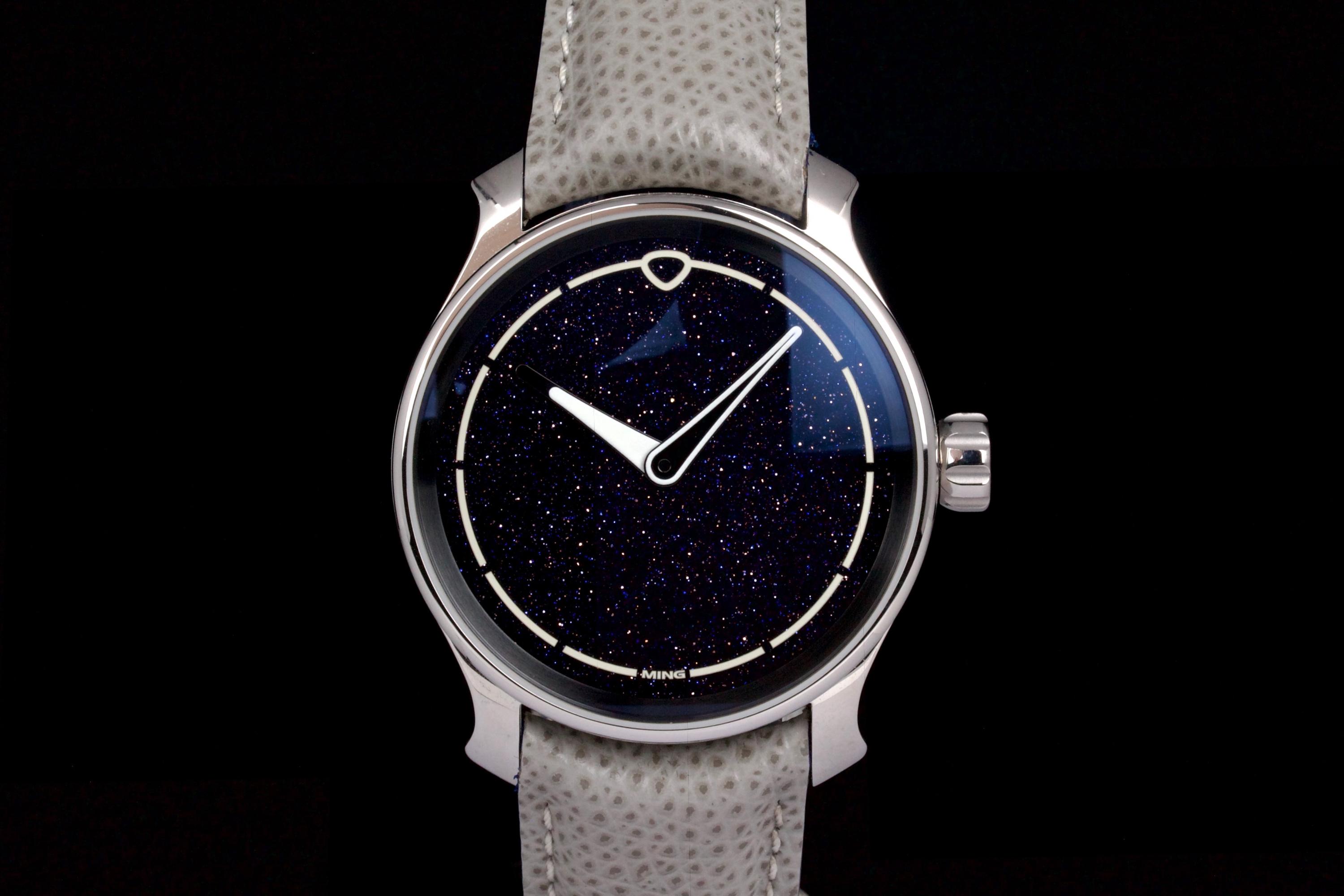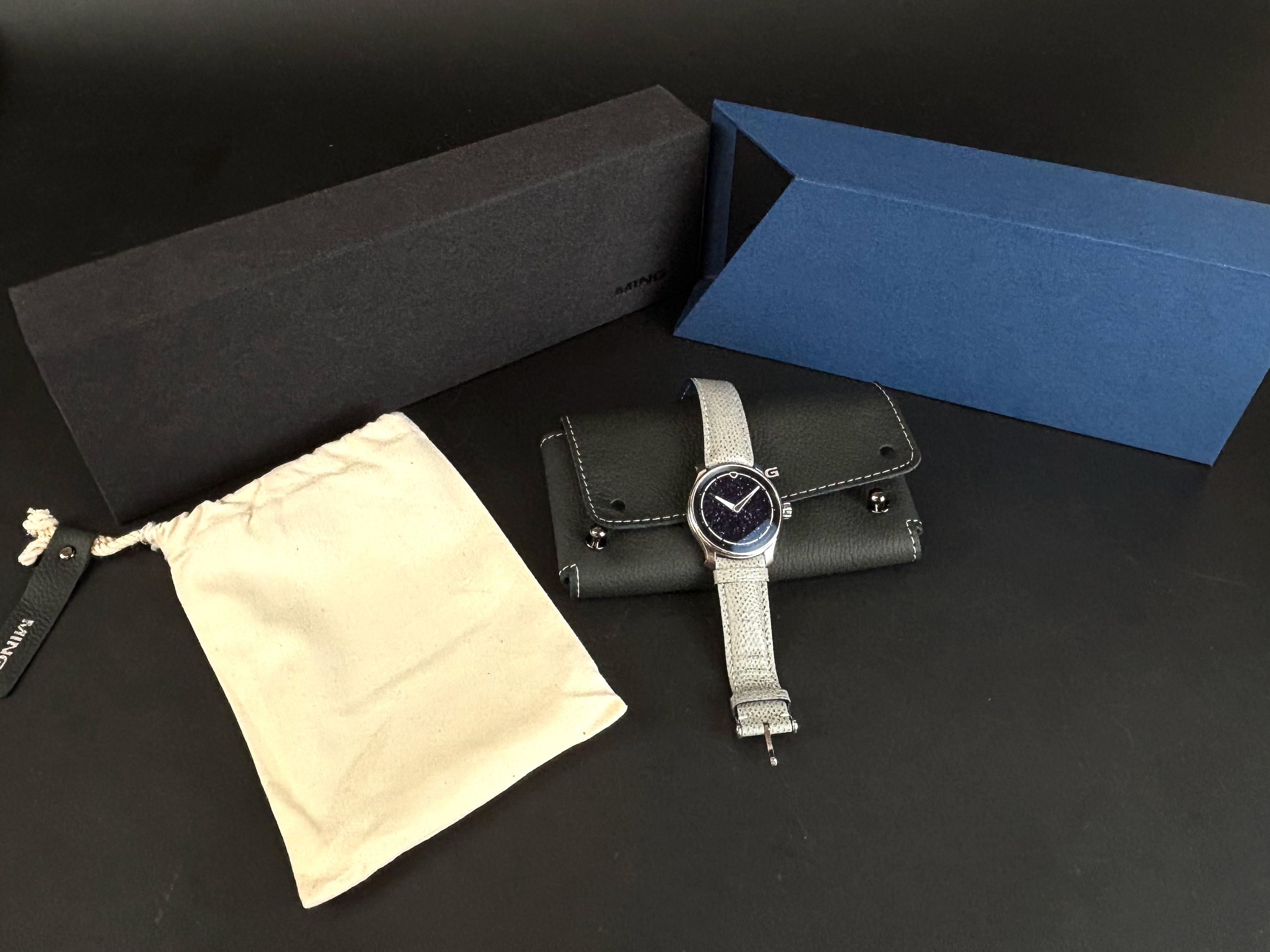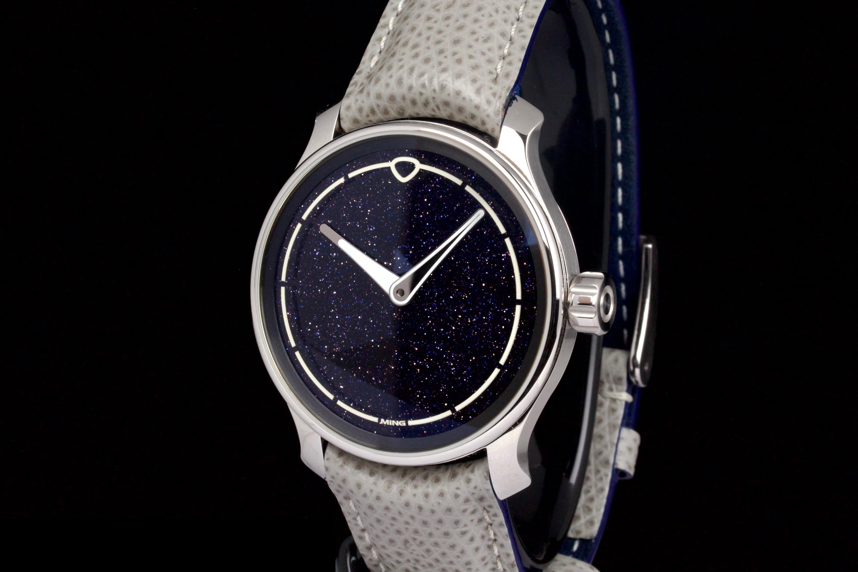 A stunning and highly collectible release from independent brand Ming, presented in excellent condition. The 37.08 “Starlight” features a dial inspired by the night sky, with a deep blue gradient and star-like accents, housed in a 38 mm stainless steel case. This example comes with both the original steel bracelet and an additional grey leather strap, offering versatility in wear. Powered by a manual-wind Sellita SW210.M1 movement, modified by Schwarz-Etienne for Ming, with a 40-hour power reserve. Complete with its original box, warranty card, and accessories. A rare opportunity to acquire the 37.08 “Starlight,” one of Ming’s most visually captivating limited-production models.