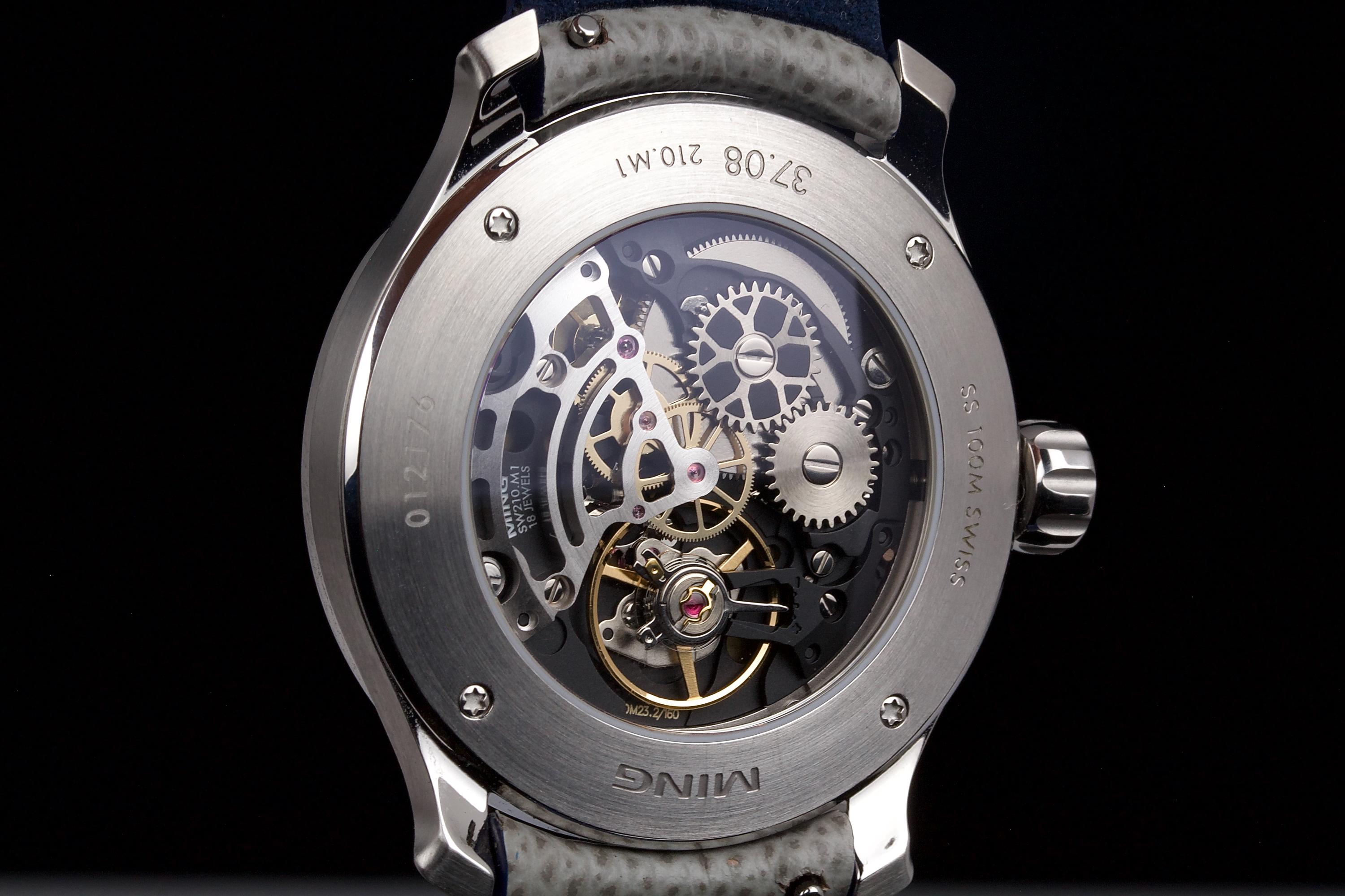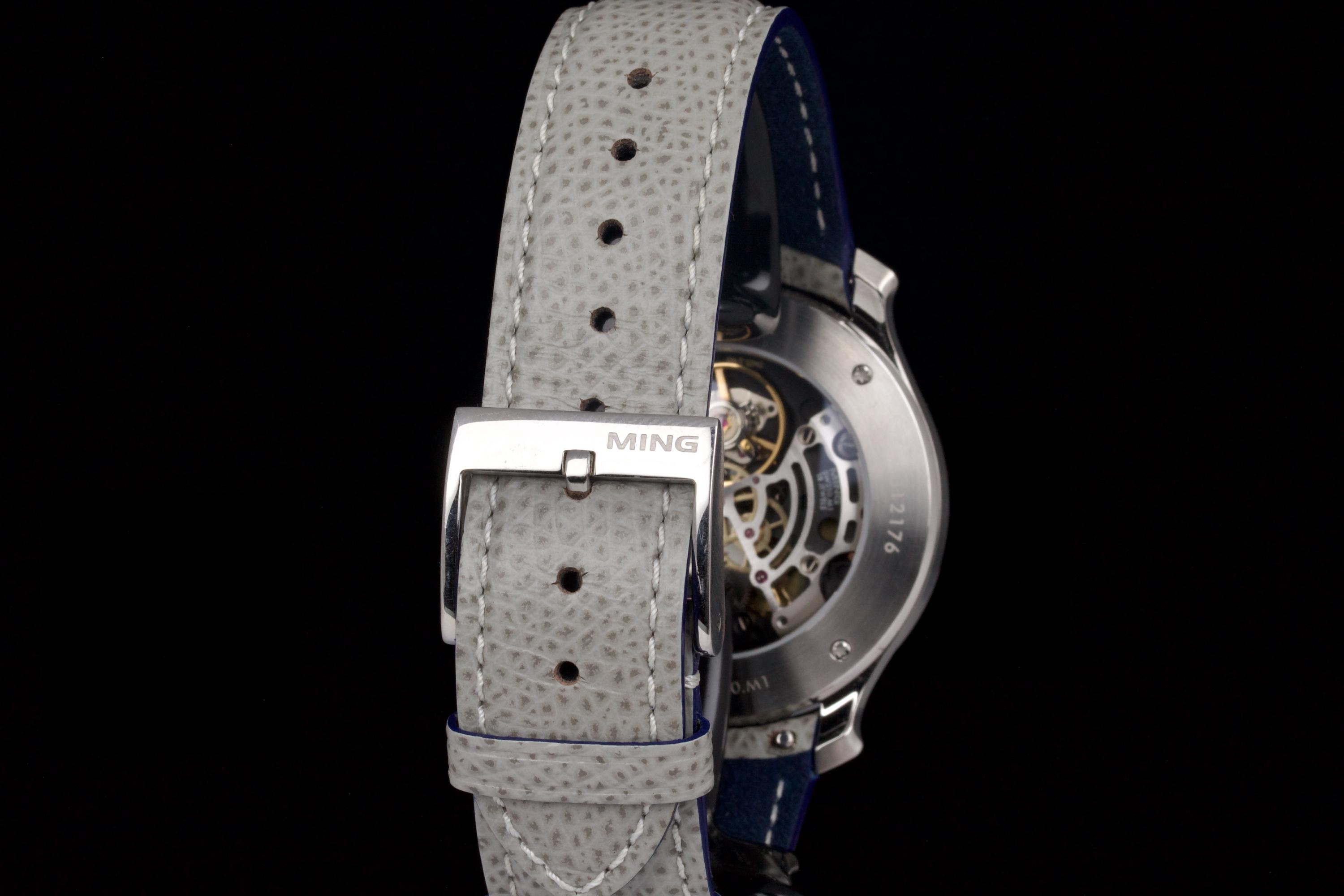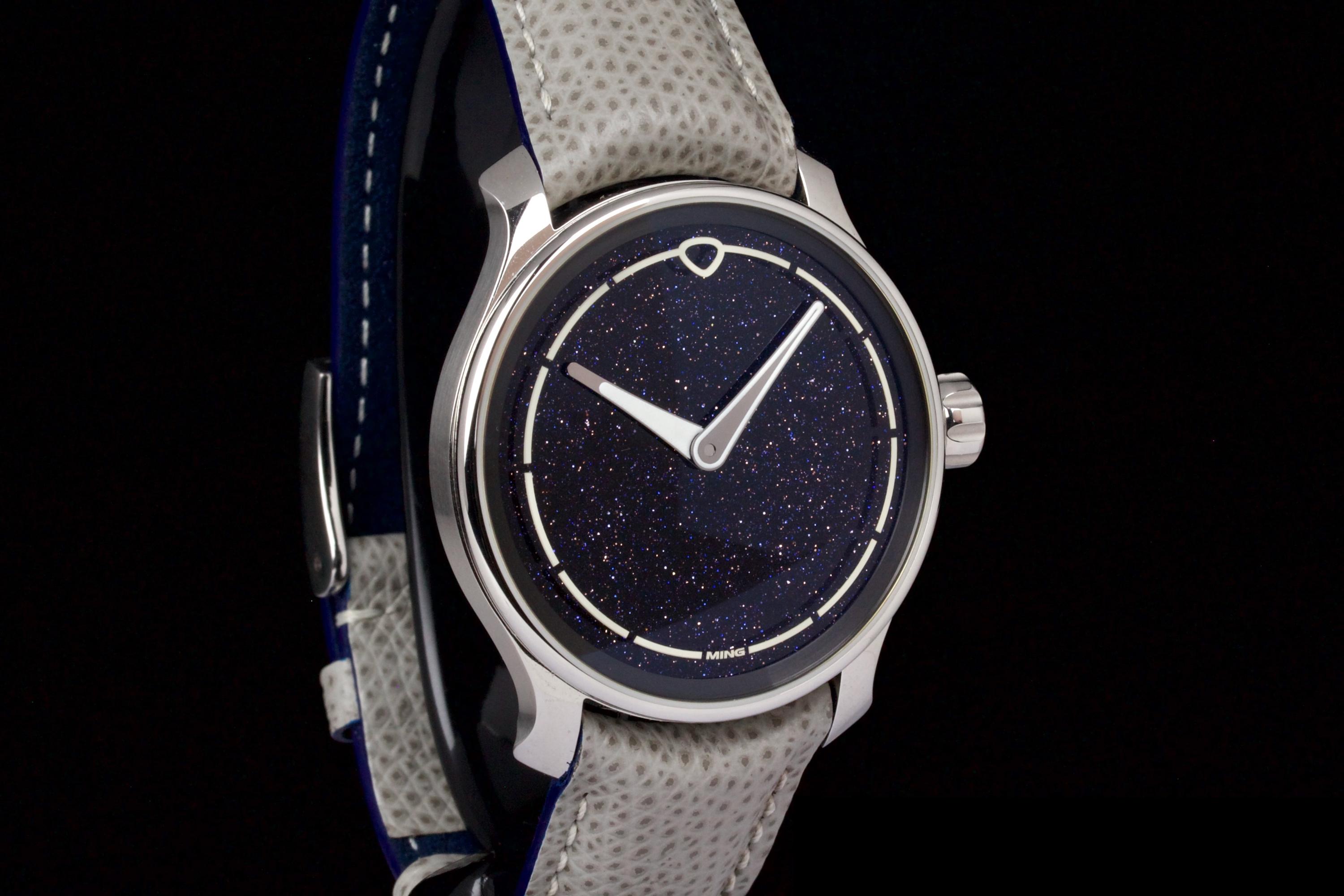 A stunning and highly collectible release from independent brand Ming, presented in excellent condition. The 37.08 “Starlight” features a dial inspired by the night sky, with a deep blue gradient and star-like accents, housed in a 38 mm stainless steel case. This example comes with both the original steel bracelet and an additional grey leather strap, offering versatility in wear. Powered by a manual-wind Sellita SW210.M1 movement, modified by Schwarz-Etienne for Ming, with a 40-hour power reserve. Complete with its original box, warranty card, and accessories. A rare opportunity to acquire the 37.08 “Starlight,” one of Ming’s most visually captivating limited-production models.