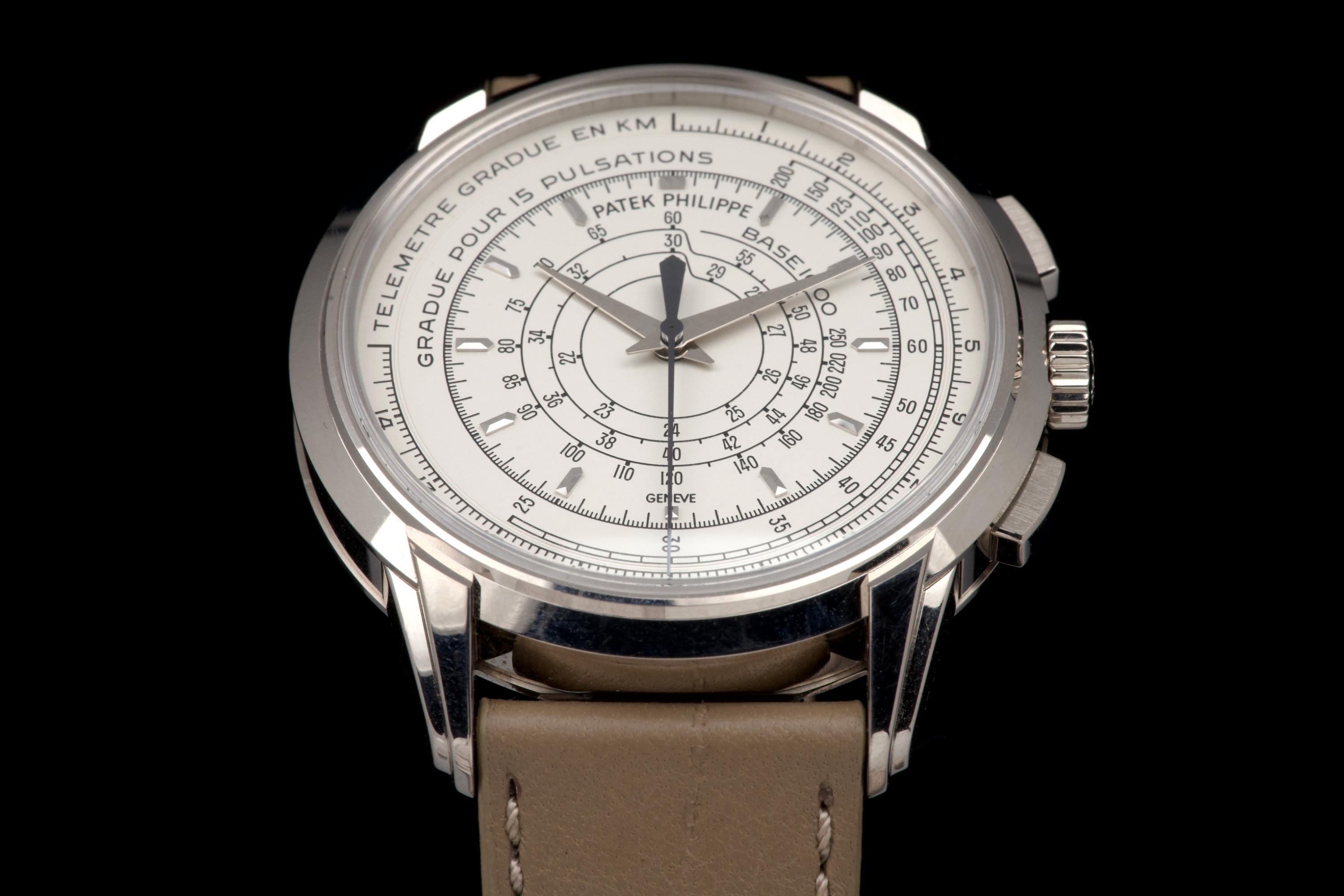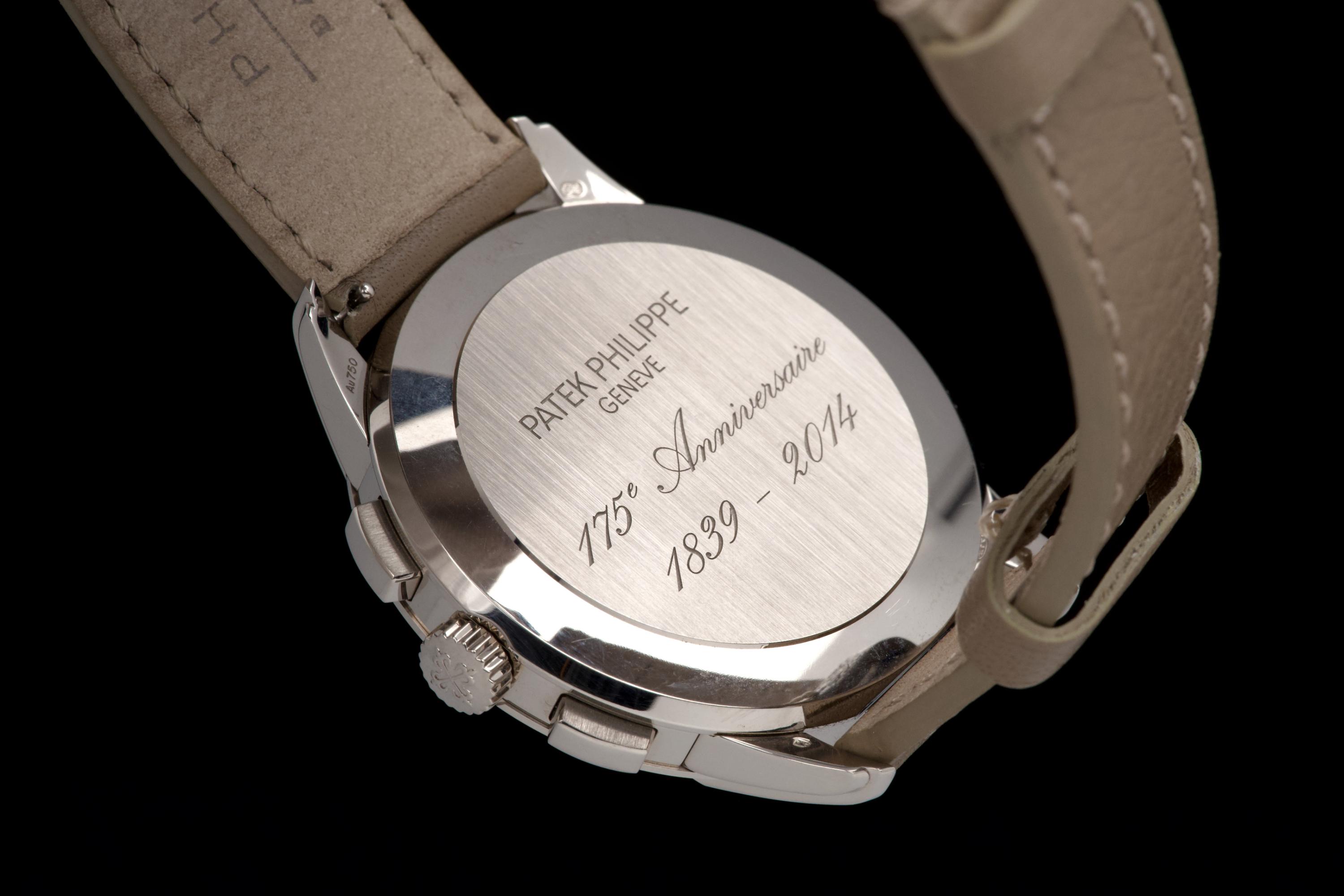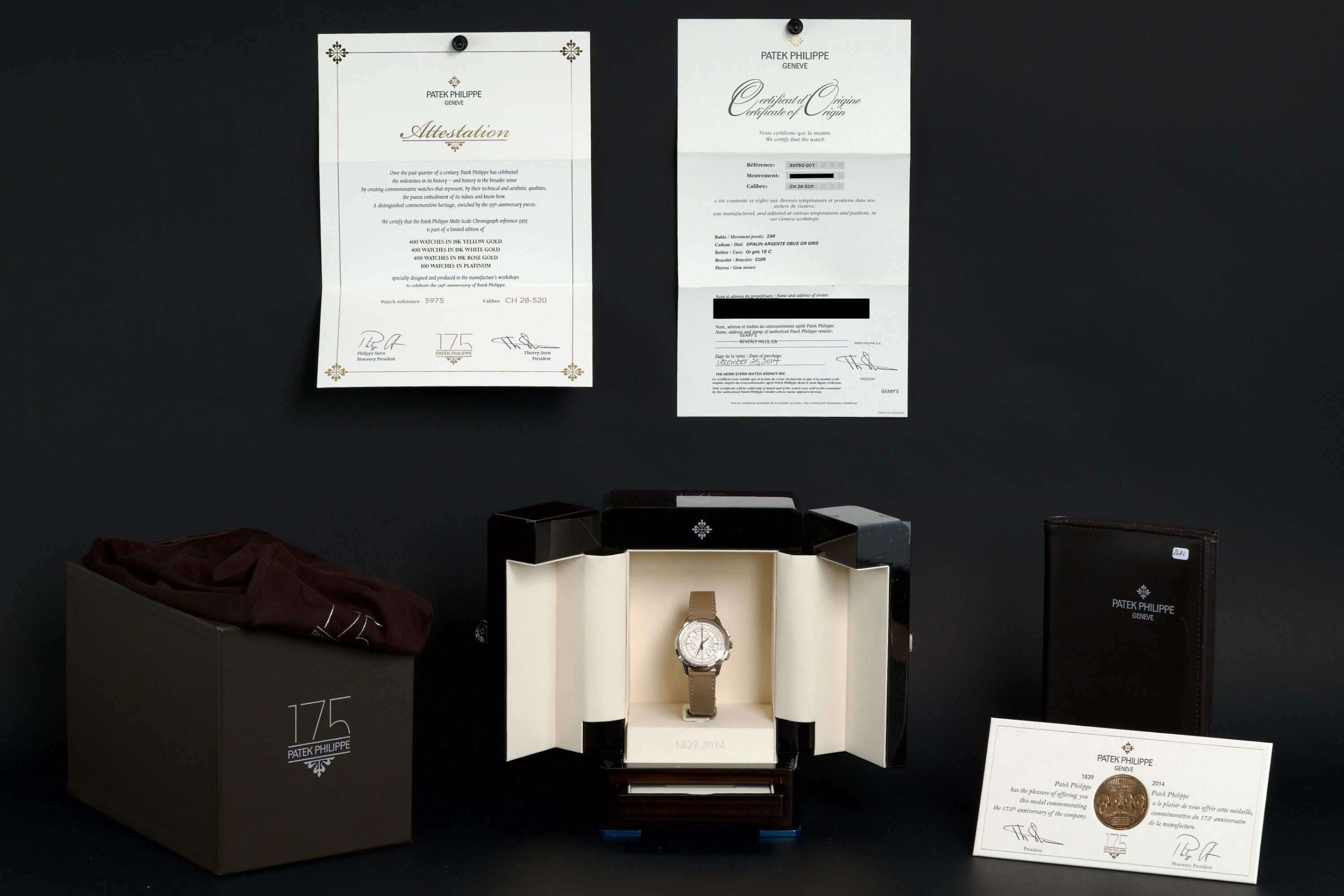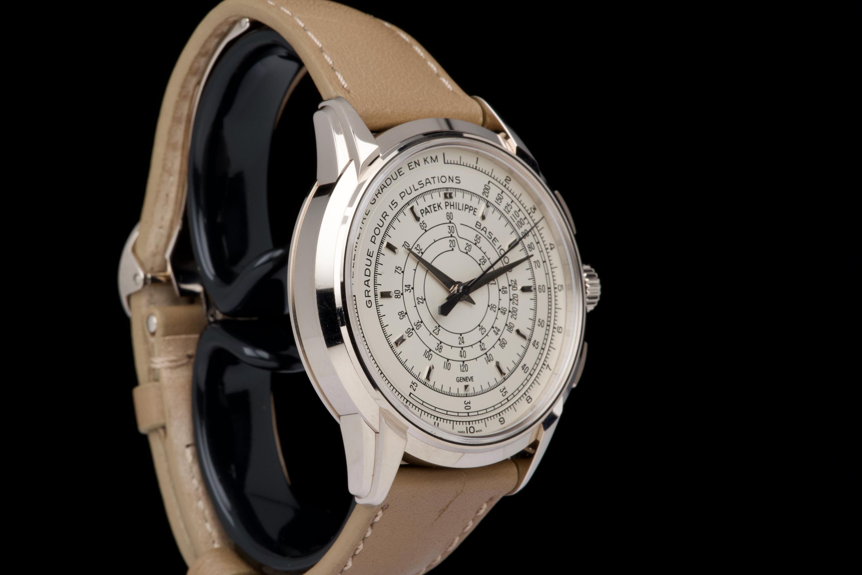 A beautiful example of the highly collectible Patek Philippe 5975G, released in 2014 to commemorate the brand’s 175th anniversary. This limited-edition multi-scale chronograph is offered here as a full set, originally sold in Los Angeles in 2014. The white-gold case remains unpolished, preserving its original factory lines. It shows normal signs of wear consistent with a watch from 2014, with no major marks. The iconic multi-scale dial is in excellent condition, perfectly preserved, and the watch retains its original Patek Philippe white-gold deployant clasp, paired with a high-quality non-Patek taupe calfskin strap. There is no service history, but the movement has been fully checked and validated by our watchmaker, running perfectly. A rare and historically significant Patek Philippe anniversary reference, offered here in very good overall condition with its complete set.