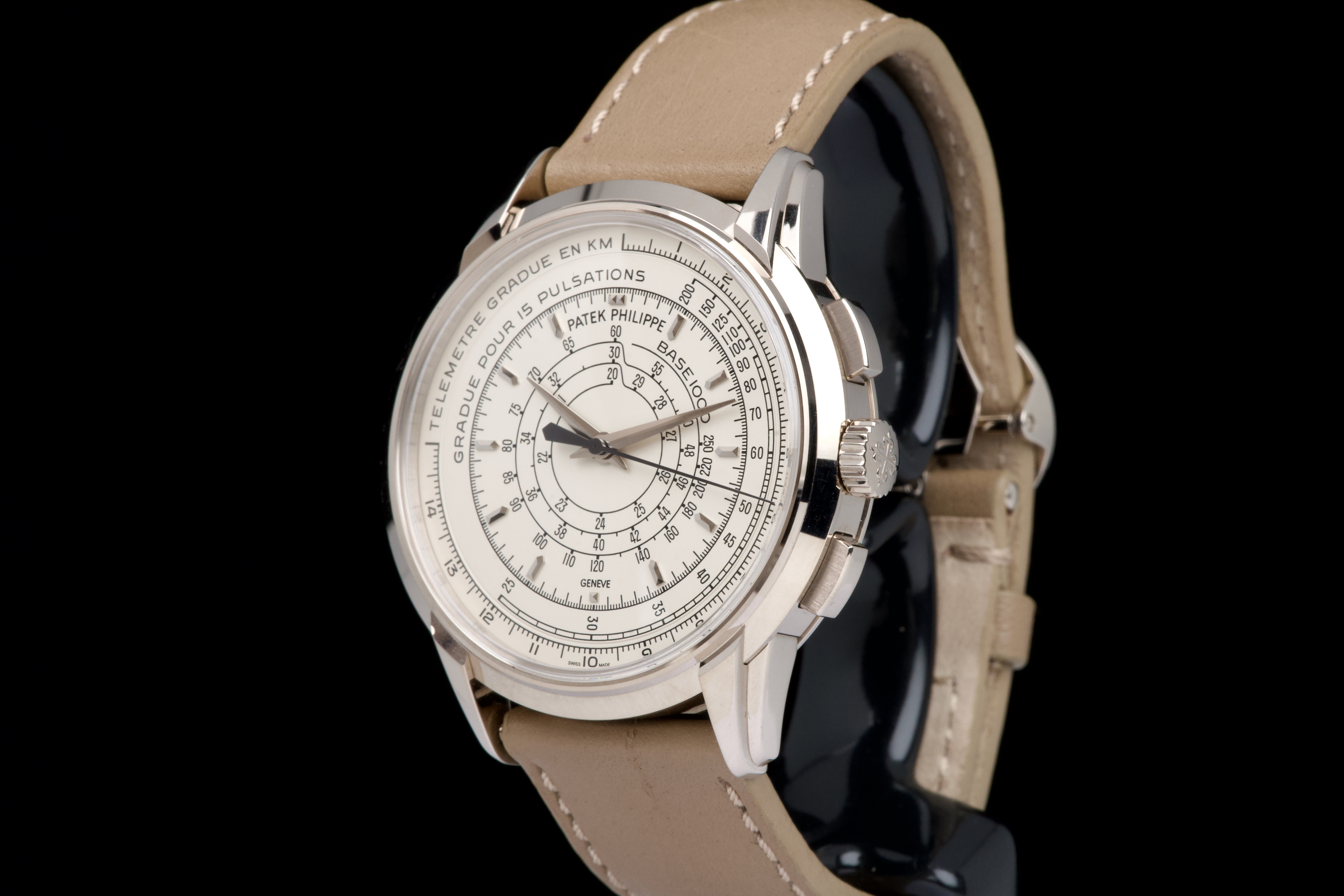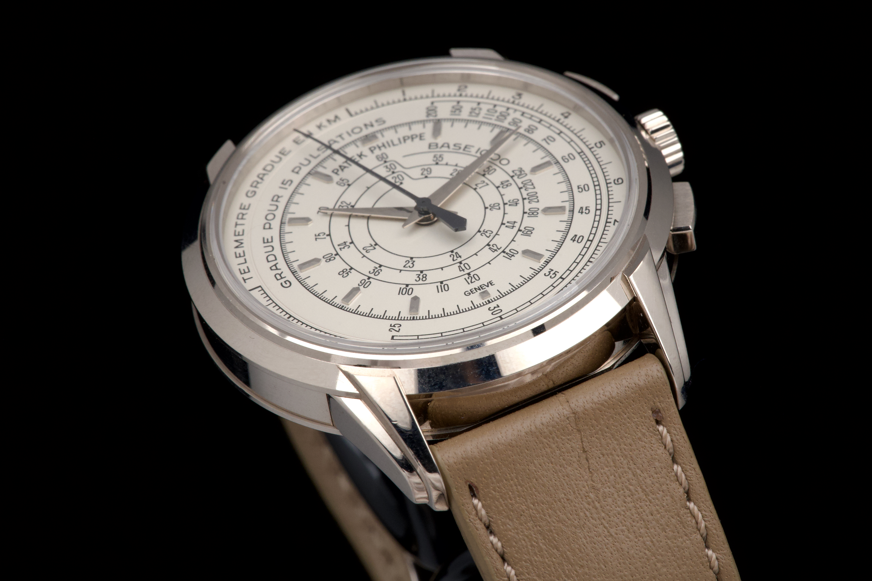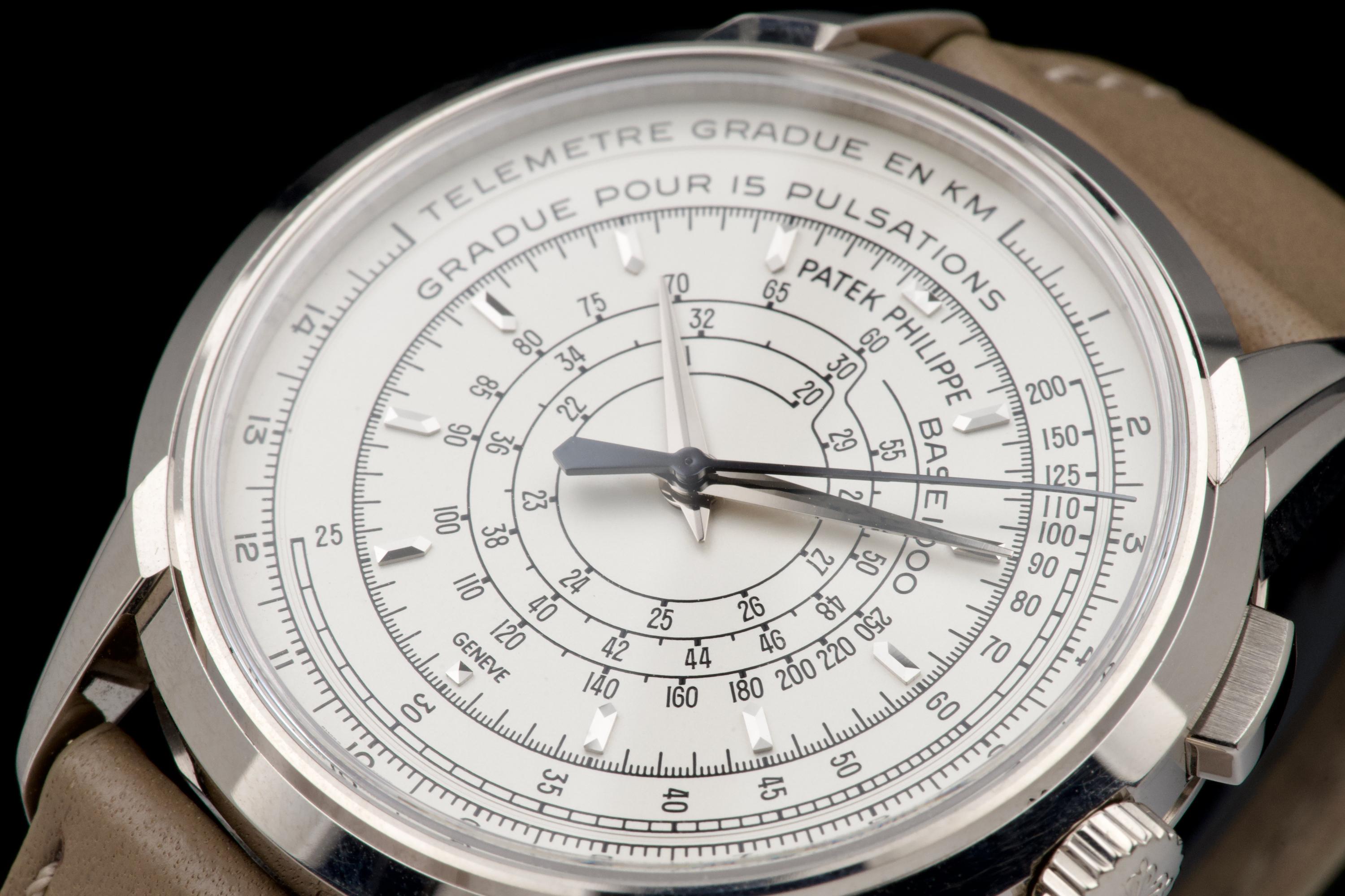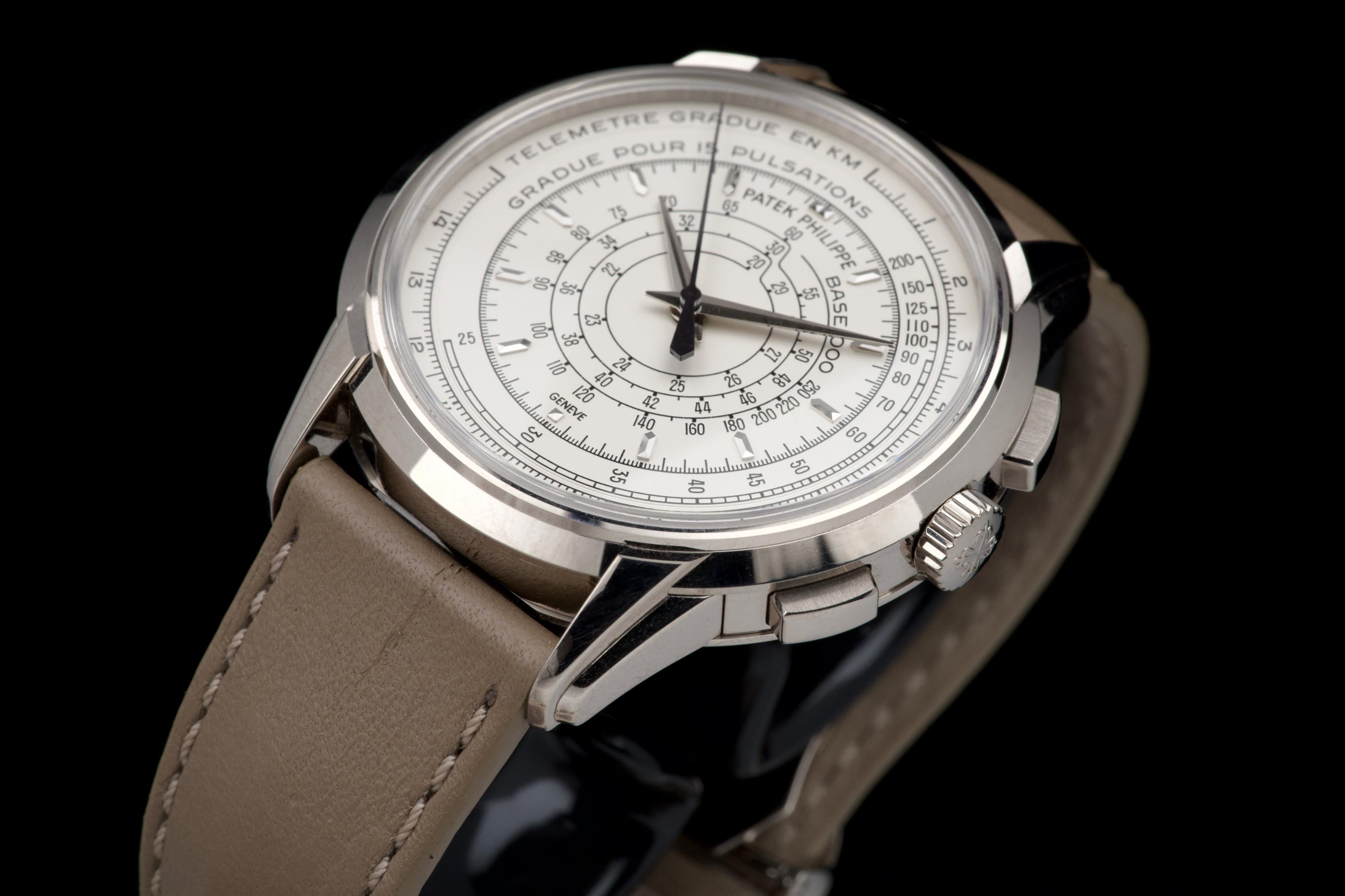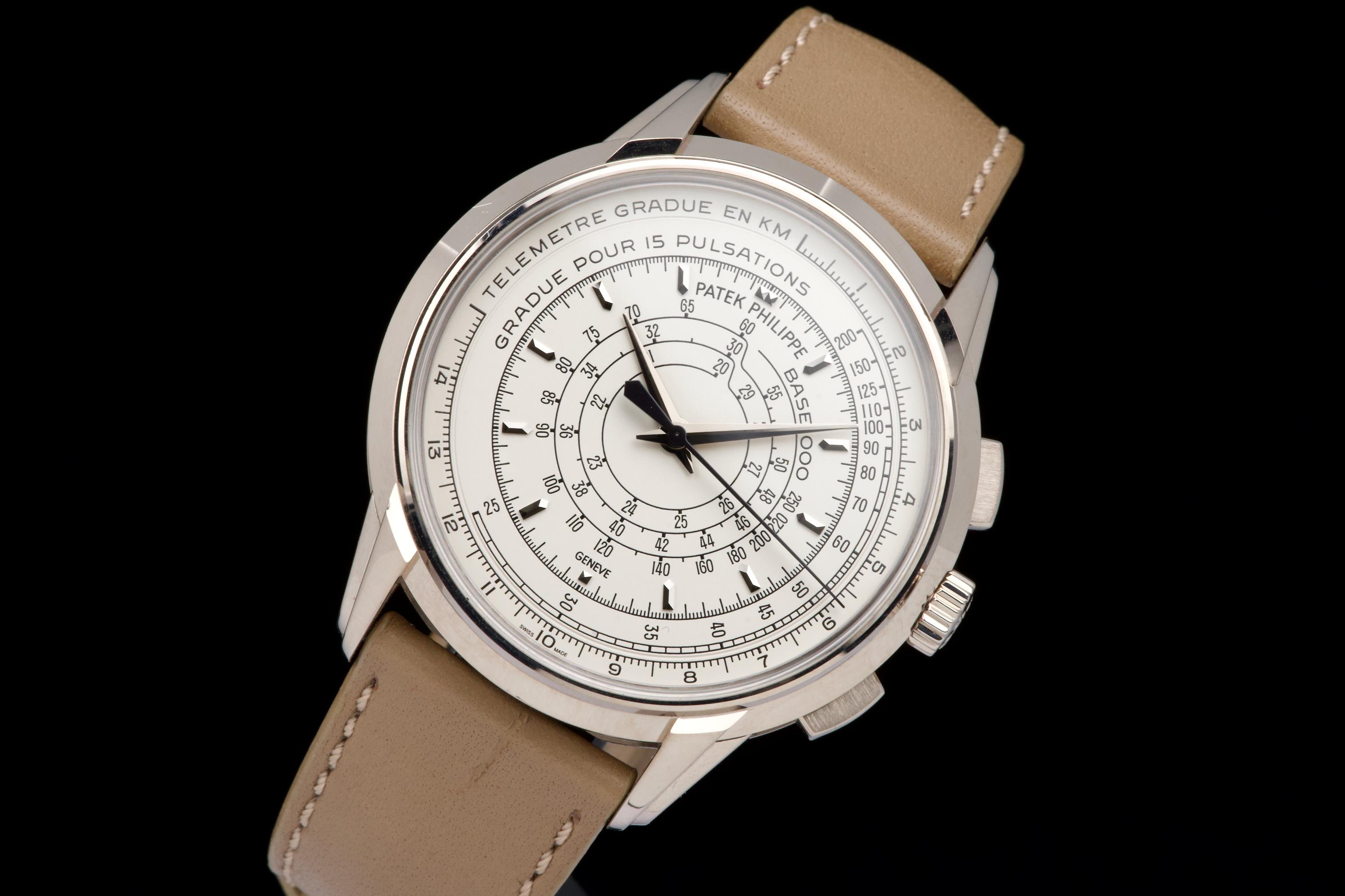 A beautiful example of the highly collectible Patek Philippe 5975G, released in 2014 to commemorate the brand’s 175th anniversary. This limited-edition multi-scale chronograph is offered here as a full set, originally sold in Los Angeles in 2014. The white-gold case remains unpolished, preserving its original factory lines. It shows normal signs of wear consistent with a watch from 2014, with no major marks. The iconic multi-scale dial is in excellent condition, perfectly preserved, and the watch retains its original Patek Philippe white-gold deployant clasp, paired with a high-quality non-Patek taupe calfskin strap. There is no service history, but the movement has been fully checked and validated by our watchmaker, running perfectly. A rare and historically significant Patek Philippe anniversary reference, offered here in very good overall condition with its complete set.