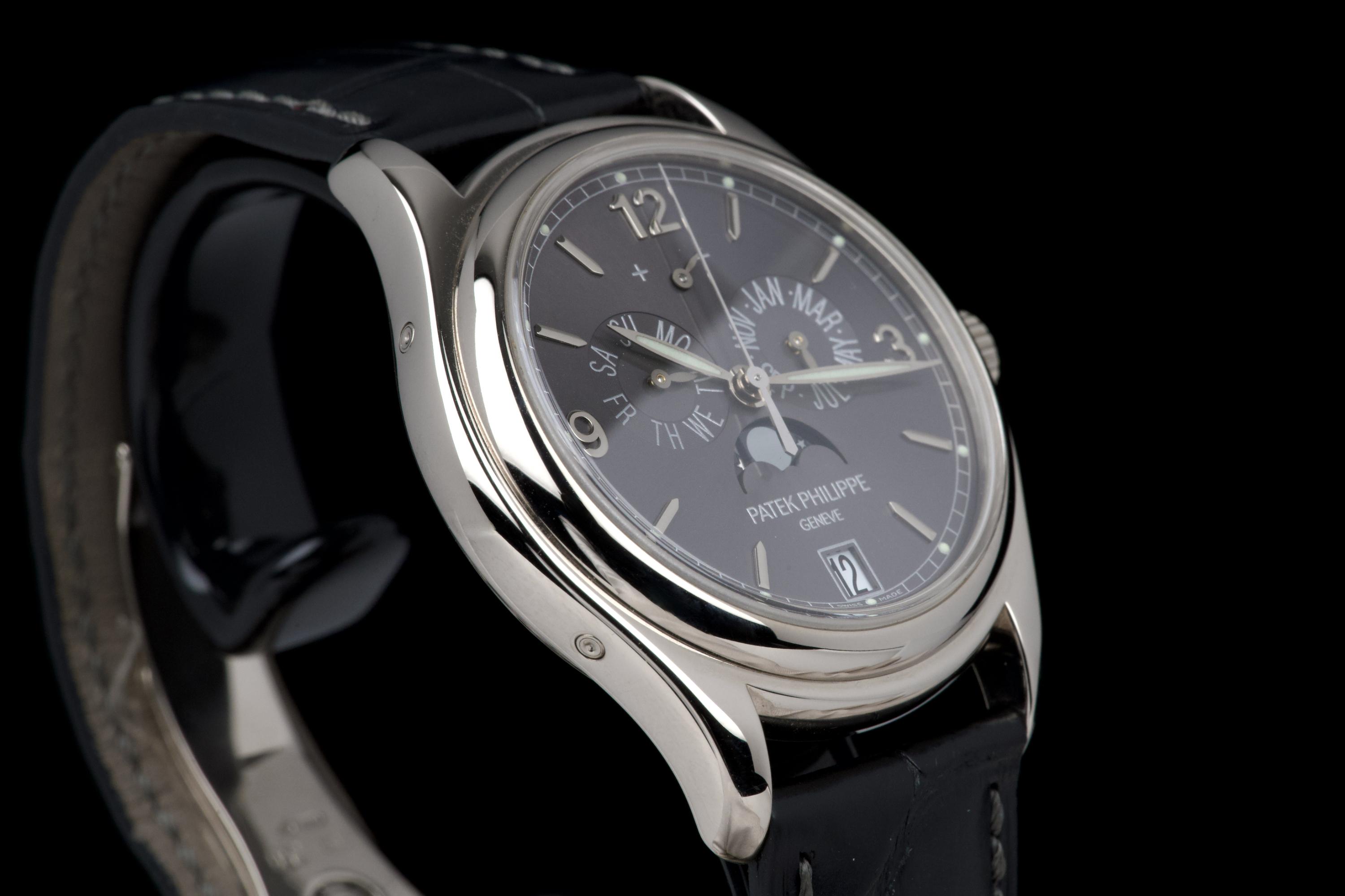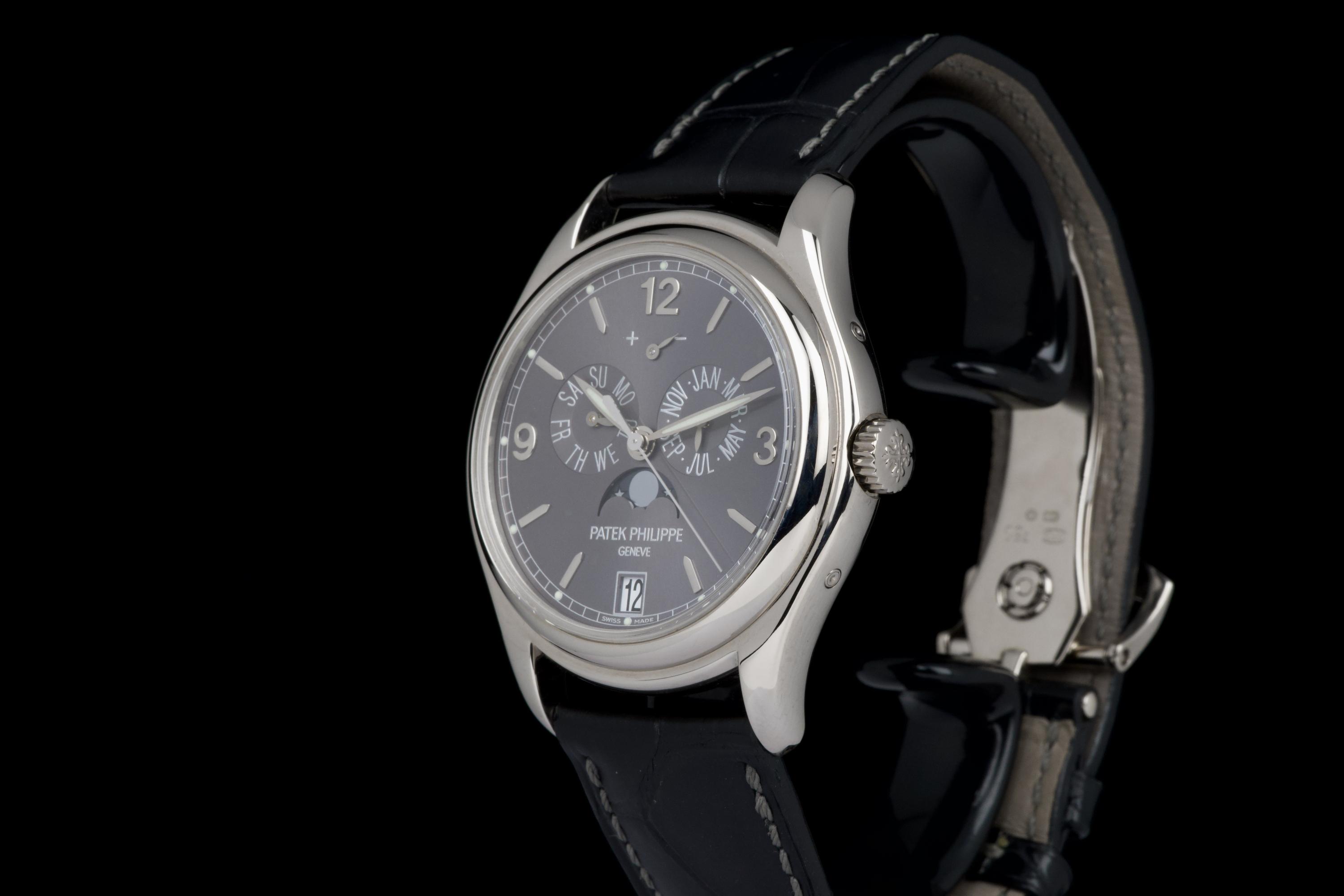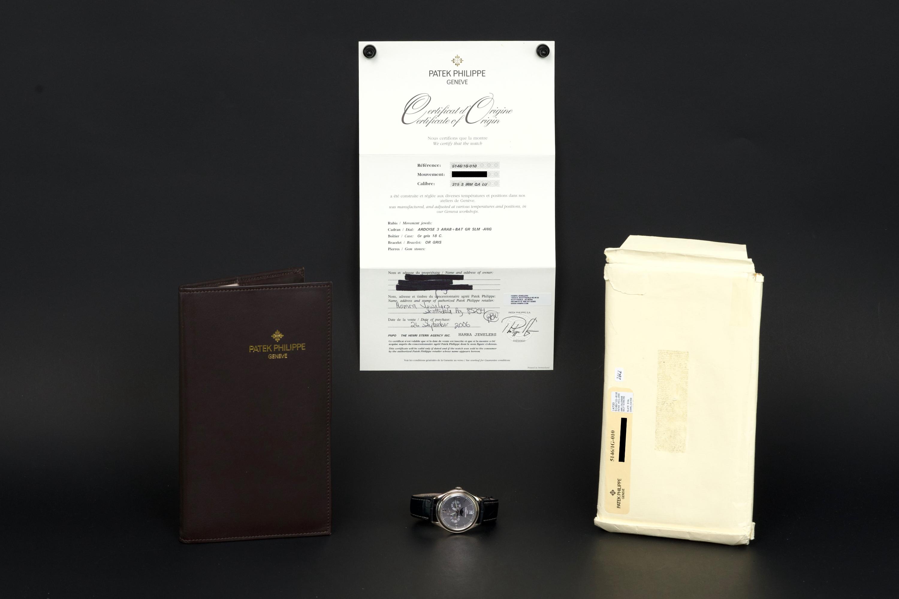The present Patek Philippe Annual Calendar reference 5146/1G-010, dating to 2006, is an elegant and technically refined example of the manufacture’s modern calendar watches, offered with its original papers. Originally sold new in Arizona in 2006, this watch represents a desirable early execution of the reference in white gold. The 39 mm white-gold case has been polished in the past and shows light wear consistent with careful use, while retaining balanced proportions and an elegant overall presence. The watch was originally delivered on a white-gold bracelet; it is now fitted with a black Patek Philippe crocodile leather strap, paired with a period-correct white-gold deployant clasp, offering a more understated and versatile aesthetic while remaining coherent with the reference. The dial displays the signature layout of the 5146, combining day and month apertures, a moon-phase with date, and a power-reserve indicator, all arranged in a harmonious and highly legible composition. Powering the watch is the automatic Patek Philippe calibre 315 S IRM QA LU, a refined movement specifically developed for this reference. It features an annual calendar complication requiring correction only once per year at the end of February, as well as a power-reserve indication, combining everyday practicality with traditional Patek Philippe finishing standards. While no service history accompanies the watch, it is running well at the time of cataloguing.