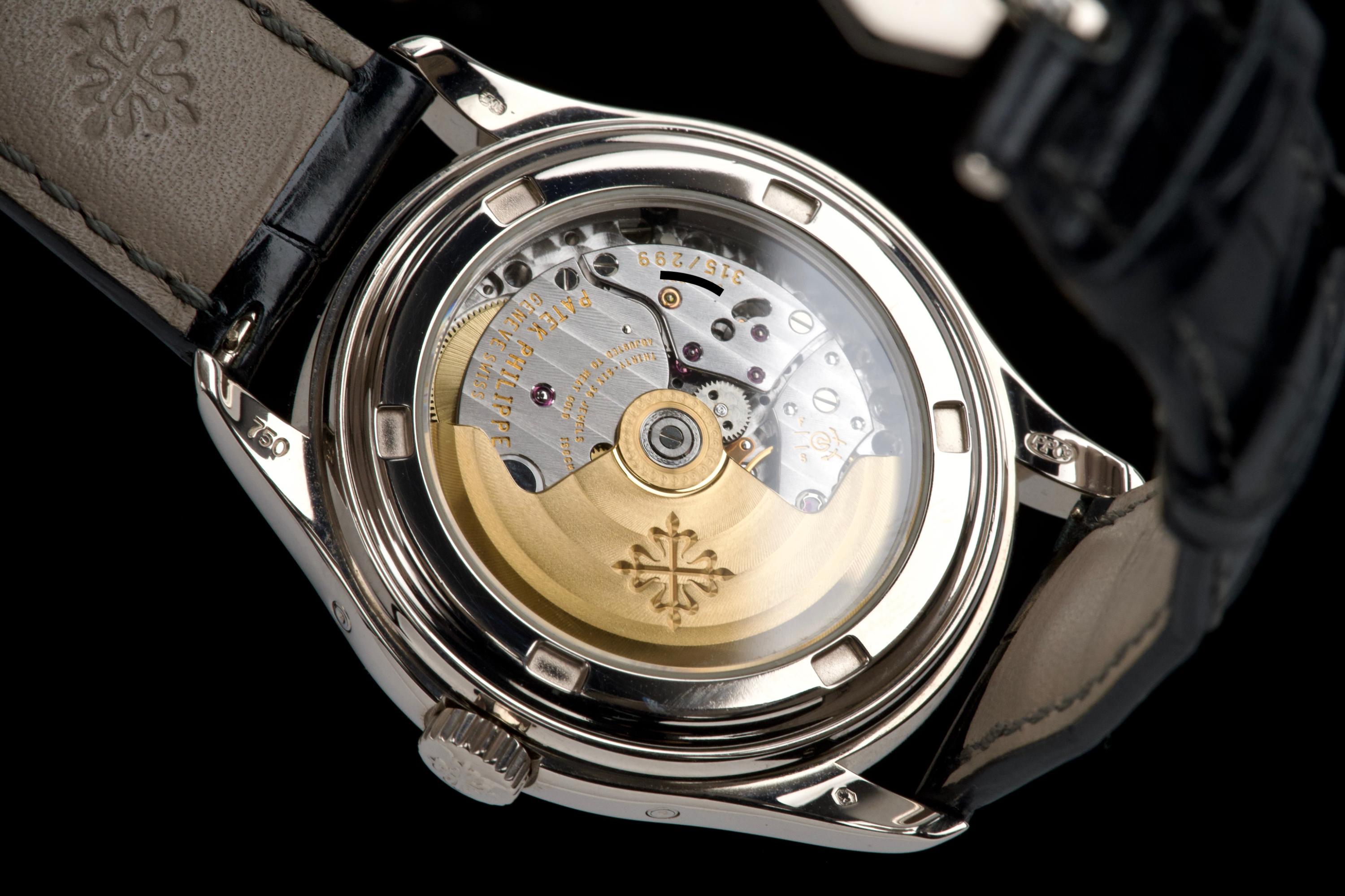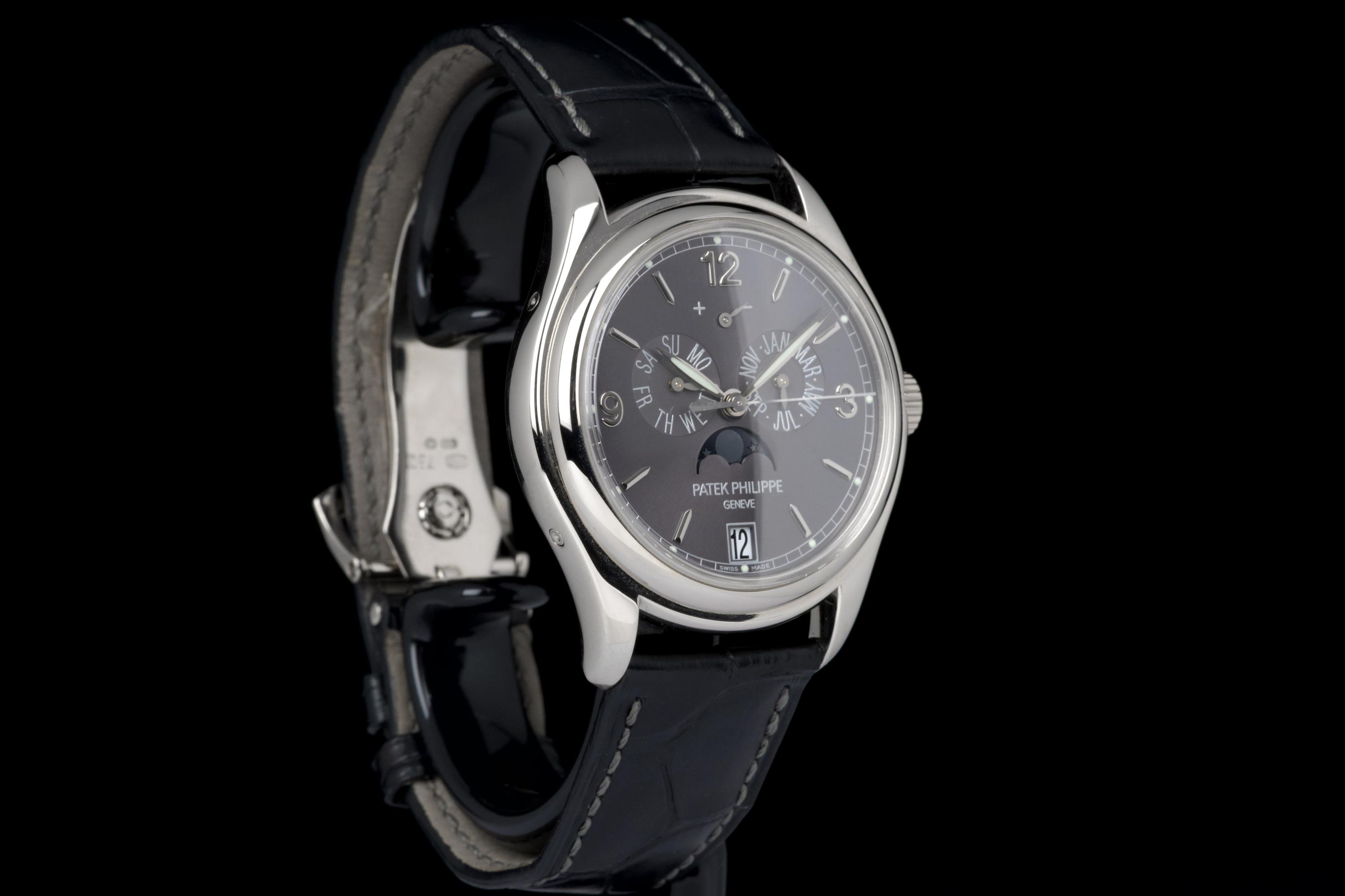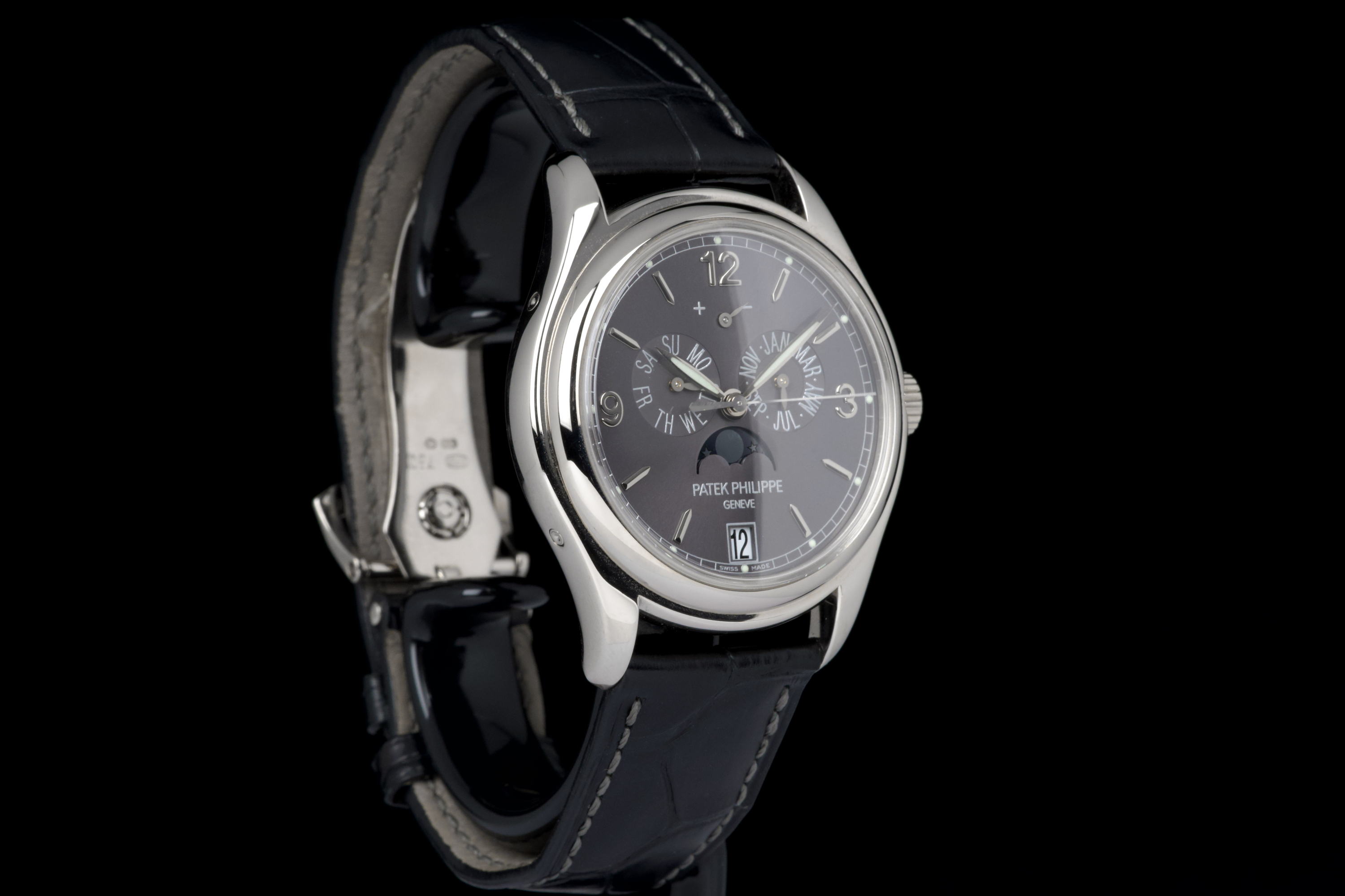 The present Patek Philippe Annual Calendar reference 5146/1G-010, dating to 2006, is an elegant and technically refined example of the manufacture’s modern calendar watches, offered with its original papers. Originally sold new in Arizona in 2006, this watch represents a desirable early execution of the reference in white gold. The 39 mm white-gold case has been polished in the past and shows light wear consistent with careful use, while retaining balanced proportions and an elegant overall presence. The watch was originally delivered on a white-gold bracelet; it is now fitted with a black Patek Philippe crocodile leather strap, paired with a period-correct white-gold deployant clasp, offering a more understated and versatile aesthetic while remaining coherent with the reference. The dial displays the signature layout of the 5146, combining day and month apertures, a moon-phase with date, and a power-reserve indicator, all arranged in a harmonious and highly legible composition. Powering the watch is the automatic Patek Philippe calibre 315 S IRM QA LU, a refined movement specifically developed for this reference. It features an annual calendar complication requiring correction only once per year at the end of February, as well as a power-reserve indication, combining everyday practicality with traditional Patek Philippe finishing standards. While no service history accompanies the watch, it is running well at the time of cataloguing.