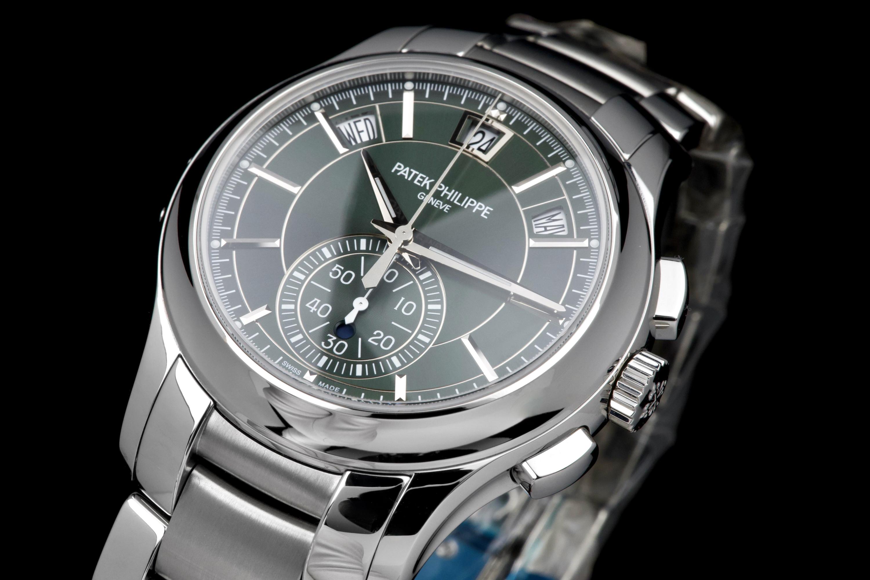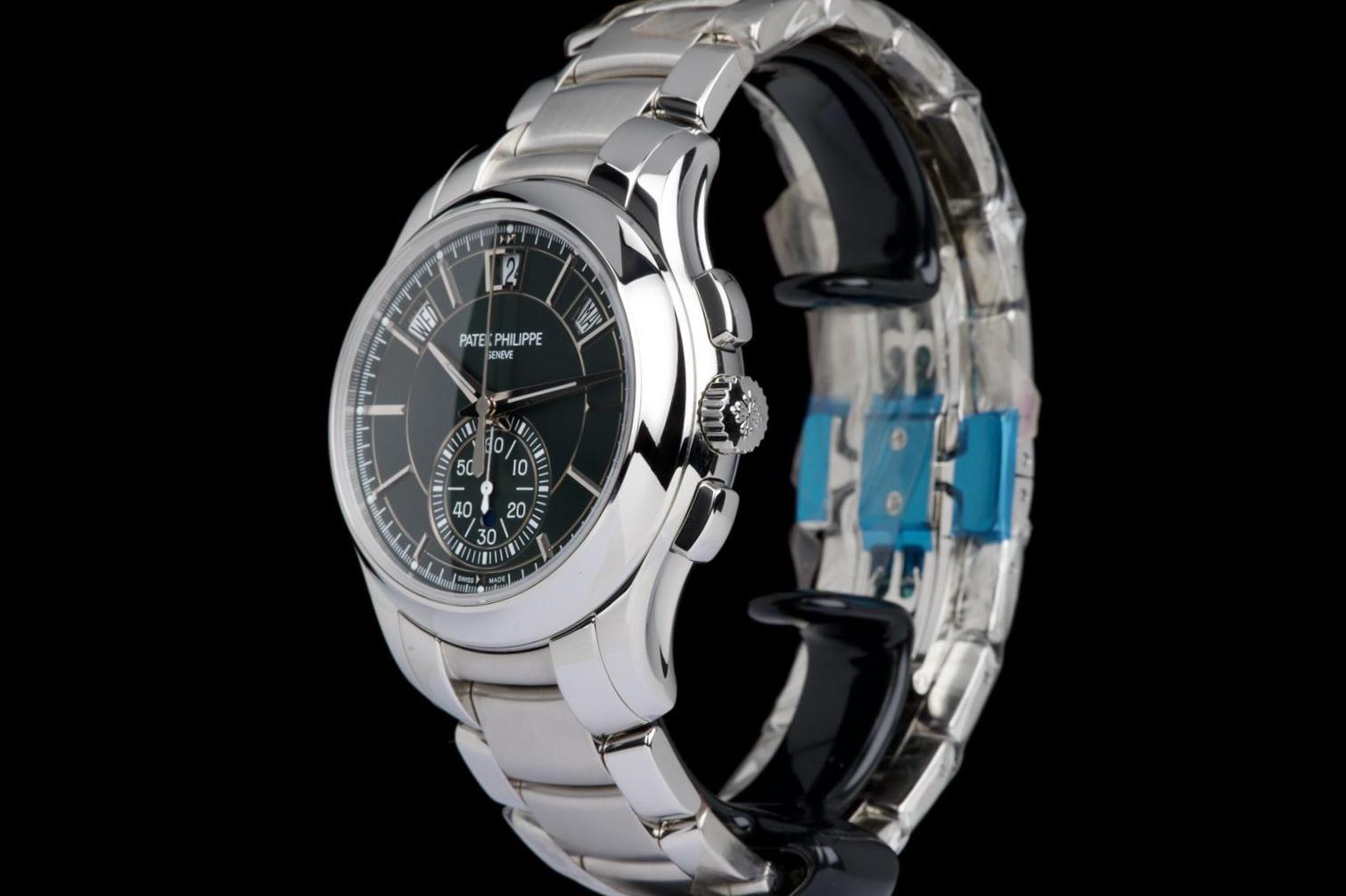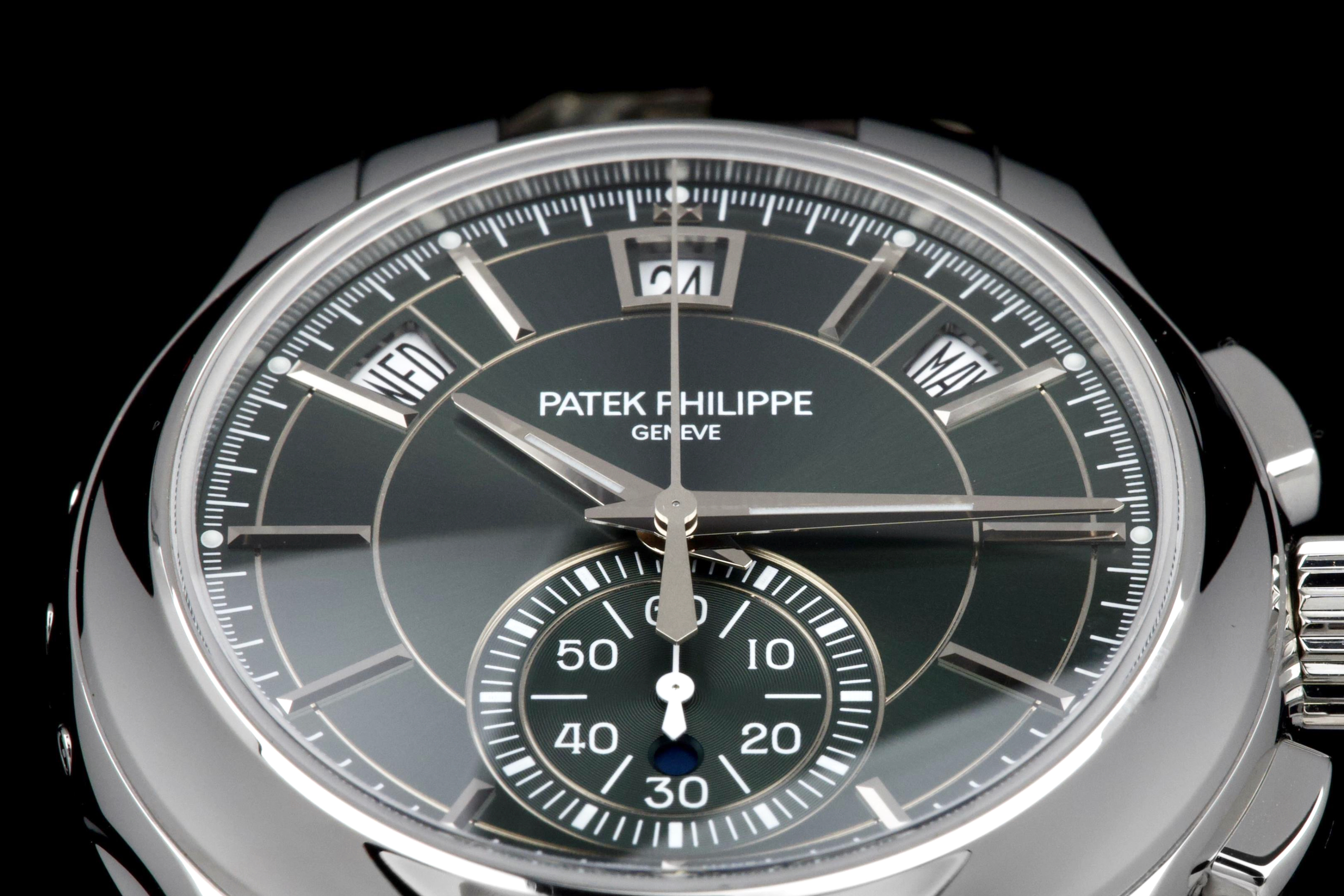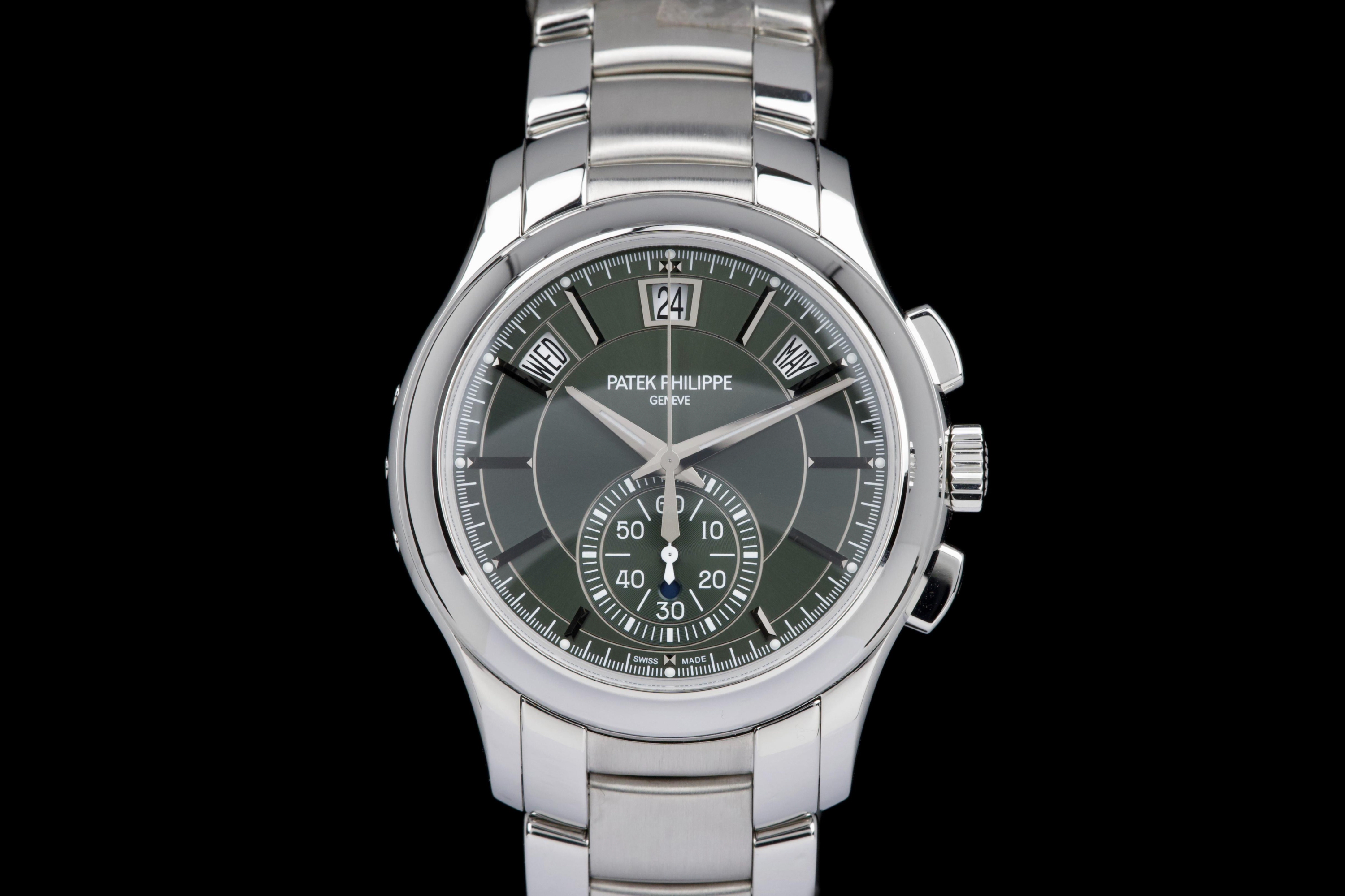 The present Patek Philippe Annual Calendar Chronograph reference 5905, featuring the highly desirable green dial, dates to 2022 and is offered here as a complete full set in unworn condition. The case remains pristine, with factory protective stickers still present on the clasp, underscoring its untouched state. The green sunburst dial is particularly striking, offering a rich and contemporary aesthetic that has made this configuration one of the most sought-after modern executions of the reference. The model combines Patek Philippe’s patented annual calendar complication—requiring correction only once per year—with a flyback chronograph, delivering both practicality and technical sophistication in a clean and highly legible layout. Powered by the in-house automatic calibre CH 28-520 QA 24H, the watch represents the perfect balance between modern performance and classical elegance. Preserved in like-new condition and accompanied by its full original set, this 5905 with green dial represents a rare opportunity to acquire a highly desirable contemporary Patek Philippe complication in unworn state, combining mechanical refinement, bold aesthetics, and strong collector appeal.