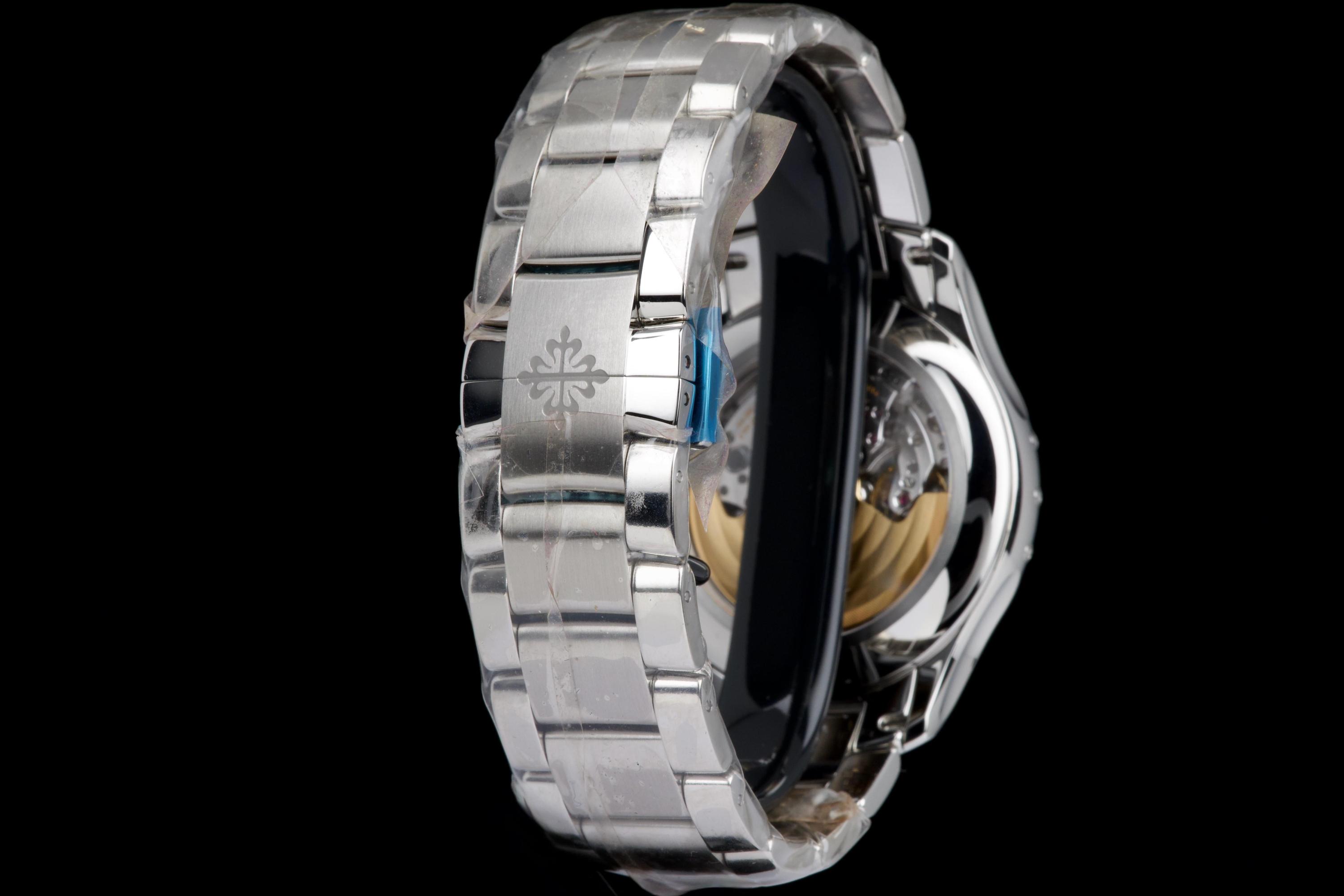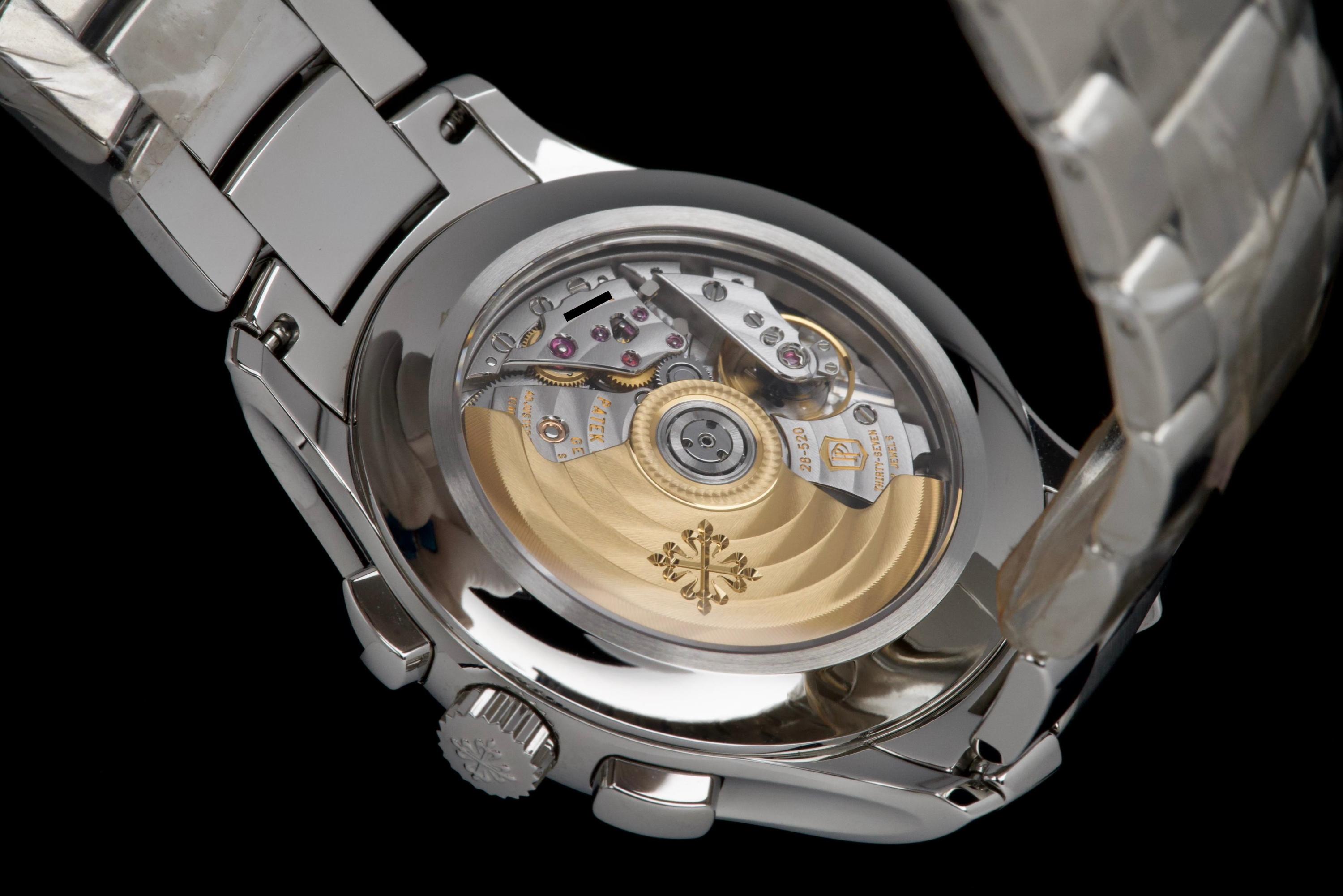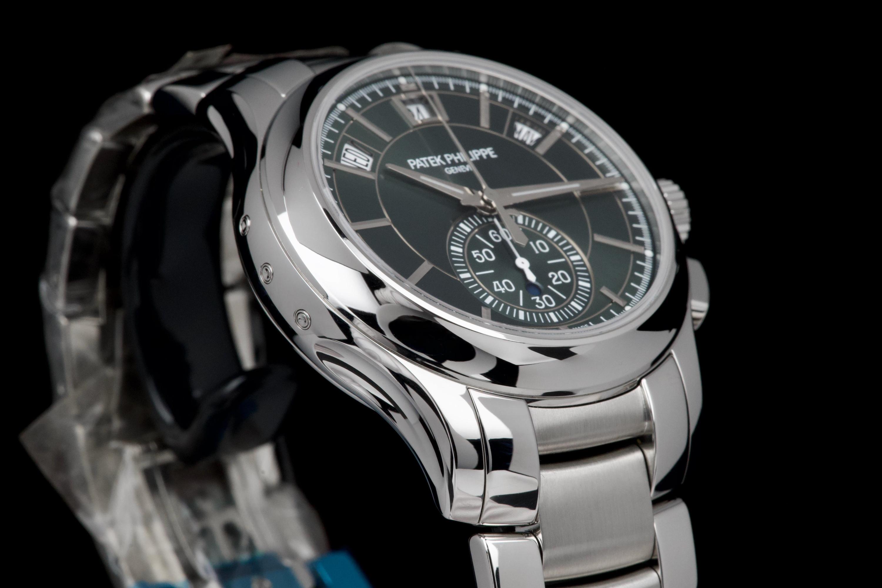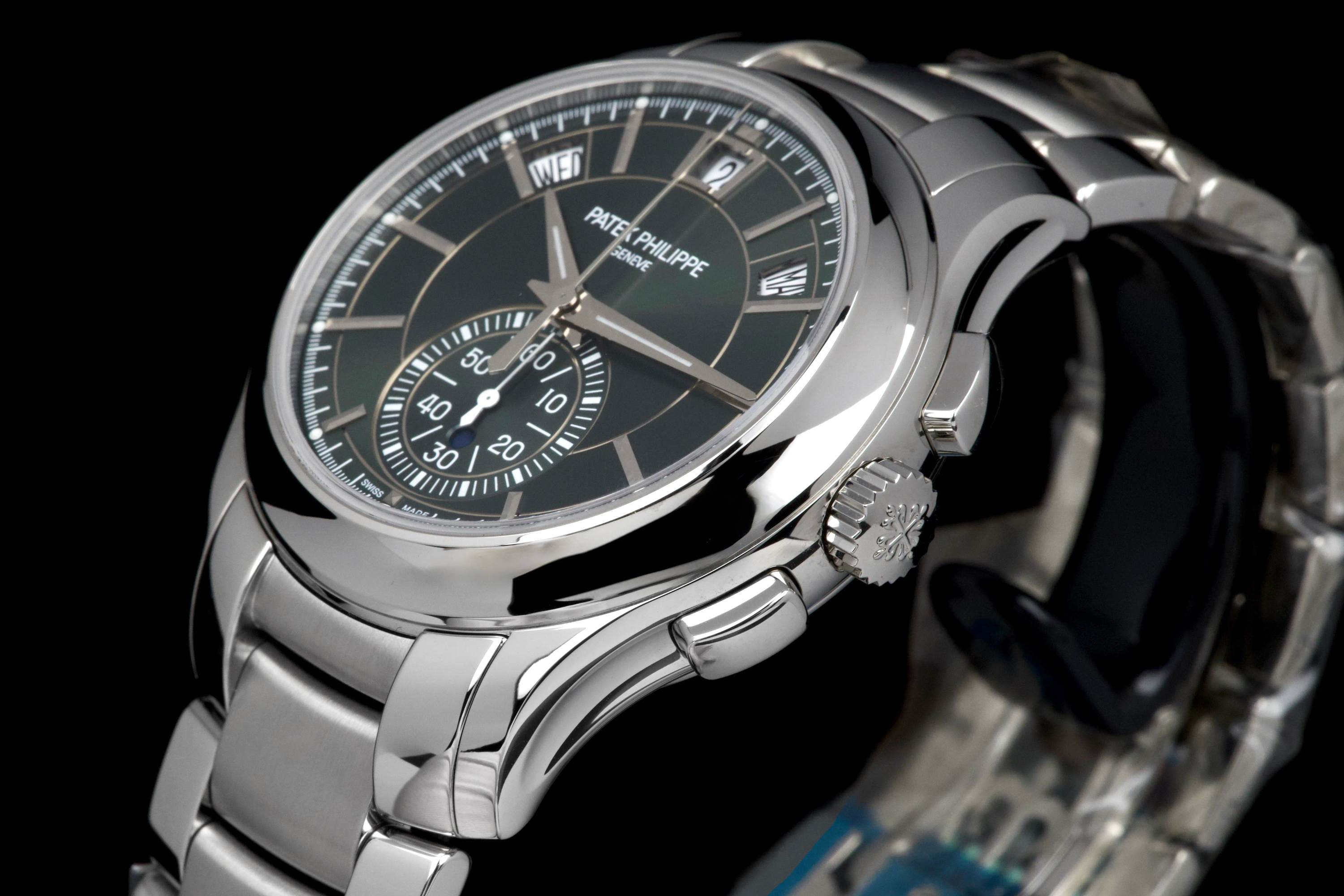 The present Patek Philippe Annual Calendar Chronograph reference 5905, featuring the highly desirable green dial, dates to 2022 and is offered here as a complete full set in unworn condition. The case remains pristine, with factory protective stickers still present on the clasp, underscoring its untouched state. The green sunburst dial is particularly striking, offering a rich and contemporary aesthetic that has made this configuration one of the most sought-after modern executions of the reference. The model combines Patek Philippe’s patented annual calendar complication—requiring correction only once per year—with a flyback chronograph, delivering both practicality and technical sophistication in a clean and highly legible layout. Powered by the in-house automatic calibre CH 28-520 QA 24H, the watch represents the perfect balance between modern performance and classical elegance. Preserved in like-new condition and accompanied by its full original set, this 5905 with green dial represents a rare opportunity to acquire a highly desirable contemporary Patek Philippe complication in unworn state, combining mechanical refinement, bold aesthetics, and strong collector appeal.