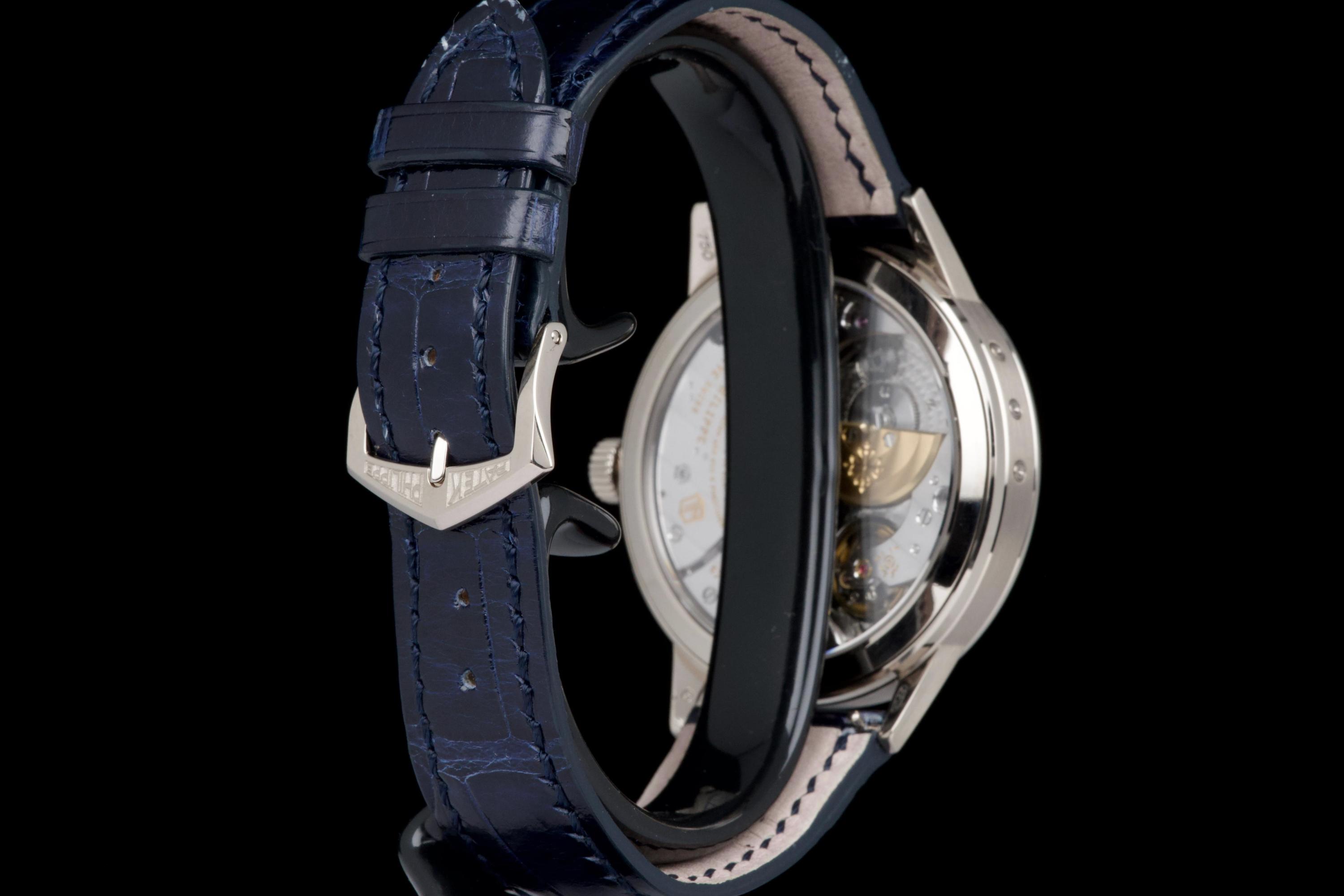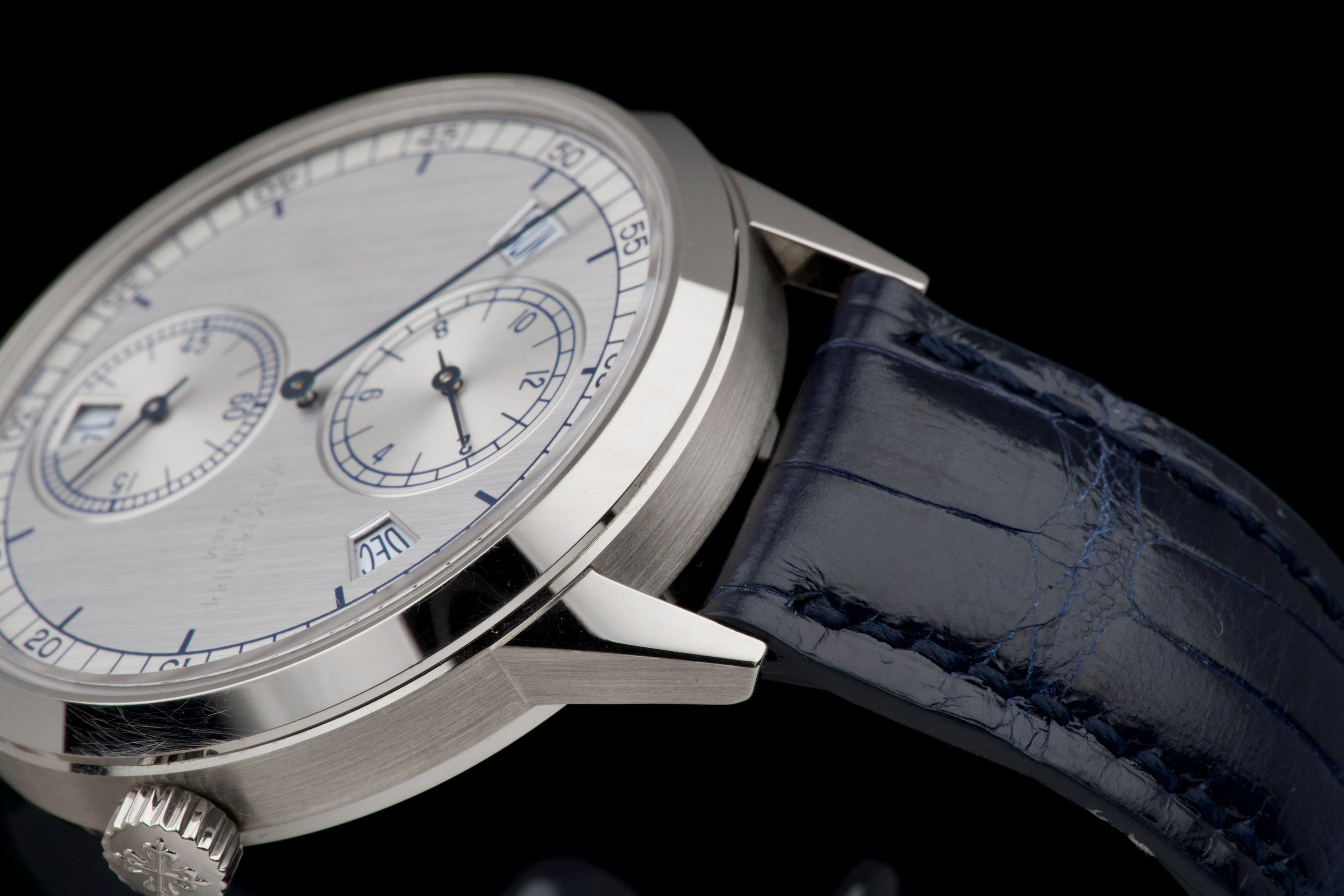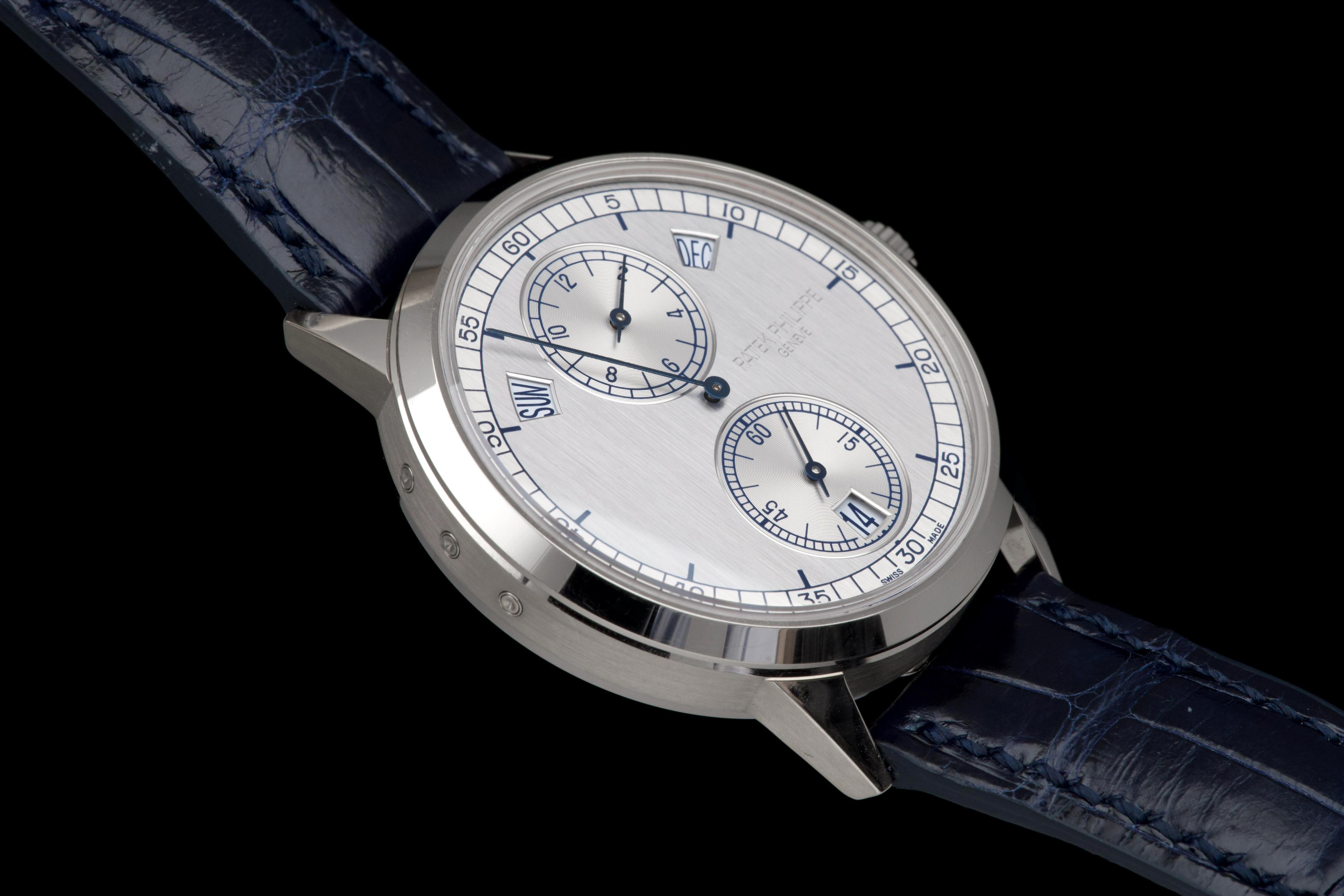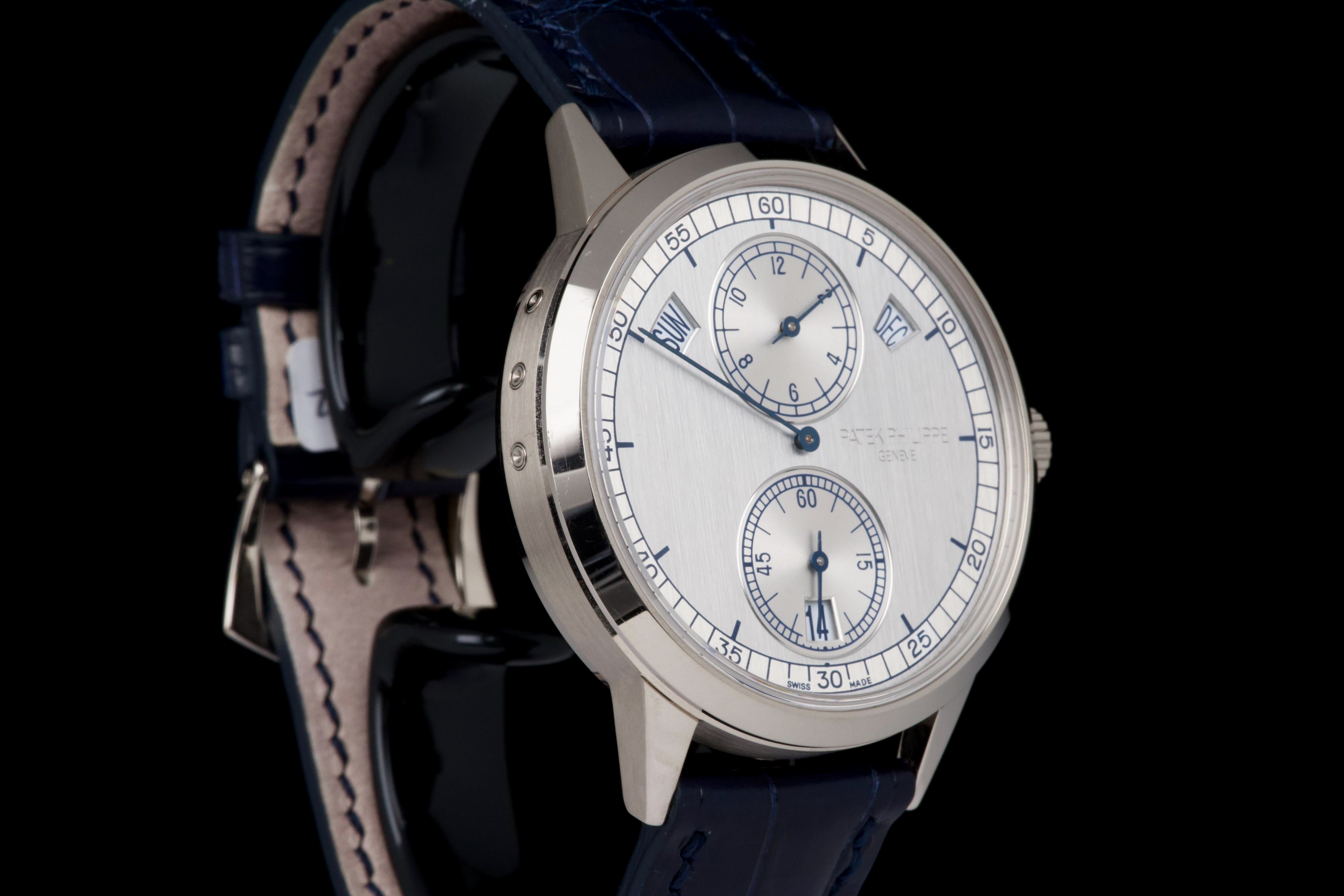 The present Patek Philippe Annual Calendar Regulator reference 5235G, offered here as a complete full set and dating to 2015, is a technically innovative and visually distinctive example of the manufacture’s modern high watchmaking. Originally sold new in Hong Kong in 2015, this watch represents Patek Philippe’s contemporary reinterpretation of the traditional regulator display, combined with an annual calendar complication. Housed in a white-gold case measuring 40.5 mm in diameter, the watch offers a modern yet elegant presence on the wrist. The case appears to have been lightly polished once in the past and is preserved in excellent overall condition, with the bezel remaining nicely flat and well defined. The overall proportions and finishing remain crisp and well balanced. The dial is one of the defining elements of the reference, executed in a vertical satin-finished silver-grey tone with applied white-gold indexes. It features a regulator layout, with separate indications for hours, minutes, and seconds, lending the watch a technical and architectural appearance. The annual calendar indications for day and month are displayed through apertures at 10 and 2 o’clock, with a discreet date indication at 6 o’clock, creating a harmonious and highly legible composition. Powering the watch is the Patek Philippe calibre 31-260 REG QA, an automatic movement developed specifically for this model. Notable for its use of a micro-rotor in 22K gold and advanced construction, the movement incorporates modern technical solutions while maintaining traditional finishing standards. It offers the practicality of an annual calendar, requiring correction only once per year at the end of February. While no service history accompanies the watch, it is running well at the time of cataloguing. The watch is fitted with a blue Patek Philippe alligator leather strap in like-new condition, secured by its original white-gold Patek Philippe ardillon buckle. It is delivered with the set as shown in the accompanying photographs. Combining contemporary design, technical innovation, and refined execution, this Annual Calendar Regulator 5235G represents a compelling opportunity to acquire a distinctive modern Patek Philippe with strong visual identity and practical complication, presented in excellent overall condition and complete with its original accessories.