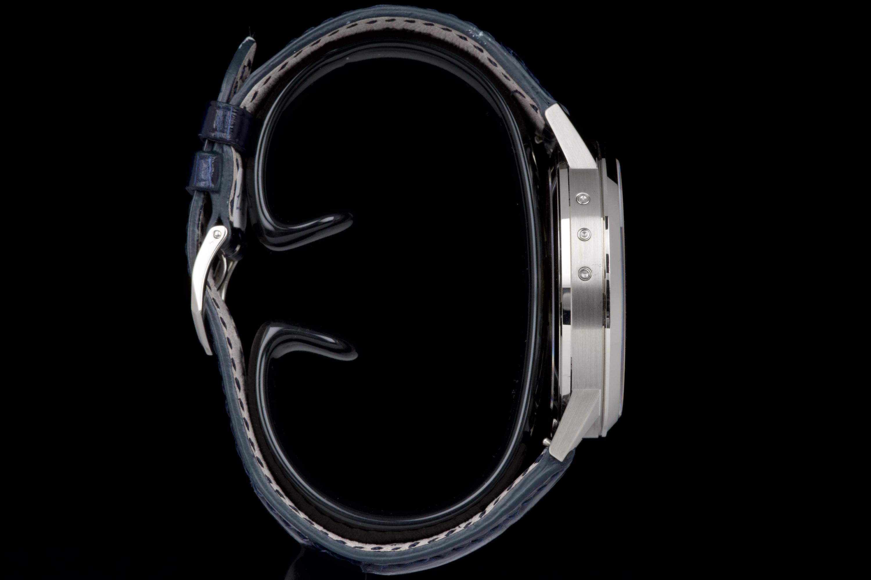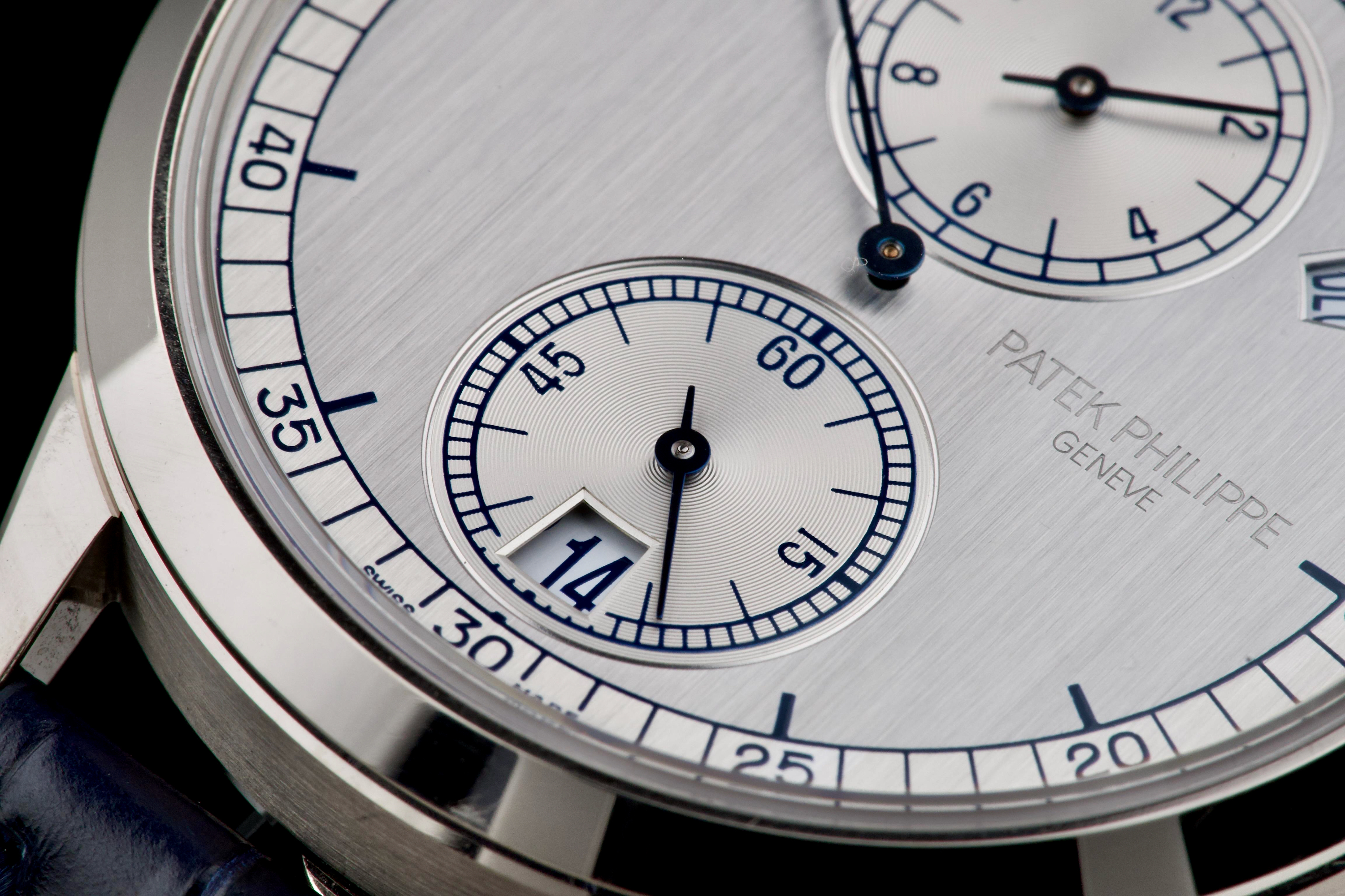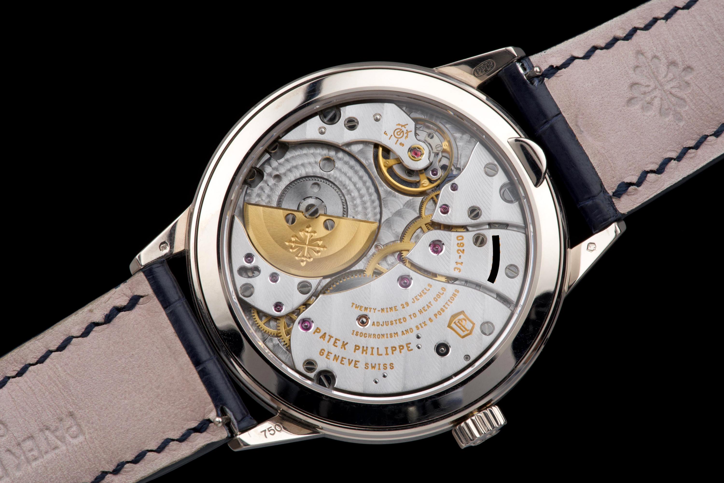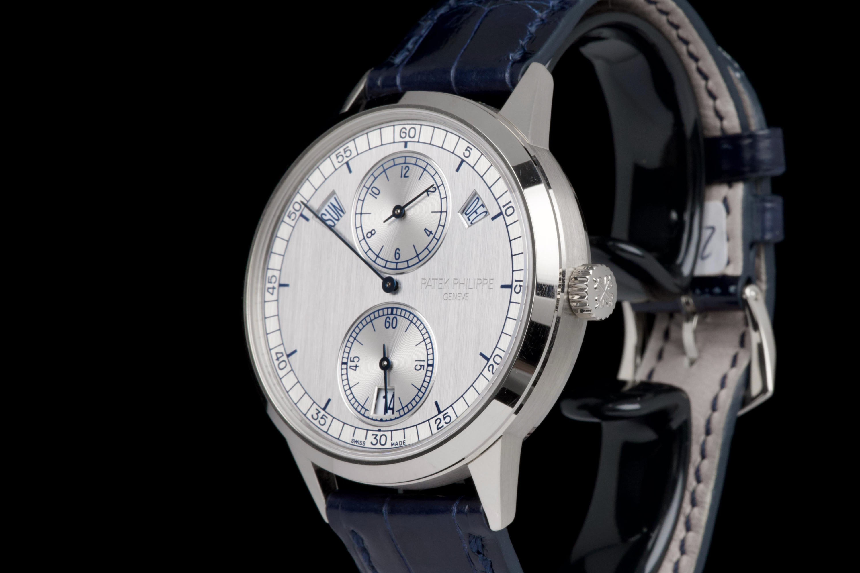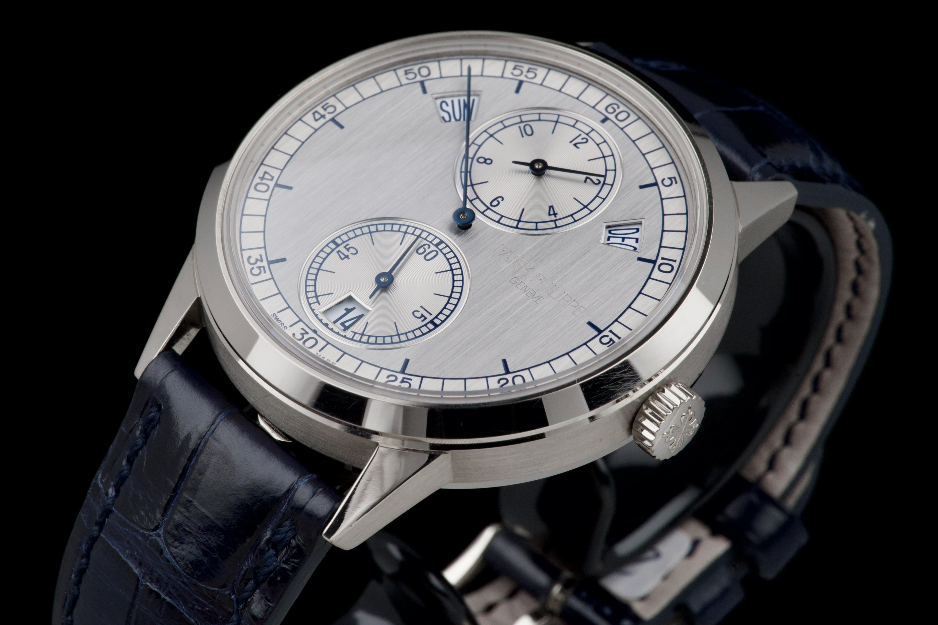 The present Patek Philippe Annual Calendar Regulator reference 5235G, offered here as a complete full set and dating to 2015, is a technically innovative and visually distinctive example of the manufacture’s modern high watchmaking. Originally sold new in Hong Kong in 2015, this watch represents Patek Philippe’s contemporary reinterpretation of the traditional regulator display, combined with an annual calendar complication. Housed in a white-gold case measuring 40.5 mm in diameter, the watch offers a modern yet elegant presence on the wrist. The case appears to have been lightly polished once in the past and is preserved in excellent overall condition, with the bezel remaining nicely flat and well defined. The overall proportions and finishing remain crisp and well balanced. The dial is one of the defining elements of the reference, executed in a vertical satin-finished silver-grey tone with applied white-gold indexes. It features a regulator layout, with separate indications for hours, minutes, and seconds, lending the watch a technical and architectural appearance. The annual calendar indications for day and month are displayed through apertures at 10 and 2 o’clock, with a discreet date indication at 6 o’clock, creating a harmonious and highly legible composition. Powering the watch is the Patek Philippe calibre 31-260 REG QA, an automatic movement developed specifically for this model. Notable for its use of a micro-rotor in 22K gold and advanced construction, the movement incorporates modern technical solutions while maintaining traditional finishing standards. It offers the practicality of an annual calendar, requiring correction only once per year at the end of February. While no service history accompanies the watch, it is running well at the time of cataloguing. The watch is fitted with a blue Patek Philippe alligator leather strap in like-new condition, secured by its original white-gold Patek Philippe ardillon buckle. It is delivered with the set as shown in the accompanying photographs. Combining contemporary design, technical innovation, and refined execution, this Annual Calendar Regulator 5235G represents a compelling opportunity to acquire a distinctive modern Patek Philippe with strong visual identity and practical complication, presented in excellent overall condition and complete with its original accessories.