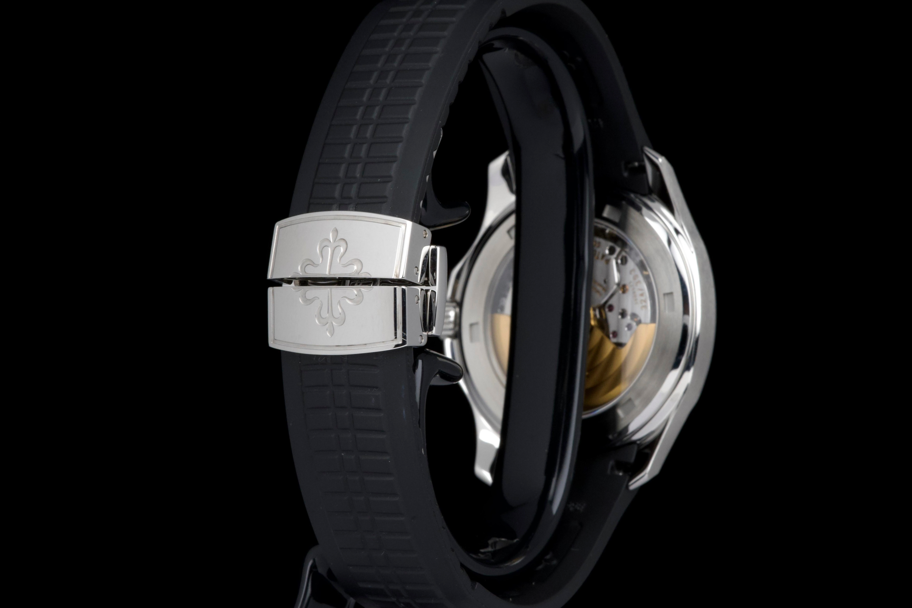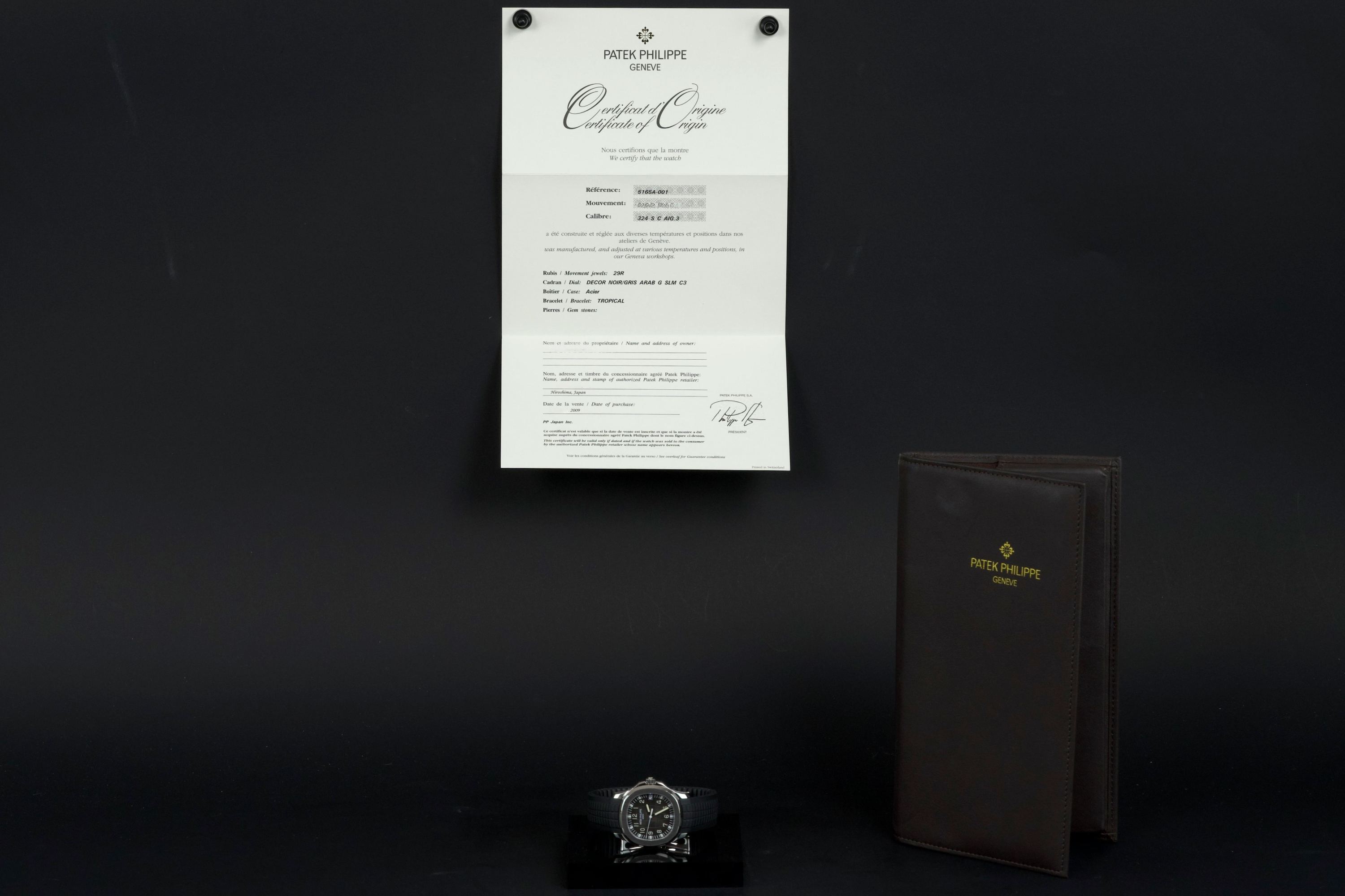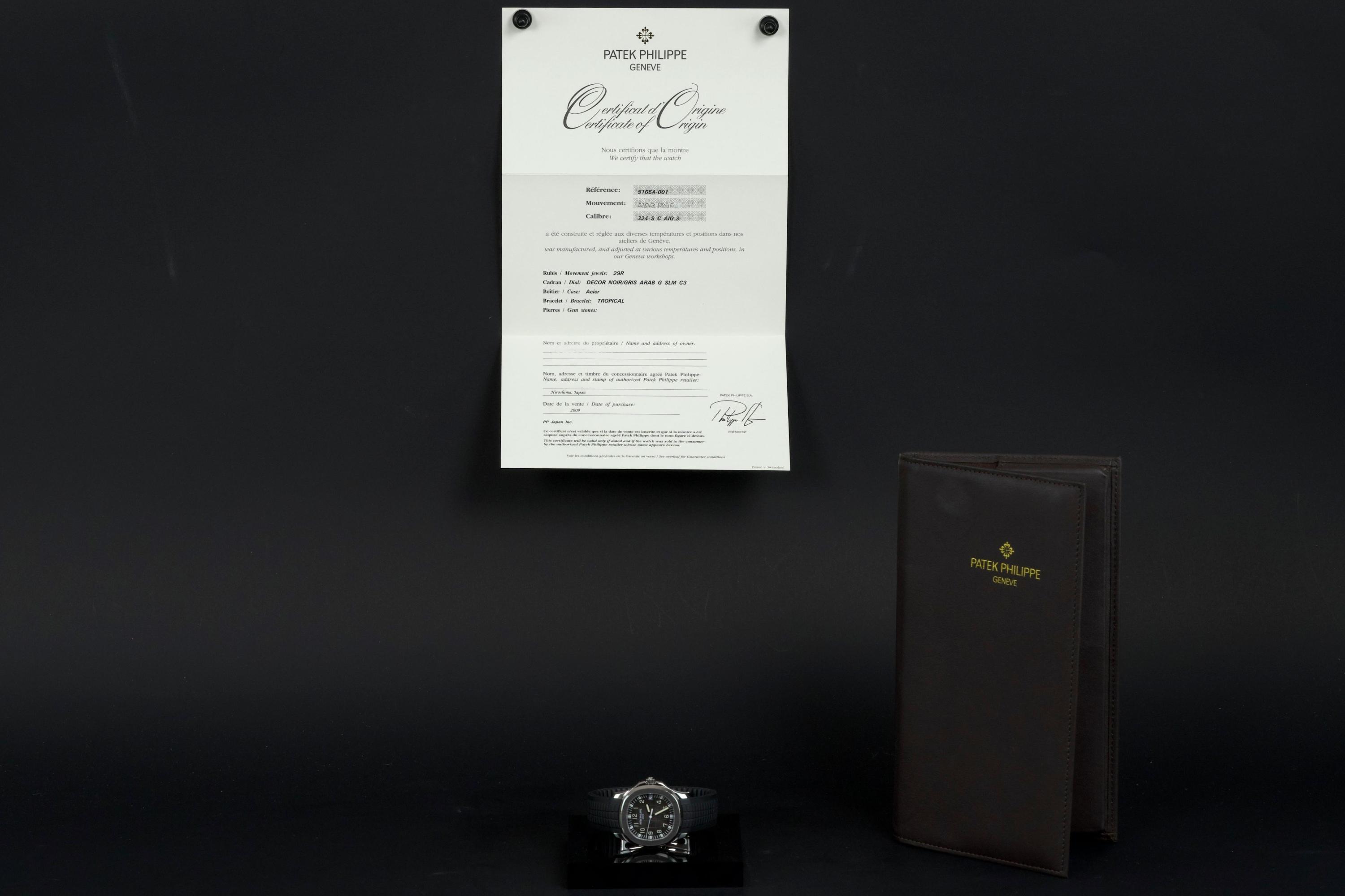 Presented here is a rare and highly appealing example of the Patek Philippe Aquanaut reference 5165, the so-called “Jumbo” Aquanaut, distinguished by its elegant 38mm case. Produced in 2009, this short-lived reference is particularly sought after for its balanced proportions, bridging the gap between the original Aquanaut and later, larger iterations. The watch has been professionally polished by our watchmaker and today presents in very clean overall condition. The movement has been checked and is in proper working order. Accompanied by its original papers, booklets, and leather document holder, this example is offered without the original box. A refined and wearable expression of the Aquanaut line, this reference 5165 offers understated sport elegance and increasing collectability, making it an attractive opportunity for collectors seeking a rare and well-presented Patek Philippe sports watch.