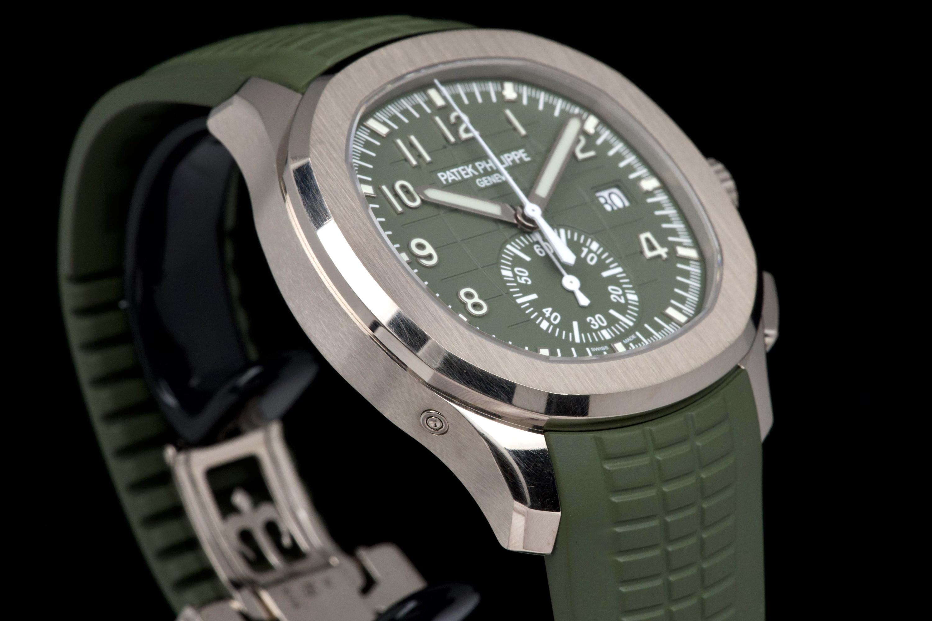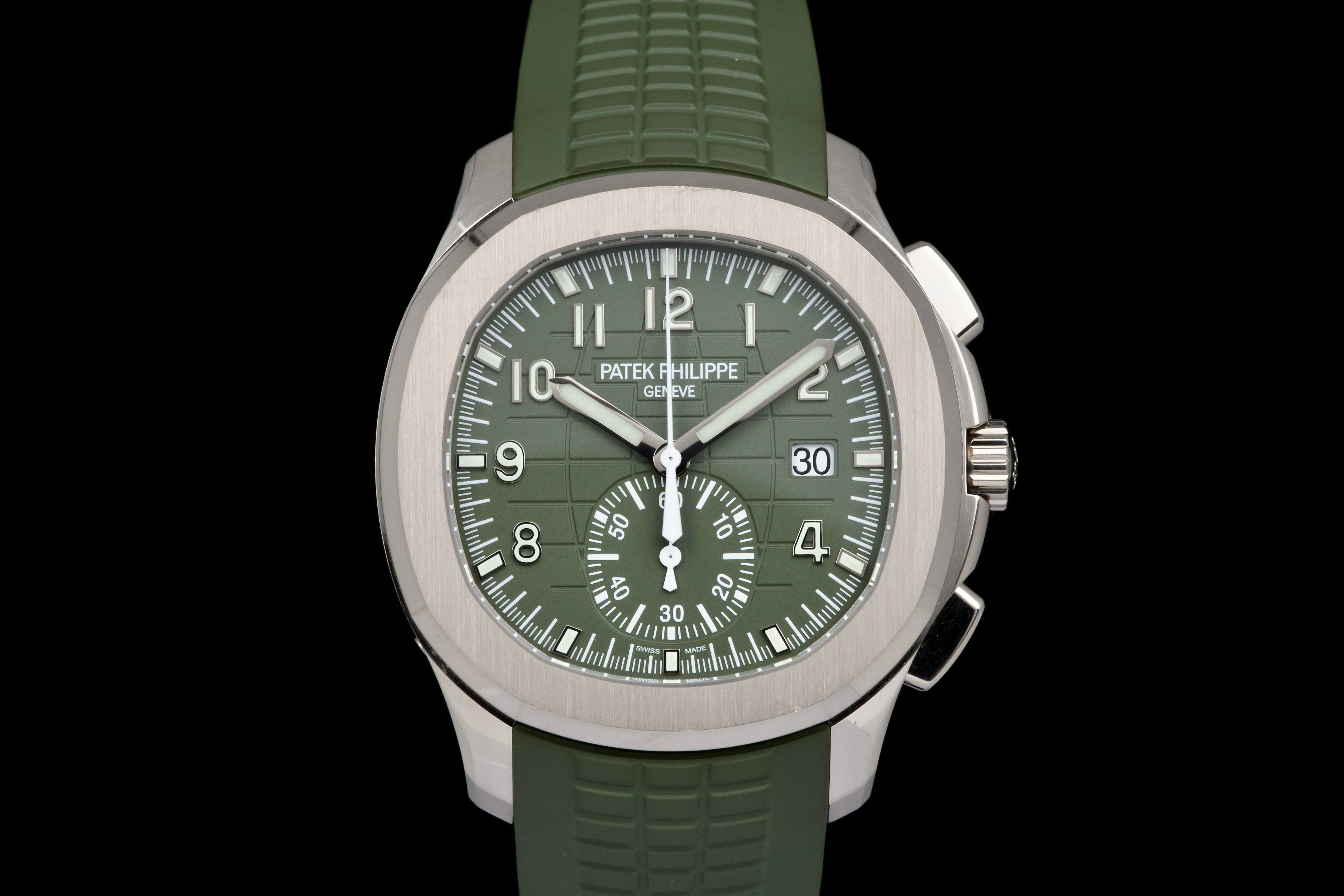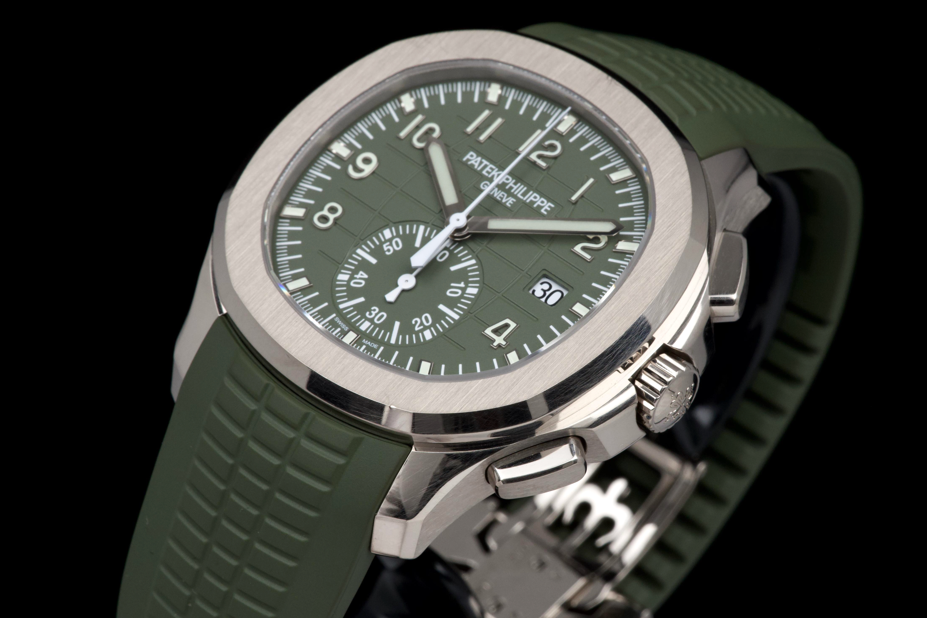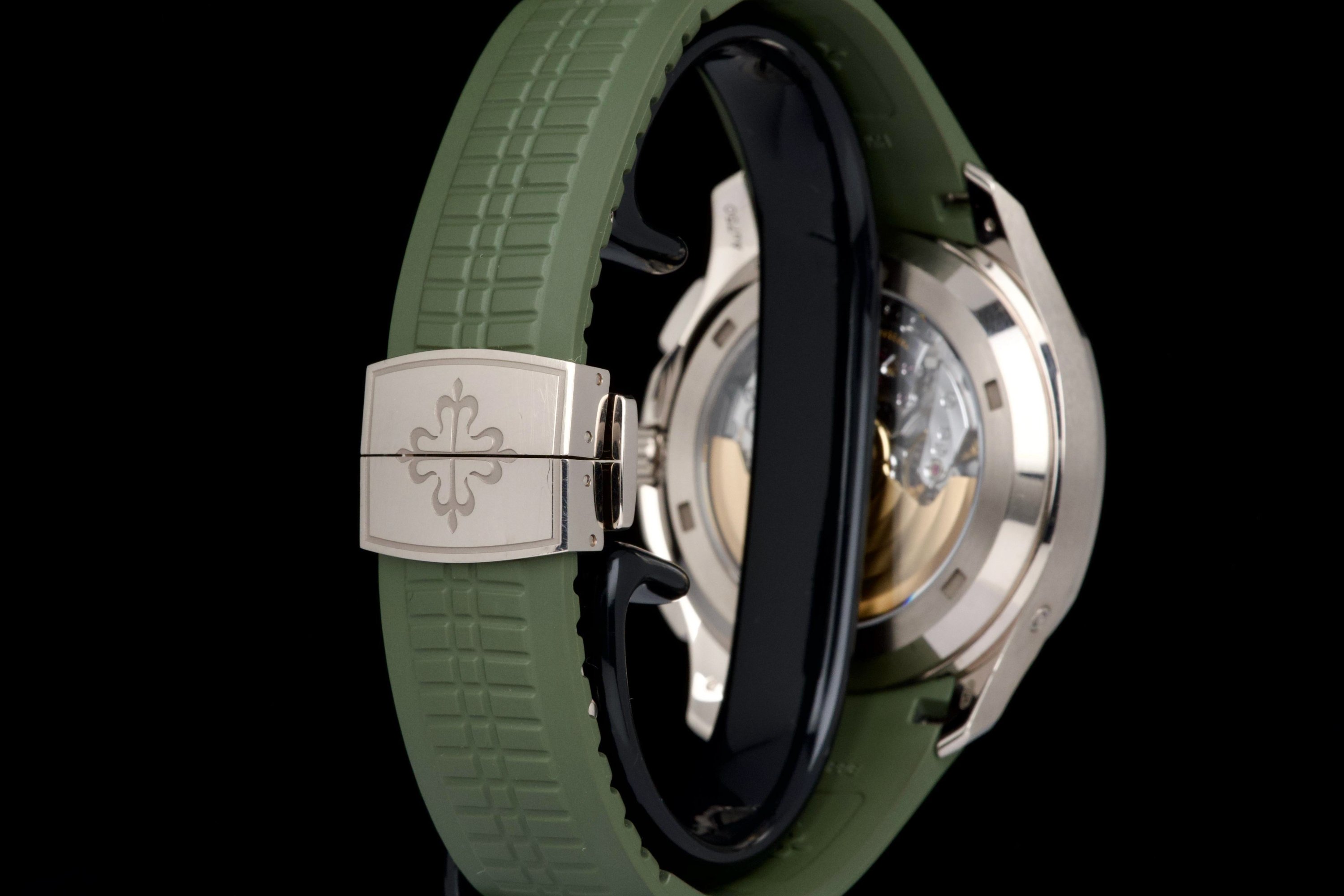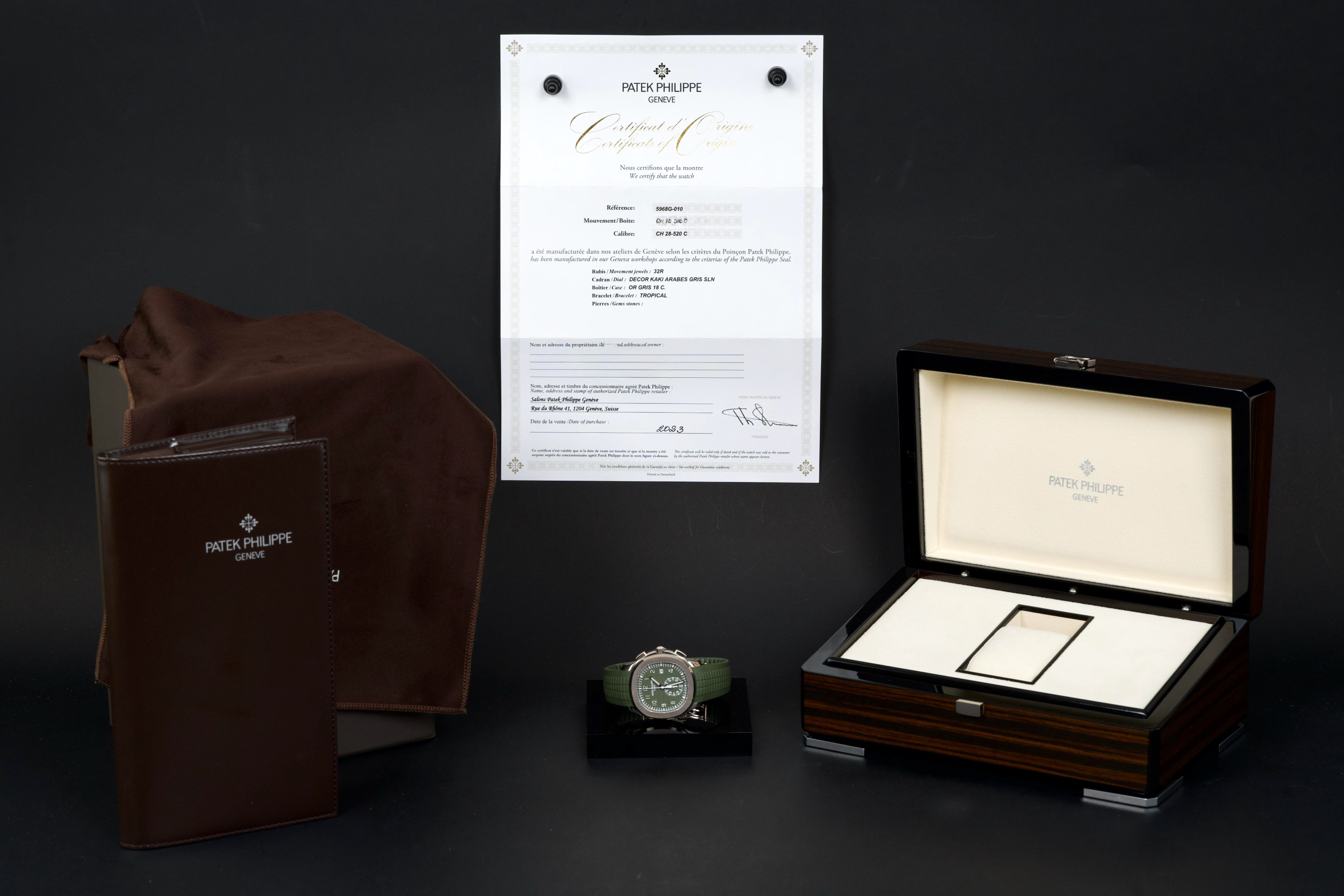The present Patek Philippe Aquanaut reference 5168G-010, featuring the highly desirable Khaki Green dial, dates to 2023 and is offered as a complete full set from its original owner. This reference stands among the most sought-after modern Aquanaut variants, prized for its contemporary 42.2 mm white-gold case and distinctive military-inspired colorway. The case shows light signs of wear, including small marks consistent with normal use, and remains in very good overall condition. It may be polished upon request, though it currently retains strong definition and presence. The bold khaki green dial, embossed with the signature Aquanaut pattern, remains crisp and attractive, offering excellent legibility and a unique character within Patek Philippe’s sport collection. The watch is fitted with its original green composite rubber strap, preserved in excellent condition, complementing the dial and reinforcing the model’s sporty yet refined aesthetic. Powered by Patek Philippe’s automatic calibre 324 S C, the watch delivers reliable performance and refined finishing consistent with the manufacture’s standards. Delivered as a full set from 2023 and accompanied by first-owner provenance, this Aquanaut 5168G Khaki Green represents a compelling opportunity to acquire one of the most distinctive and collectible contemporary Patek Philippe sports models, combining precious-metal construction with bold modern design.