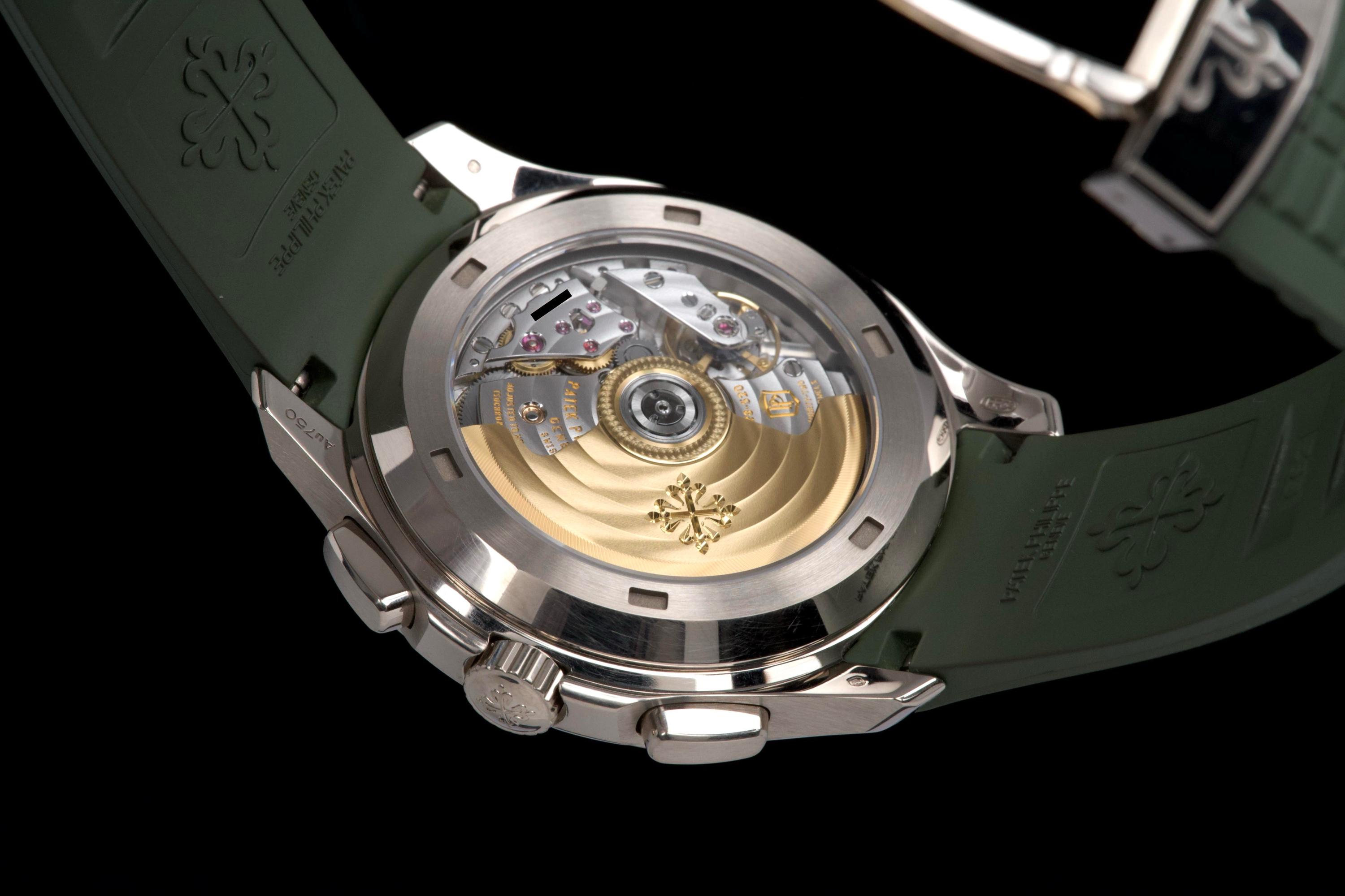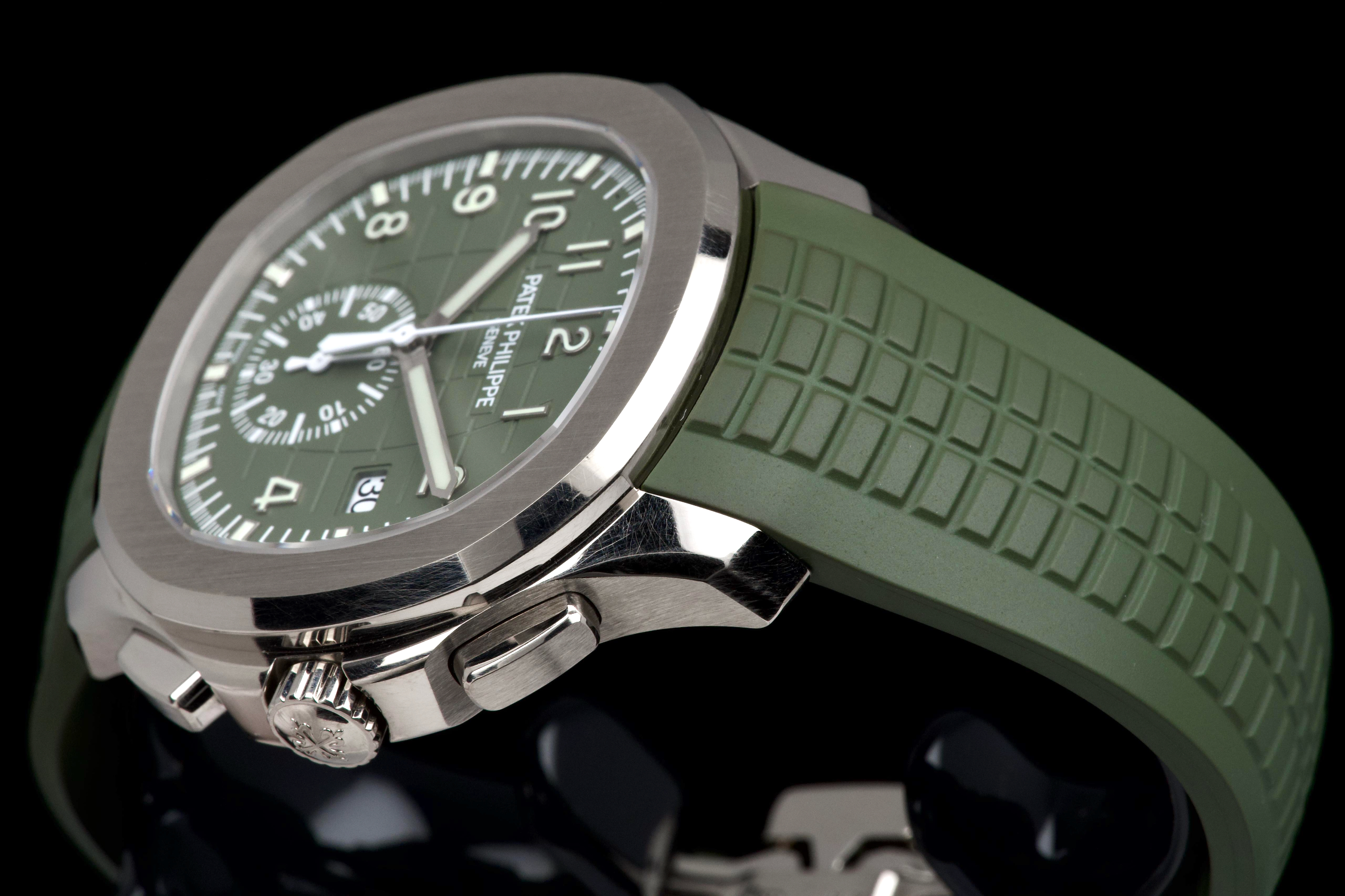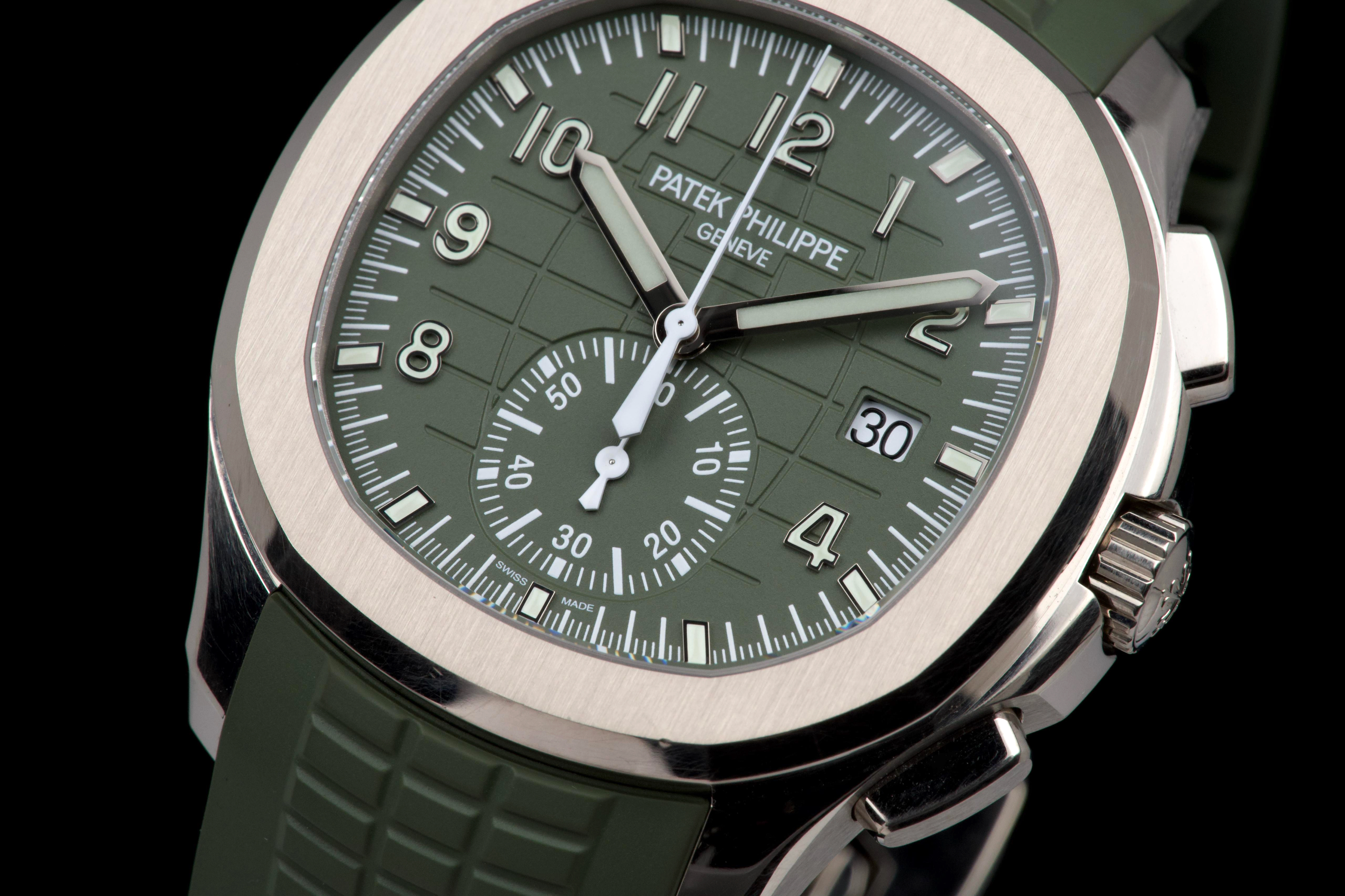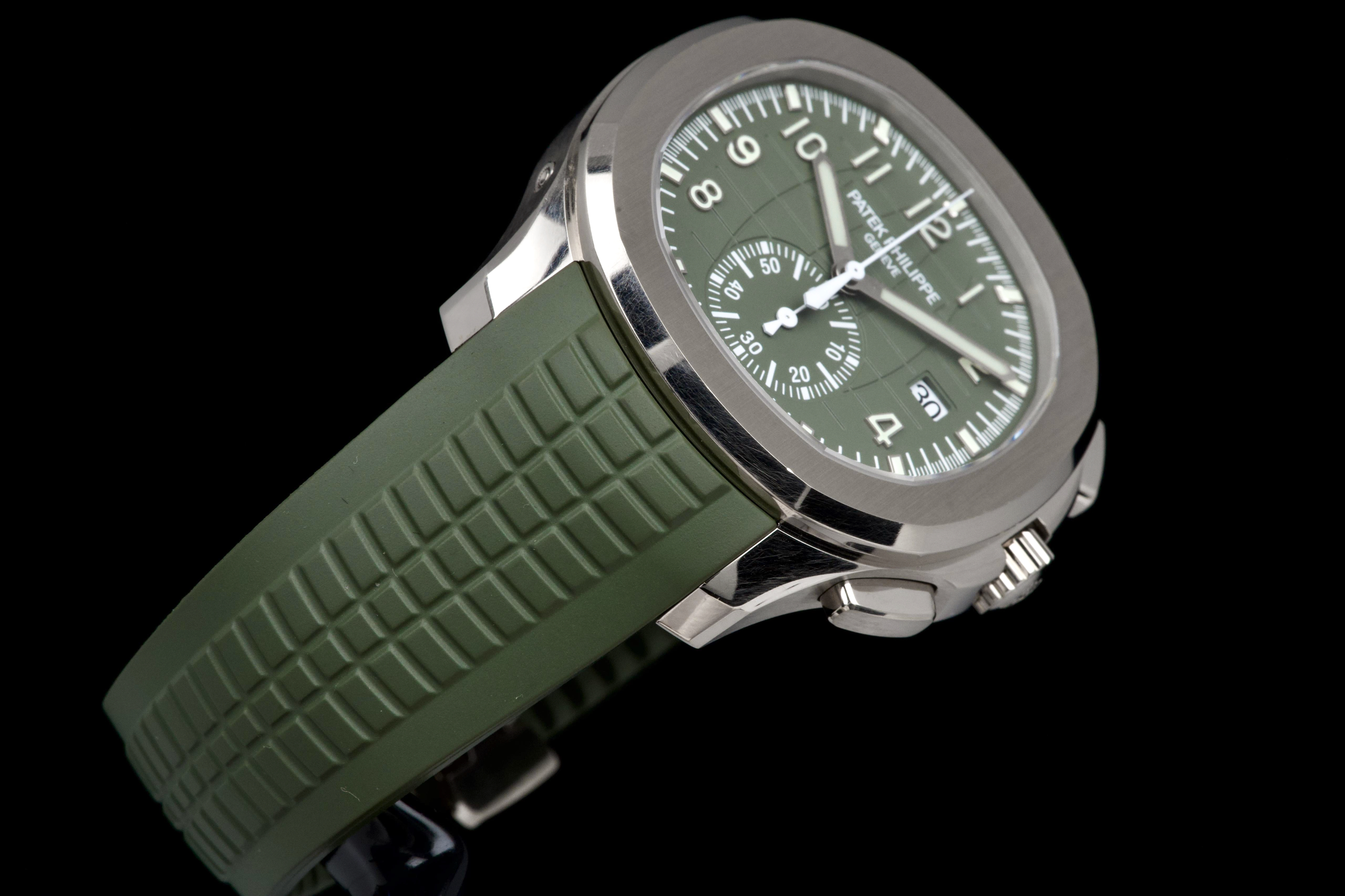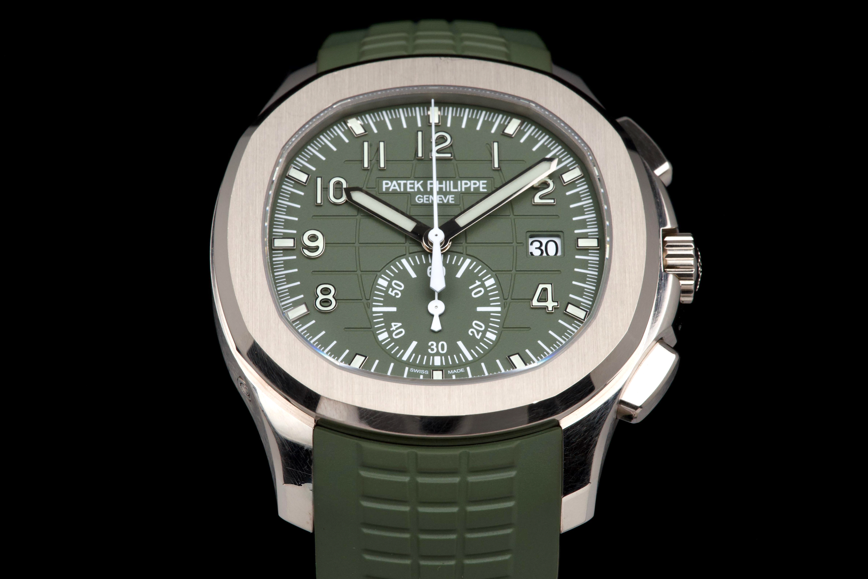The present Patek Philippe Aquanaut reference 5168G-010, featuring the highly desirable Khaki Green dial, dates to 2023 and is offered as a complete full set from its original owner. This reference stands among the most sought-after modern Aquanaut variants, prized for its contemporary 42.2 mm white-gold case and distinctive military-inspired colorway. The case shows light signs of wear, including small marks consistent with normal use, and remains in very good overall condition. It may be polished upon request, though it currently retains strong definition and presence. The bold khaki green dial, embossed with the signature Aquanaut pattern, remains crisp and attractive, offering excellent legibility and a unique character within Patek Philippe’s sport collection. The watch is fitted with its original green composite rubber strap, preserved in excellent condition, complementing the dial and reinforcing the model’s sporty yet refined aesthetic. Powered by Patek Philippe’s automatic calibre 324 S C, the watch delivers reliable performance and refined finishing consistent with the manufacture’s standards. Delivered as a full set from 2023 and accompanied by first-owner provenance, this Aquanaut 5168G Khaki Green represents a compelling opportunity to acquire one of the most distinctive and collectible contemporary Patek Philippe sports models, combining precious-metal construction with bold modern design.