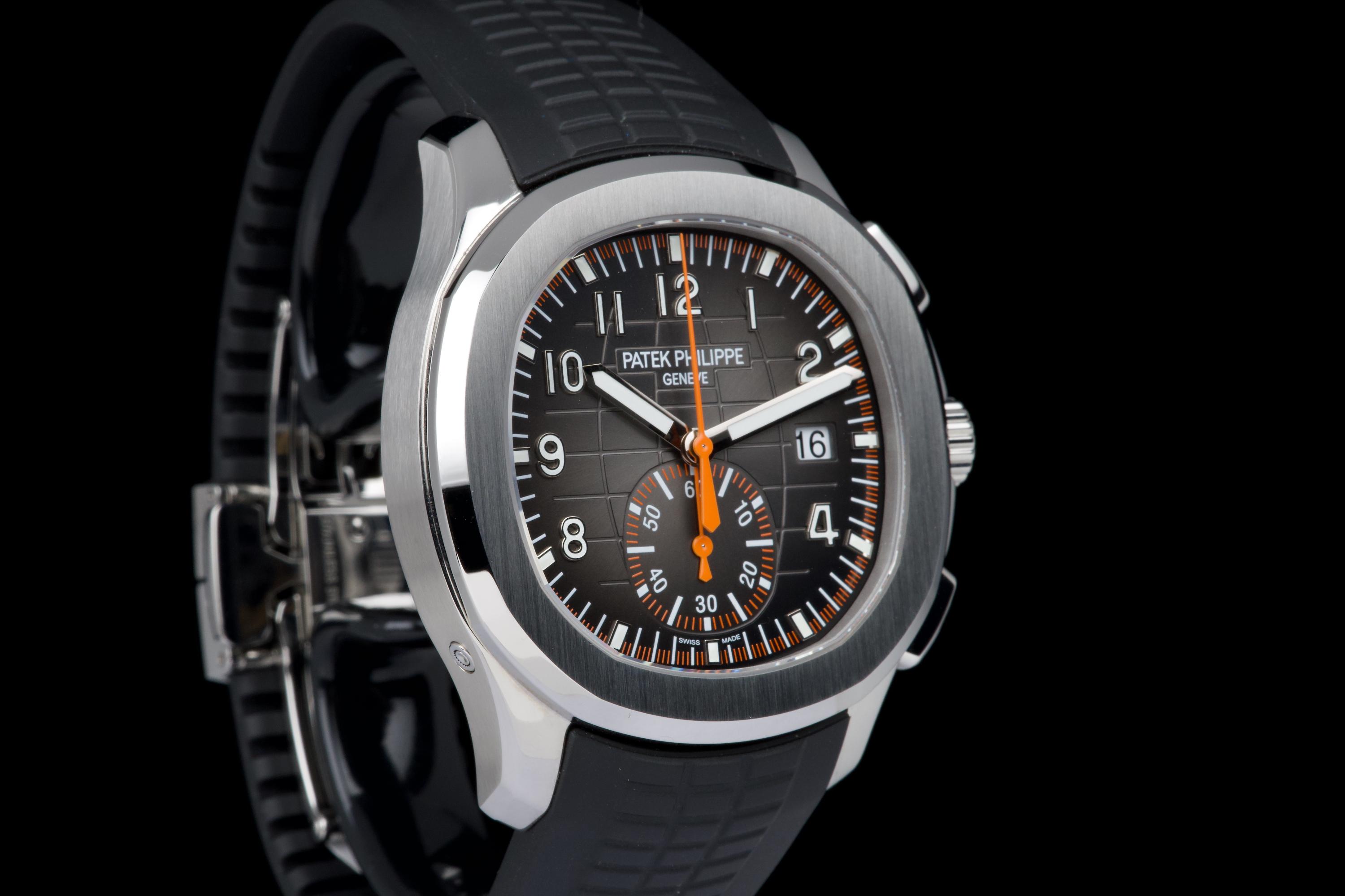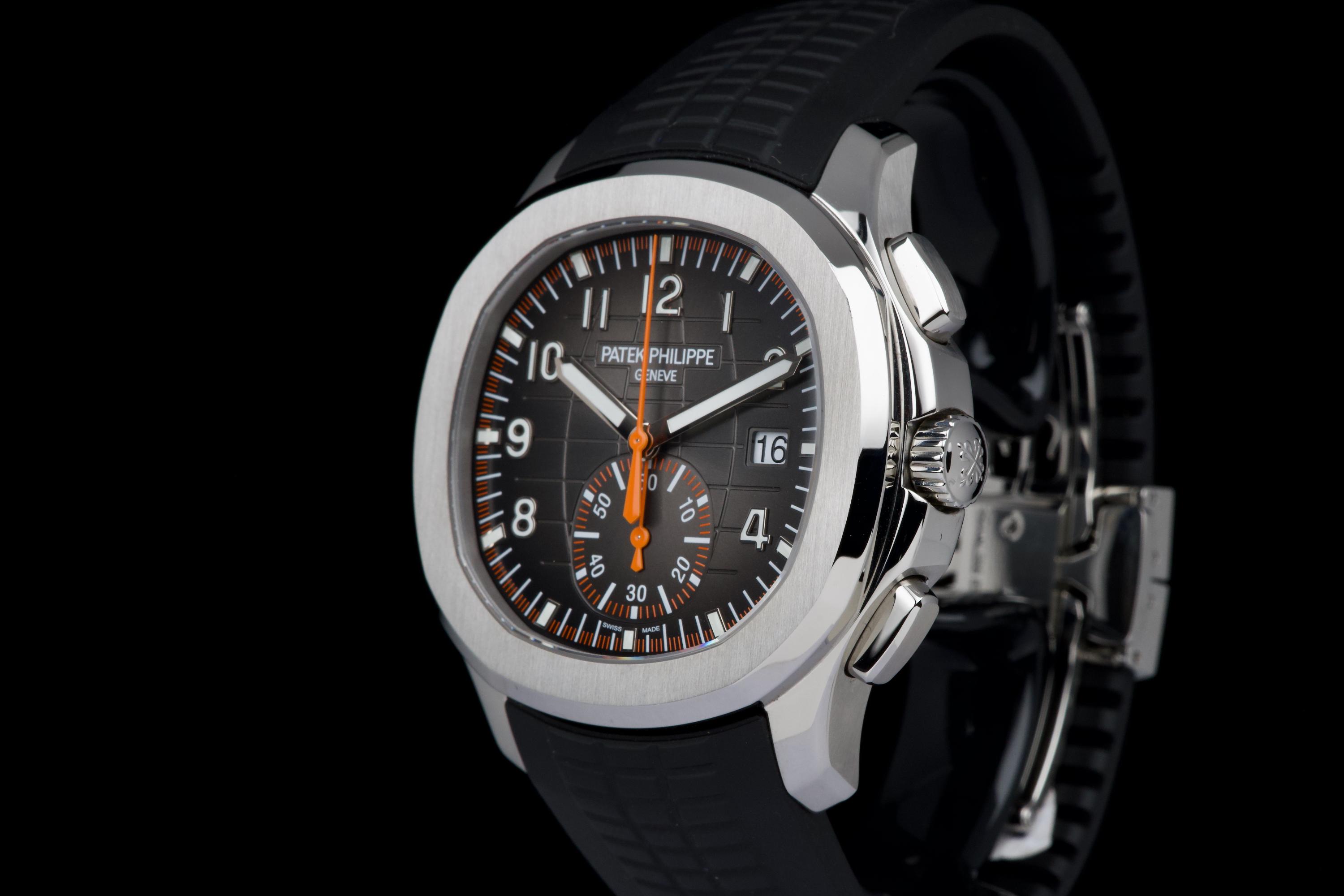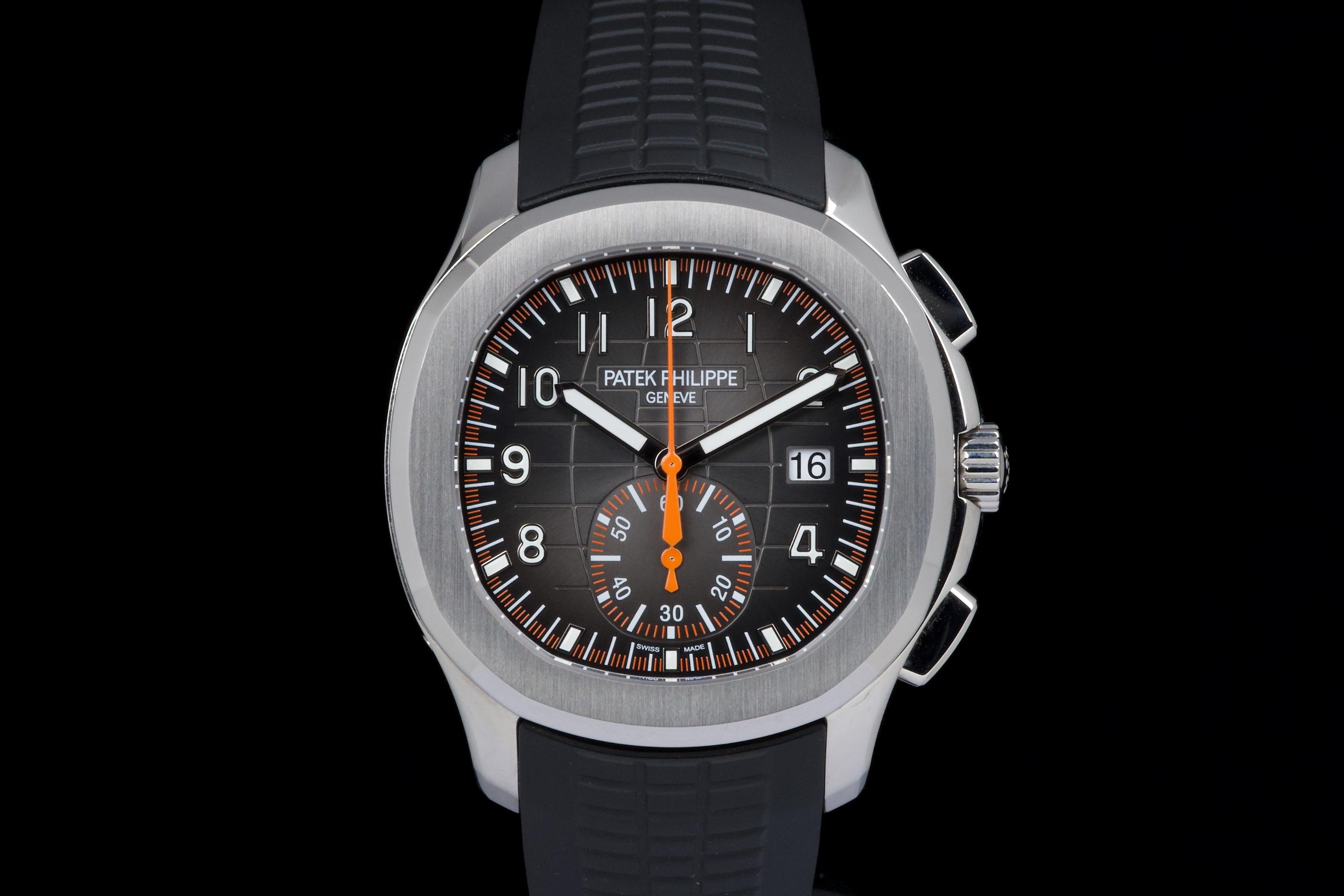 An exceptional example of the Patek Philippe Aquanaut Chronograph reference 5968A-001, presented in mint, unworn condition. Crafted in stainless steel, this model features the embossed black dial with orange chronograph accents and comes with both black and orange composite rubber straps. Powered by the automatic Patek Philippe caliber CH 28-520 C, offering flyback chronograph functionality and visible through the sapphire caseback. Complete with its full 2023 set, including box, warranty card, booklets, and accessories. A highly desirable modern Aquanaut — sporty, contemporary, and in flawless collector condition.