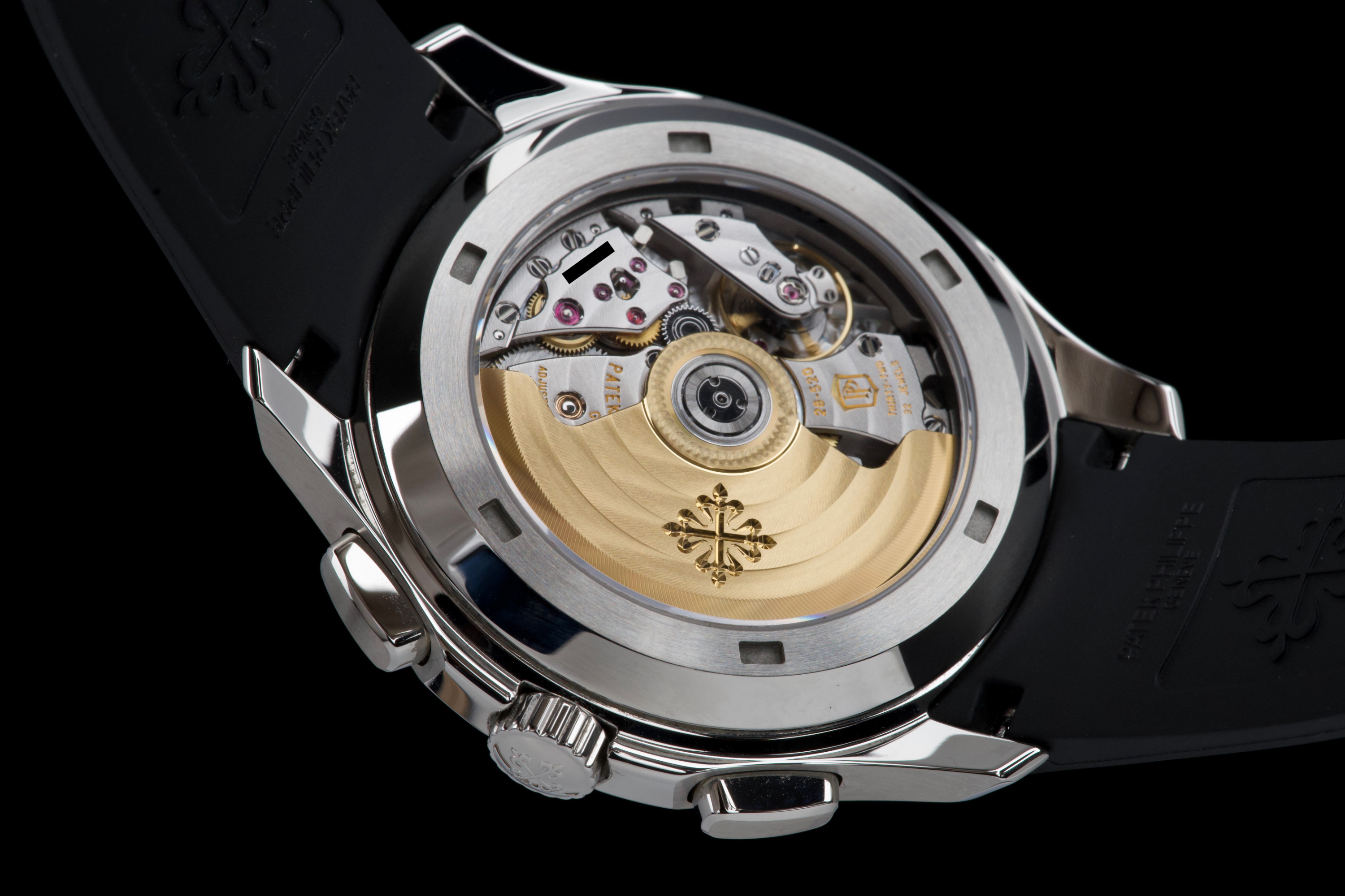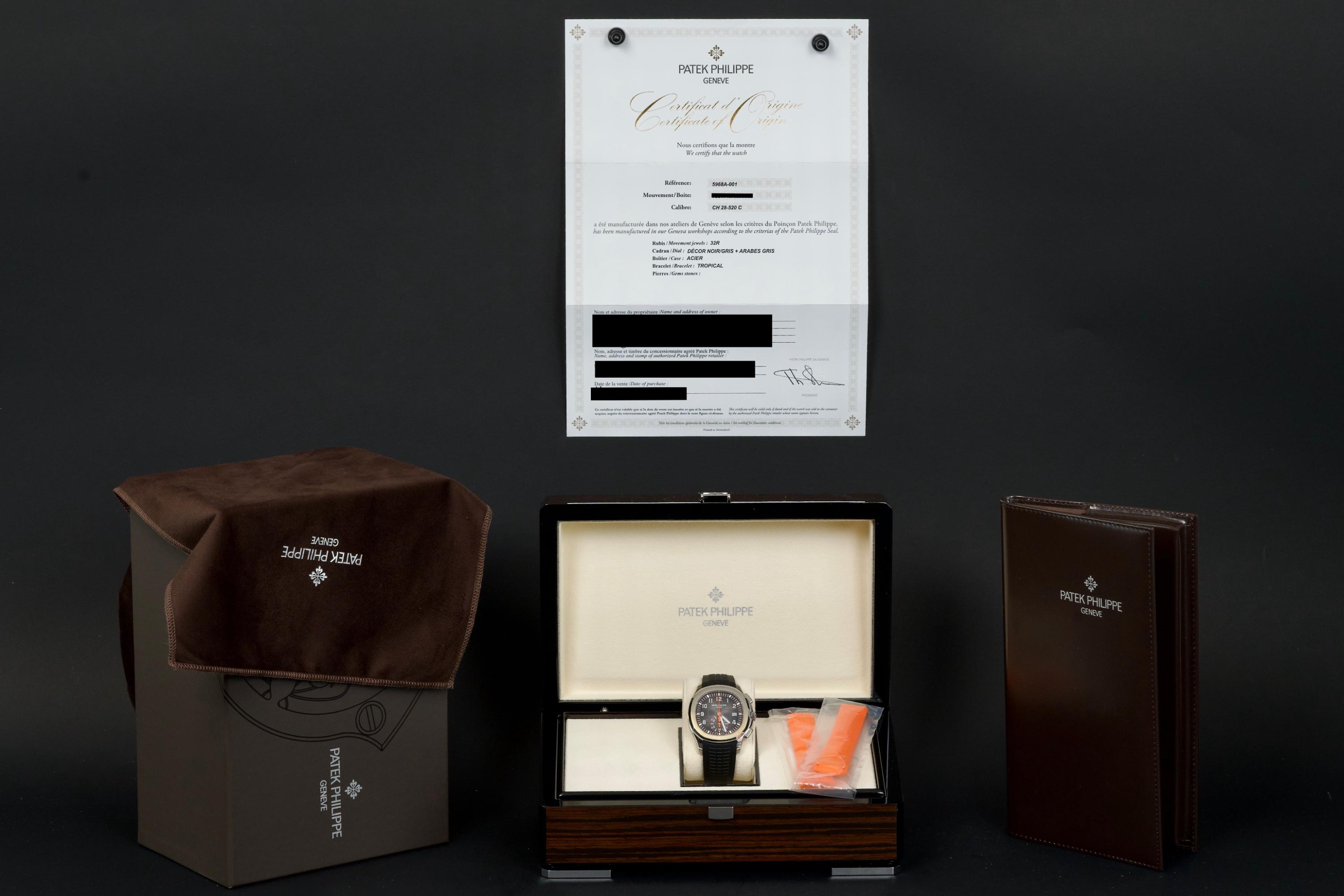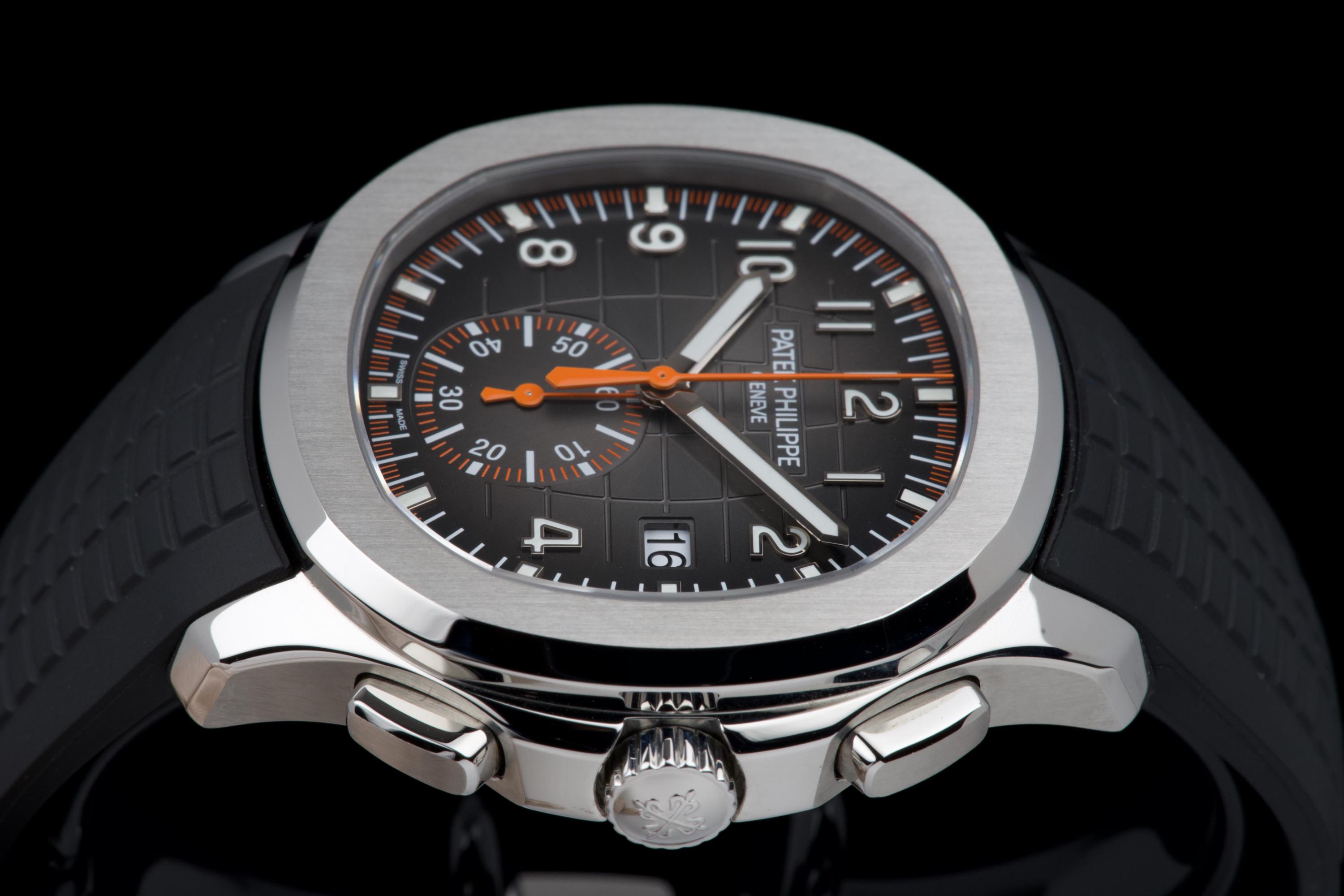 An exceptional example of the Patek Philippe Aquanaut Chronograph reference 5968A-001, presented in mint, unworn condition. Crafted in stainless steel, this model features the embossed black dial with orange chronograph accents and comes with both black and orange composite rubber straps. Powered by the automatic Patek Philippe caliber CH 28-520 C, offering flyback chronograph functionality and visible through the sapphire caseback. Complete with its full 2023 set, including box, warranty card, booklets, and accessories. A highly desirable modern Aquanaut — sporty, contemporary, and in flawless collector condition.