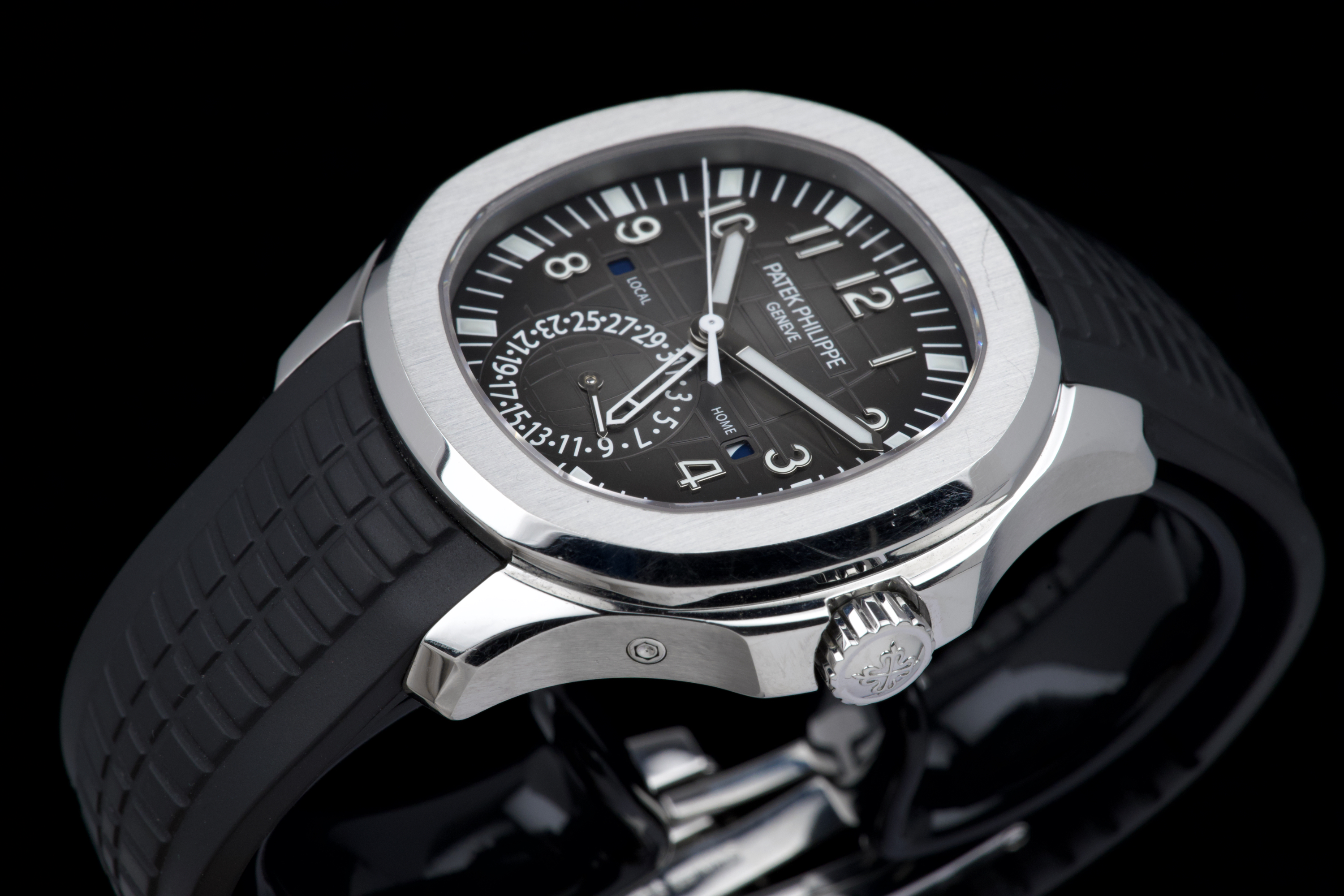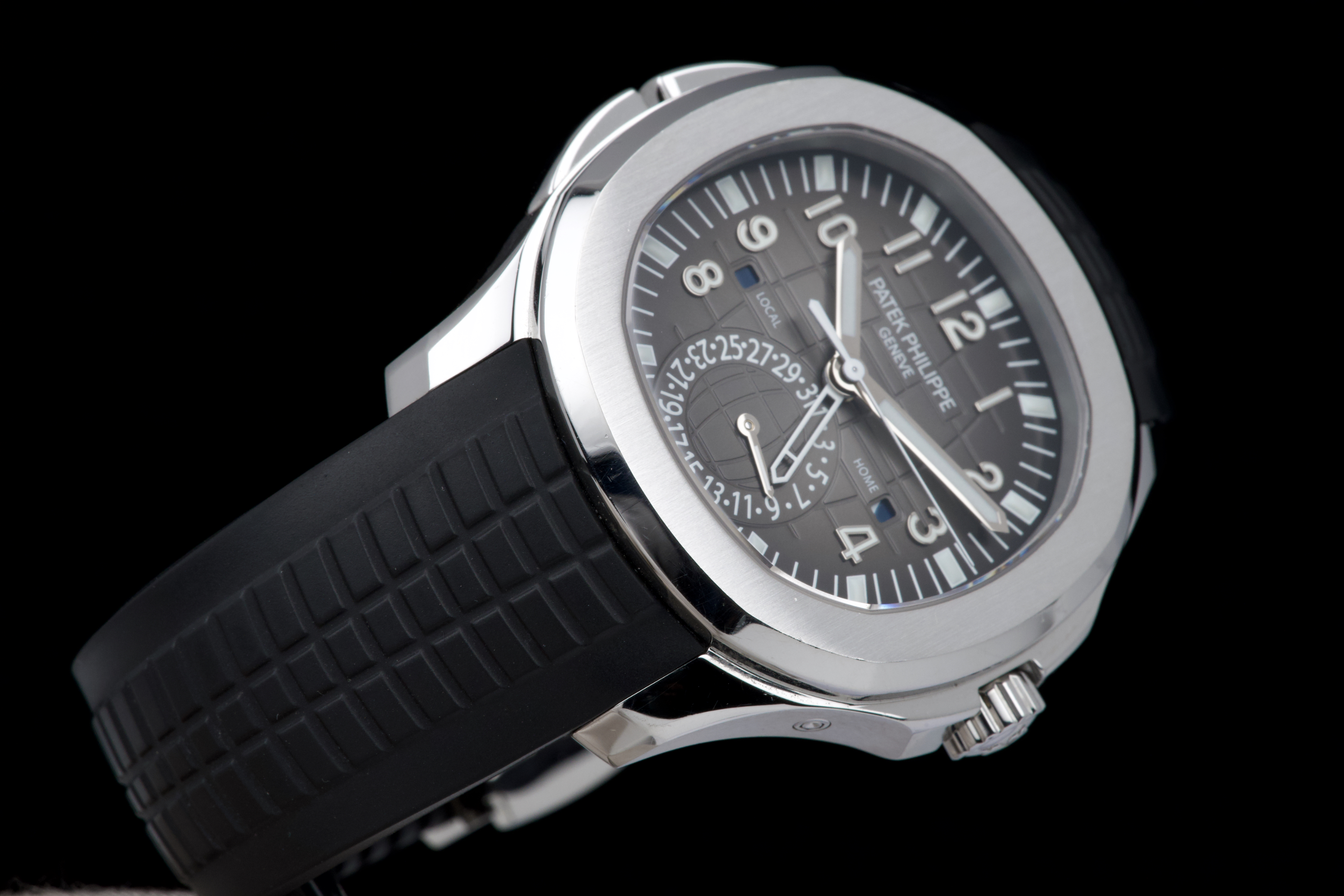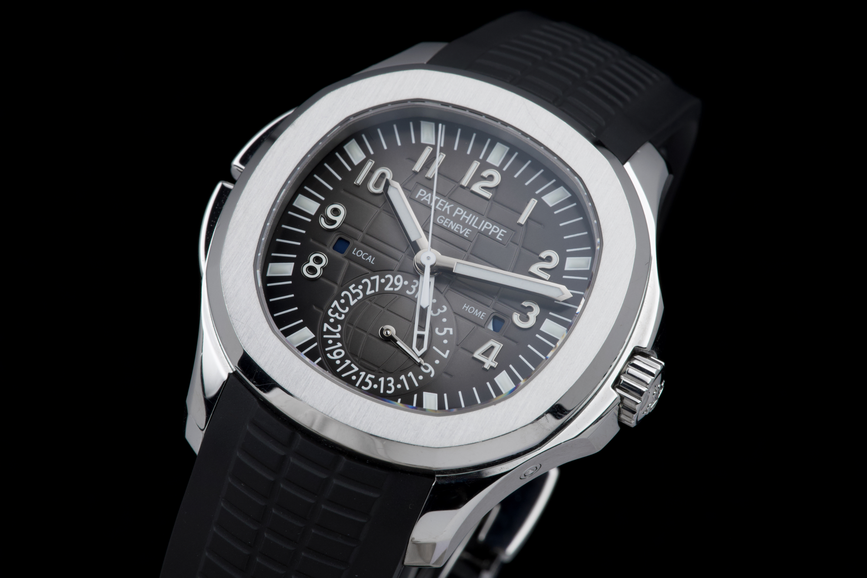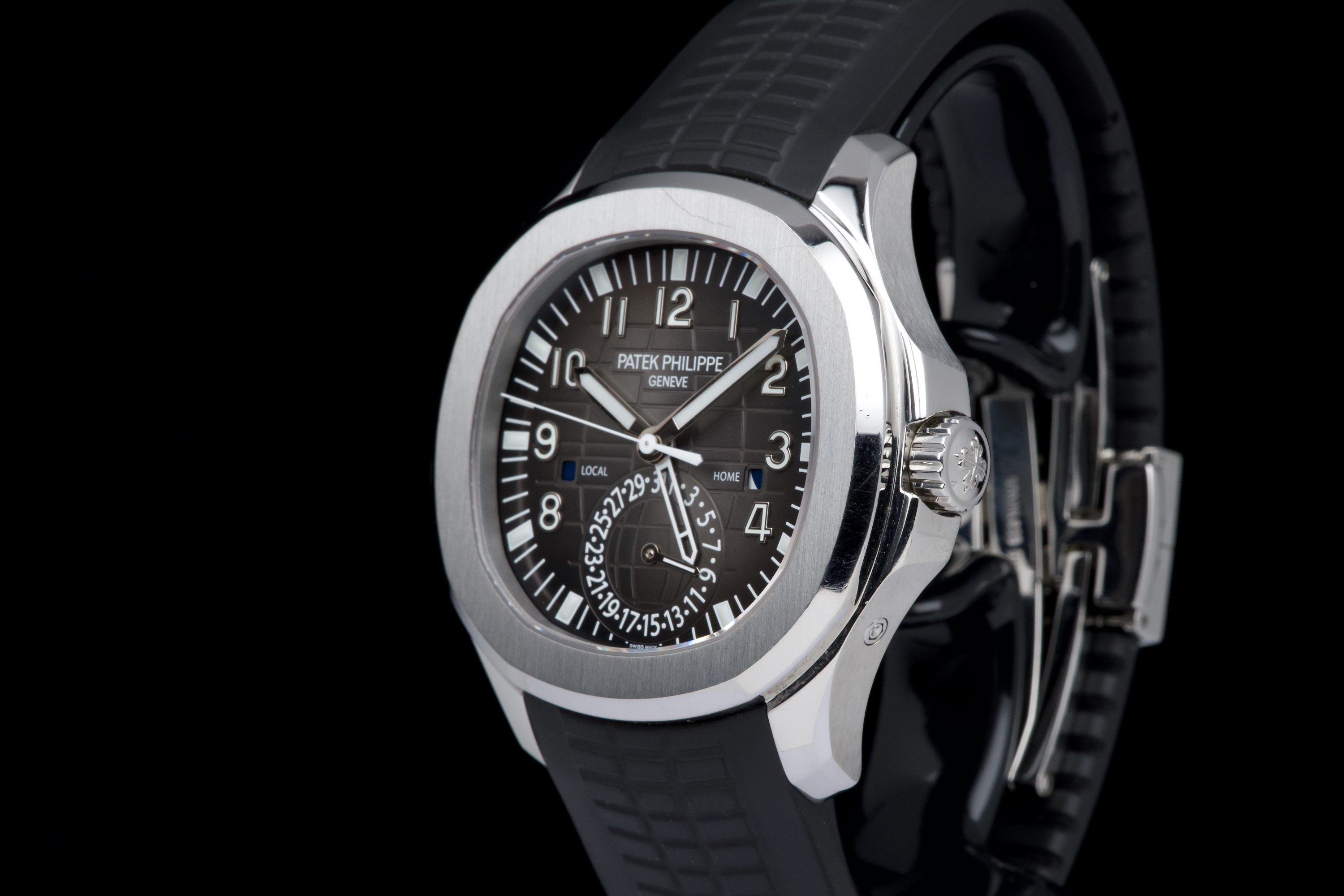 A fine and honest example of the Patek Philippe Aquanaut Travel Time reference 5164A-001, sold new at Beyer Zurich in 2017. The watch has been regularly worn and shows small marks and light scratches from use, but remains in very good unpolished overall condition. The black embossed dial and hands are in perfect condition. Powered by the automatic Patek Philippe caliber 324 S C FUS, offering dual time zone functionality and date indication. Complete with its original box, papers, and accessories. A great example of the practical and elegant Aquanaut Travel Time — sporty, versatile, and ready to wear.
