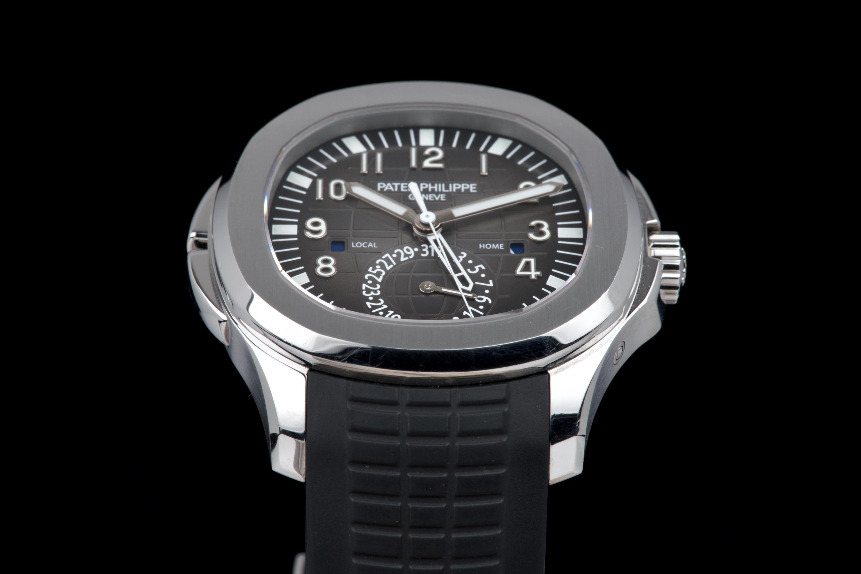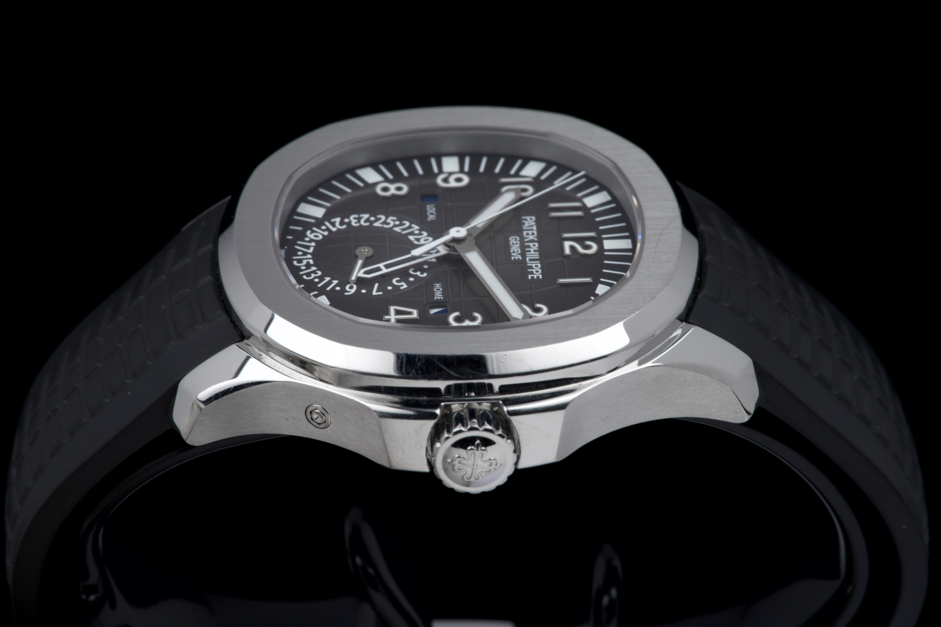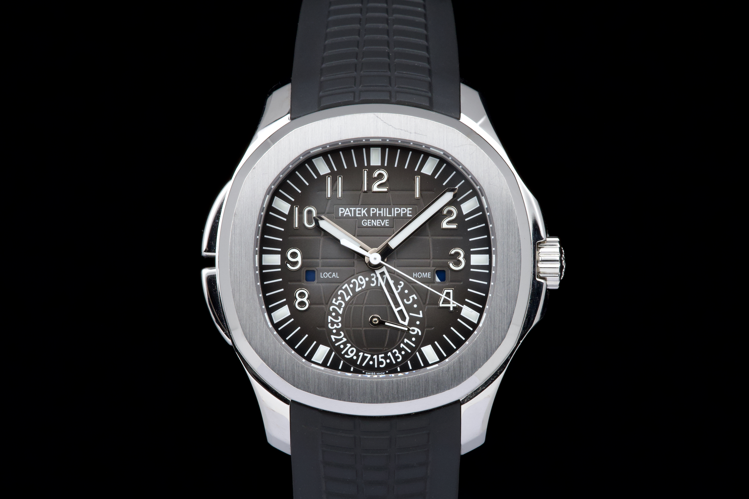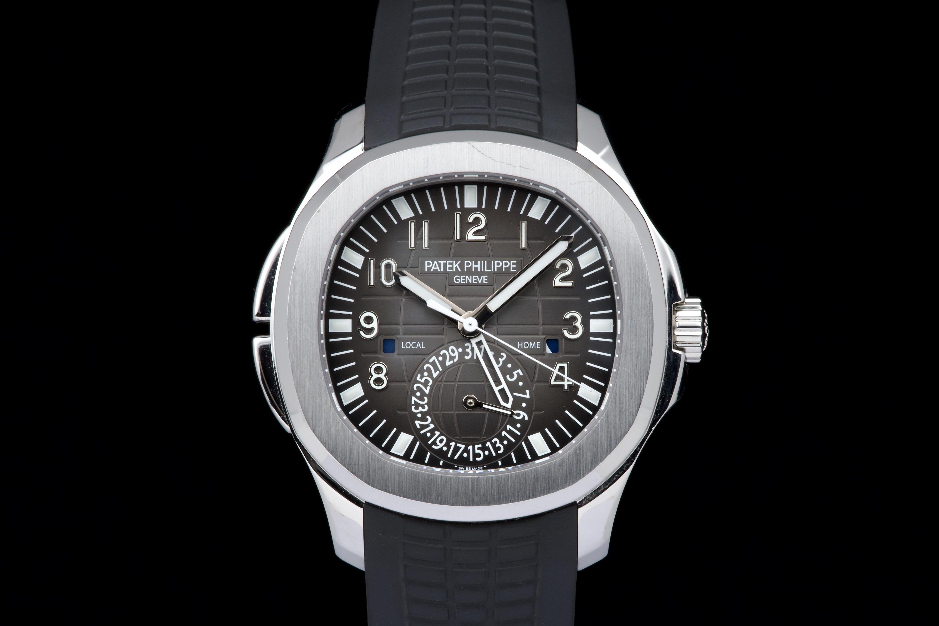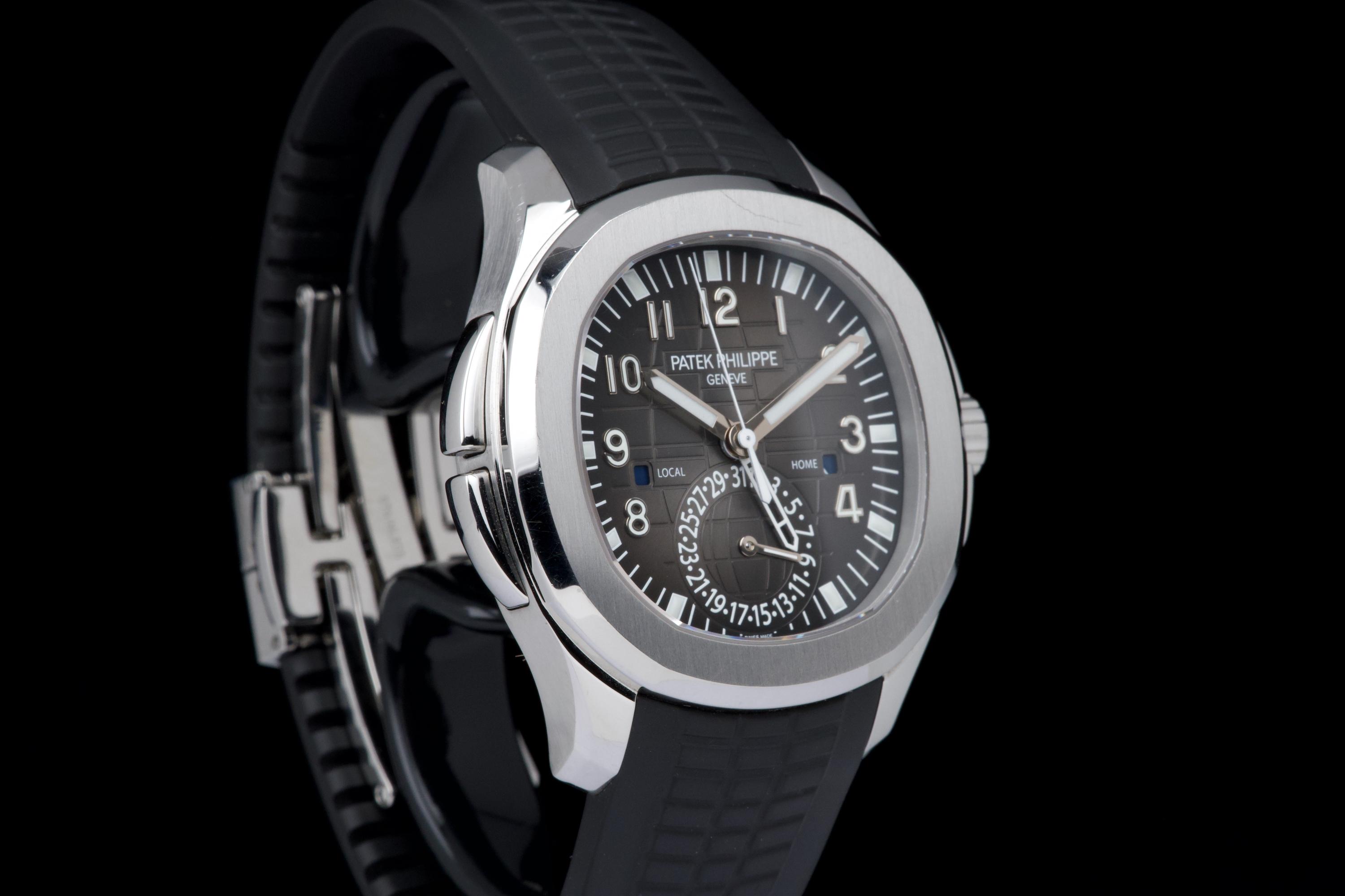 A fine and honest example of the Patek Philippe Aquanaut Travel Time reference 5164A-001, sold new at Beyer Zurich in 2017. The watch has been regularly worn and shows small marks and light scratches from use, but remains in very good unpolished overall condition. The black embossed dial and hands are in perfect condition. Powered by the automatic Patek Philippe caliber 324 S C FUS, offering dual time zone functionality and date indication. Complete with its original box, papers, and accessories. A great example of the practical and elegant Aquanaut Travel Time — sporty, versatile, and ready to wear.