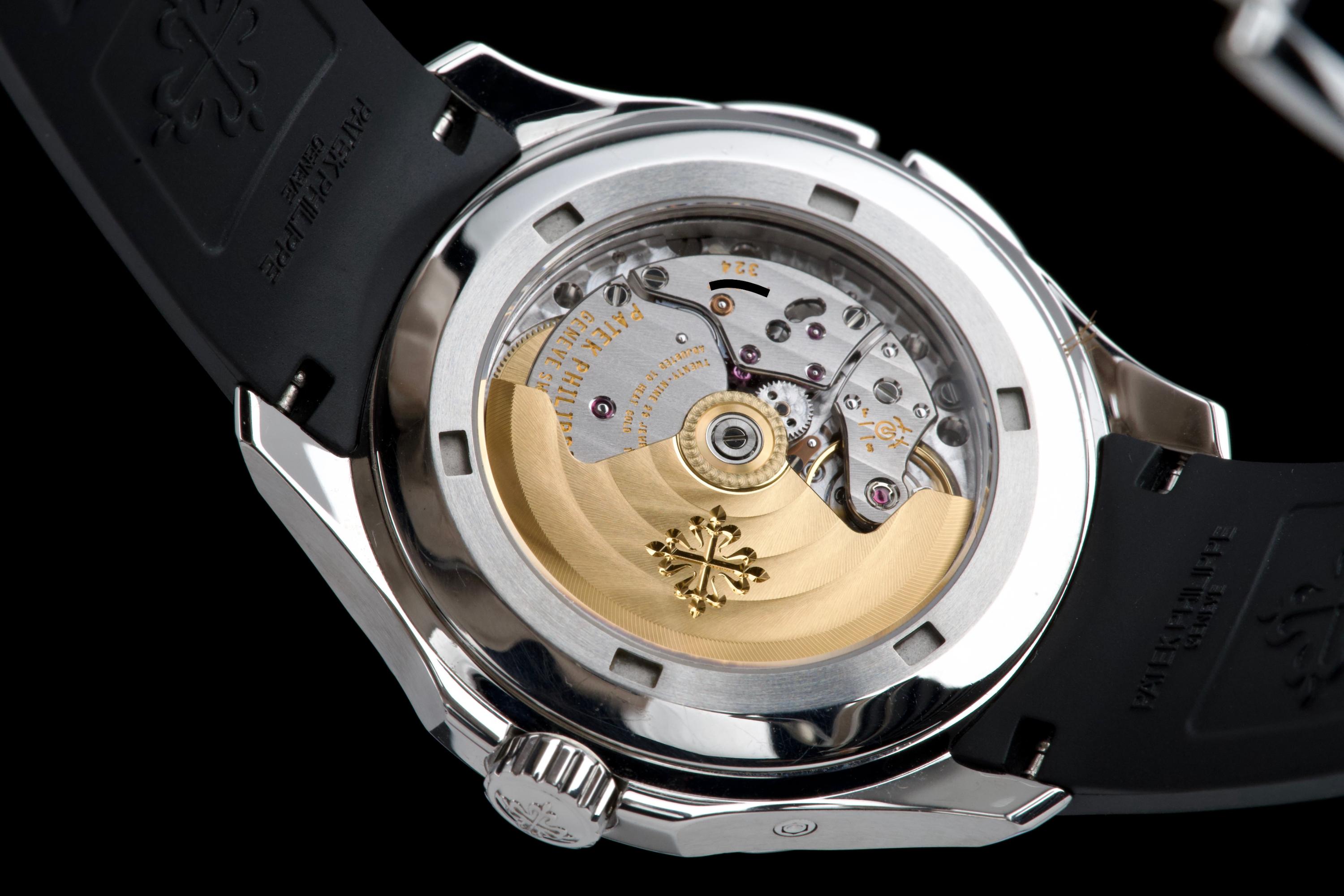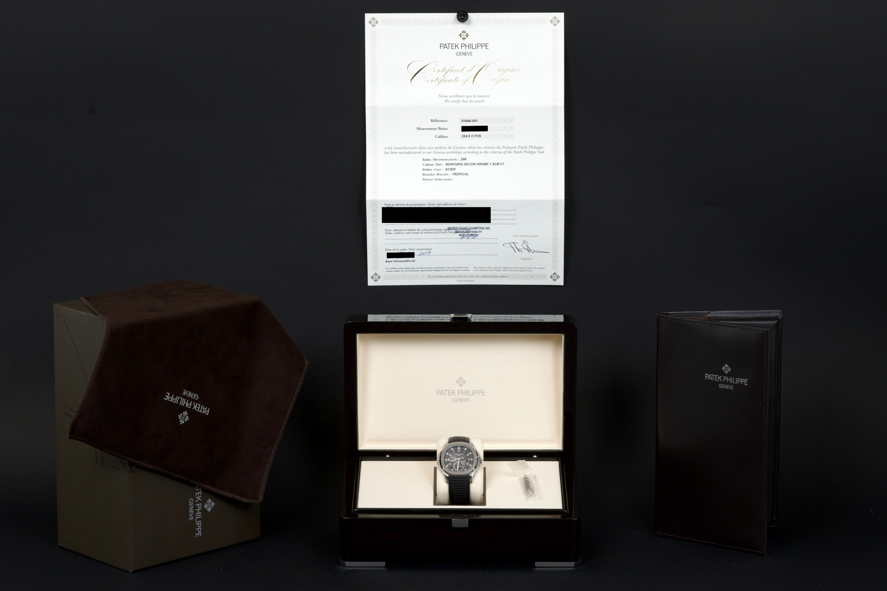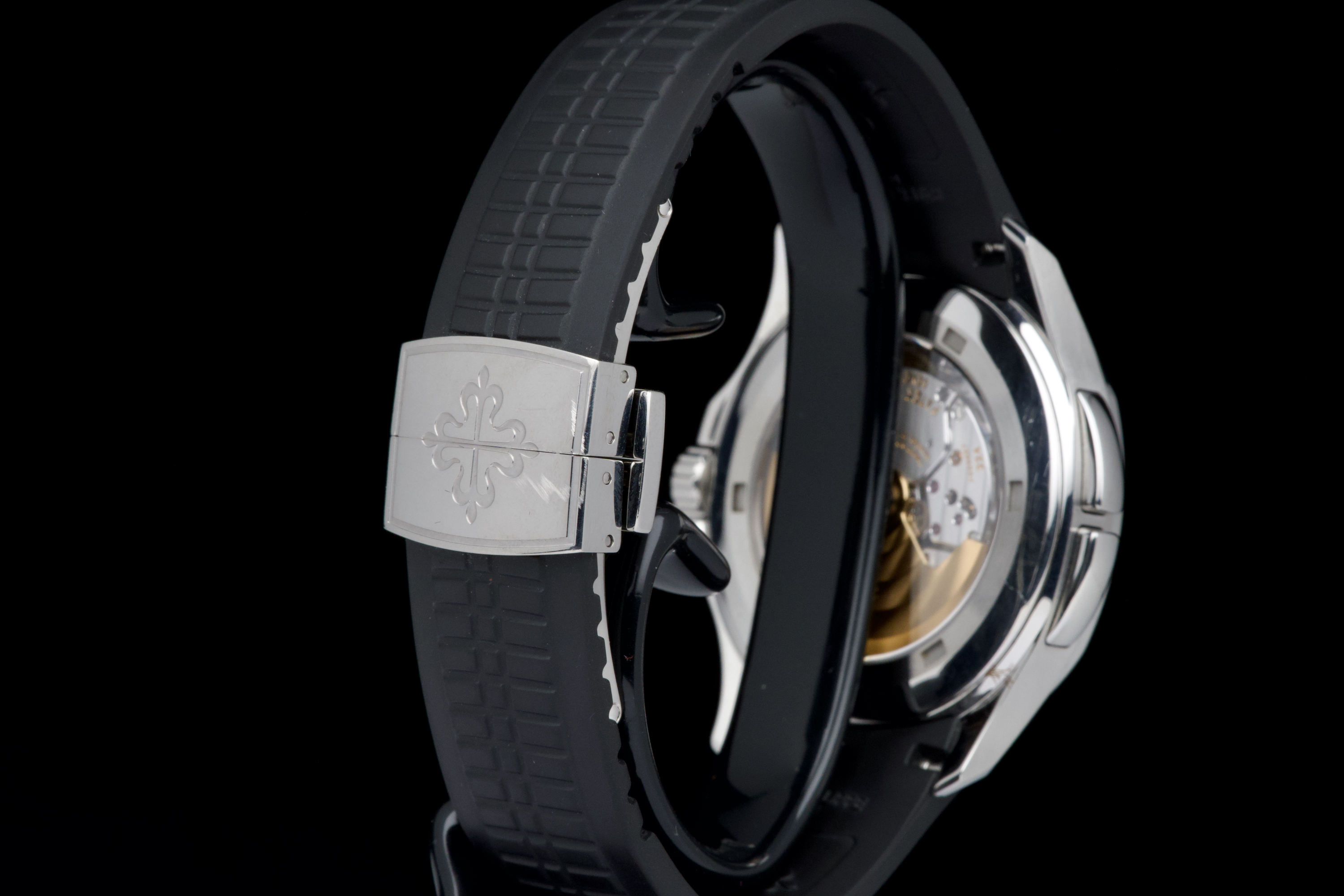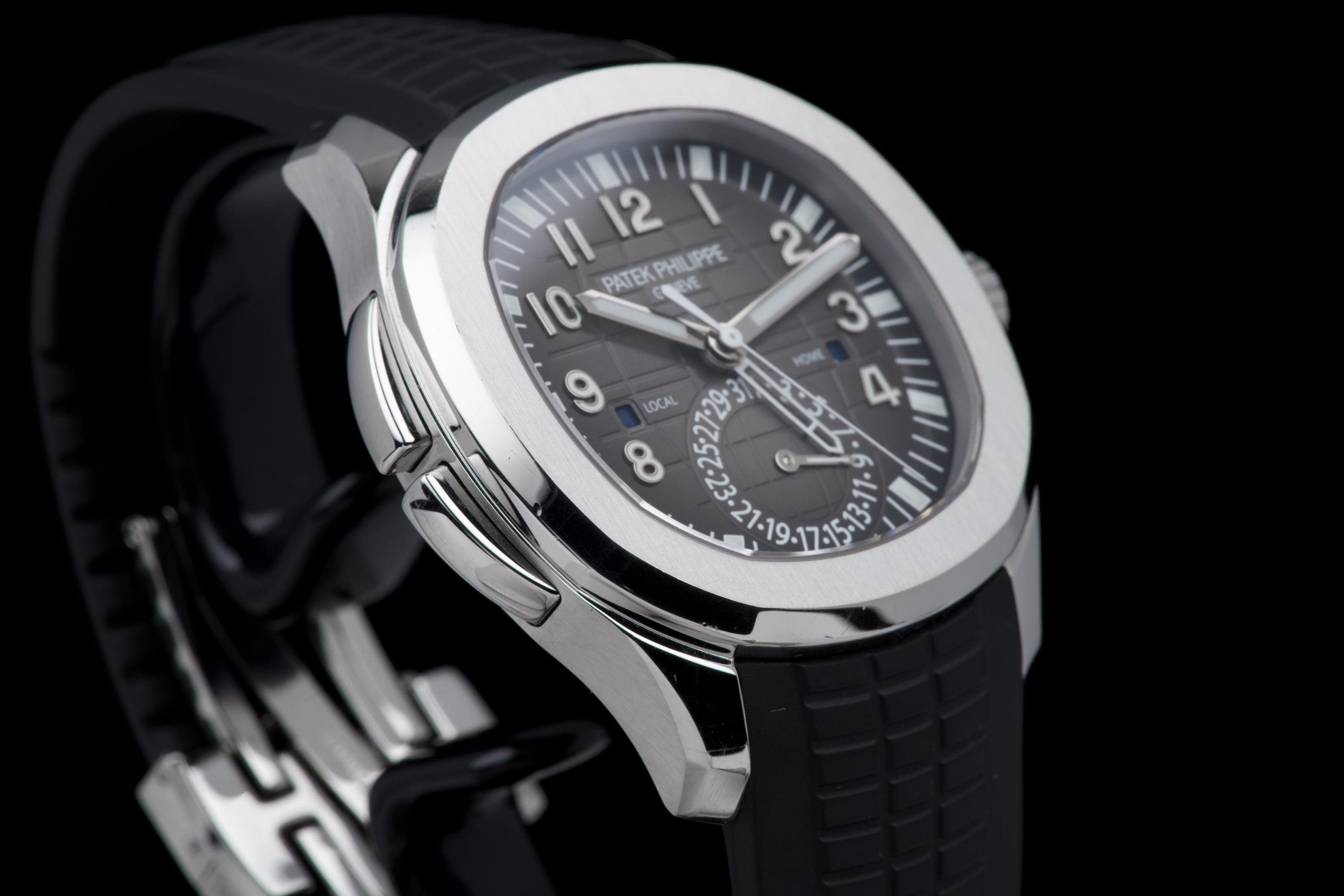 A fine and honest example of the Patek Philippe Aquanaut Travel Time reference 5164A-001, sold new at Beyer Zurich in 2017. The watch has been regularly worn and shows small marks and light scratches from use, but remains in very good unpolished overall condition. The black embossed dial and hands are in perfect condition. Powered by the automatic Patek Philippe caliber 324 S C FUS, offering dual time zone functionality and date indication. Complete with its original box, papers, and accessories. A great example of the practical and elegant Aquanaut Travel Time — sporty, versatile, and ready to wear.