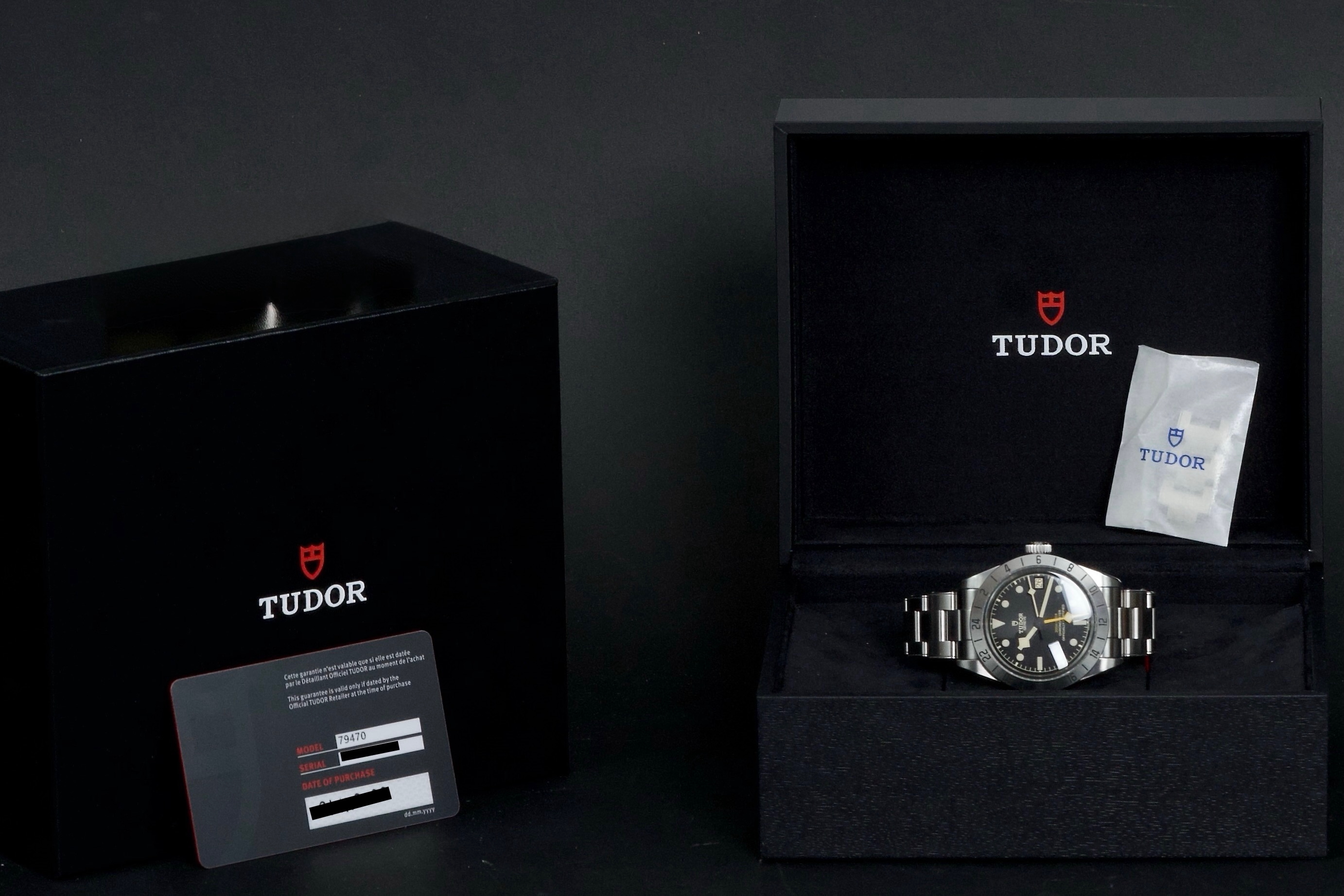 The Tudor Black Bay Pro 79470 is a modern tool watch with vintage soul, featuring a 39 mm steel case, fixed steel bezel, and an integrated GMT function powered by the in-house MT5652 movement. With its rugged design and compact proportions, it draws inspiration from iconic explorer watches of the past. This example was sold in 2023 and comes as a complete full set. The watch is unpolished and remains in excellent condition, showing only minimal signs of wear if no wear. A robust and versatile GMT with strong vintage character and modern reliability—ideal for daily wear or adventure.