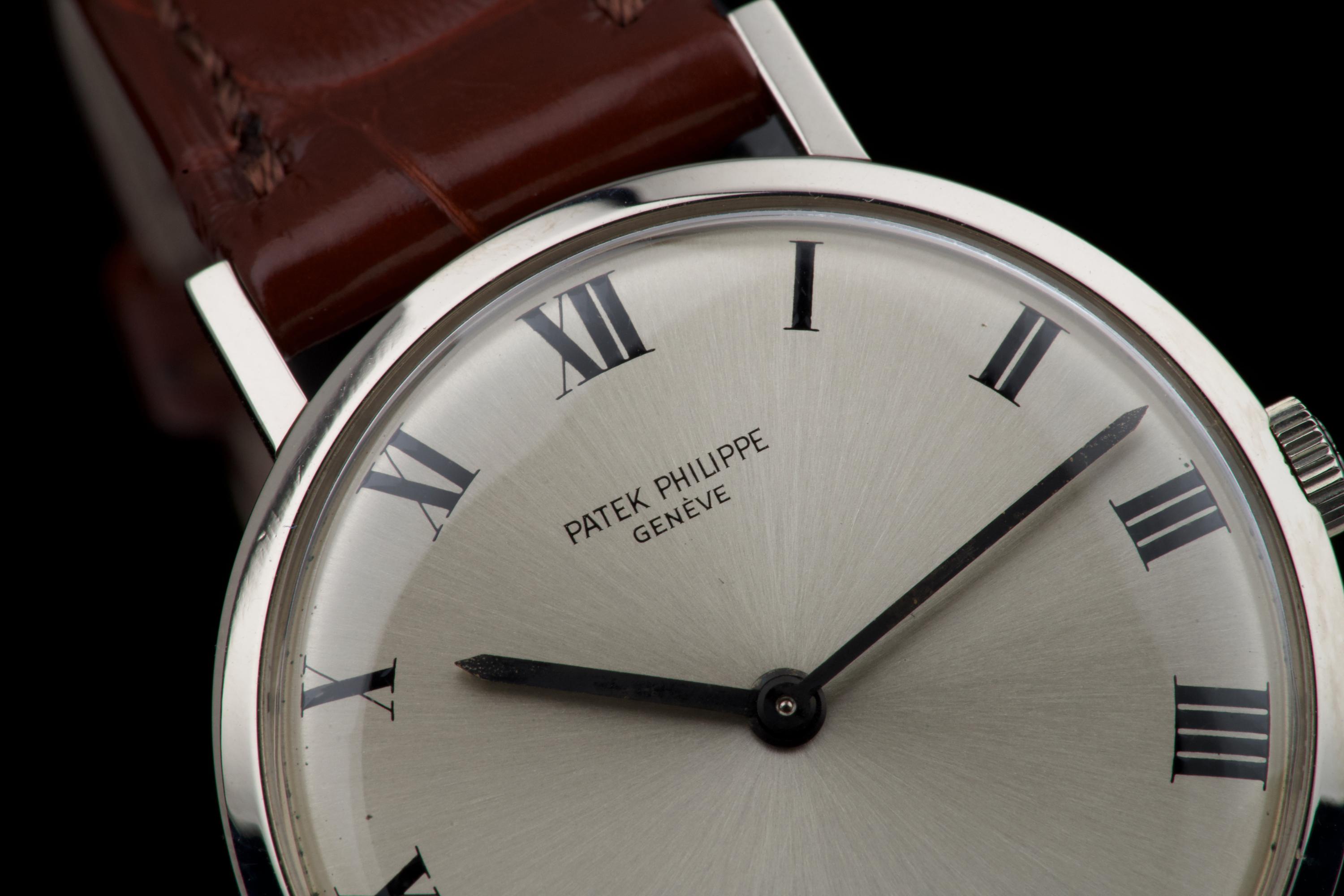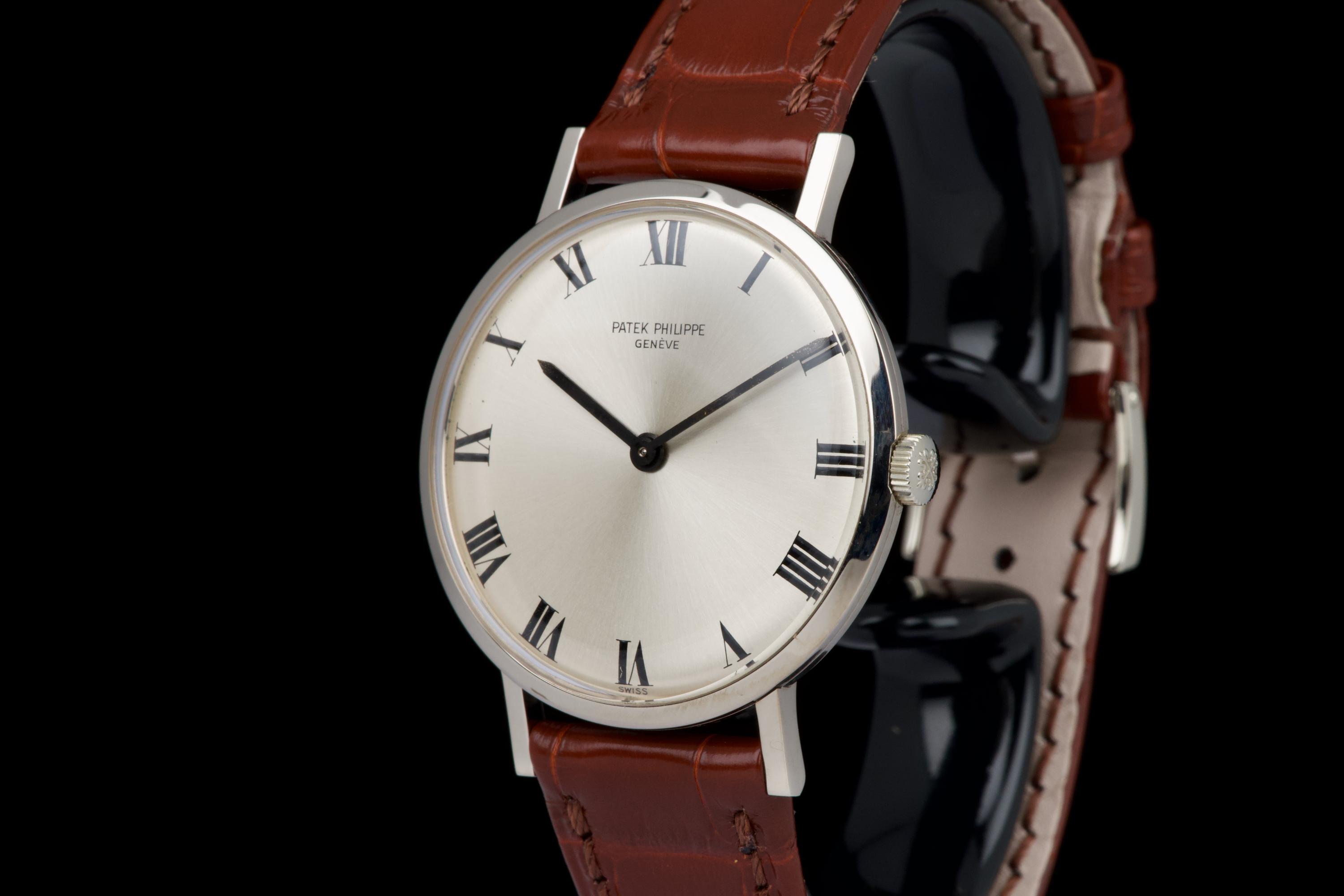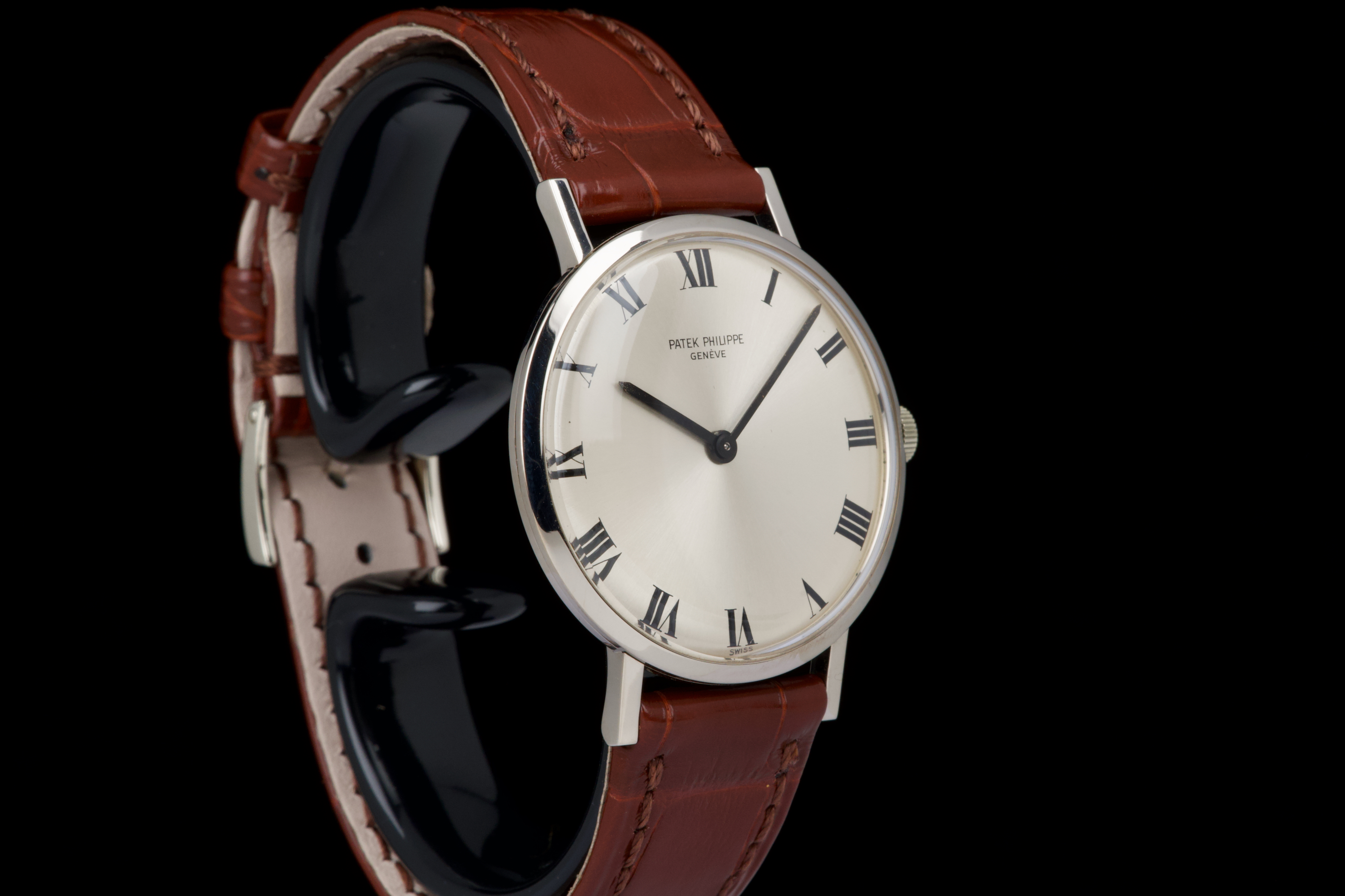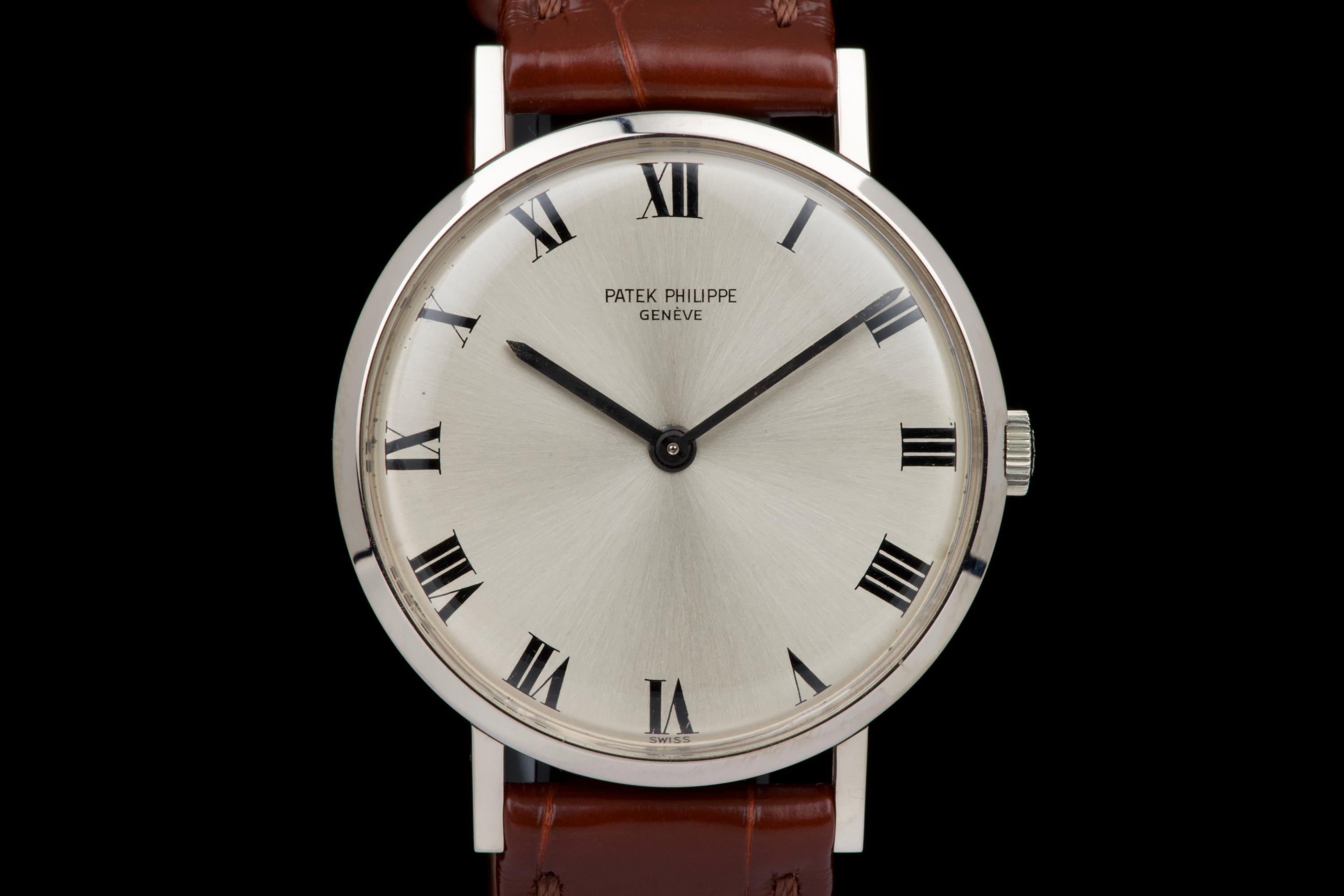 A beautiful vintage Patek Philippe Calatrava reference 3537G in 18K white gold, presented in excellent overall condition. The case shows very light signs of polishing and retains its original sharp profile. The original grey dial with Roman numerals is well preserved, showing only a few small and discreet dark spots on the right side. The hands are original and matching, completing the elegant vintage aesthetic. Fitted with its original white gold Patek Philippe tang buckle and a brand-new brown crocodile strap. The watch was recently serviced by an independent watchmaker and runs perfectly. A refined and timeless 1970s Calatrava — understated, elegant, and beautifully preserved.