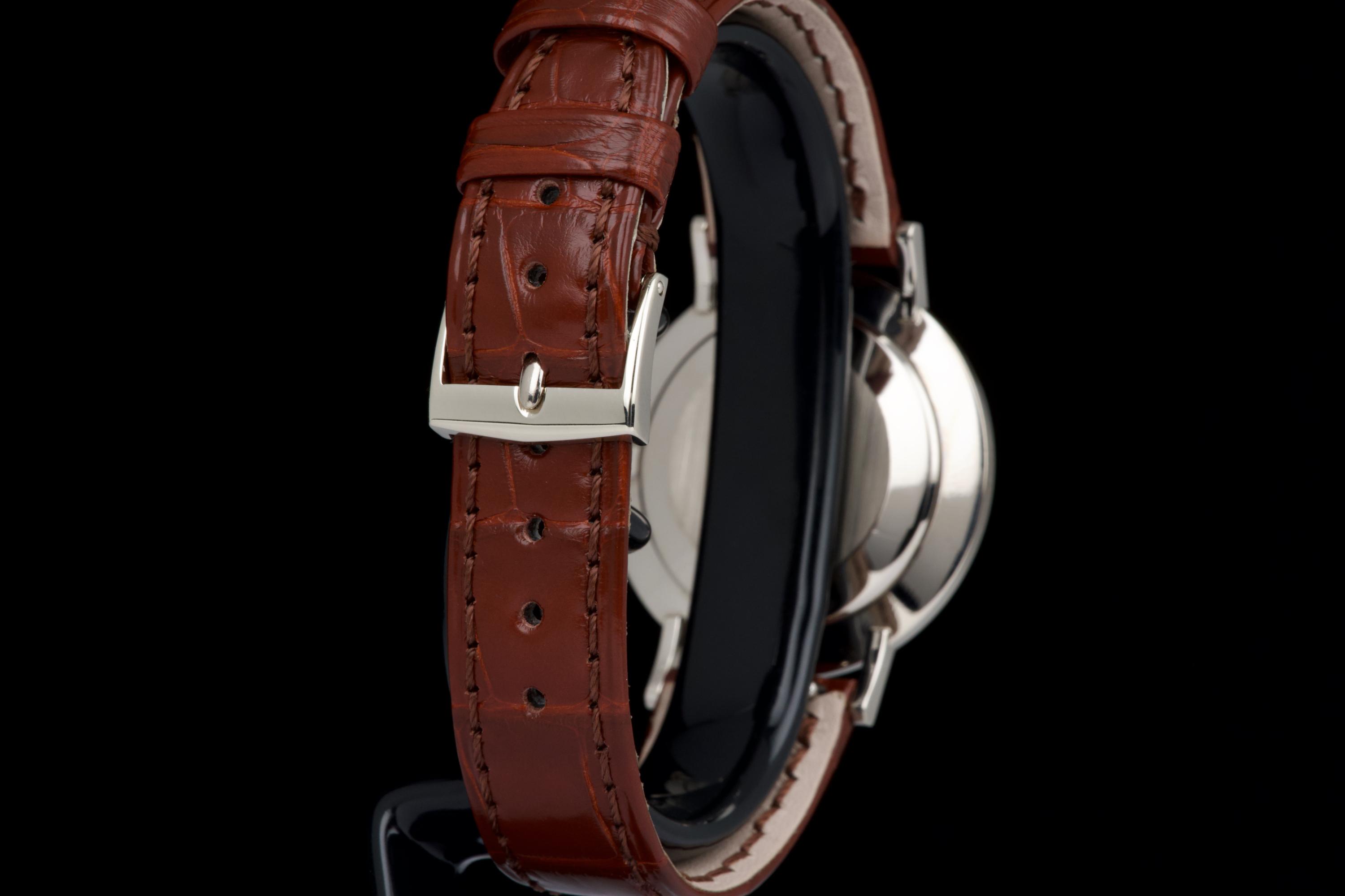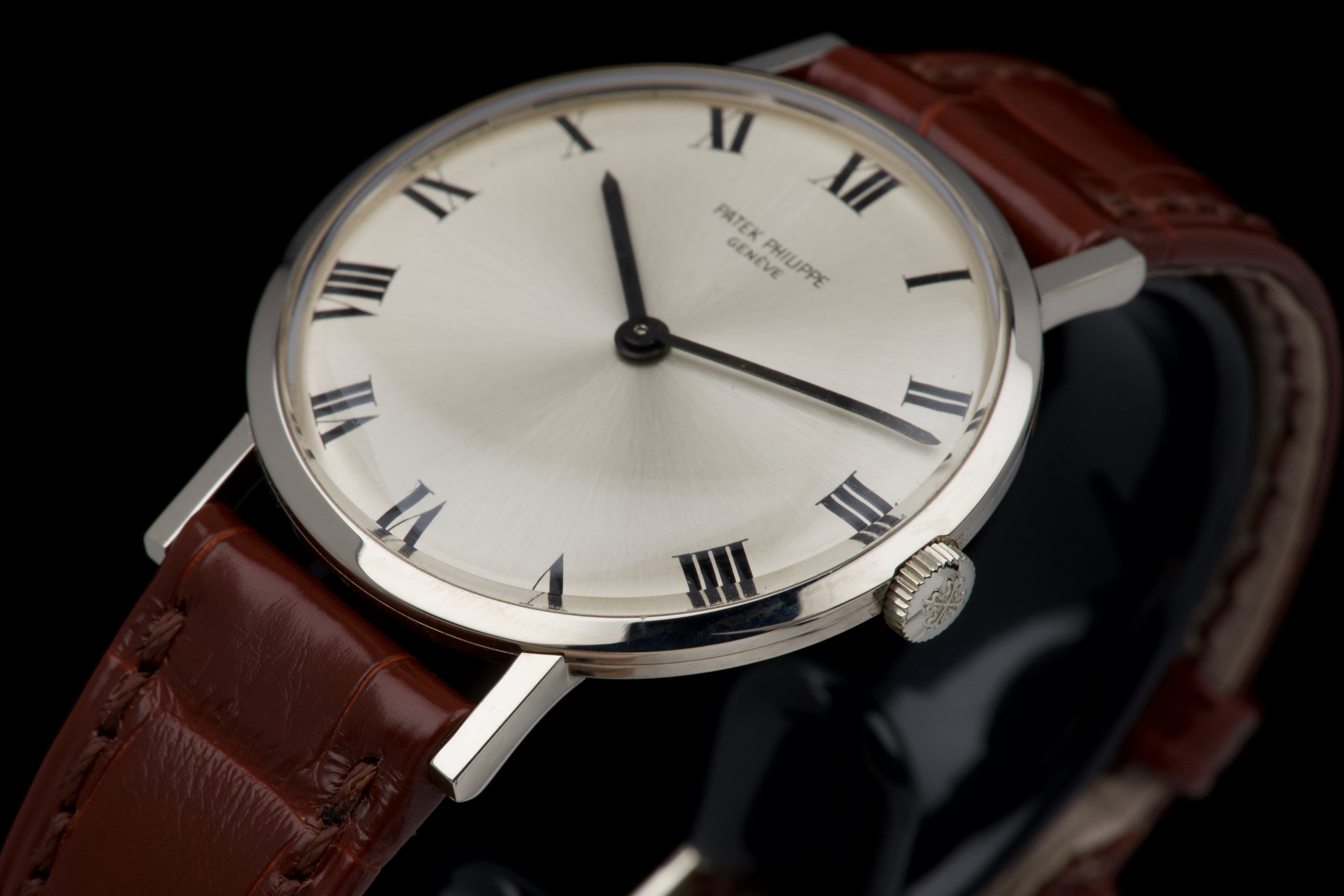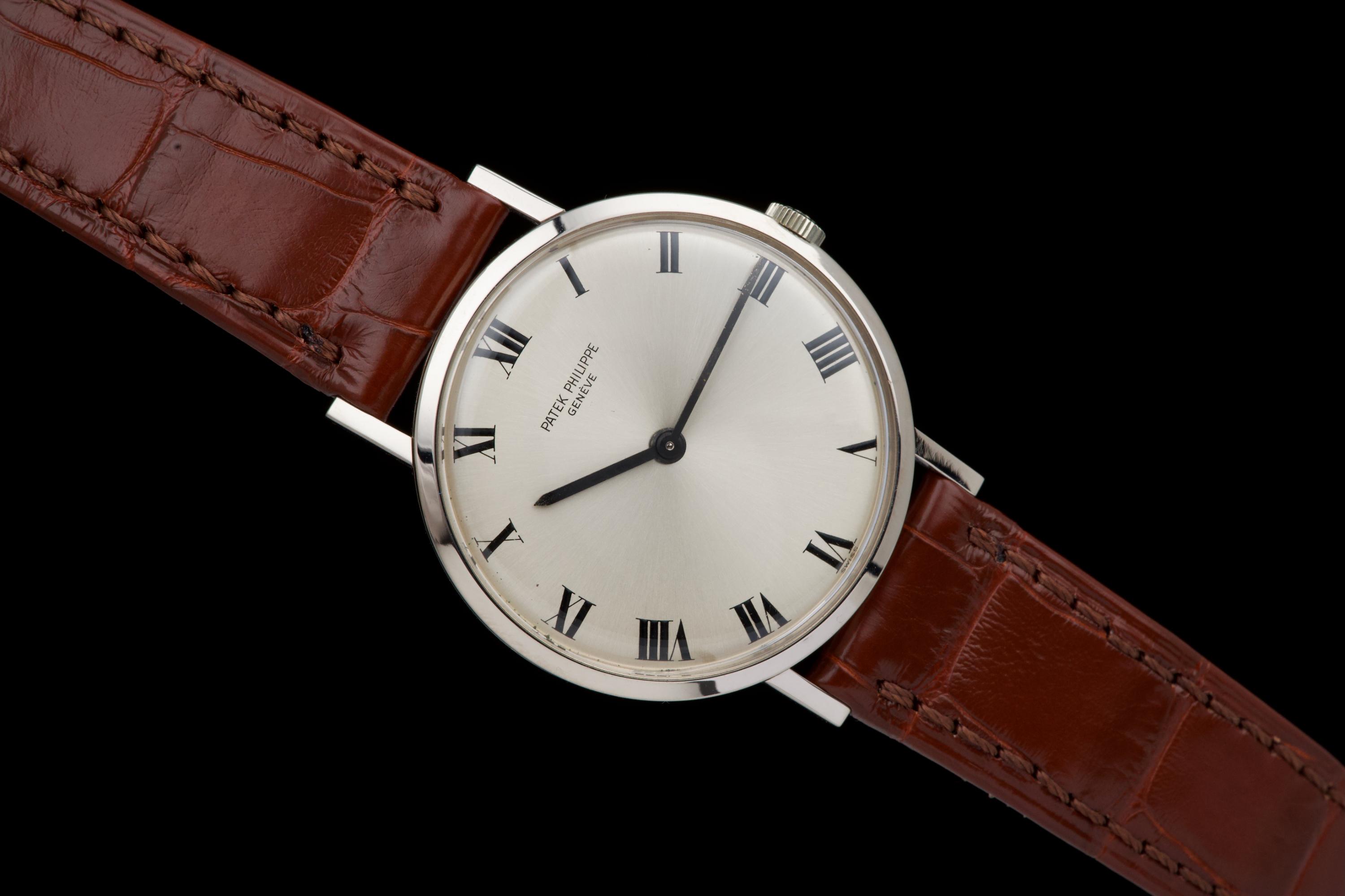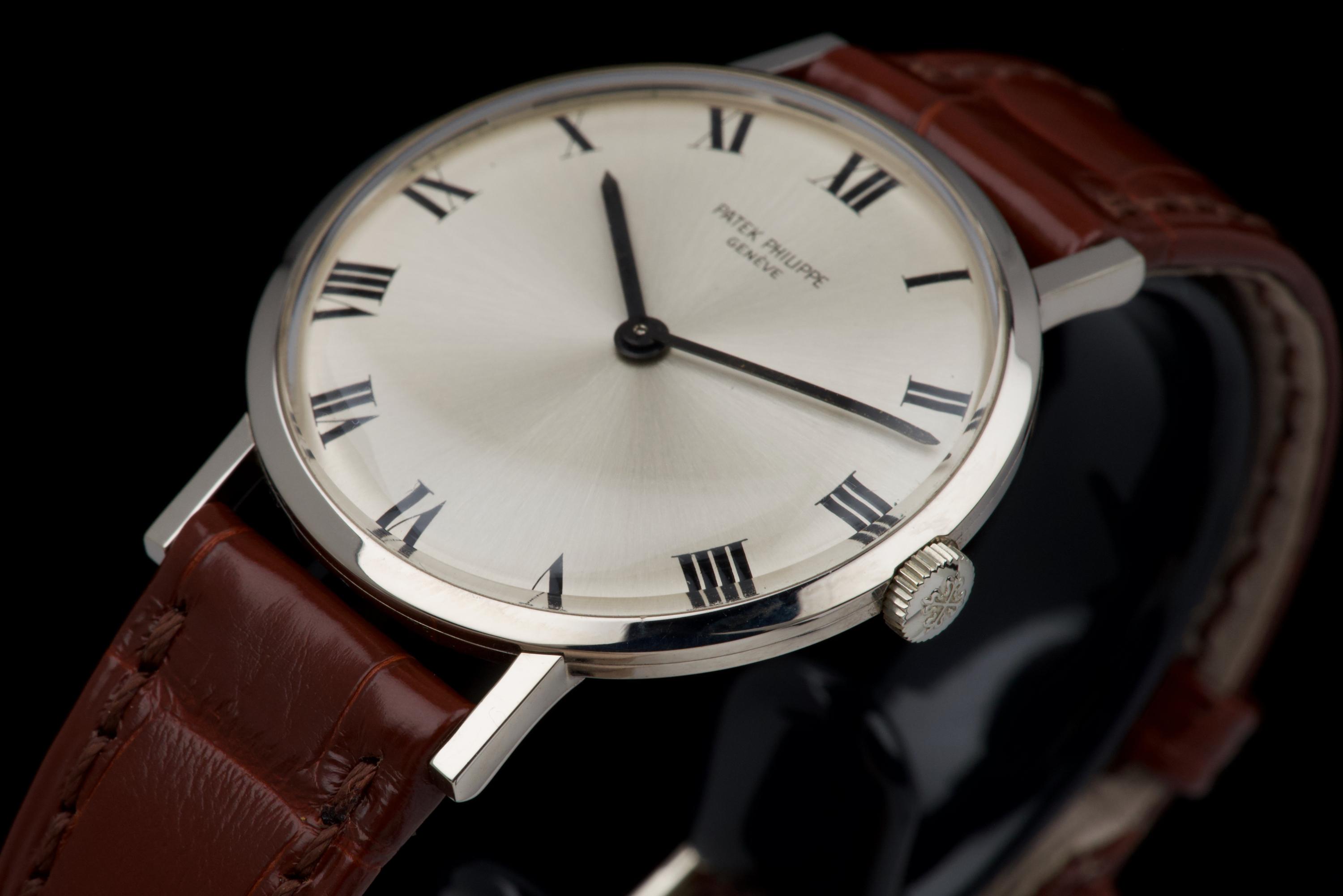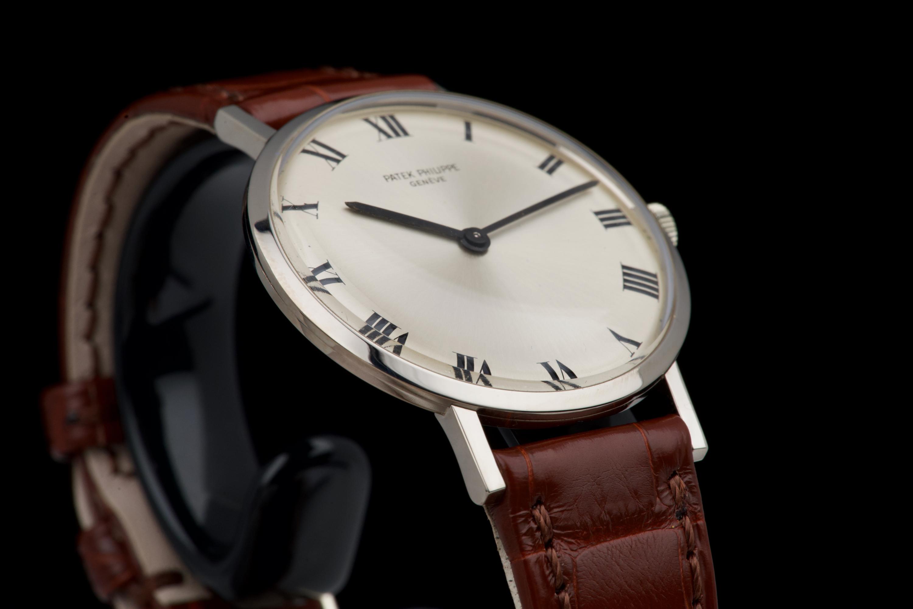A beautiful vintage Patek Philippe Calatrava reference 3537G in 18K white gold, presented in excellent overall condition. The case shows very light signs of polishing and retains its original sharp profile. The original grey dial with Roman numerals is well preserved, showing only a few small and discreet dark spots on the right side. The hands are original and matching, completing the elegant vintage aesthetic. Fitted with its original white gold Patek Philippe tang buckle and a brand-new brown crocodile strap. The watch was recently serviced by an independent watchmaker and runs perfectly. A refined and timeless 1970s Calatrava — understated, elegant, and beautifully preserved.