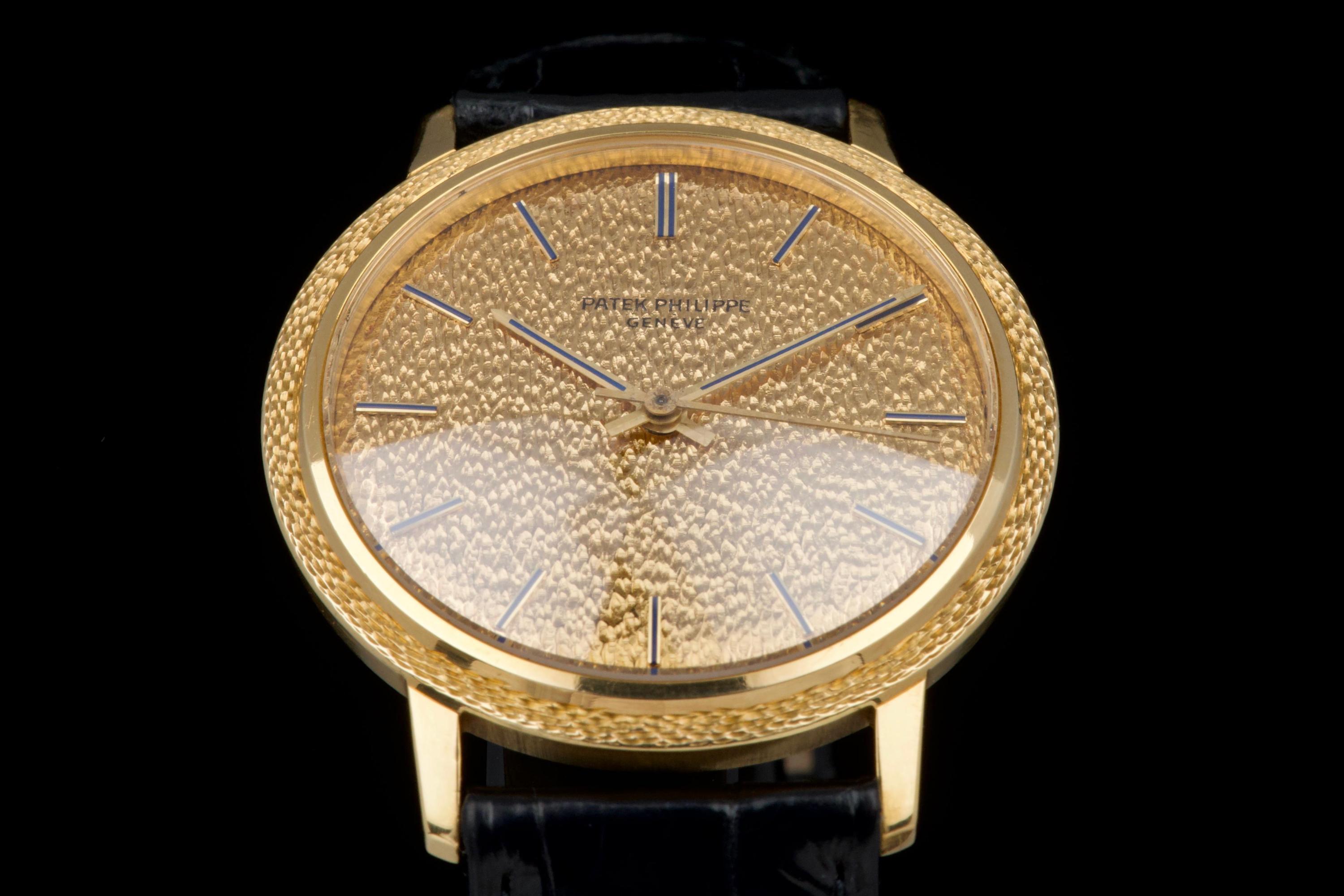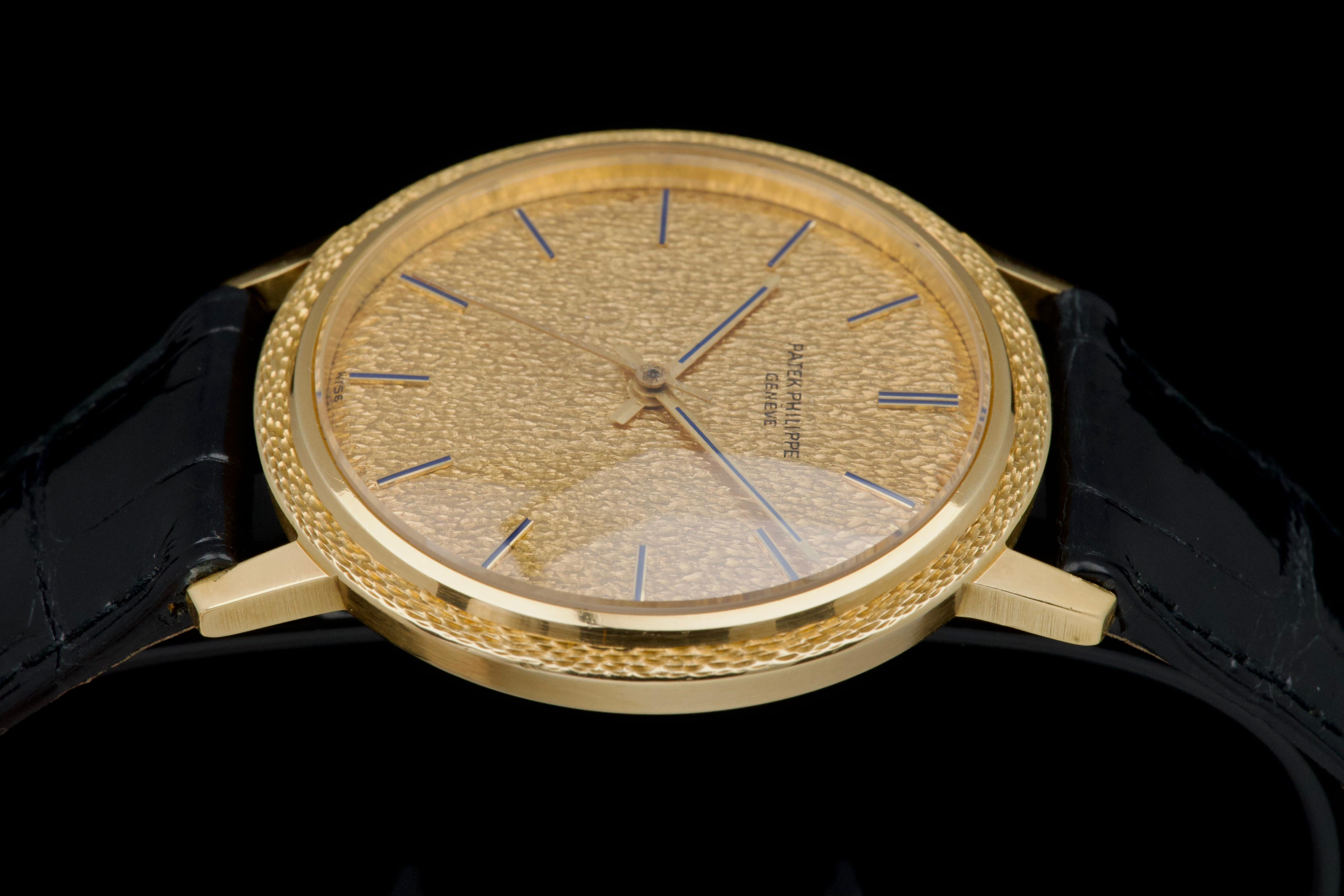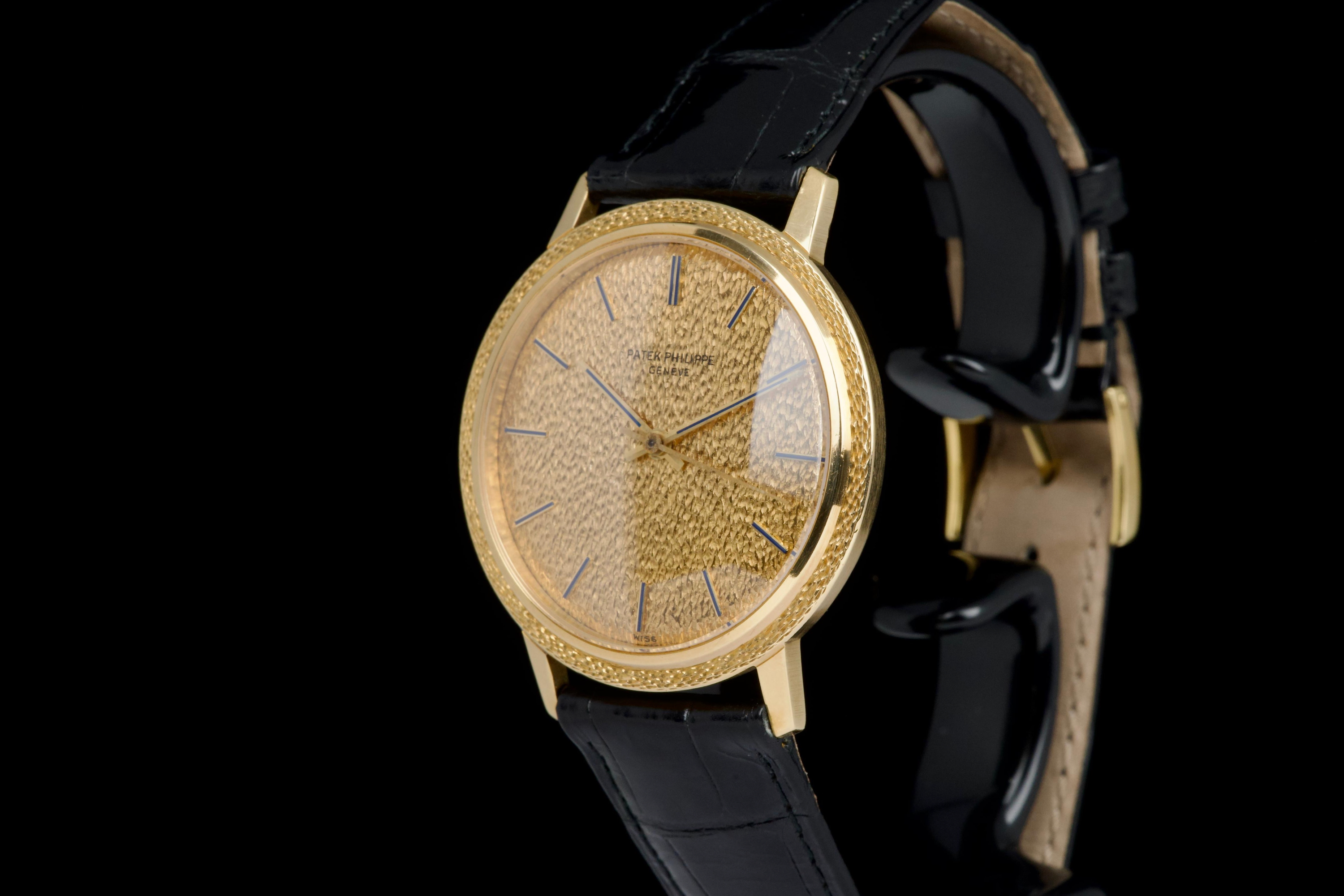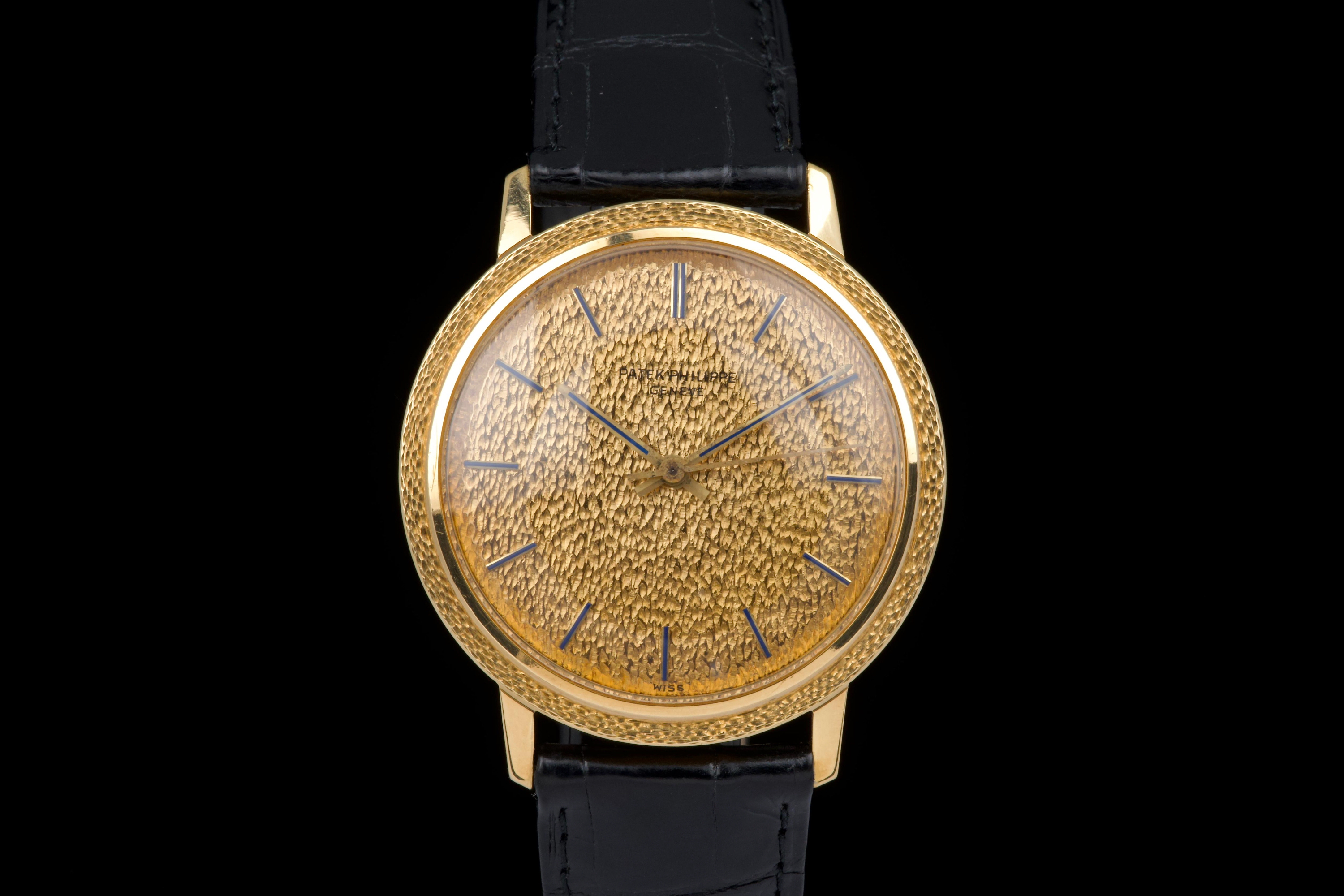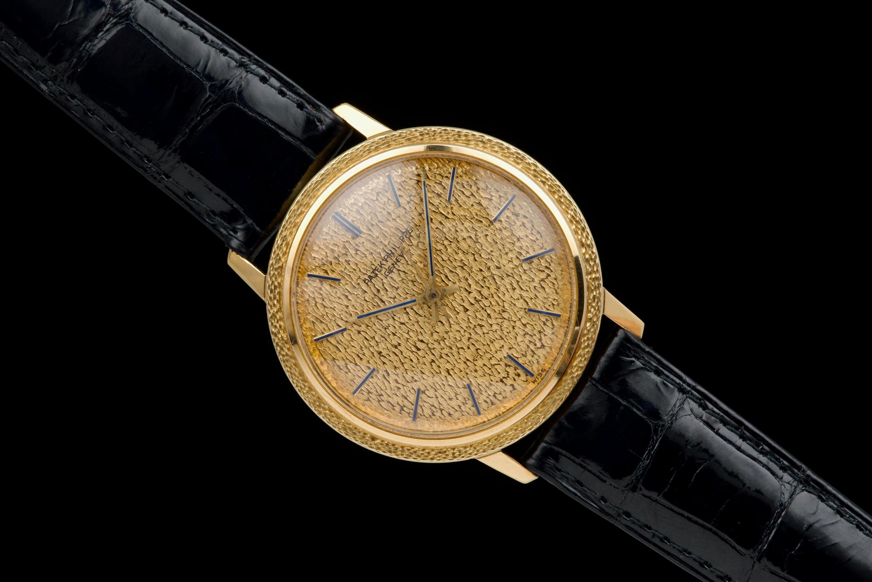 A beautifully preserved vintage Patek Philippe Calatrava from 1971, featuring a 35mm 18k yellow gold case and an automatic movement. The watch has been very lightly polished in the past, retaining excellent proportions and a crisp overall appearance. It is fitted with a black Patek Philippe alligator strap in excellent condition, paired with its original 18k yellow gold buckle. The dial is particularly striking: a beautifully decorated hammered-style gilt dial with applied jet-black painted hour markers and matching hands, giving the watch a refined and unique vintage character. Freshly serviced by our watchmaker, the movement runs perfectly. The watch comes with its Extract from the Archives, confirming production and sale in 1971. A refined and elegant vintage Calatrava, combining rare aesthetic details, excellent condition, and full archival confirmation — a superb example of early 1970s Patek dress watch design.