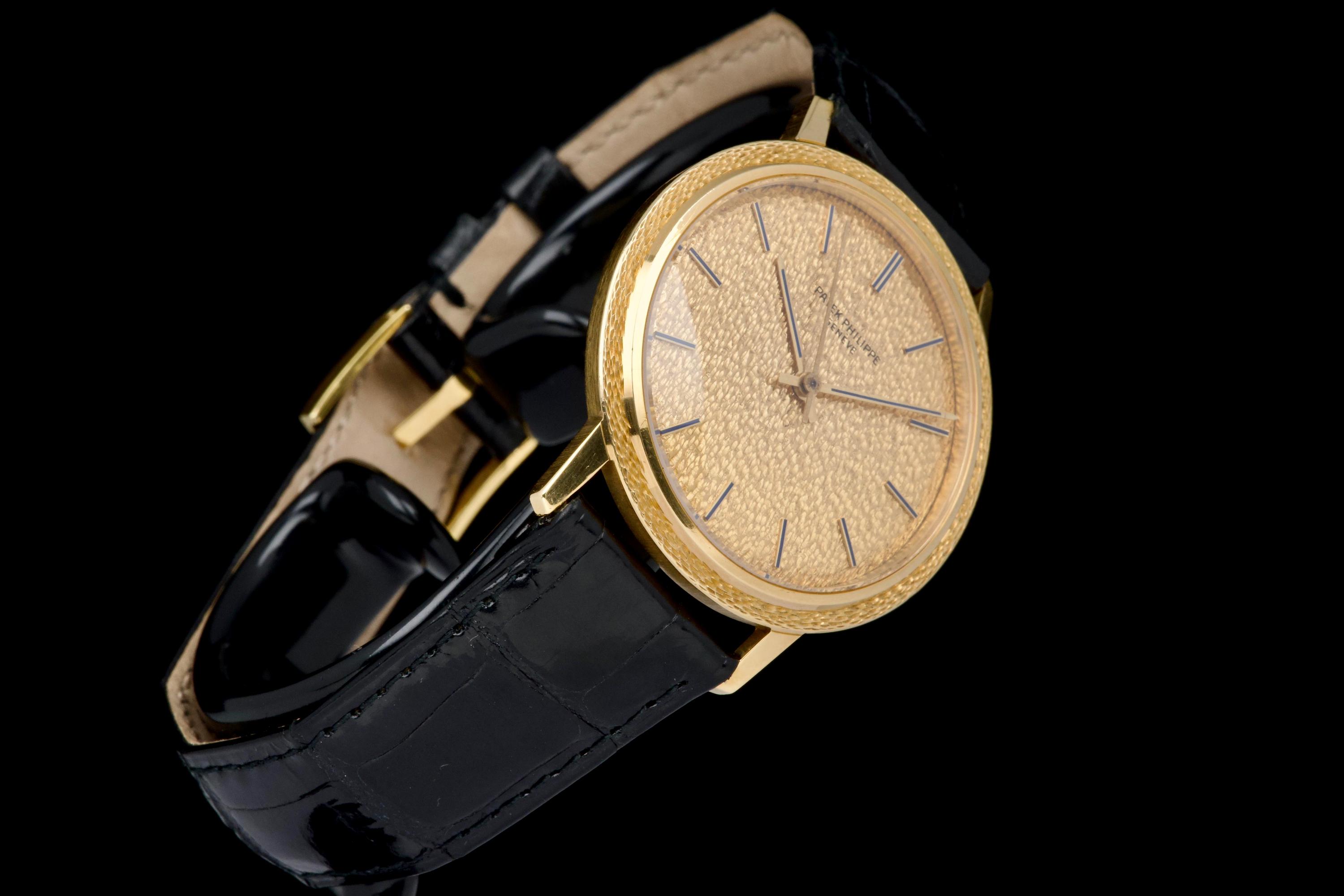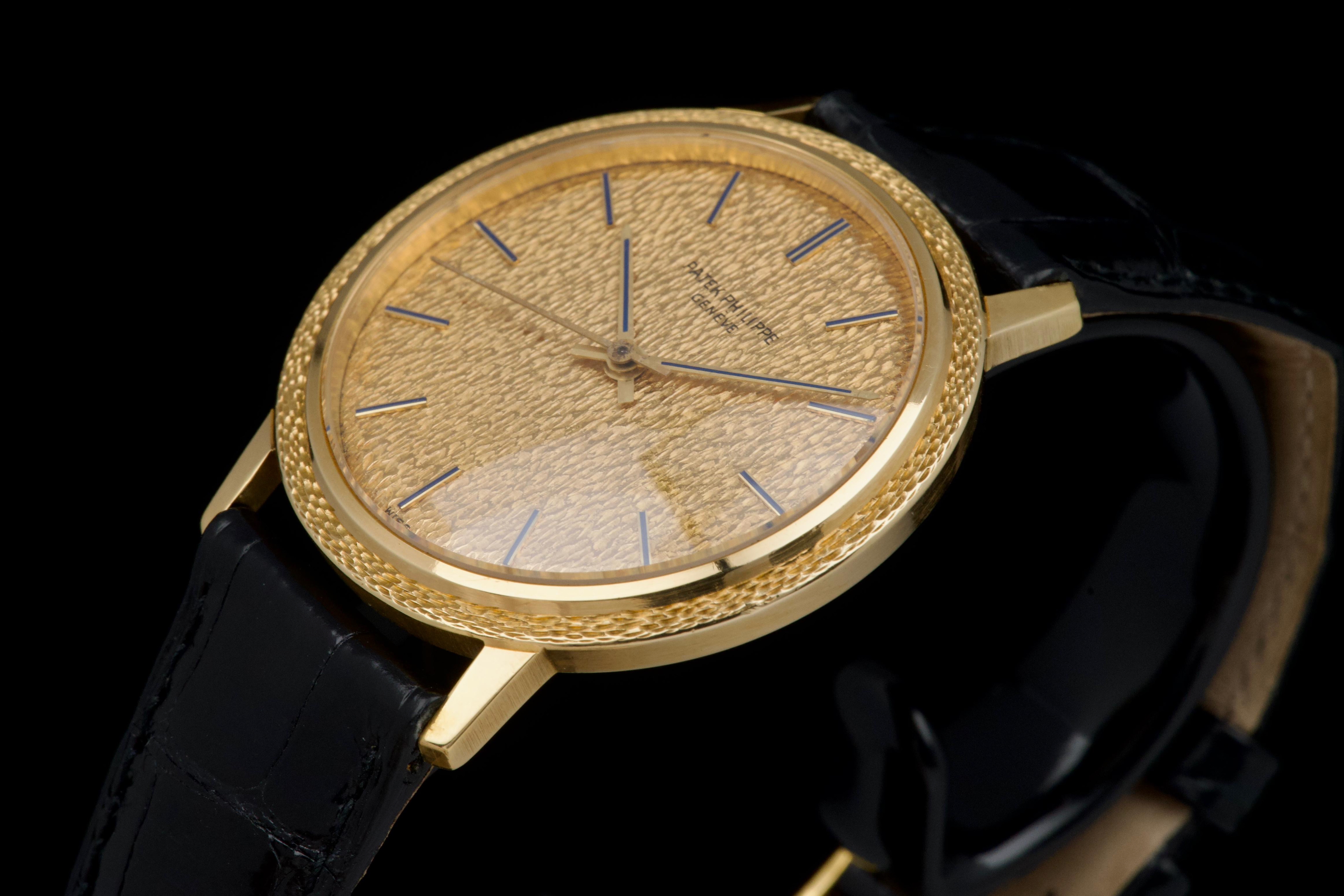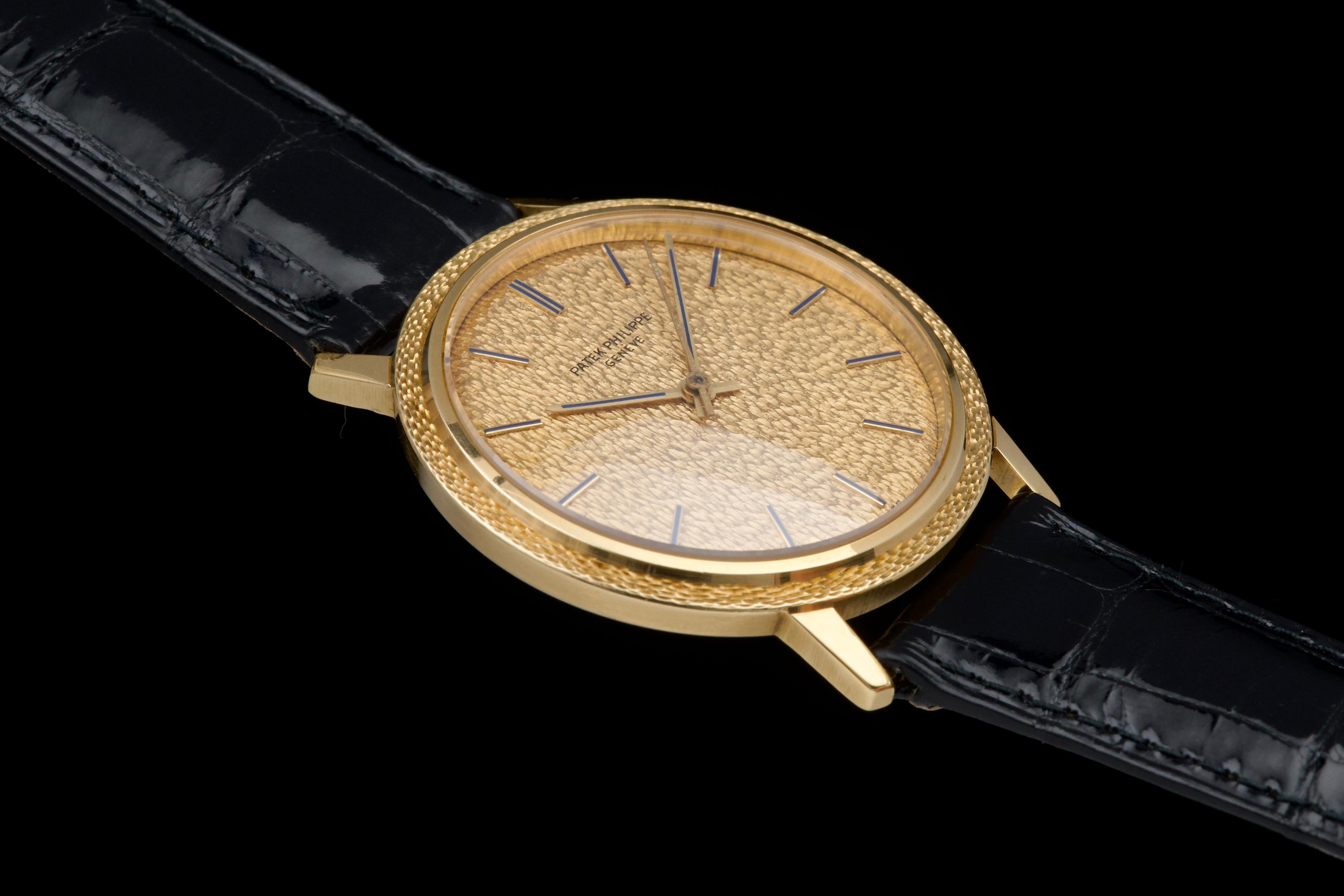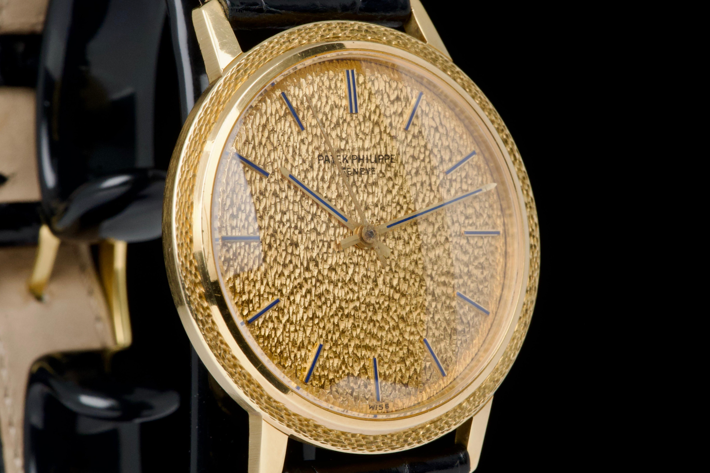 A beautifully preserved vintage Patek Philippe Calatrava from 1971, featuring a 35mm 18k yellow gold case and an automatic movement. The watch has been very lightly polished in the past, retaining excellent proportions and a crisp overall appearance. It is fitted with a black Patek Philippe alligator strap in excellent condition, paired with its original 18k yellow gold buckle. The dial is particularly striking: a beautifully decorated hammered-style gilt dial with applied jet-black painted hour markers and matching hands, giving the watch a refined and unique vintage character. Freshly serviced by our watchmaker, the movement runs perfectly. The watch comes with its Extract from the Archives, confirming production and sale in 1971. A refined and elegant vintage Calatrava, combining rare aesthetic details, excellent condition, and full archival confirmation — a superb example of early 1970s Patek dress watch design.