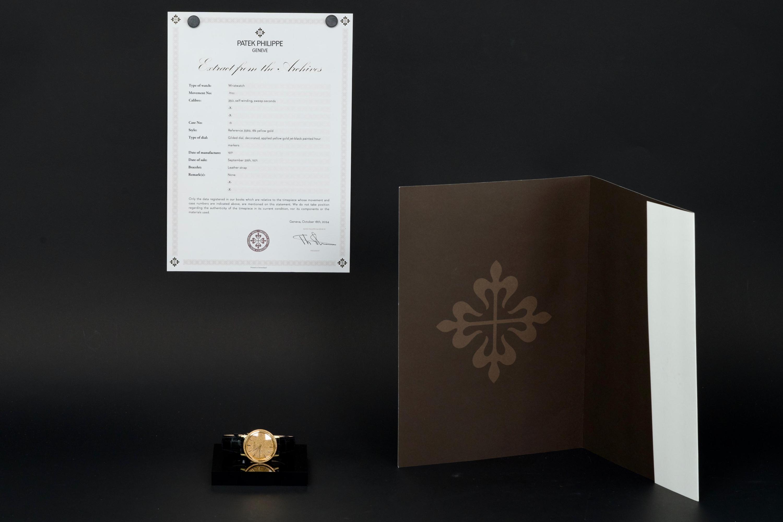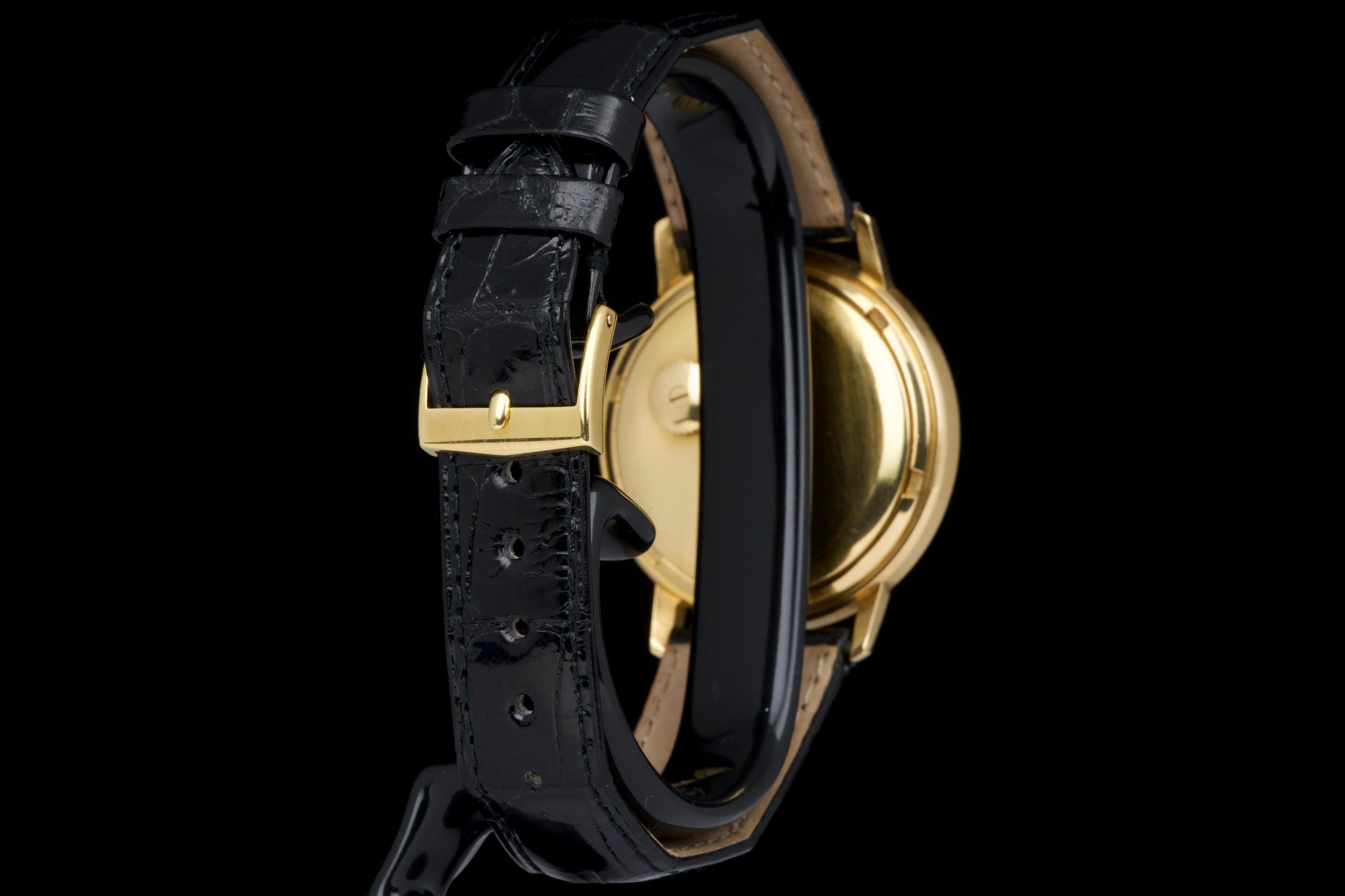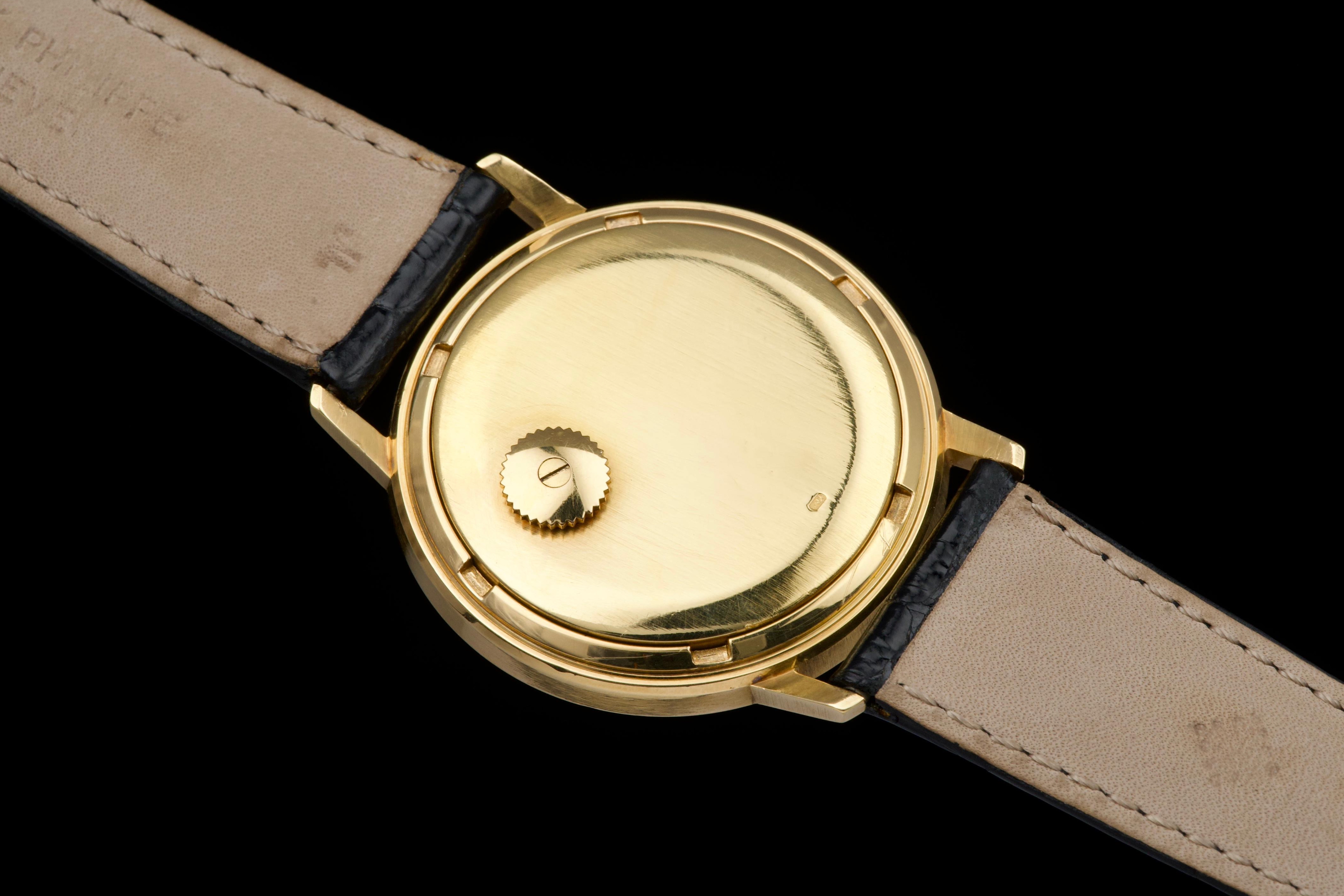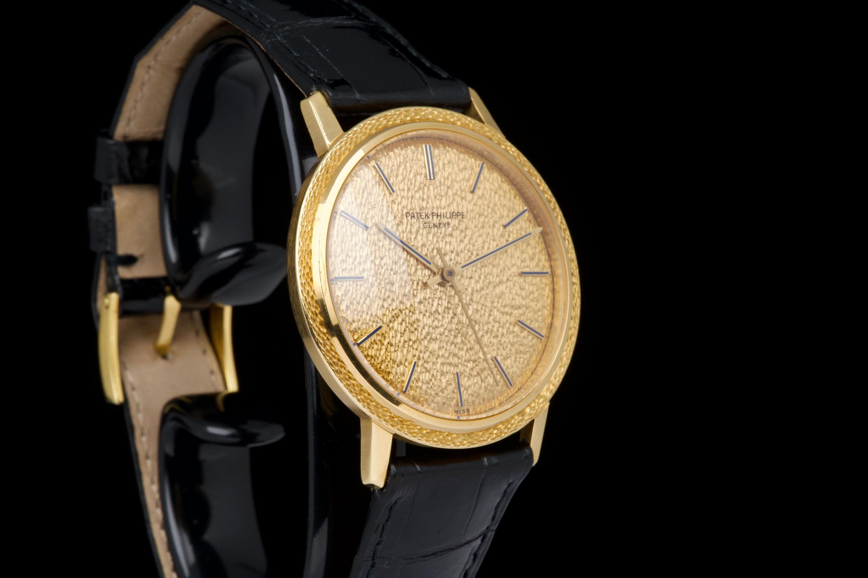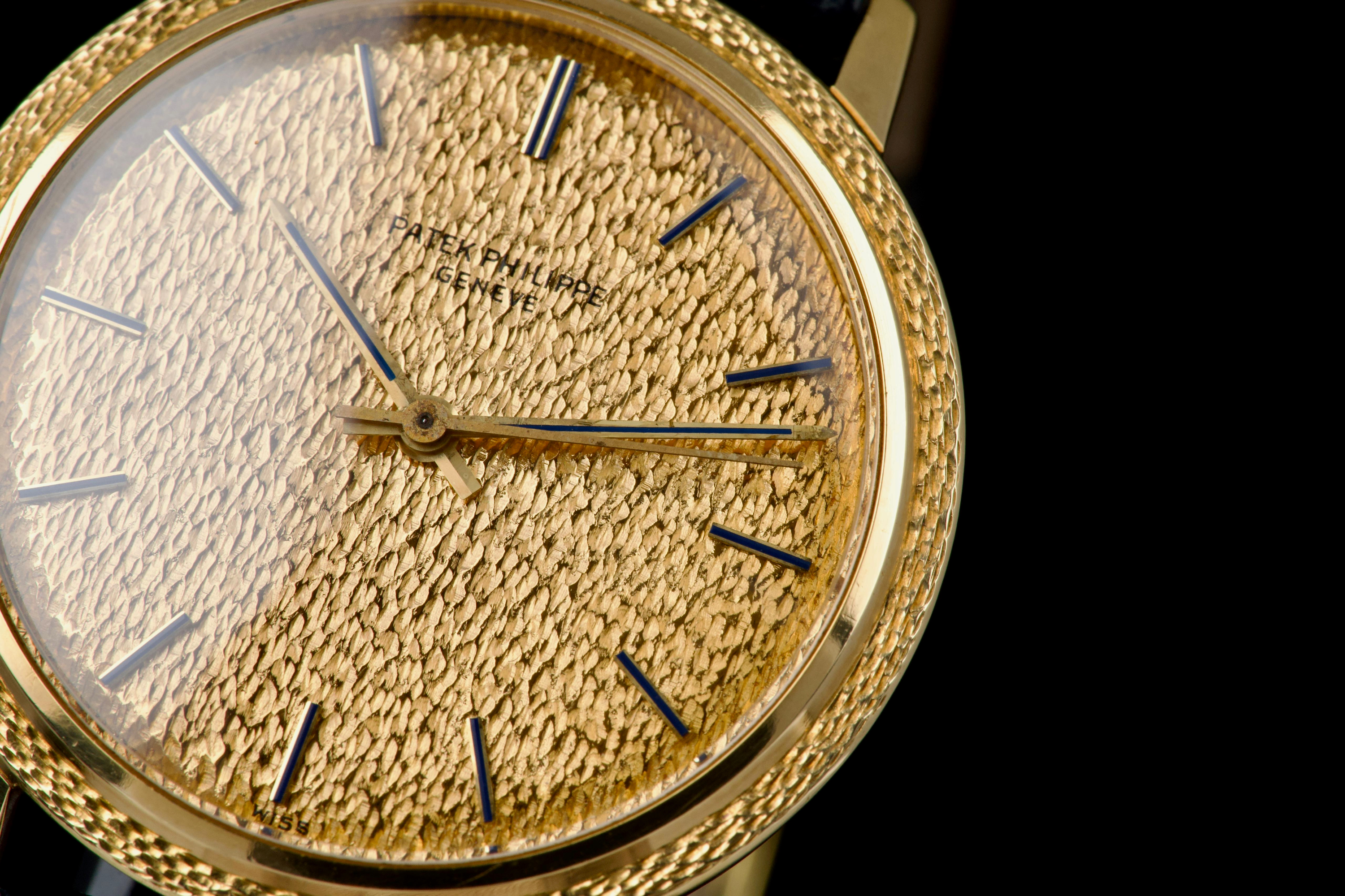 A beautifully preserved vintage Patek Philippe Calatrava from 1971, featuring a 35mm 18k yellow gold case and an automatic movement. The watch has been very lightly polished in the past, retaining excellent proportions and a crisp overall appearance. It is fitted with a black Patek Philippe alligator strap in excellent condition, paired with its original 18k yellow gold buckle. The dial is particularly striking: a beautifully decorated hammered-style gilt dial with applied jet-black painted hour markers and matching hands, giving the watch a refined and unique vintage character. Freshly serviced by our watchmaker, the movement runs perfectly. The watch comes with its Extract from the Archives, confirming production and sale in 1971. A refined and elegant vintage Calatrava, combining rare aesthetic details, excellent condition, and full archival confirmation — a superb example of early 1970s Patek dress watch design.