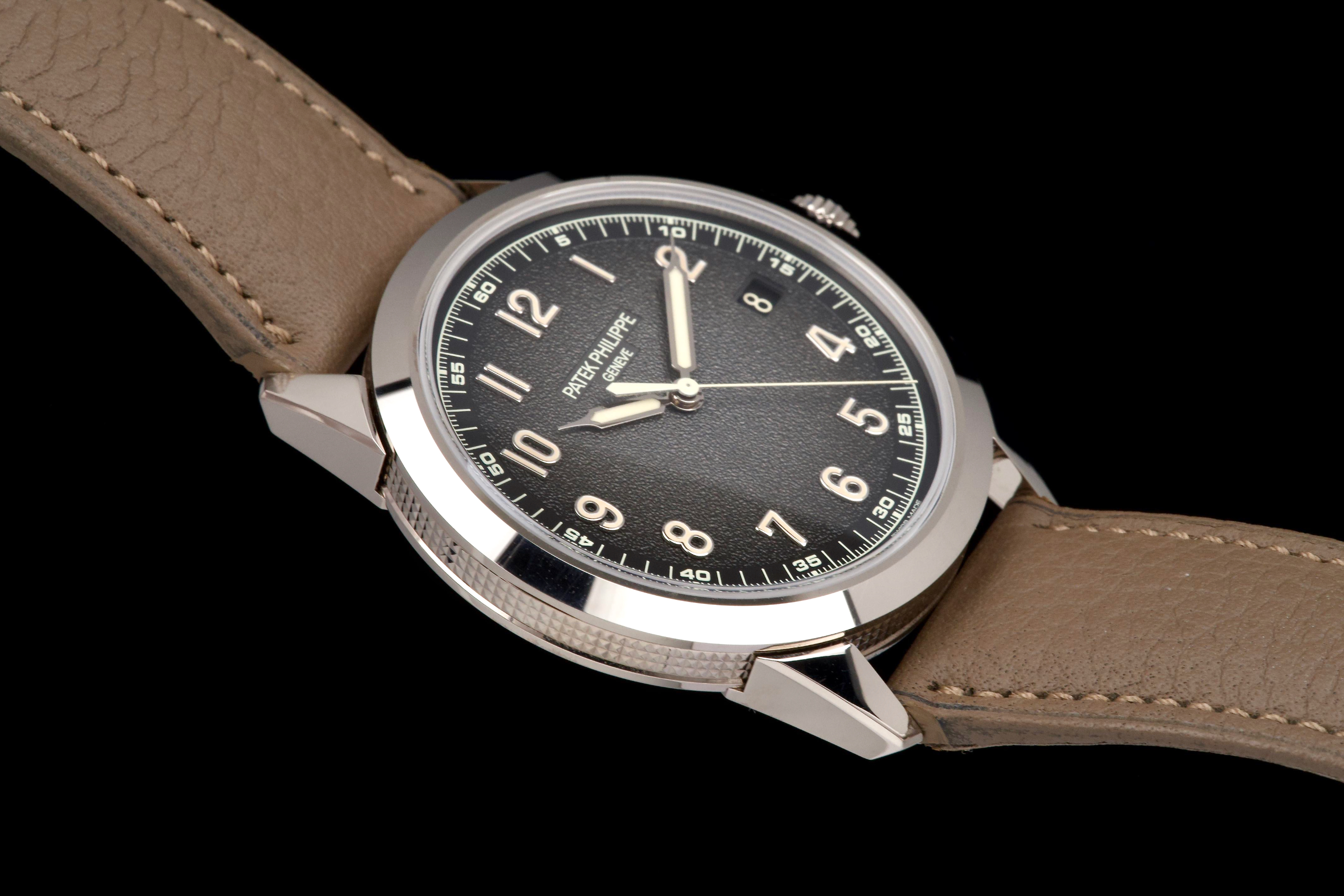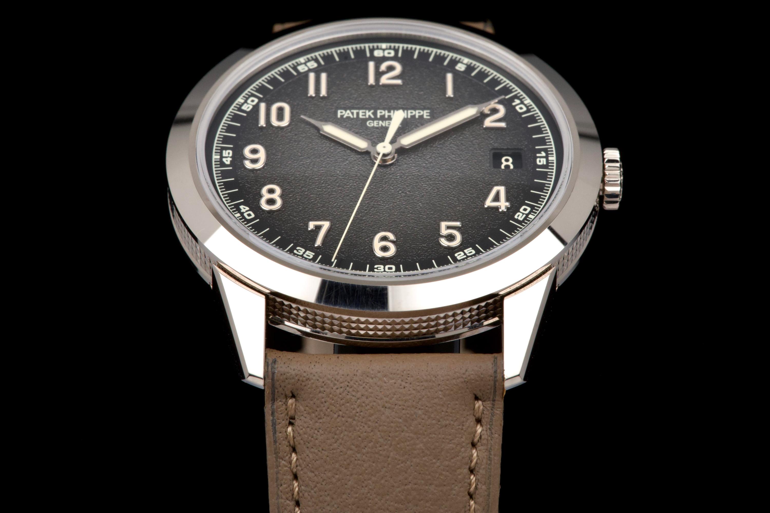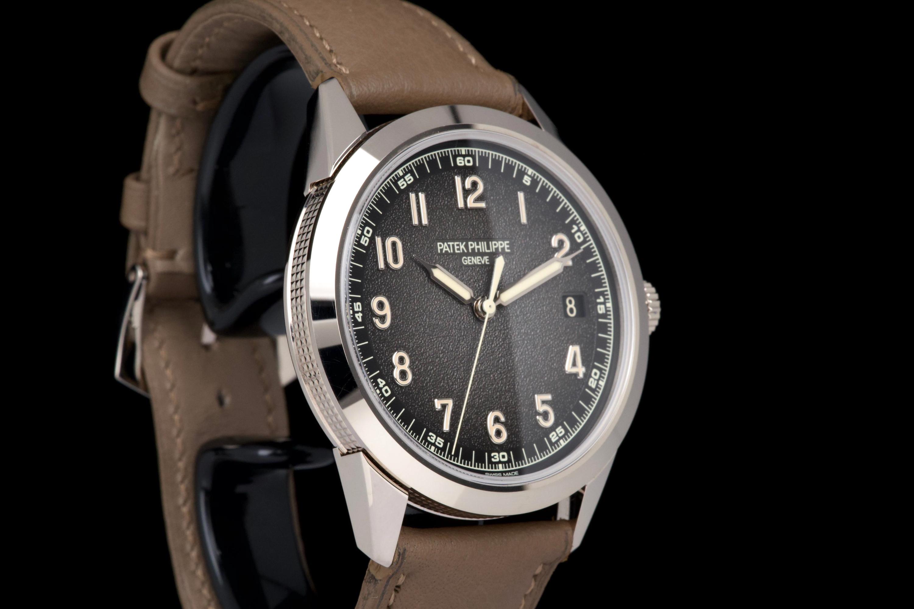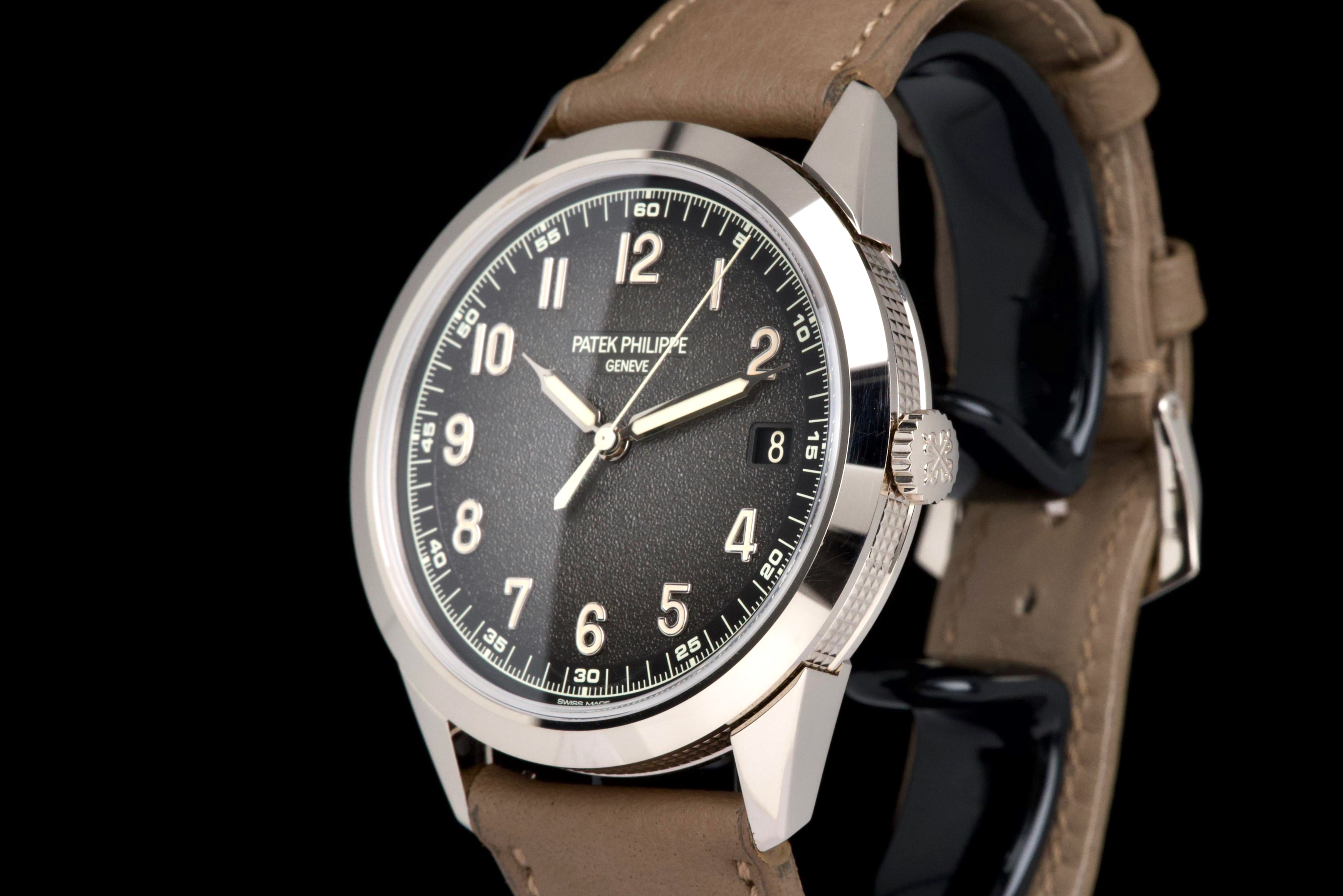 The present Patek Philippe Calatrava reference 5226G, dating to 2022, is a highly attractive and contemporary interpretation of the manufacture’s classic dress watch, offered here as a complete full set and originally sold at the Geneva Salon. Executed in white gold, the case remains unpolished and is preserved in excellent overall condition, showing only light wear consistent with careful use. The sharp case geometry and refined finishing remain crisp, underscoring the watch’s honest preservation and minimal intervention. The model is distinguished by its modern, textured dial with applied numerals and a warm, vintage-inspired aesthetic, combining traditional Calatrava elegance with a more contemporary, casual character. The balanced proportions and restrained design make it one of the most versatile recent Calatrava references. Powered by Patek Philippe’s automatic in-house movement, the watch offers reliable performance and refined finishing in keeping with the manufacture’s highest standards. Delivered as a full set from 2022 and benefitting from Geneva point-of-sale provenance, this Calatrava 5226G represents a compelling opportunity to acquire a modern Patek Philippe classic that blends timeless design with contemporary execution and excellent overall condition.