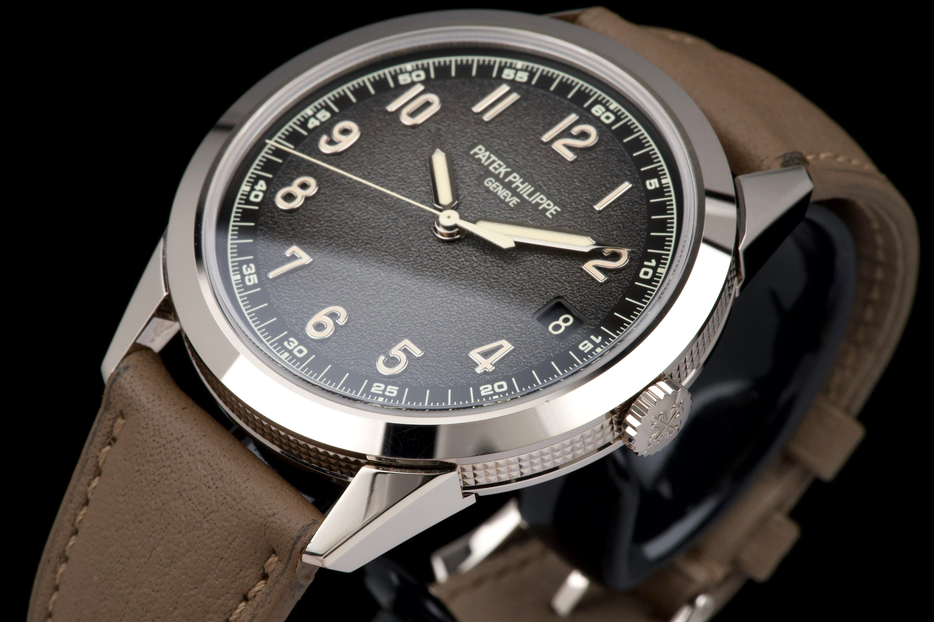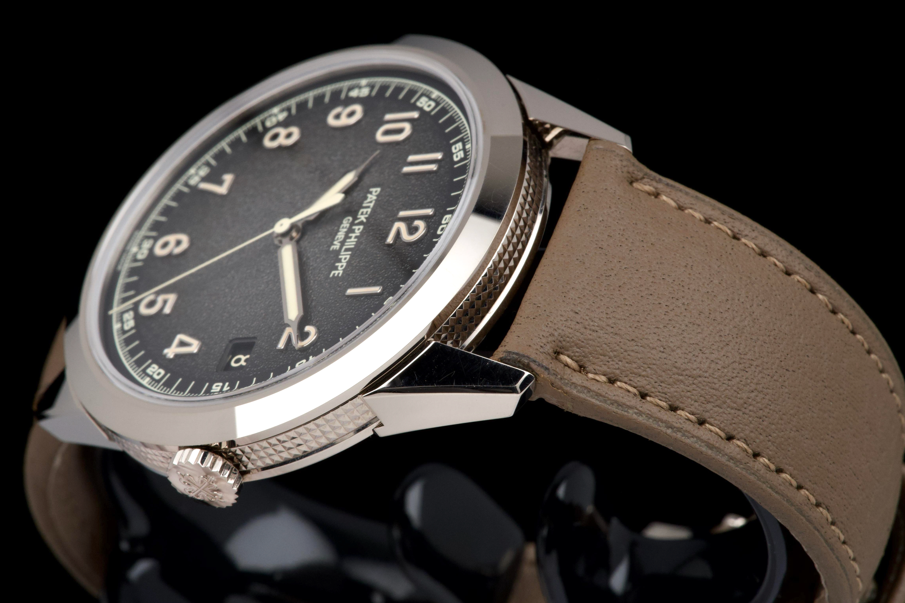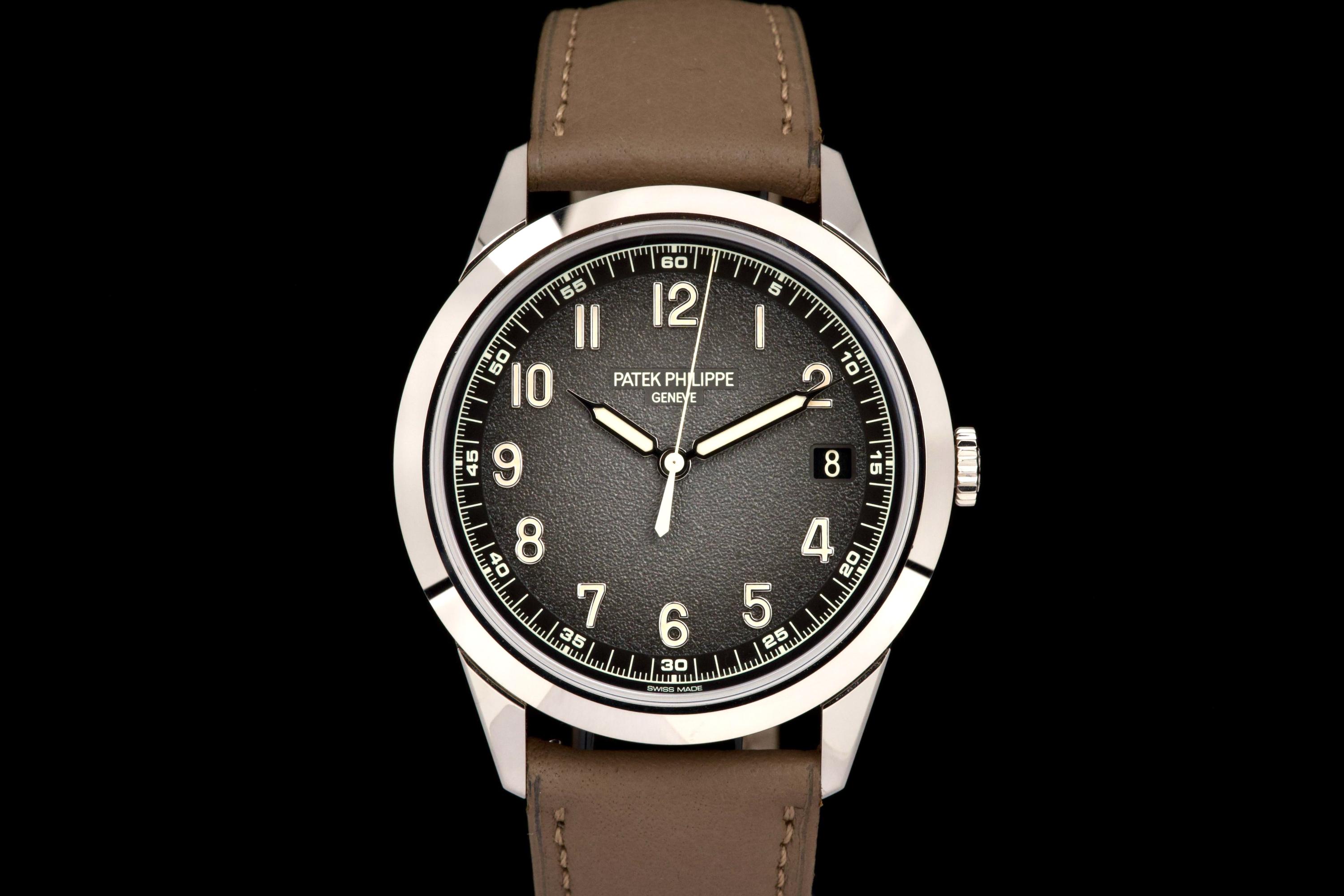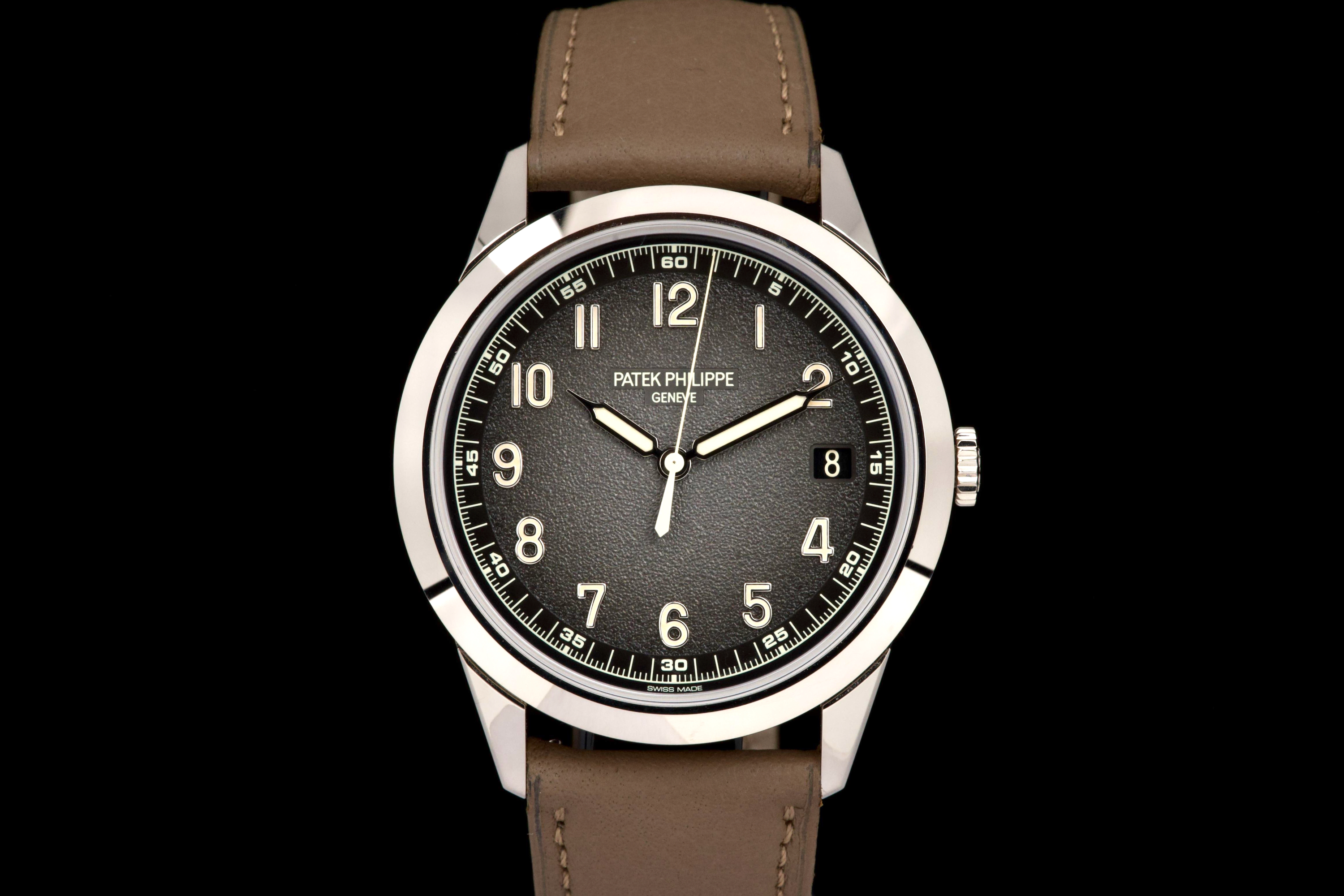 The present Patek Philippe Calatrava reference 5226G, dating to 2022, is a highly attractive and contemporary interpretation of the manufacture’s classic dress watch, offered here as a complete full set and originally sold at the Geneva Salon. Executed in white gold, the case remains unpolished and is preserved in excellent overall condition, showing only light wear consistent with careful use. The sharp case geometry and refined finishing remain crisp, underscoring the watch’s honest preservation and minimal intervention. The model is distinguished by its modern, textured dial with applied numerals and a warm, vintage-inspired aesthetic, combining traditional Calatrava elegance with a more contemporary, casual character. The balanced proportions and restrained design make it one of the most versatile recent Calatrava references. Powered by Patek Philippe’s automatic in-house movement, the watch offers reliable performance and refined finishing in keeping with the manufacture’s highest standards. Delivered as a full set from 2022 and benefitting from Geneva point-of-sale provenance, this Calatrava 5226G represents a compelling opportunity to acquire a modern Patek Philippe classic that blends timeless design with contemporary execution and excellent overall condition.