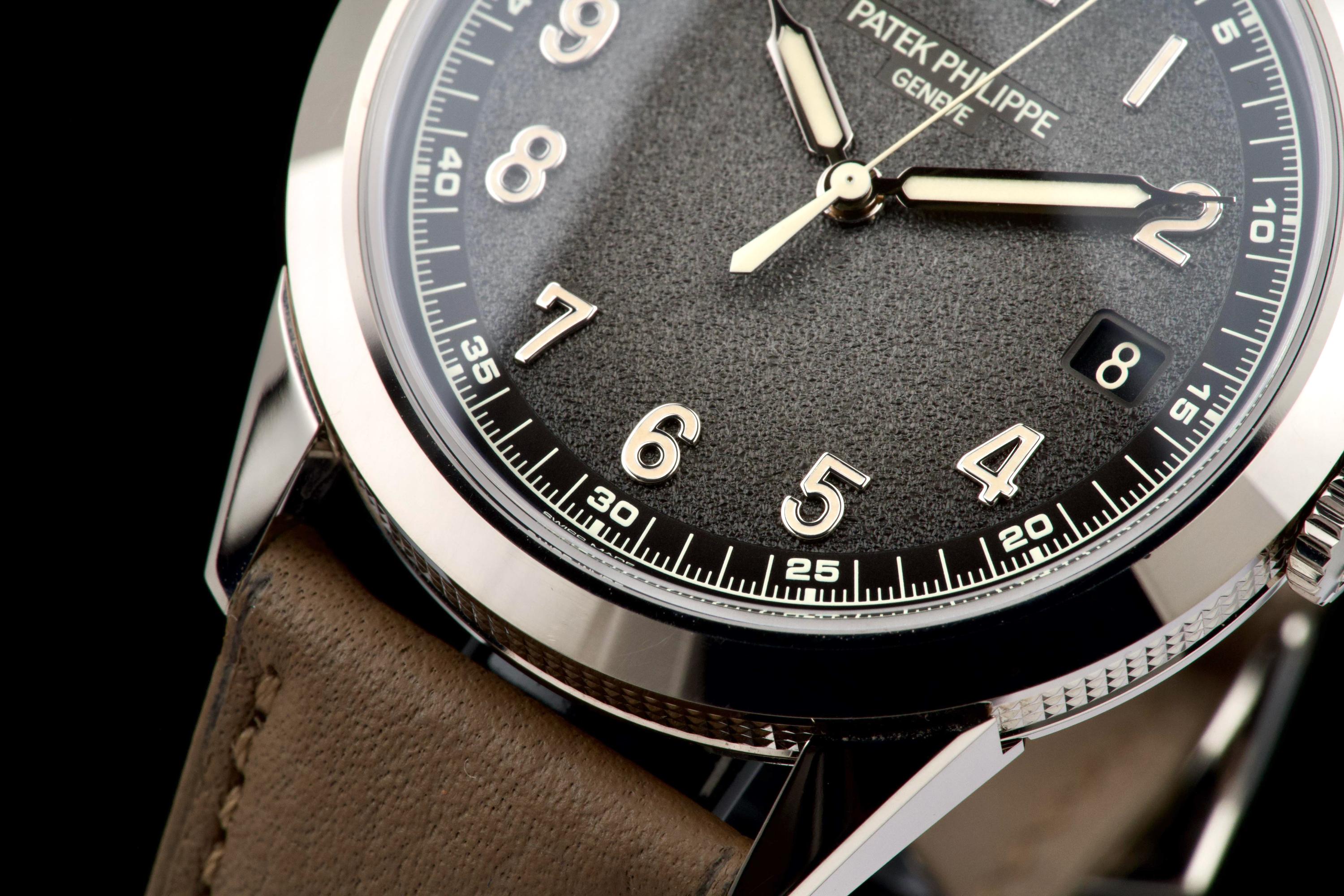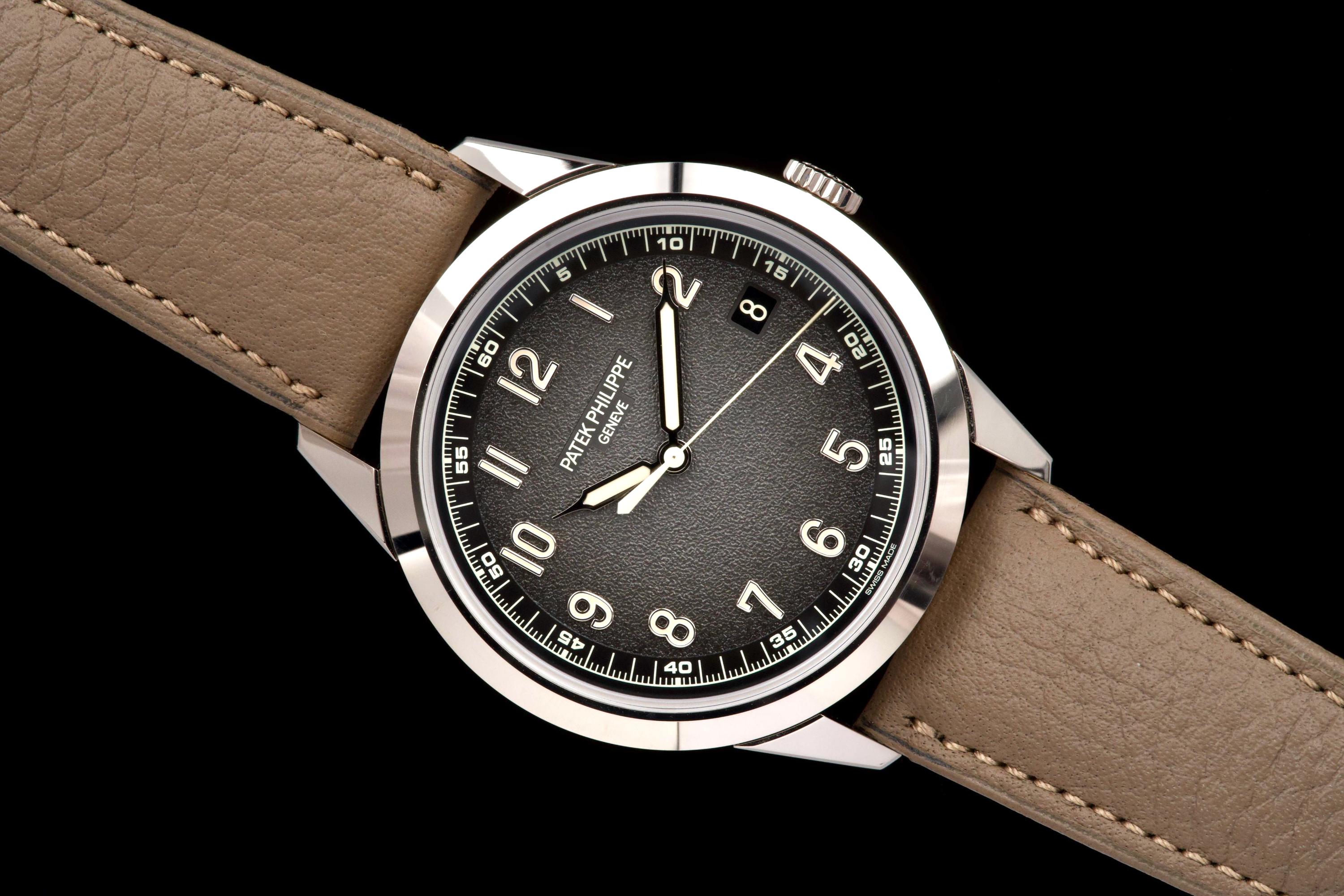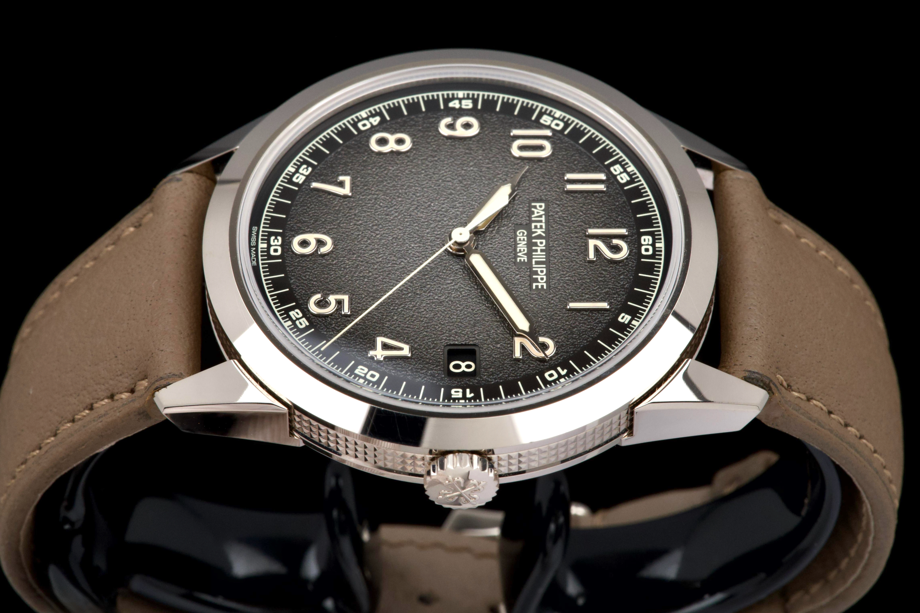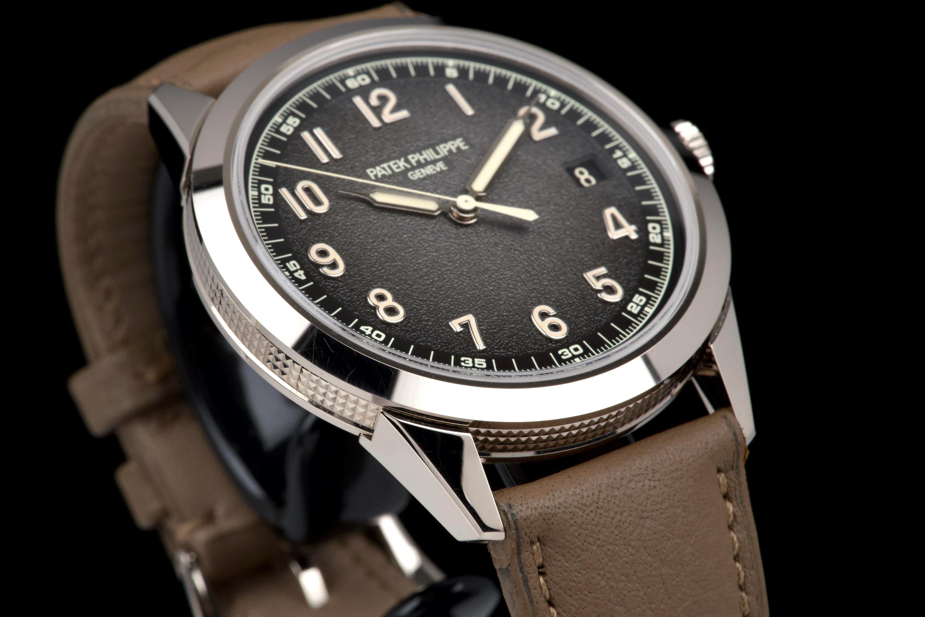 The present Patek Philippe Calatrava reference 5226G, dating to 2022, is a highly attractive and contemporary interpretation of the manufacture’s classic dress watch, offered here as a complete full set and originally sold at the Geneva Salon. Executed in white gold, the case remains unpolished and is preserved in excellent overall condition, showing only light wear consistent with careful use. The sharp case geometry and refined finishing remain crisp, underscoring the watch’s honest preservation and minimal intervention. The model is distinguished by its modern, textured dial with applied numerals and a warm, vintage-inspired aesthetic, combining traditional Calatrava elegance with a more contemporary, casual character. The balanced proportions and restrained design make it one of the most versatile recent Calatrava references. Powered by Patek Philippe’s automatic in-house movement, the watch offers reliable performance and refined finishing in keeping with the manufacture’s highest standards. Delivered as a full set from 2022 and benefitting from Geneva point-of-sale provenance, this Calatrava 5226G represents a compelling opportunity to acquire a modern Patek Philippe classic that blends timeless design with contemporary execution and excellent overall condition.