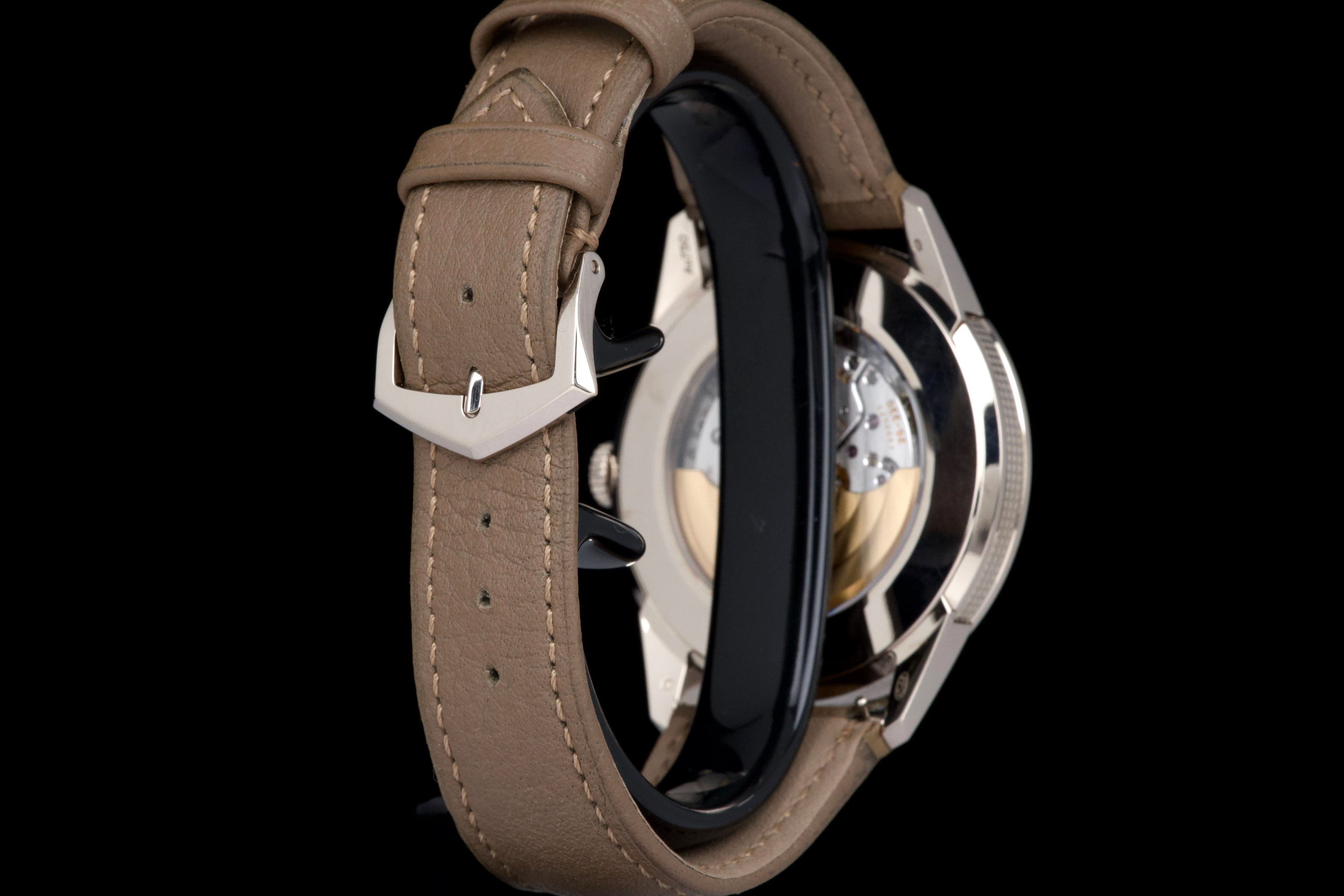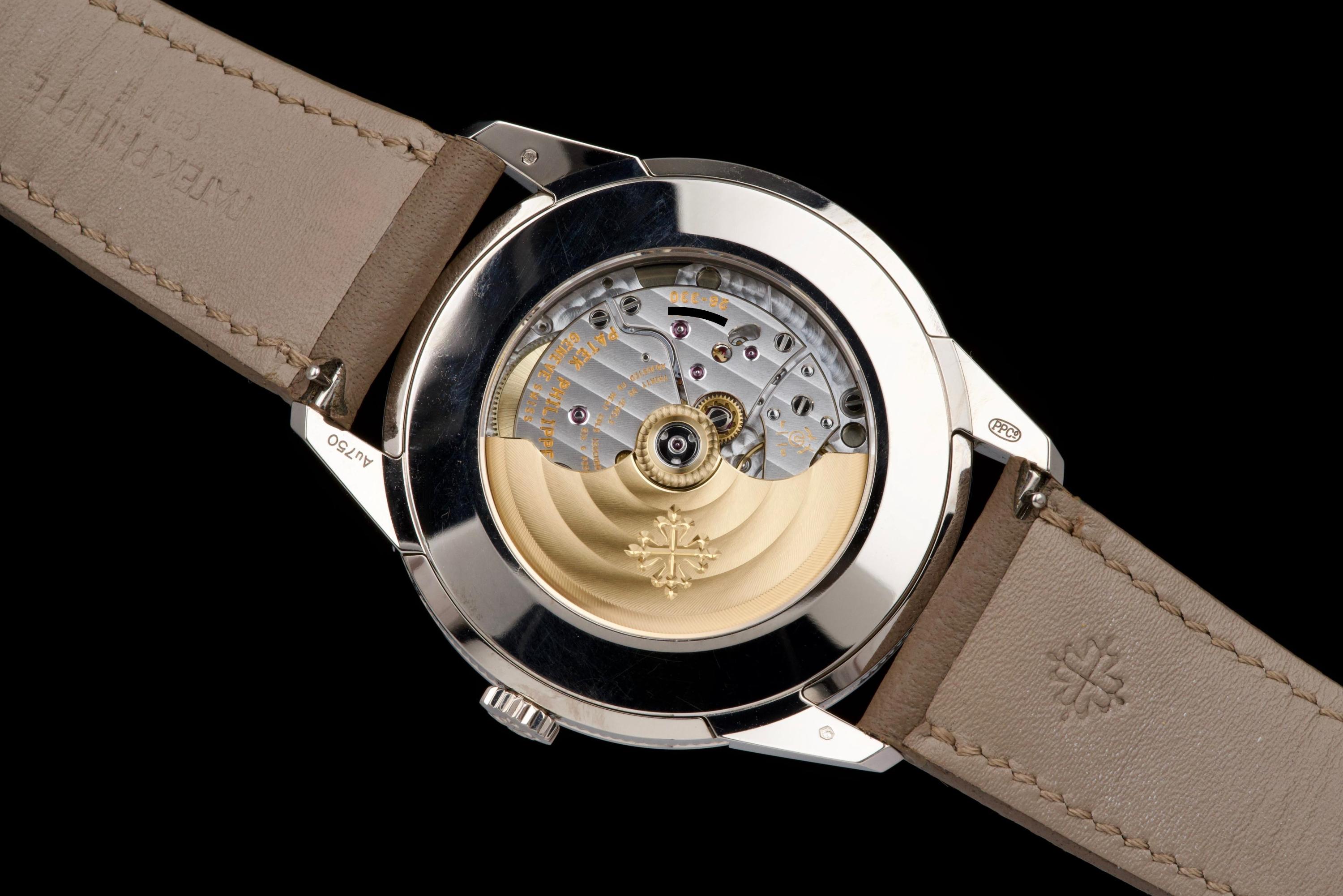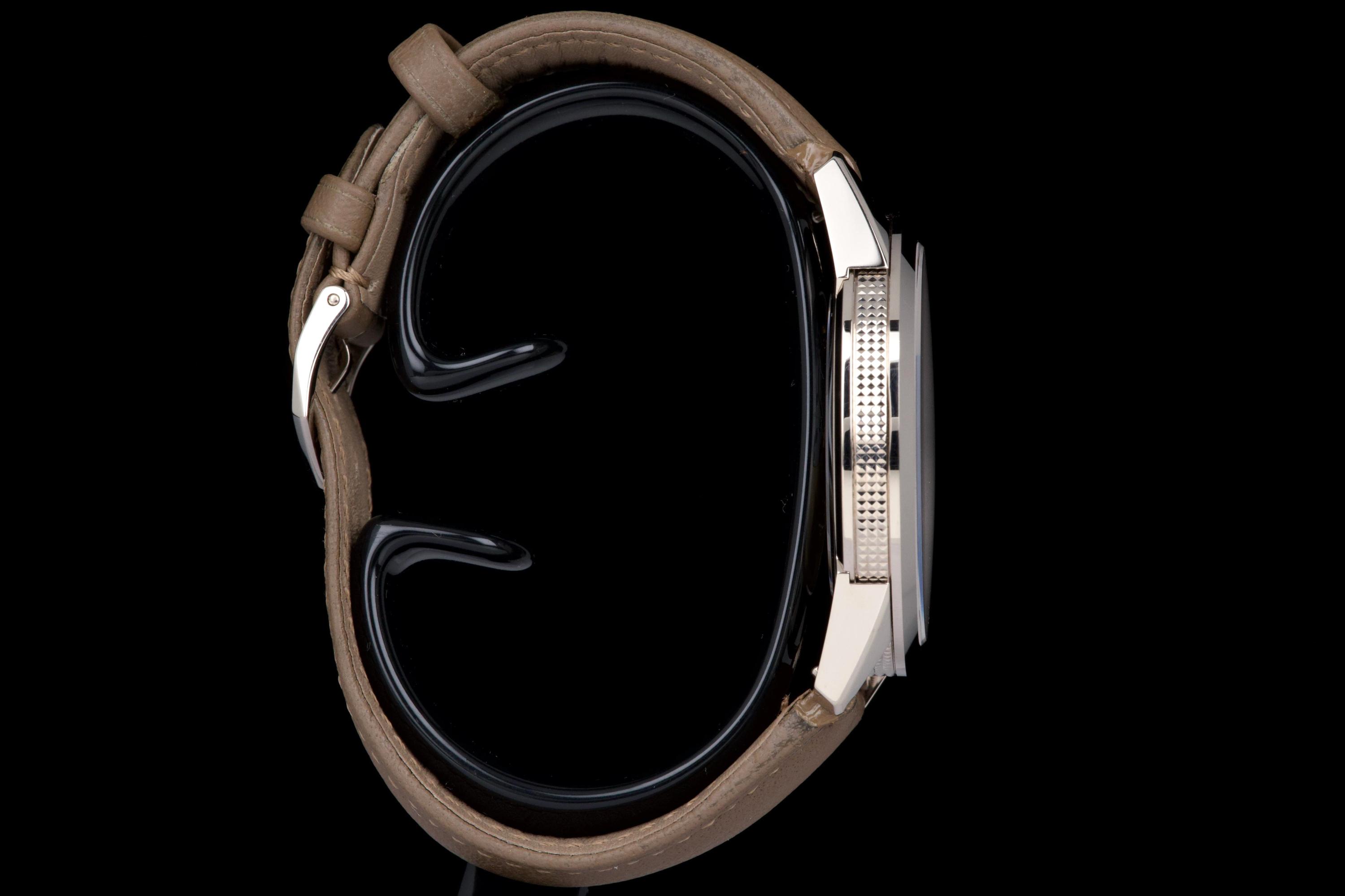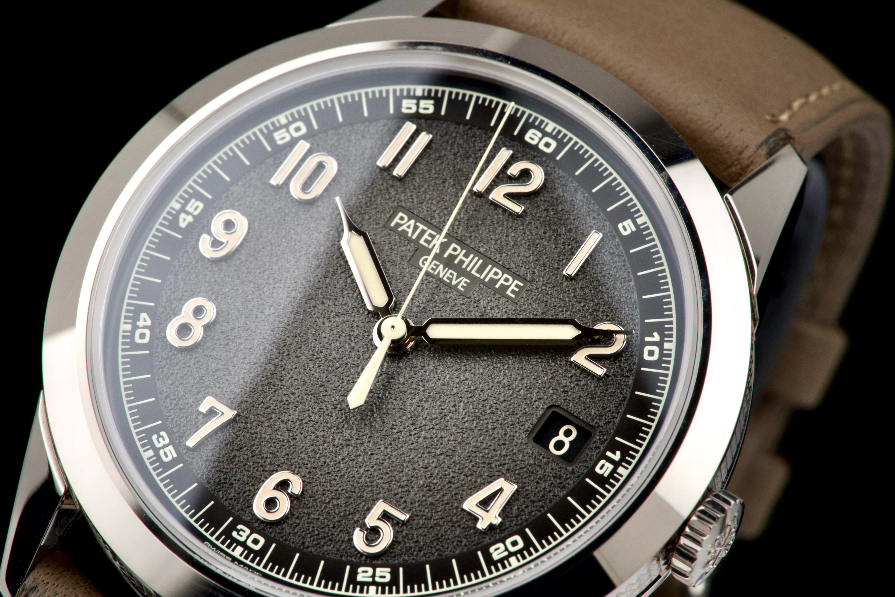 The present Patek Philippe Calatrava reference 5226G, dating to 2022, is a highly attractive and contemporary interpretation of the manufacture’s classic dress watch, offered here as a complete full set and originally sold at the Geneva Salon. Executed in white gold, the case remains unpolished and is preserved in excellent overall condition, showing only light wear consistent with careful use. The sharp case geometry and refined finishing remain crisp, underscoring the watch’s honest preservation and minimal intervention. The model is distinguished by its modern, textured dial with applied numerals and a warm, vintage-inspired aesthetic, combining traditional Calatrava elegance with a more contemporary, casual character. The balanced proportions and restrained design make it one of the most versatile recent Calatrava references. Powered by Patek Philippe’s automatic in-house movement, the watch offers reliable performance and refined finishing in keeping with the manufacture’s highest standards. Delivered as a full set from 2022 and benefitting from Geneva point-of-sale provenance, this Calatrava 5226G represents a compelling opportunity to acquire a modern Patek Philippe classic that blends timeless design with contemporary execution and excellent overall condition.