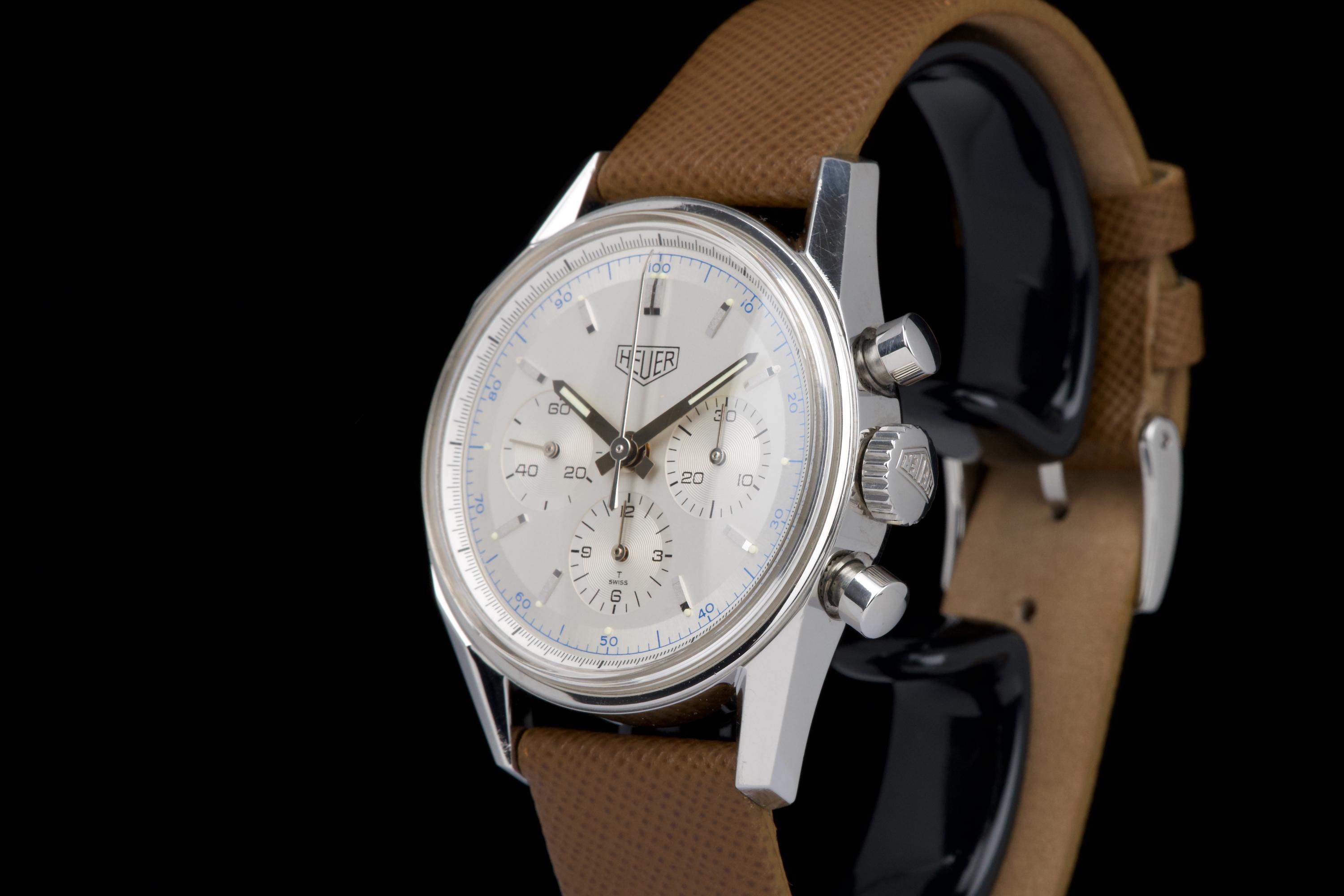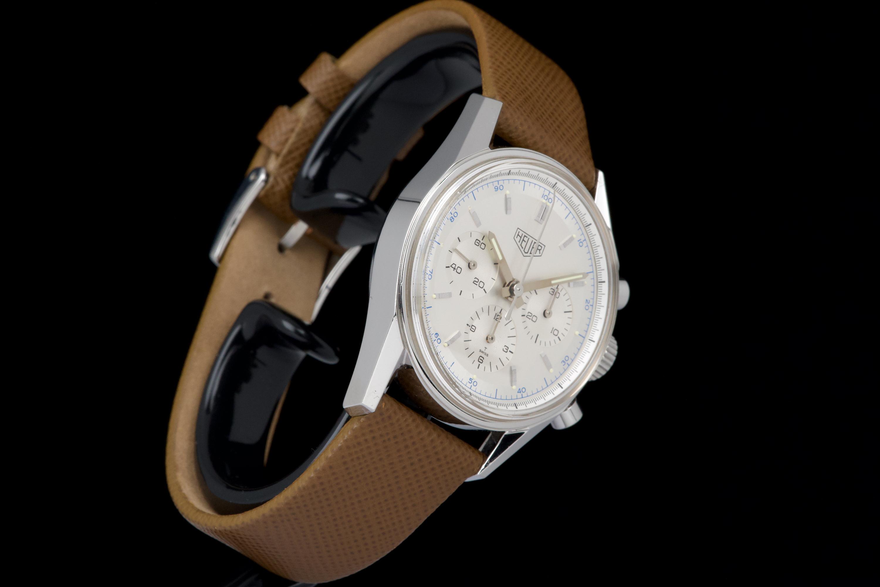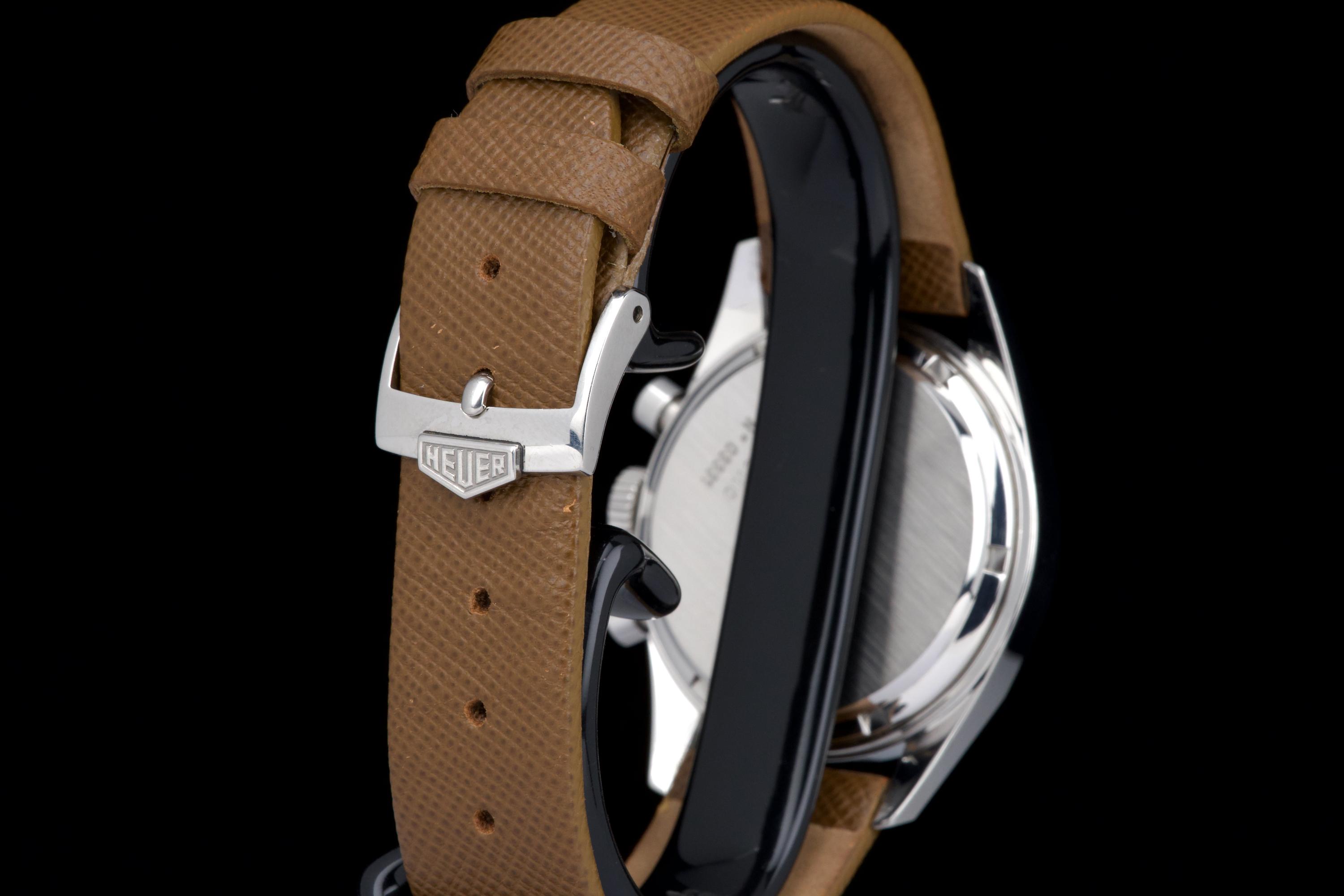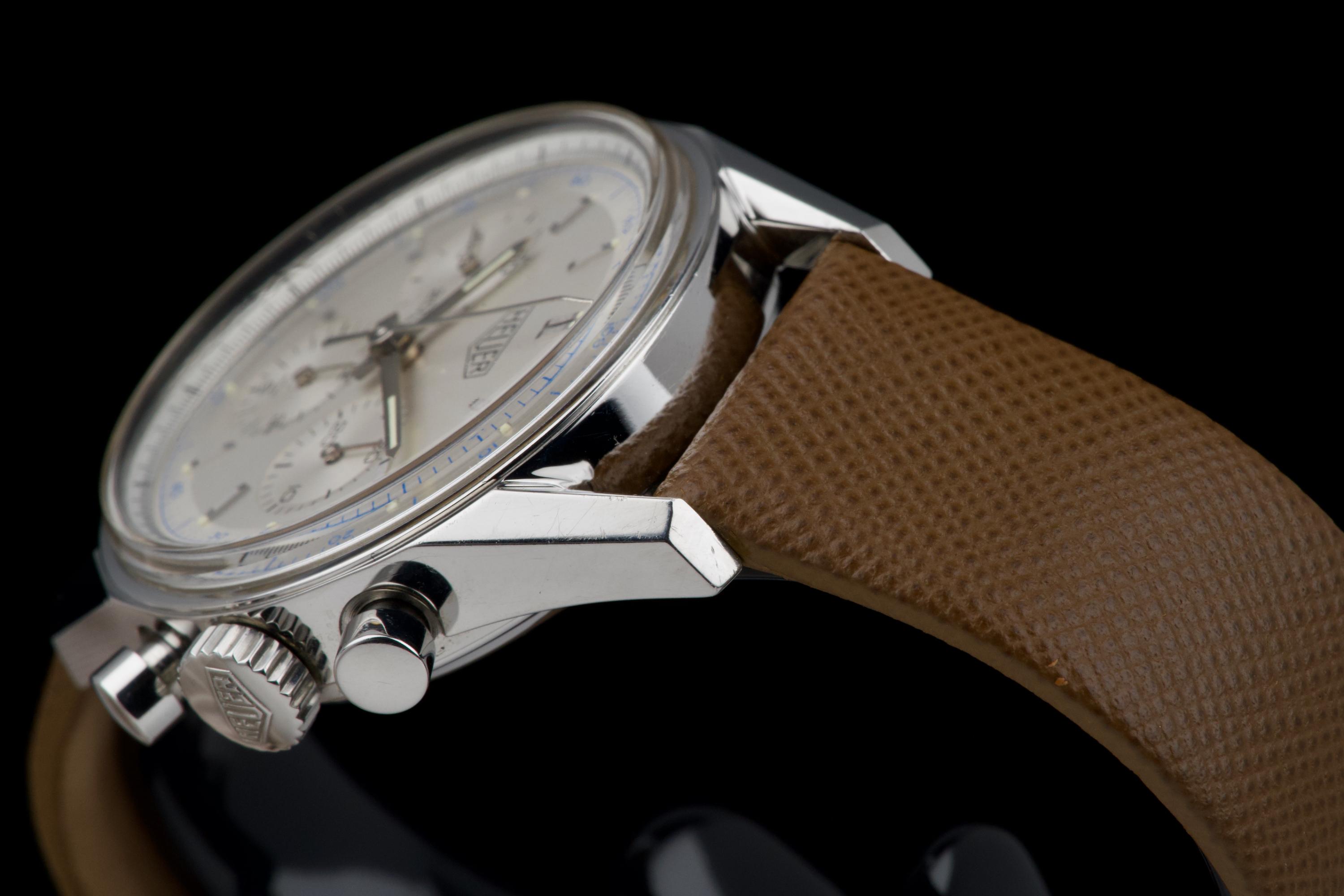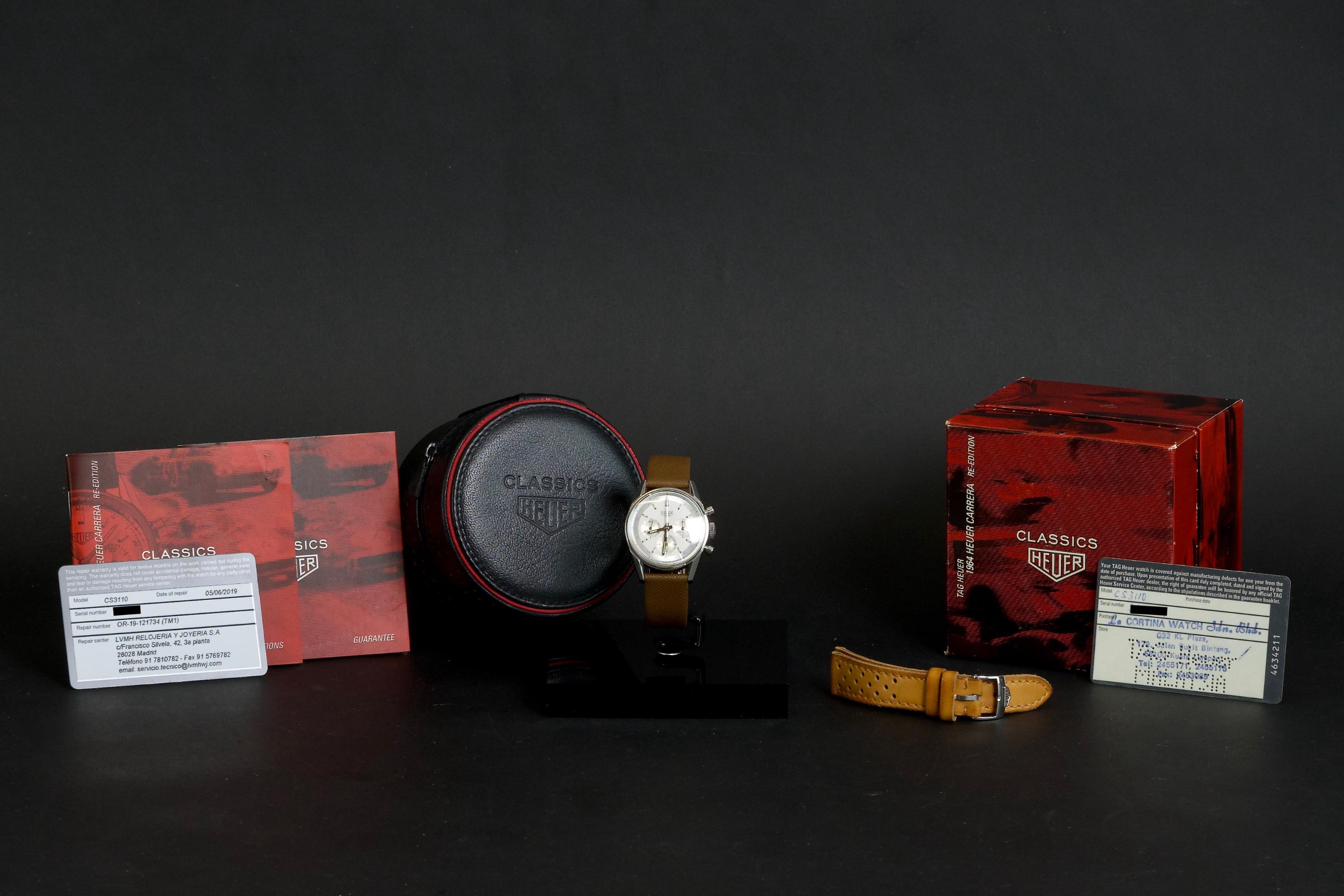 A beautiful example of the 1964 Carrera Re-Edition — reference CS3110 — released in 1997 to celebrate one of Heuer’s most iconic chronographs. The stainless steel case remains unpolished, showing only light wear consistent with age, and retains its original proportions. The original silver tritium dial and hands are beautifully preserved, showing a warm, even patina. The watch comes with two original Heuer-signed buckles and two straps, allowing versatile wear. Accompanied by its full set including original box, papers (undated warranty, as these were released in 1997), and a TAG Heuer service card from 2019. Overall in excellent condition, both mechanically and cosmetically. A superb example of the CS3110 — arguably one of the most faithful and collectible modern re-editions of the vintage Carrera.