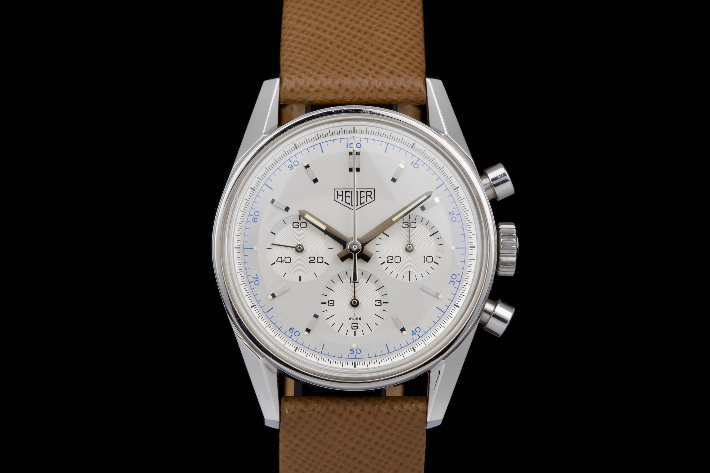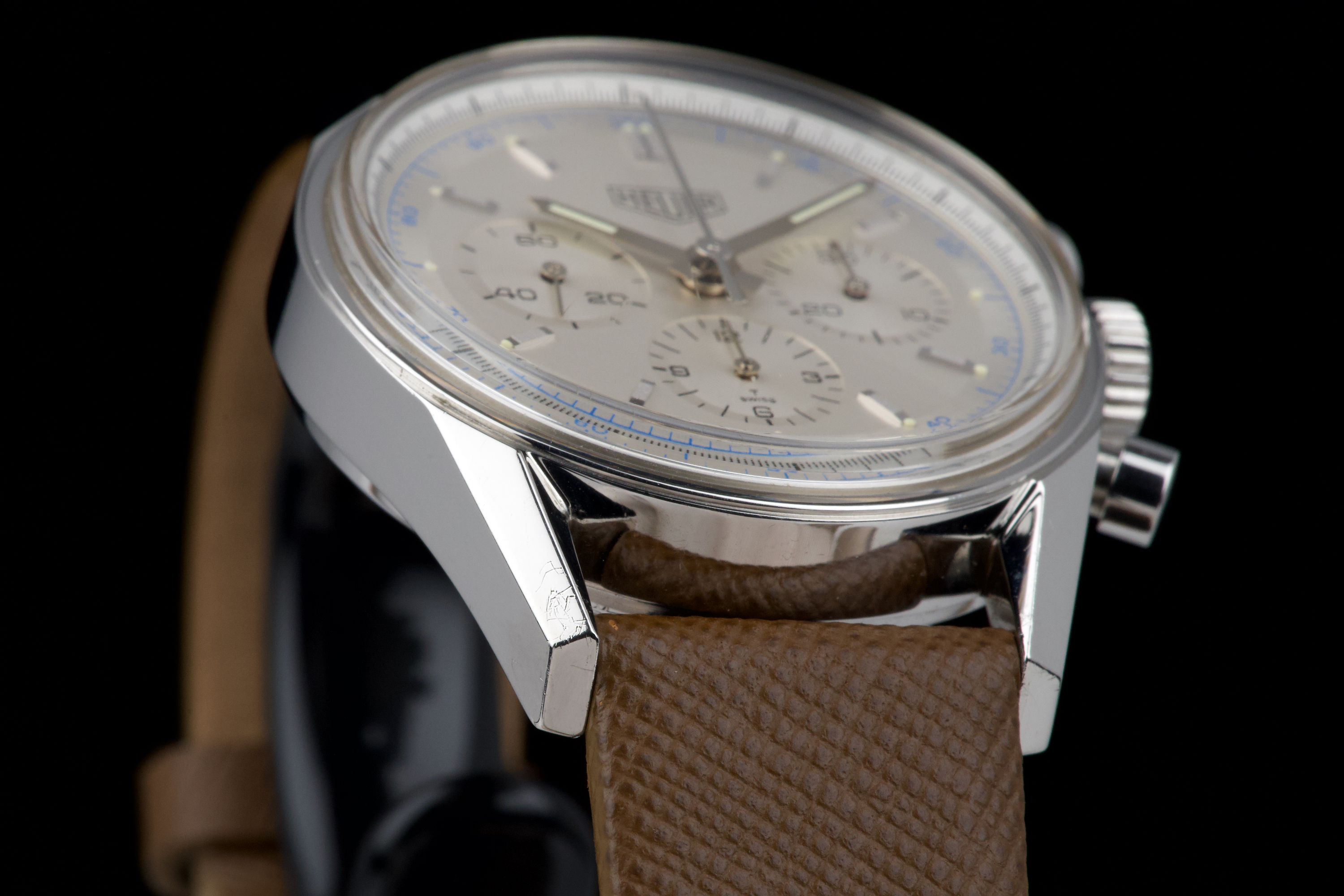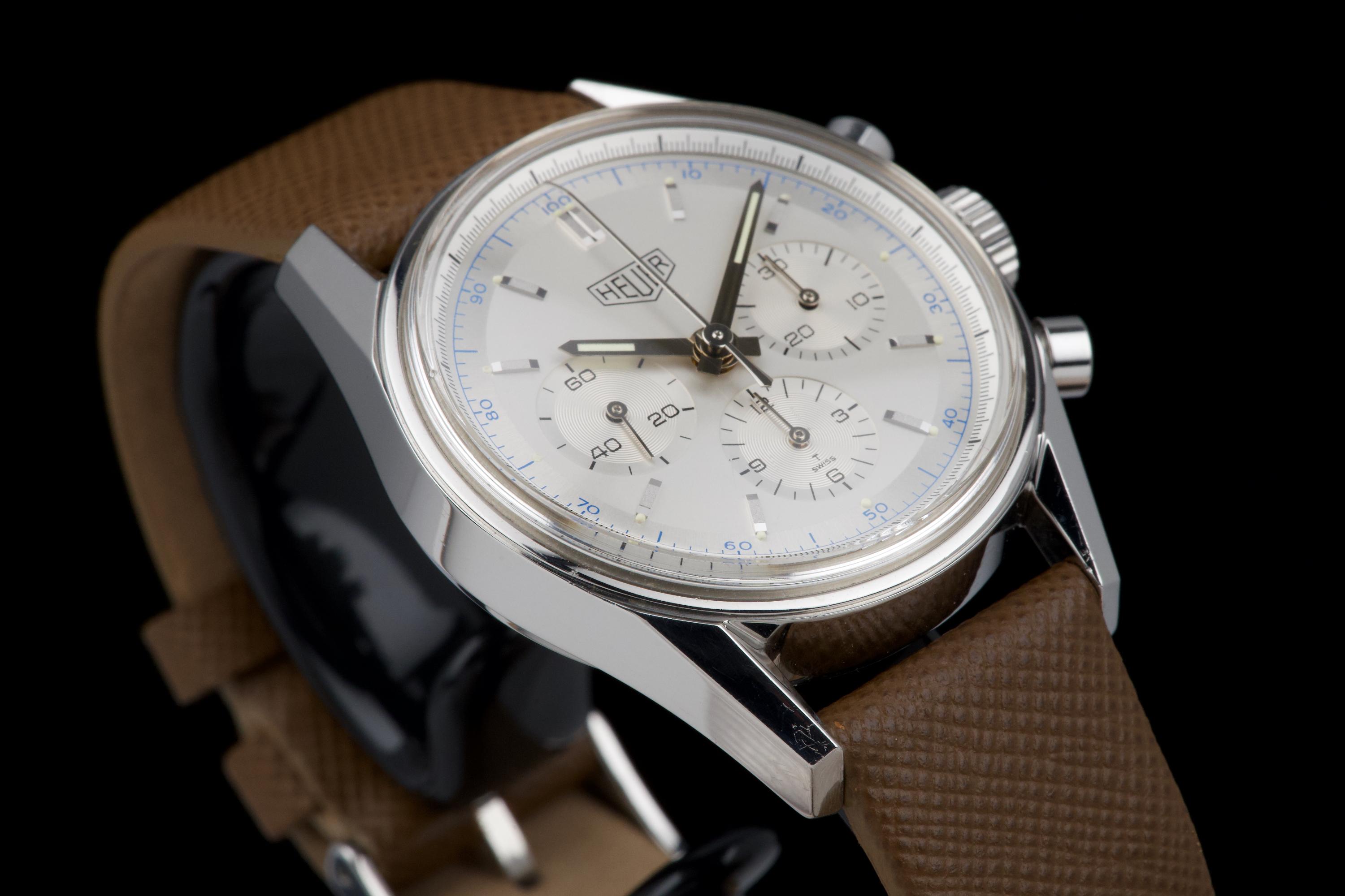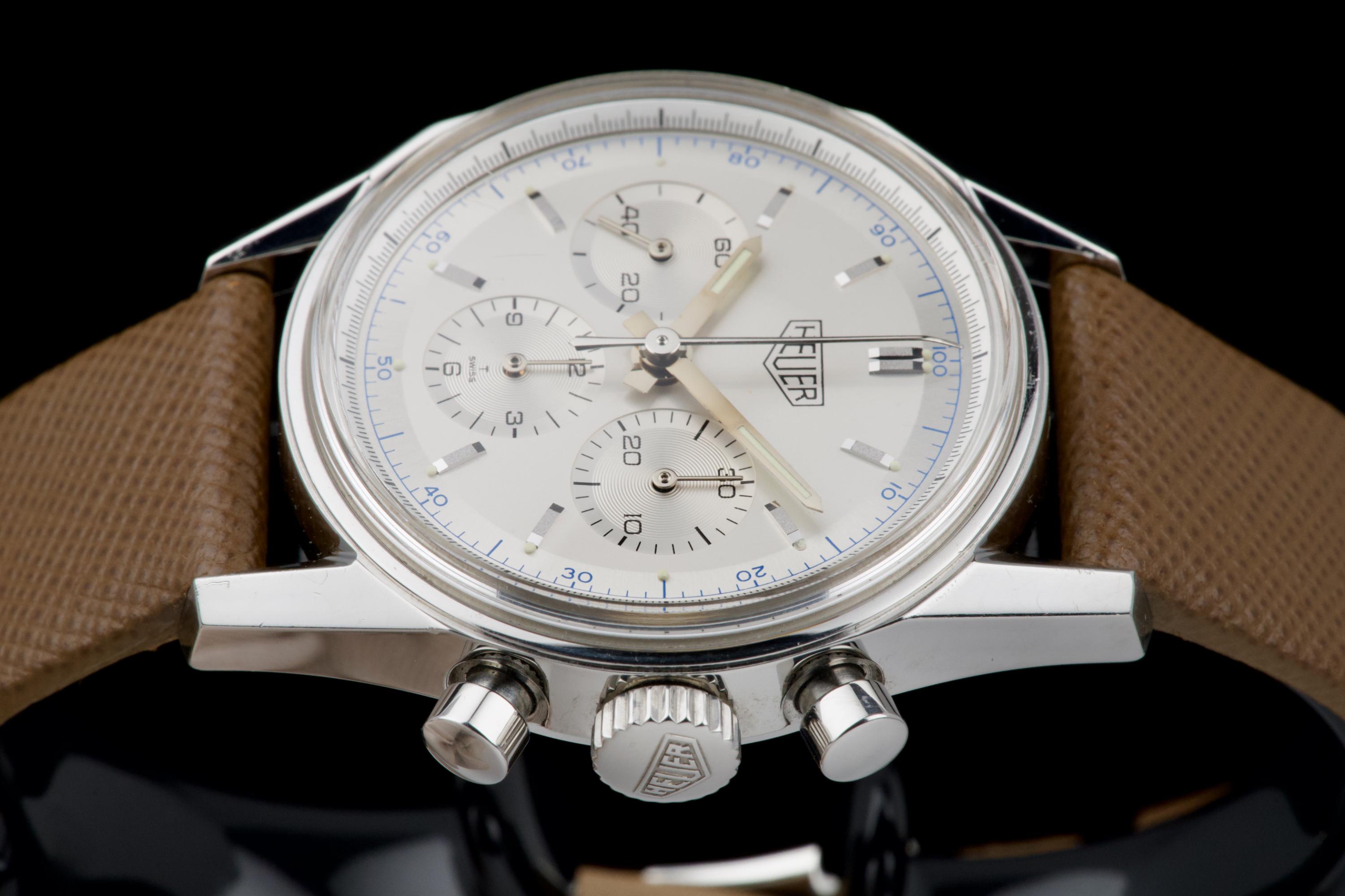 A beautiful example of the 1964 Carrera Re-Edition — reference CS3110 — released in 1997 to celebrate one of Heuer’s most iconic chronographs. The stainless steel case remains unpolished, showing only light wear consistent with age, and retains its original proportions. The original silver tritium dial and hands are beautifully preserved, showing a warm, even patina. The watch comes with two original Heuer-signed buckles and two straps, allowing versatile wear. Accompanied by its full set including original box, papers (undated warranty, as these were released in 1997), and a TAG Heuer service card from 2019. Overall in excellent condition, both mechanically and cosmetically. A superb example of the CS3110 — arguably one of the most faithful and collectible modern re-editions of the vintage Carrera.