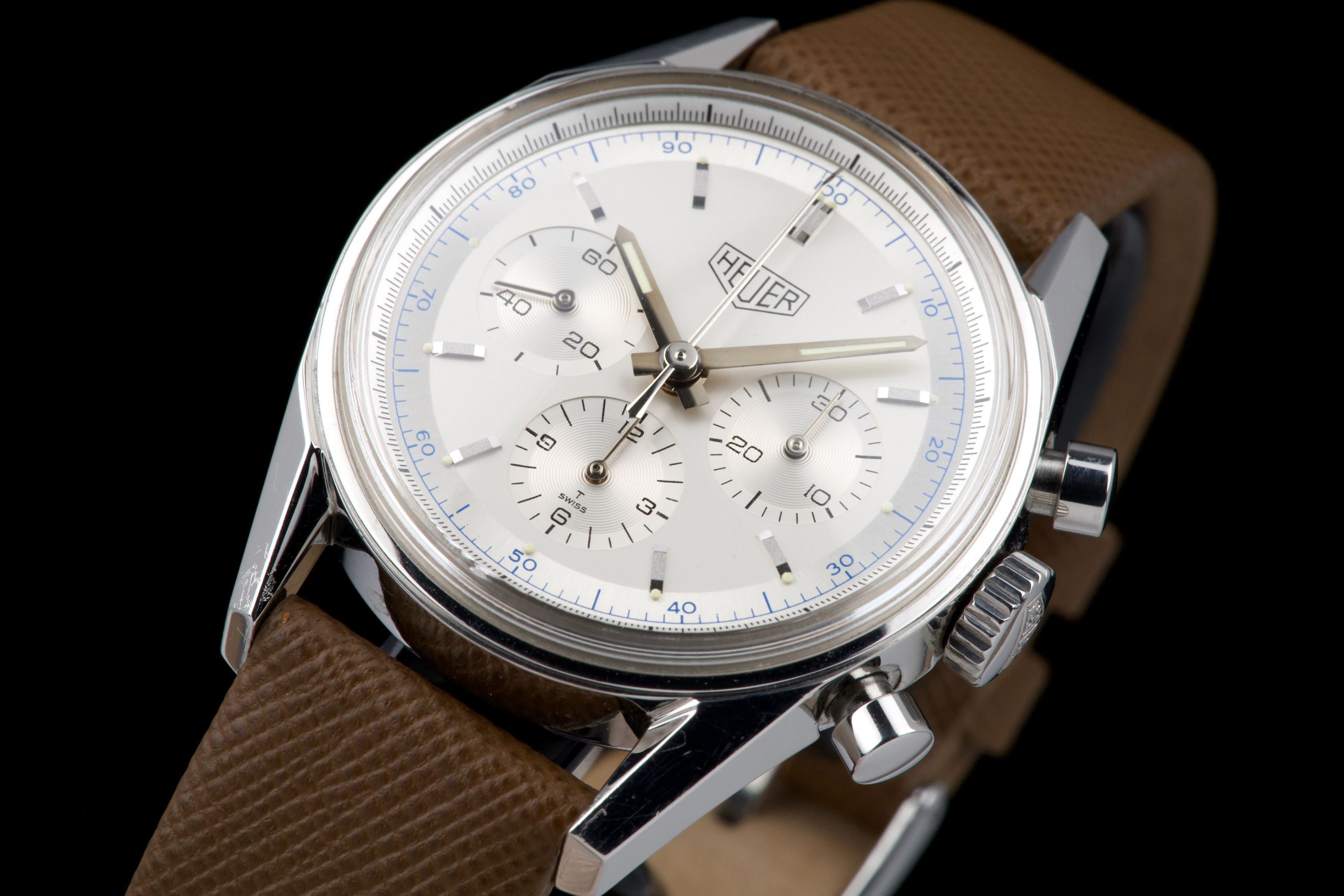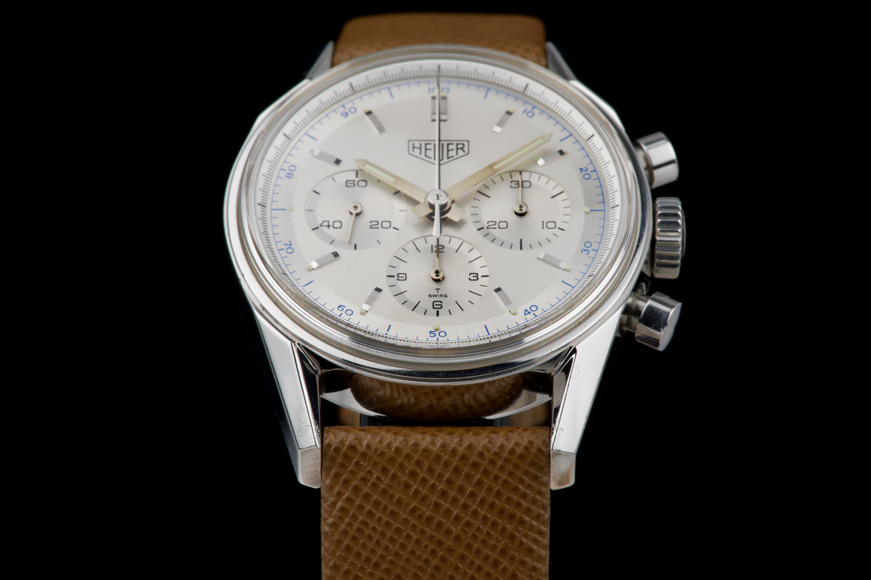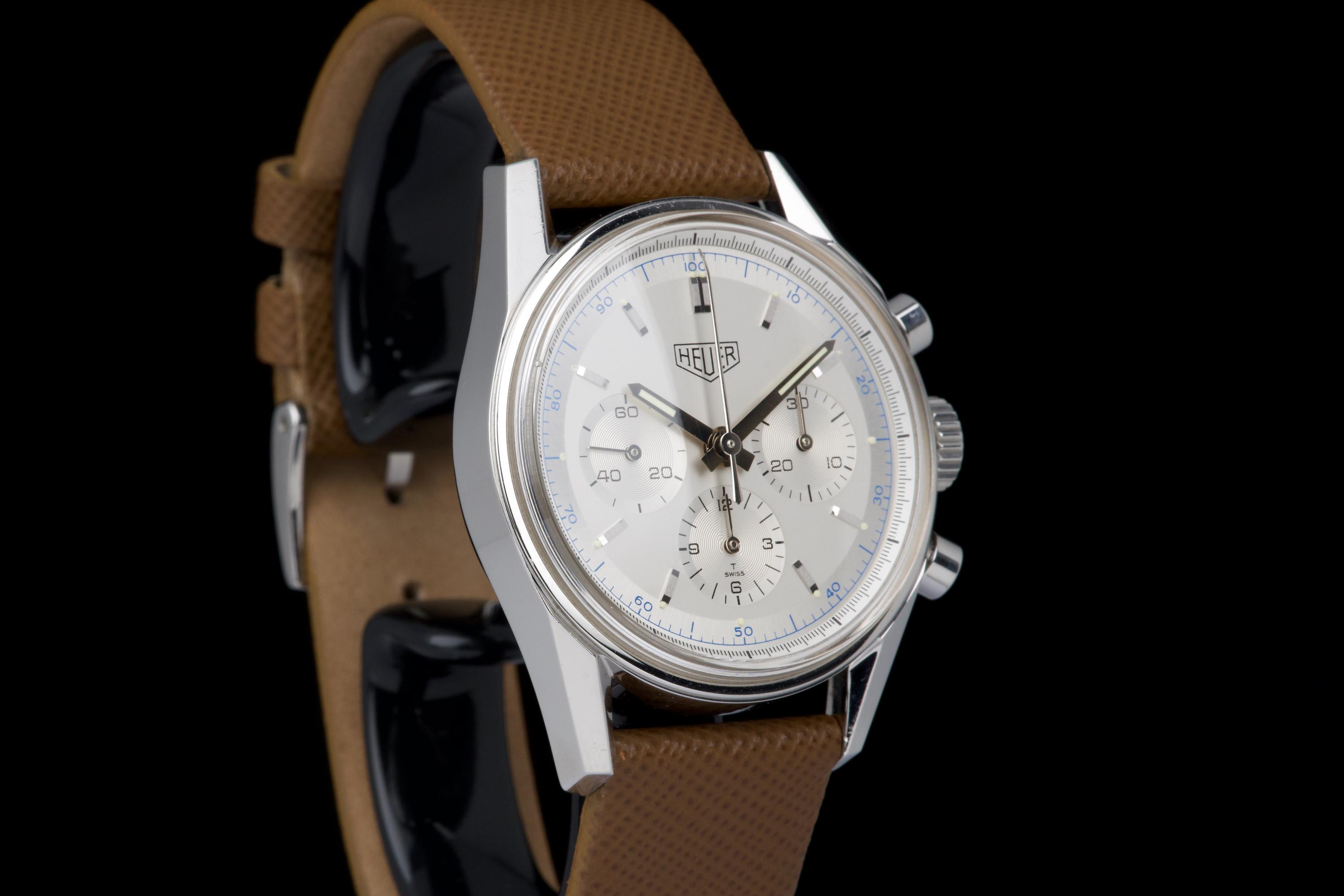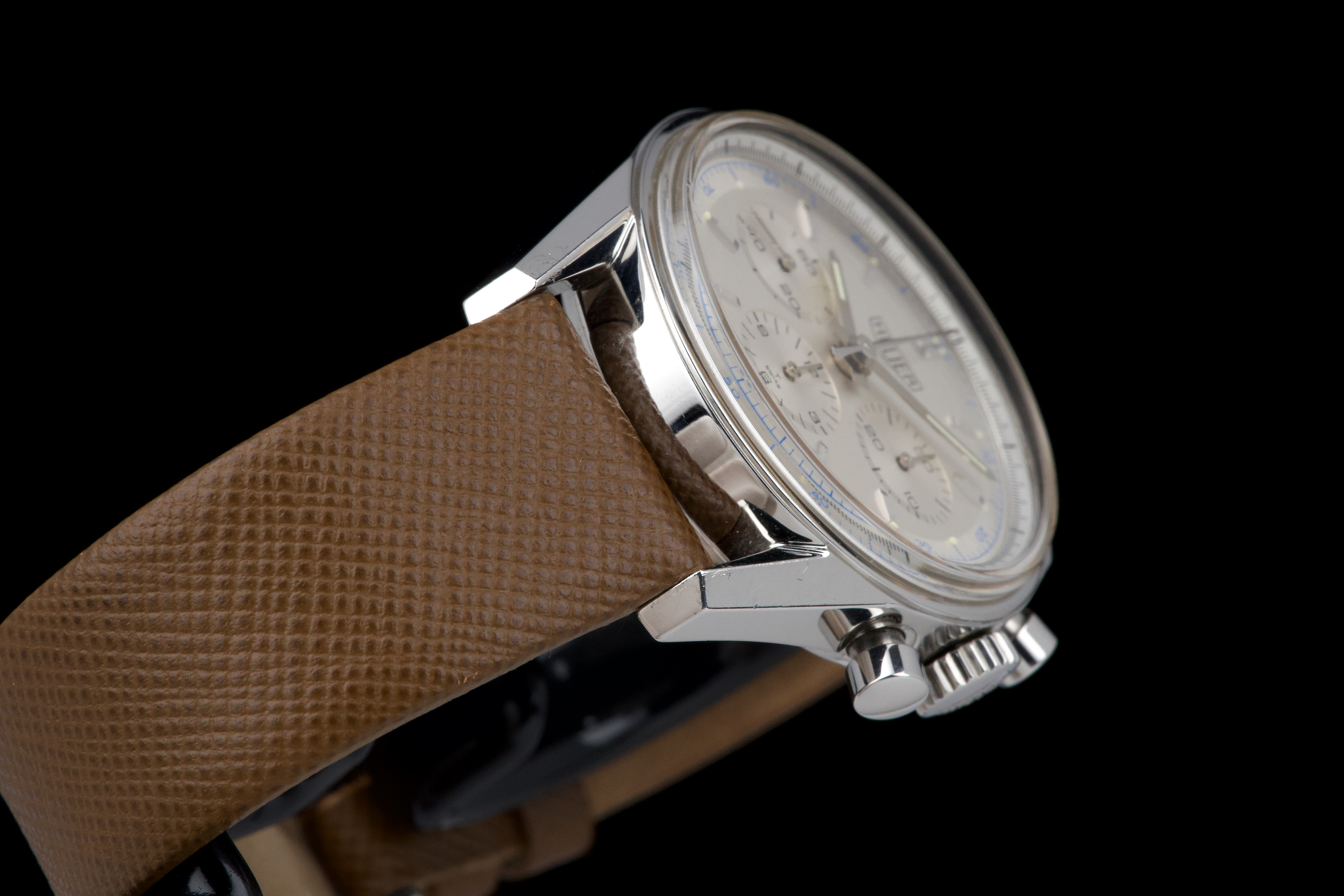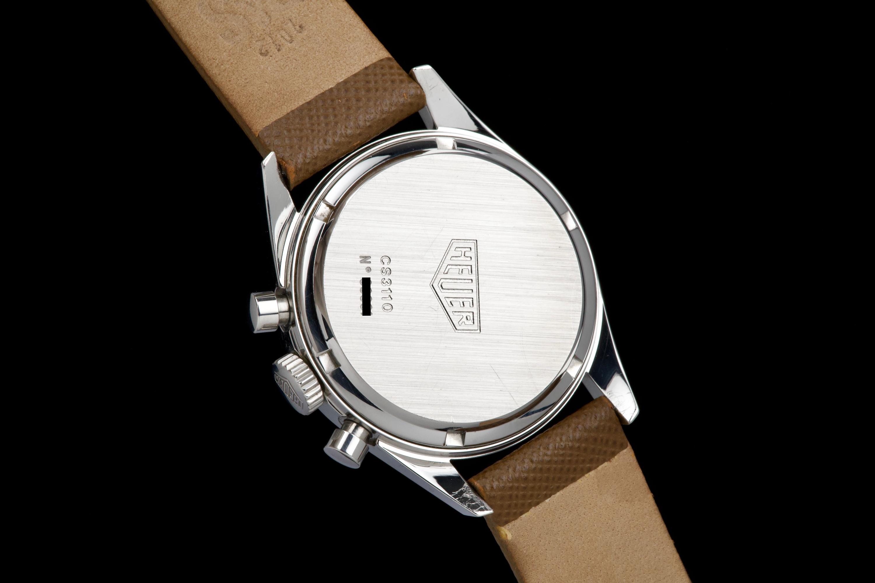 A beautiful example of the 1964 Carrera Re-Edition — reference CS3110 — released in 1997 to celebrate one of Heuer’s most iconic chronographs. The stainless steel case remains unpolished, showing only light wear consistent with age, and retains its original proportions. The original silver tritium dial and hands are beautifully preserved, showing a warm, even patina. The watch comes with two original Heuer-signed buckles and two straps, allowing versatile wear. Accompanied by its full set including original box, papers (undated warranty, as these were released in 1997), and a TAG Heuer service card from 2019. Overall in excellent condition, both mechanically and cosmetically. A superb example of the CS3110 — arguably one of the most faithful and collectible modern re-editions of the vintage Carrera.