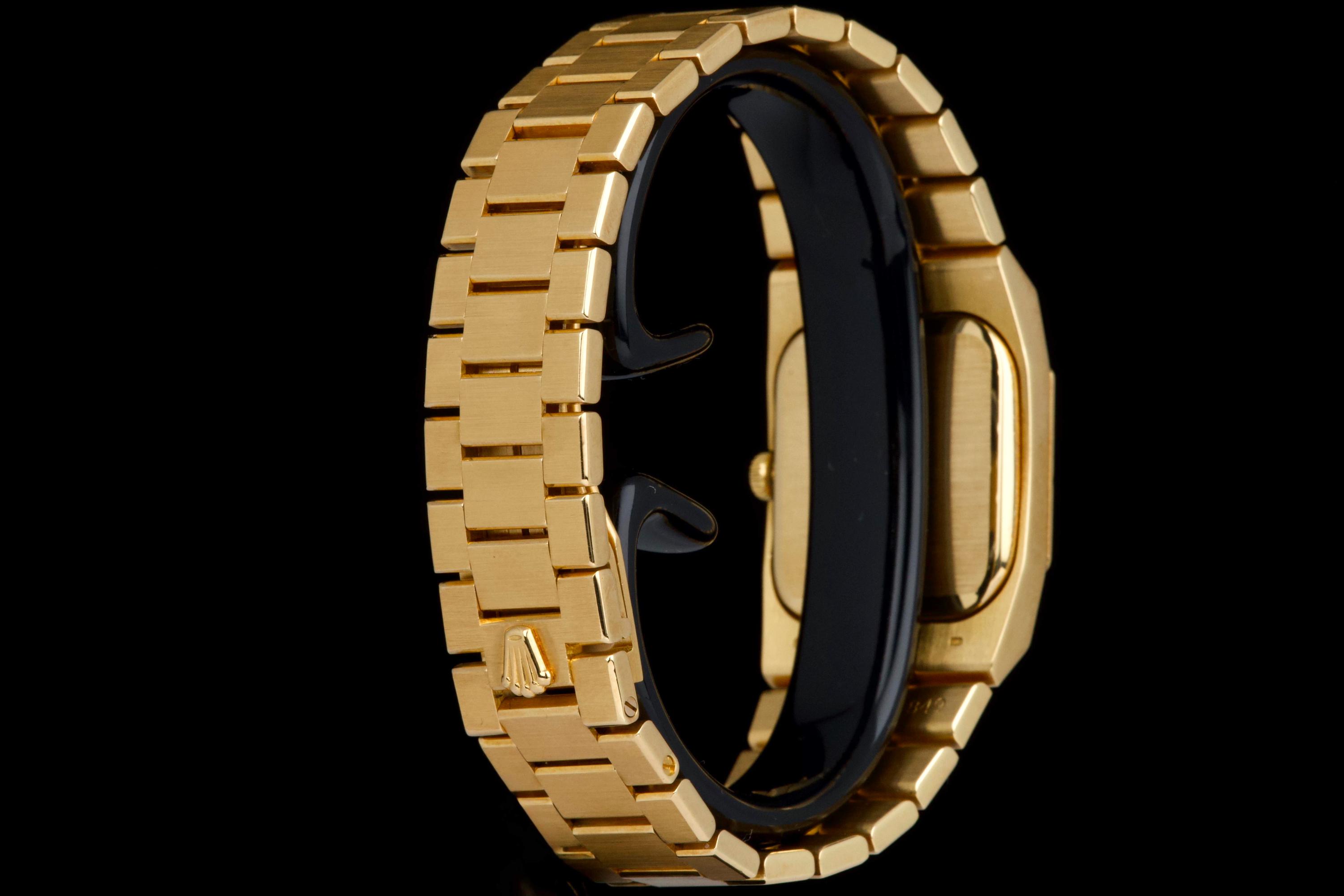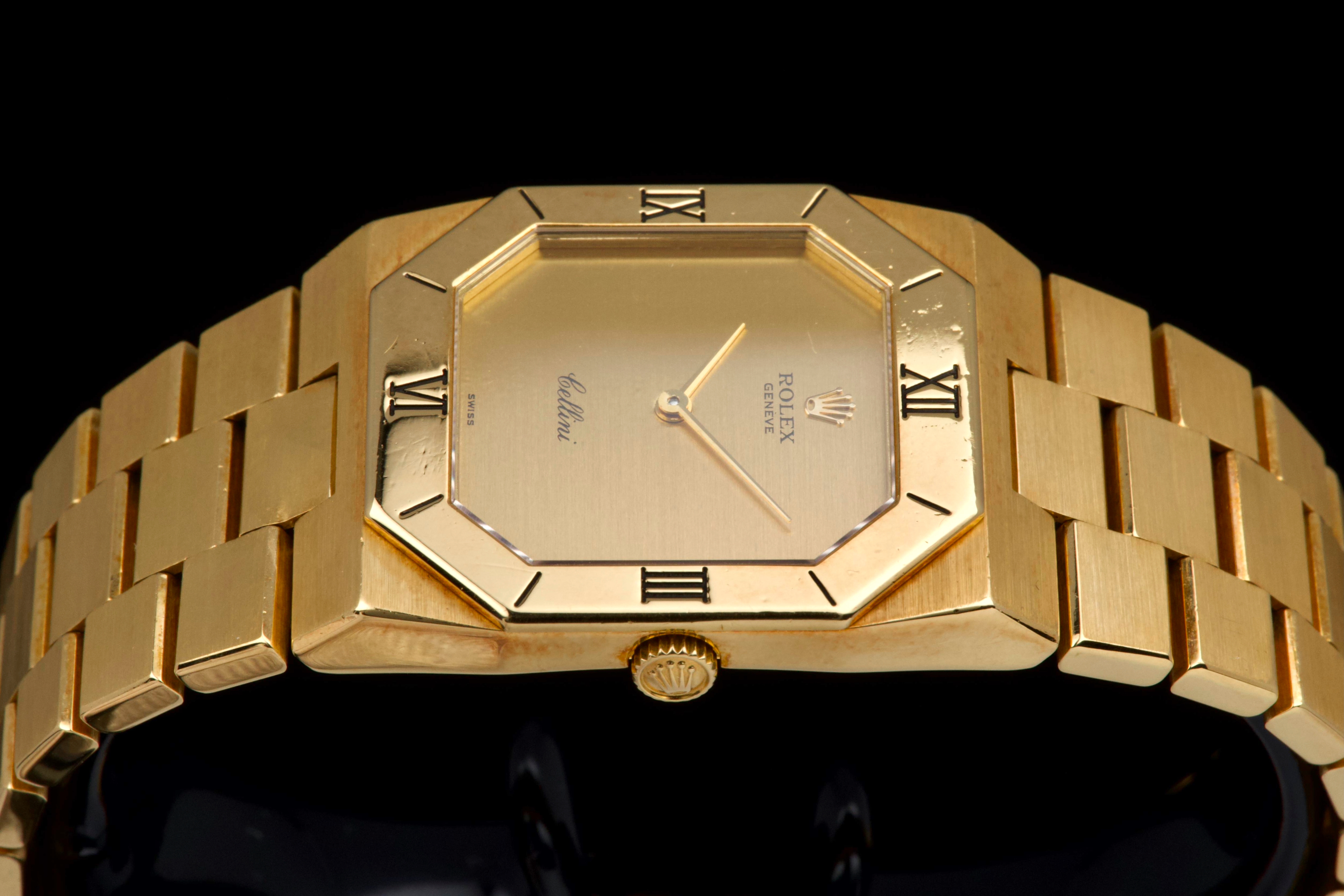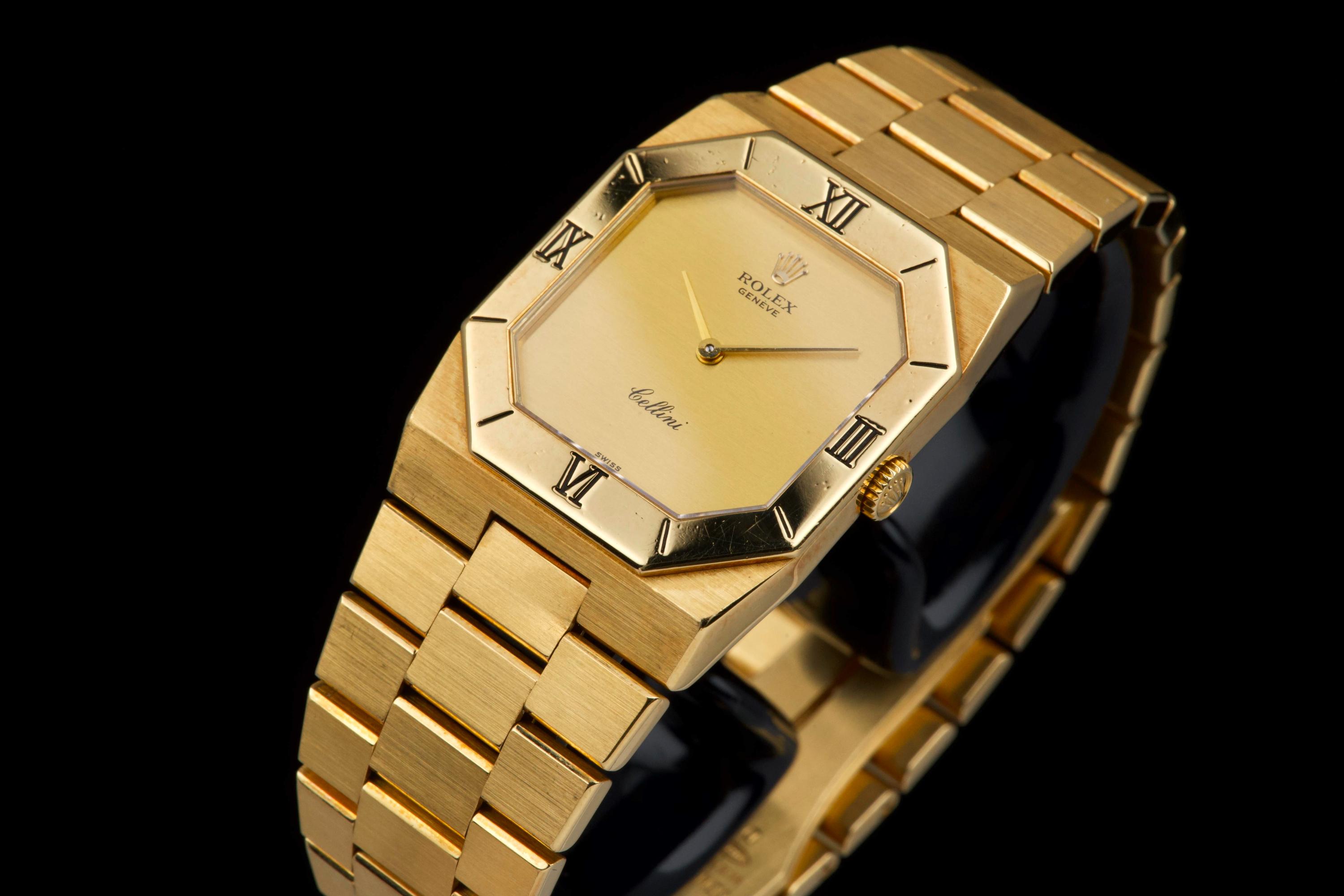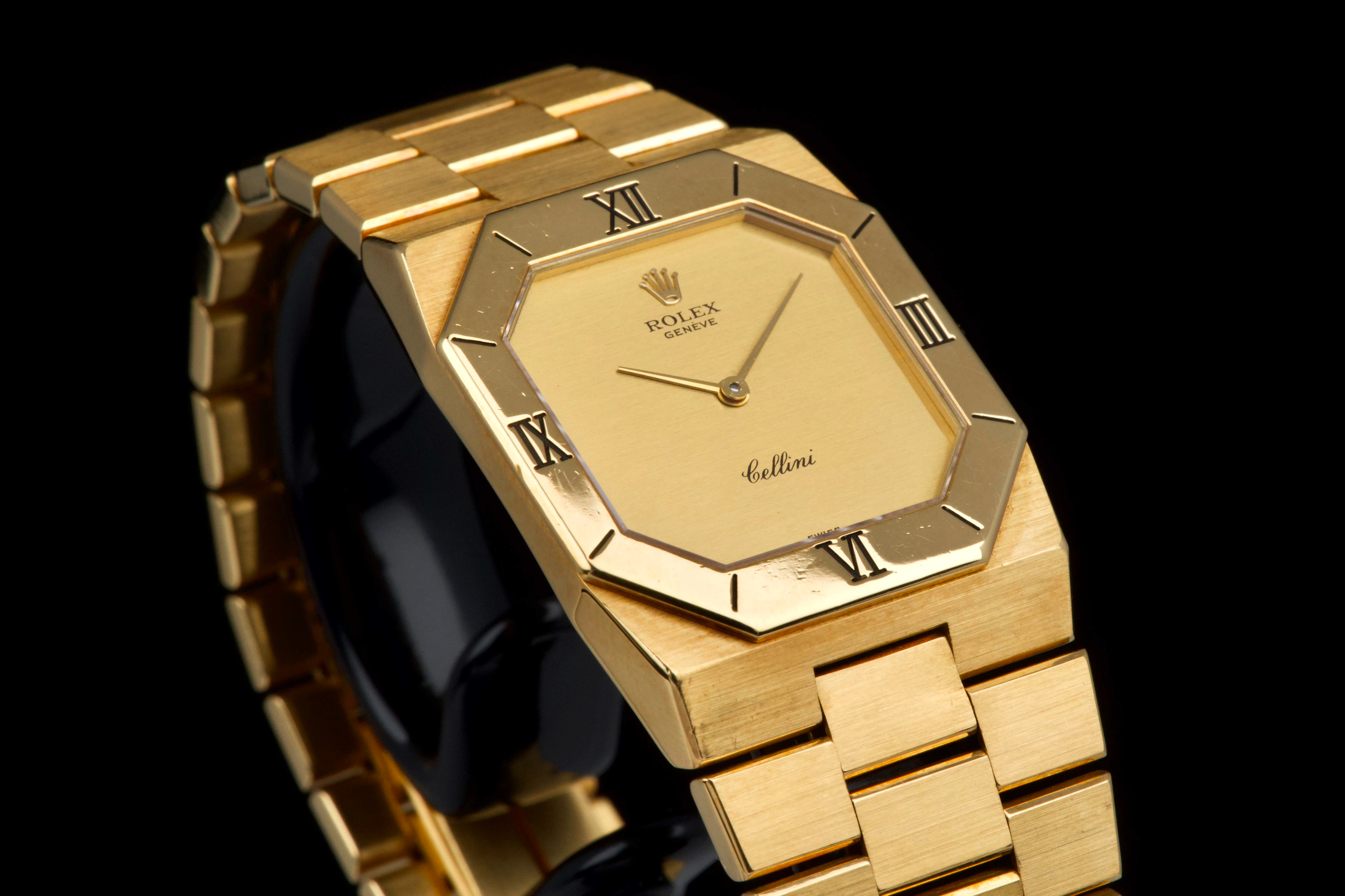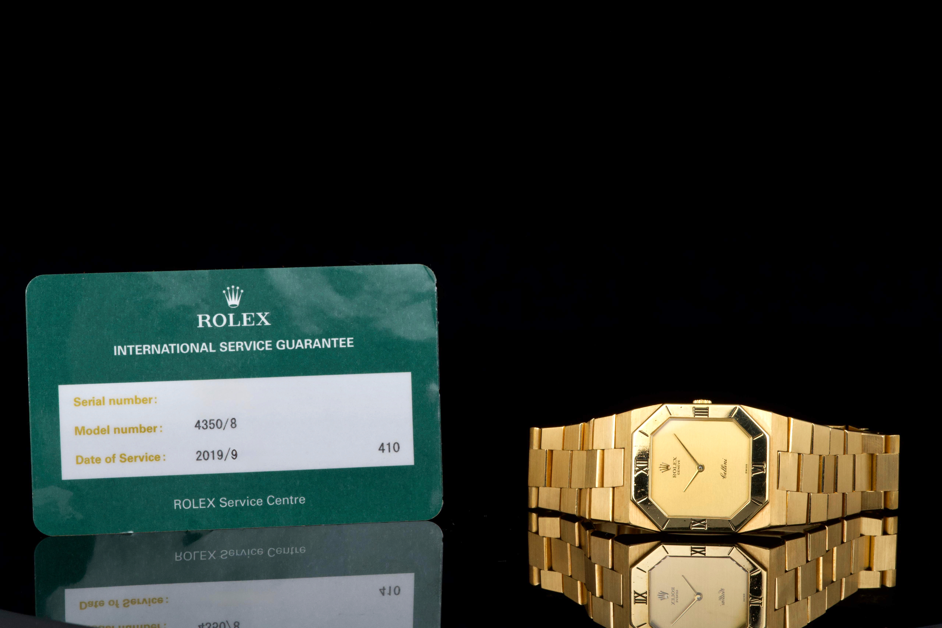 An elegant vintage Rolex Cellini reference 4350/8 in 18k yellow gold, dating to approximately 1981 (serial 69*****). This refined dress watch embodies the understated and classic aesthetic of the Cellini line. The case and bezel show visible wear, including light scratches and small marks, fully consistent with the age of the watch and adding to its vintage character. The watch has not been recently refinished. The champagne dial is in perfect condition, clean and well preserved, offering a timeless and minimalist look. Powered by a manual-winding movement, the watch has been maintained and comes with a Rolex service card dated 2019, providing reassurance regarding its functionality. The watch is fitted with its original bracelet, showing some stretch as expected for its age, and completed by a clasp stamped D. A charming and honest vintage Cellini in yellow gold, combining classic Rolex elegance with a well-preserved dial and desirable vintage appeal.