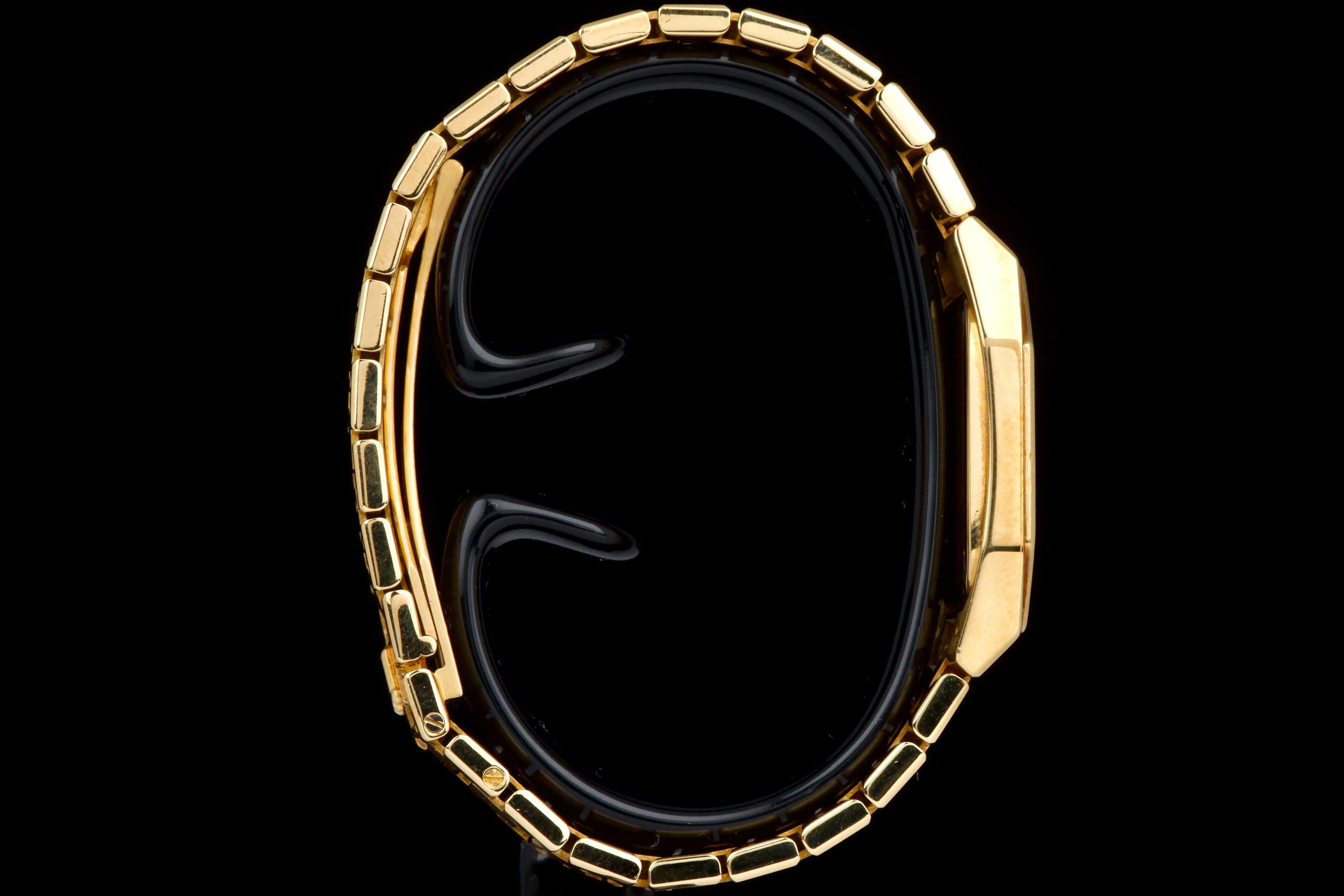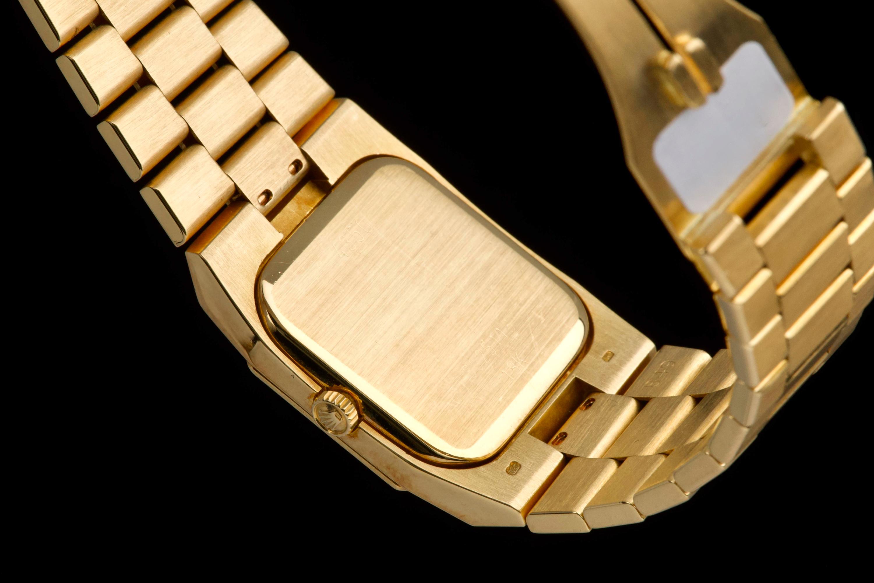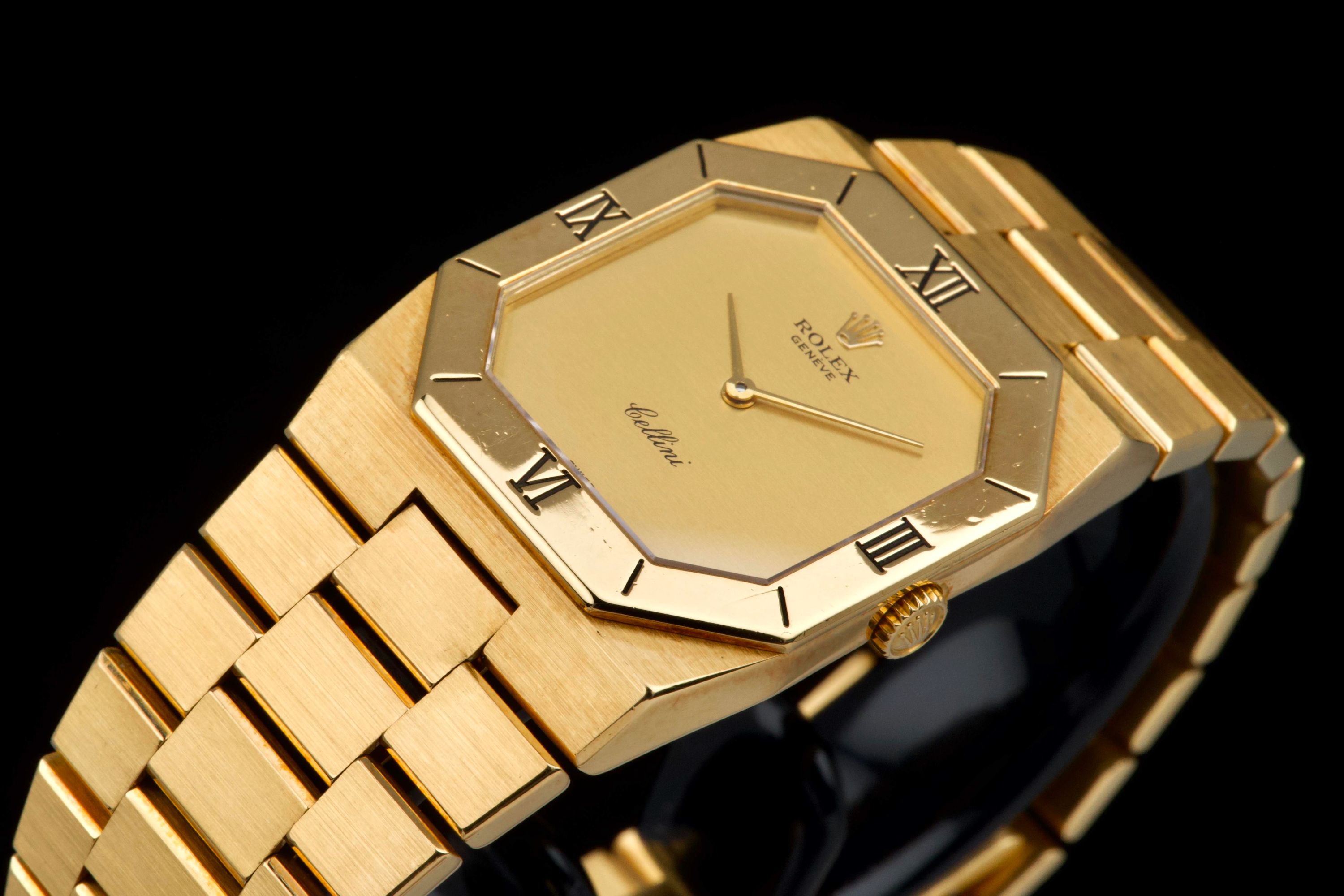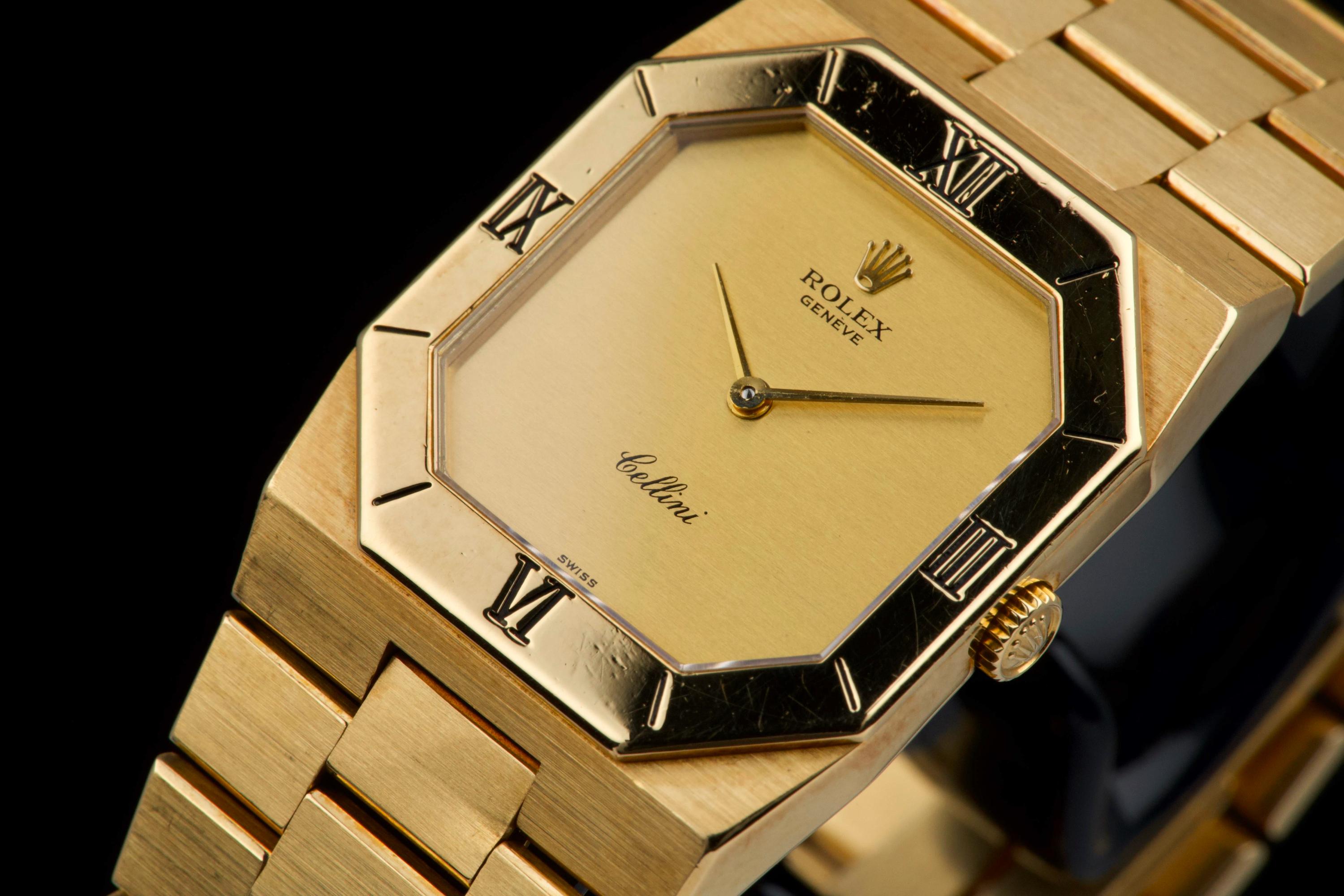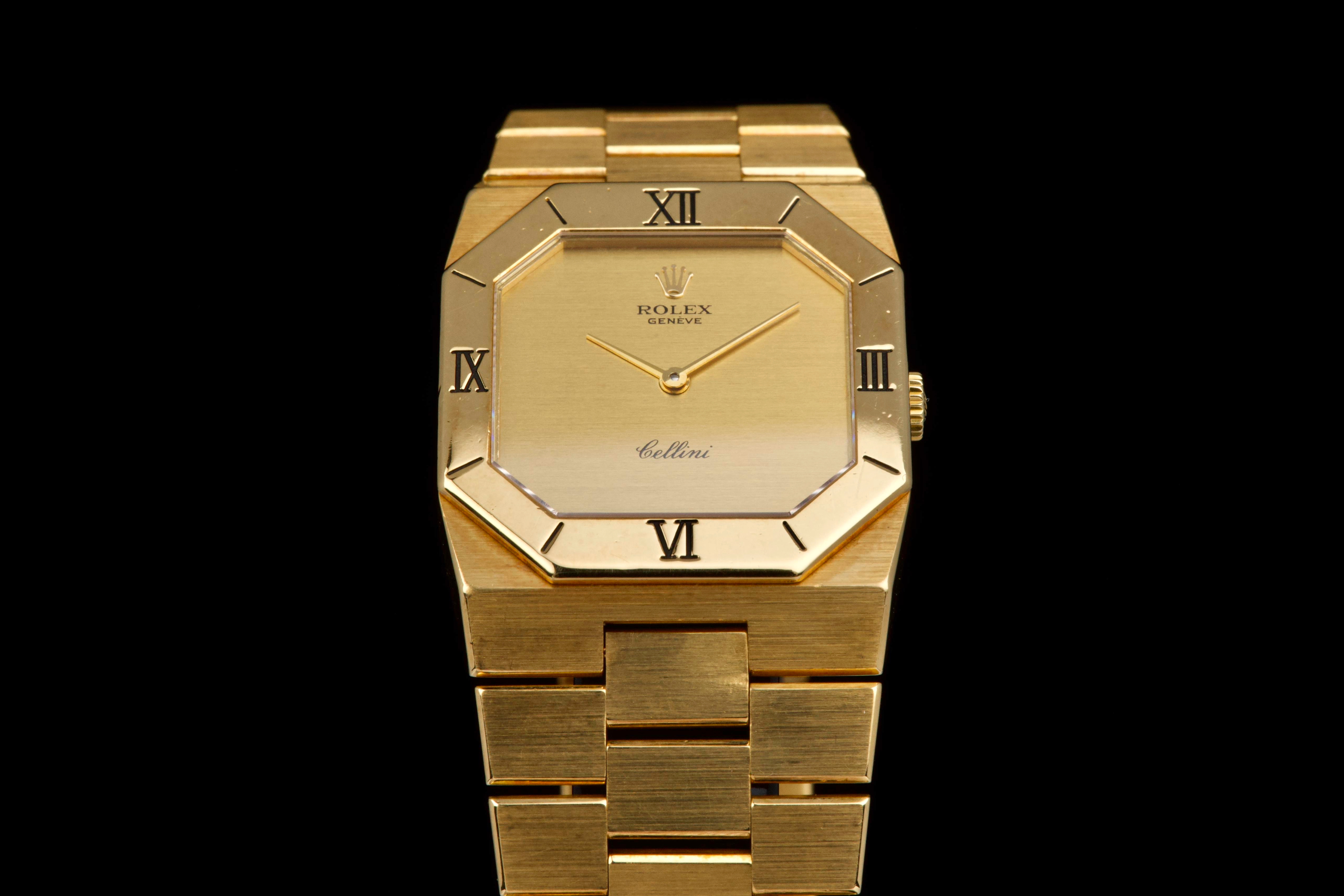 An elegant vintage Rolex Cellini reference 4350/8 in 18k yellow gold, dating to approximately 1981 (serial 69*****). This refined dress watch embodies the understated and classic aesthetic of the Cellini line. The case and bezel show visible wear, including light scratches and small marks, fully consistent with the age of the watch and adding to its vintage character. The watch has not been recently refinished. The champagne dial is in perfect condition, clean and well preserved, offering a timeless and minimalist look. Powered by a manual-winding movement, the watch has been maintained and comes with a Rolex service card dated 2019, providing reassurance regarding its functionality. The watch is fitted with its original bracelet, showing some stretch as expected for its age, and completed by a clasp stamped D. A charming and honest vintage Cellini in yellow gold, combining classic Rolex elegance with a well-preserved dial and desirable vintage appeal.