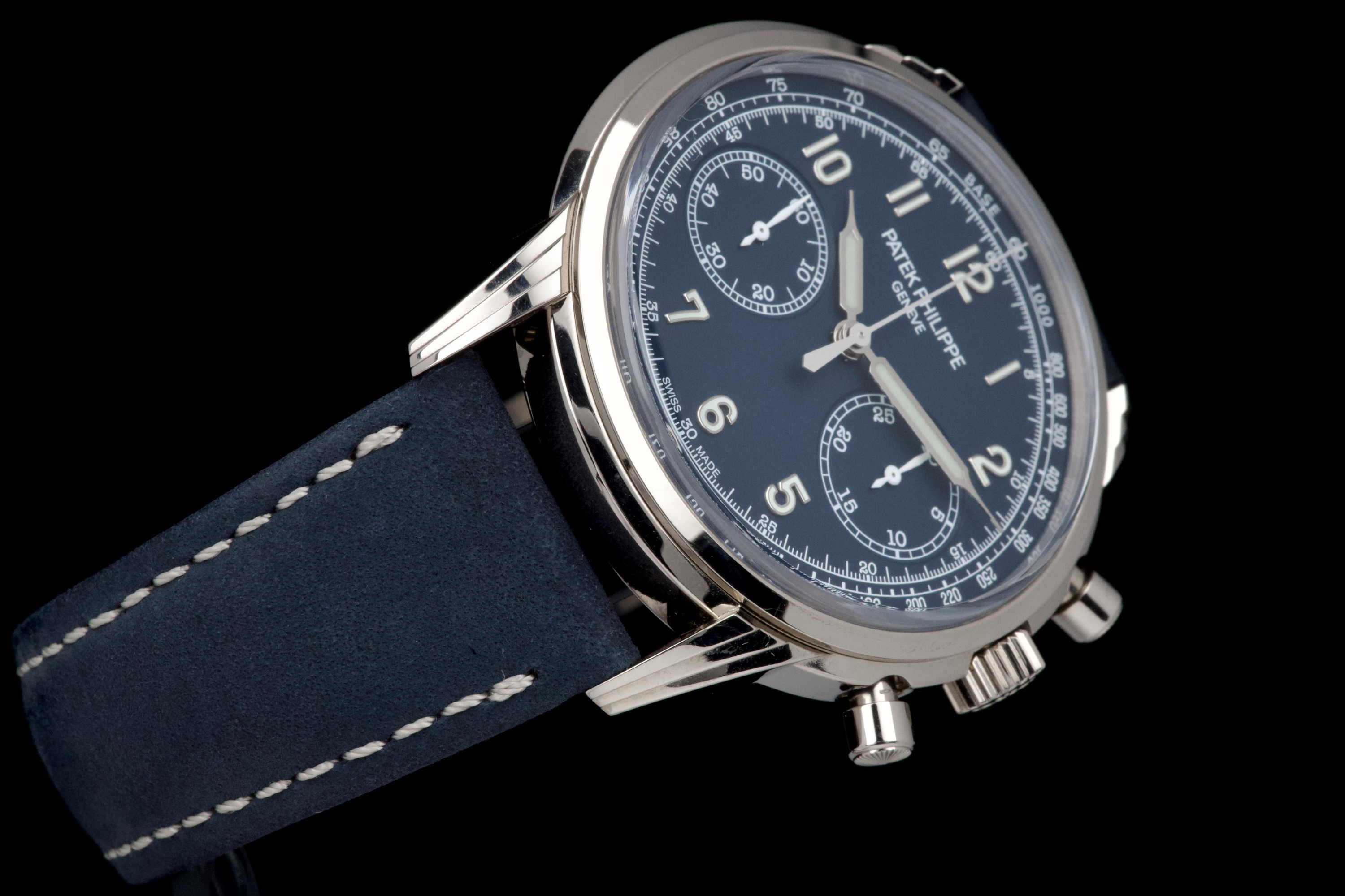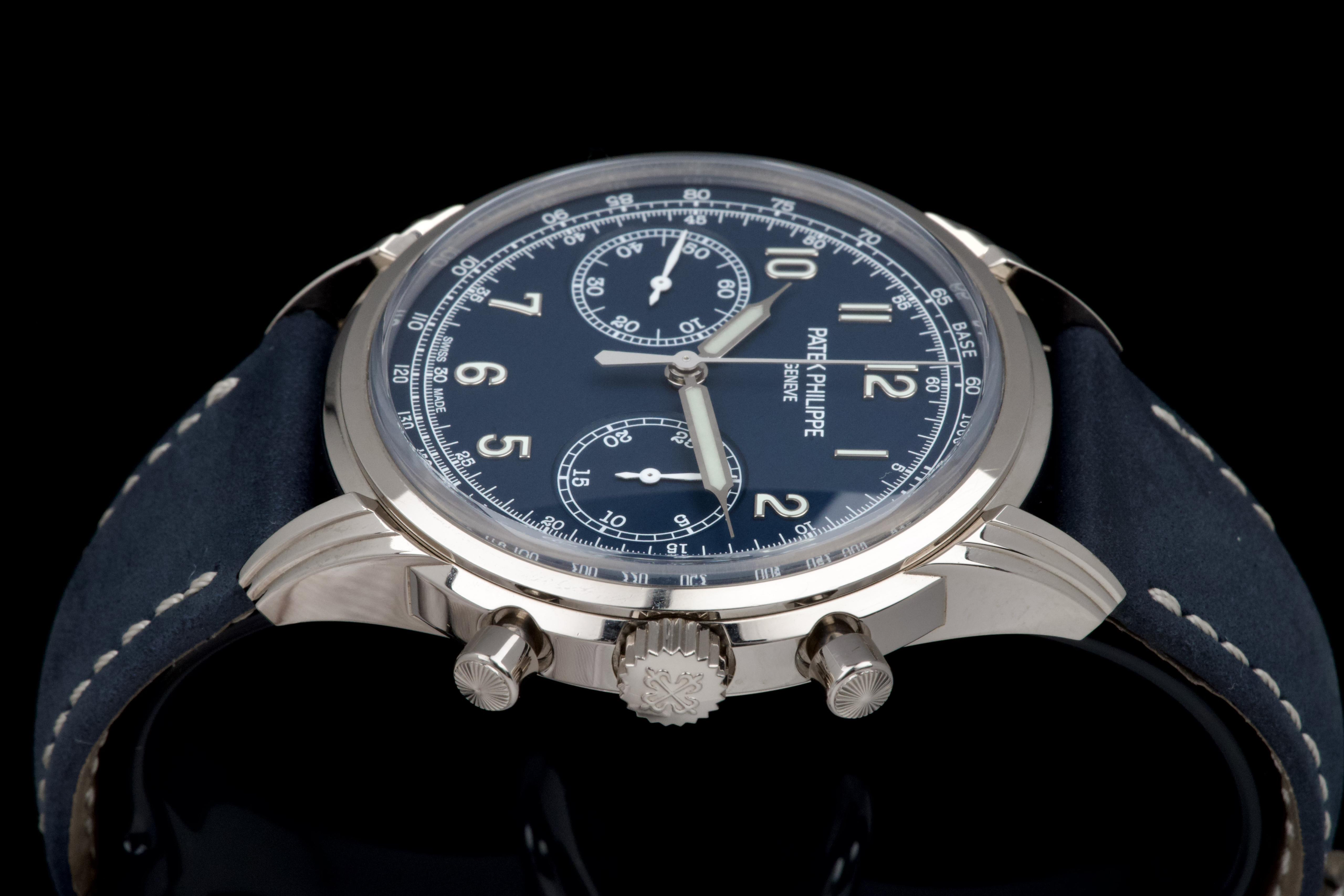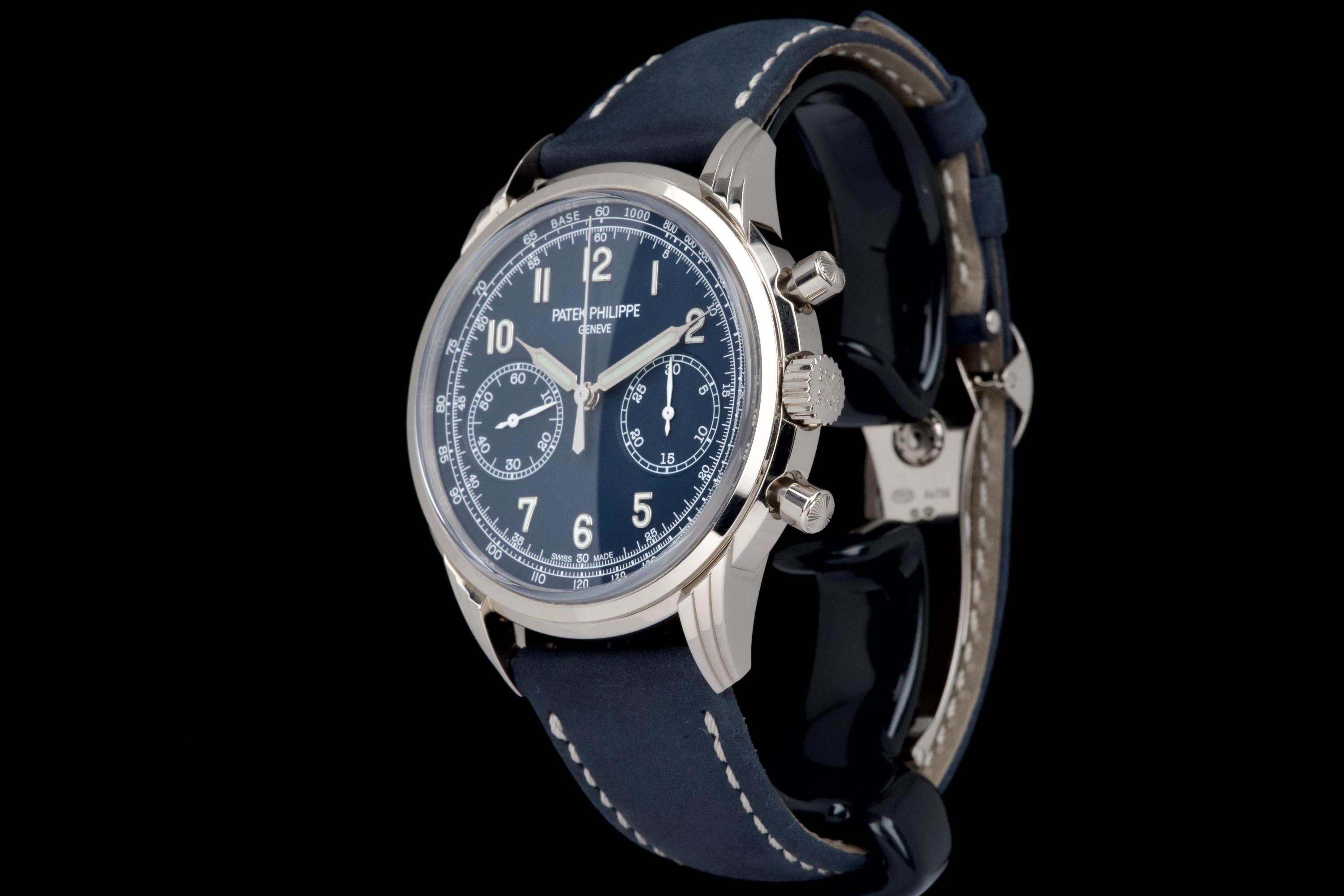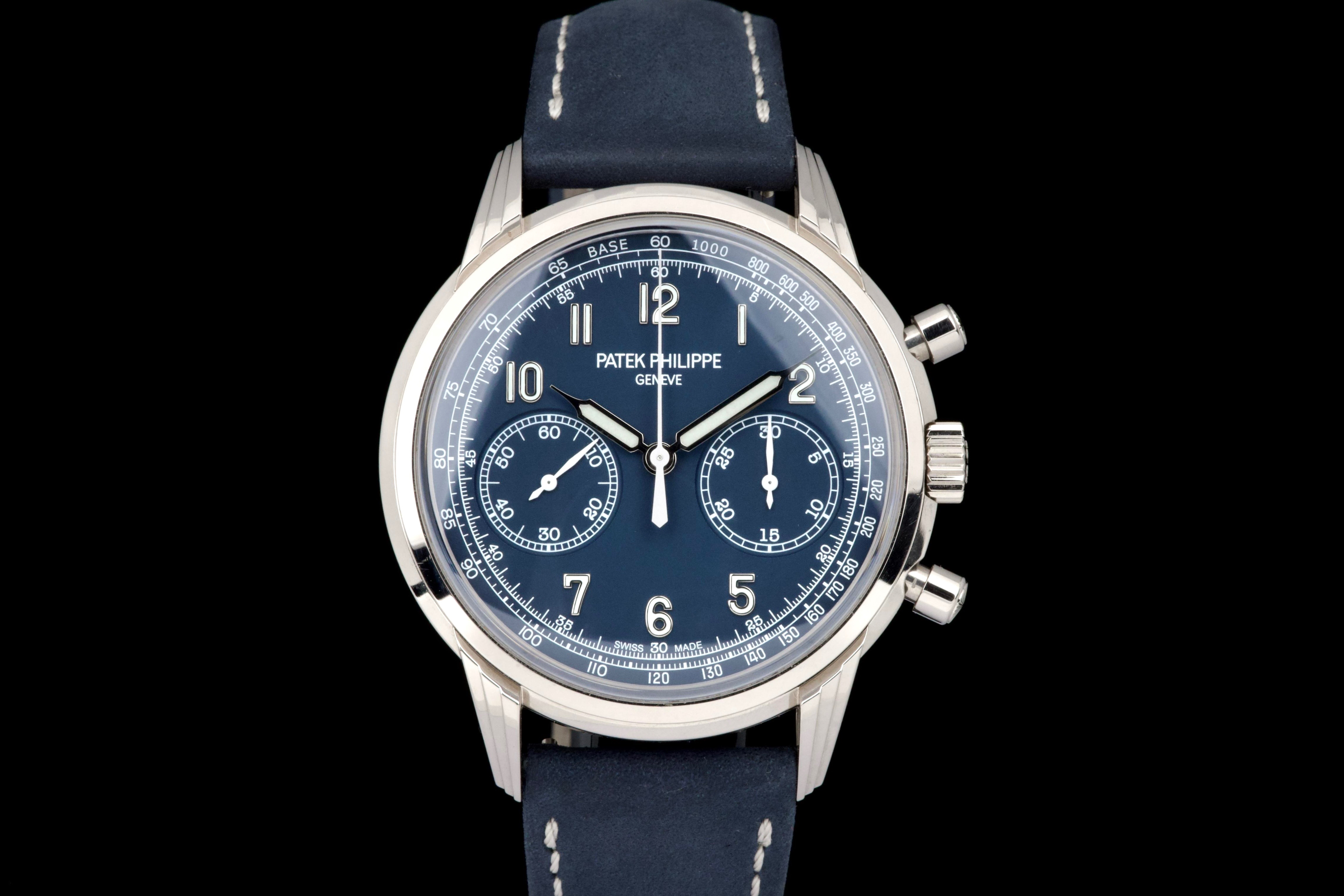 The present Patek Philippe Chronograph reference 5172G-001, featuring the highly desirable blue dial, dates to 2023 and is offered here as a complete full set. The watch has remained in the possession of a single owner since new and is preserved in near-new condition. It has never been polished and retains crisp, well-defined case edges, with only the slightest signs of handling consistent with extremely careful wear. The blue dial is particularly attractive, combining a rich sunburst finish with applied white gold Arabic numerals and syringe-style hands, offering a refined yet sporty aesthetic. The layout, with its twin chronograph subdials and tachymeter scale, ensures both excellent legibility and visual balance, in line with Patek Philippe’s modern chronograph design language. The 41 mm white gold case, with its vintage-inspired stepped lugs and concave bezel, further enhances the character of the model, blending classical inspiration with contemporary proportions. Powered by the in-house manual-winding calibre CH 29-535 PS, the watch represents the pinnacle of Patek Philippe’s chronograph expertise, combining traditional construction with advanced technical innovations for precise and reliable performance. Preserved in outstanding condition and accompanied by its full original set, this 5172G-001 represents an excellent opportunity to acquire a highly sought-after modern Patek Philippe chronograph, combining mechanical excellence, elegant design, and strong collector appeal.