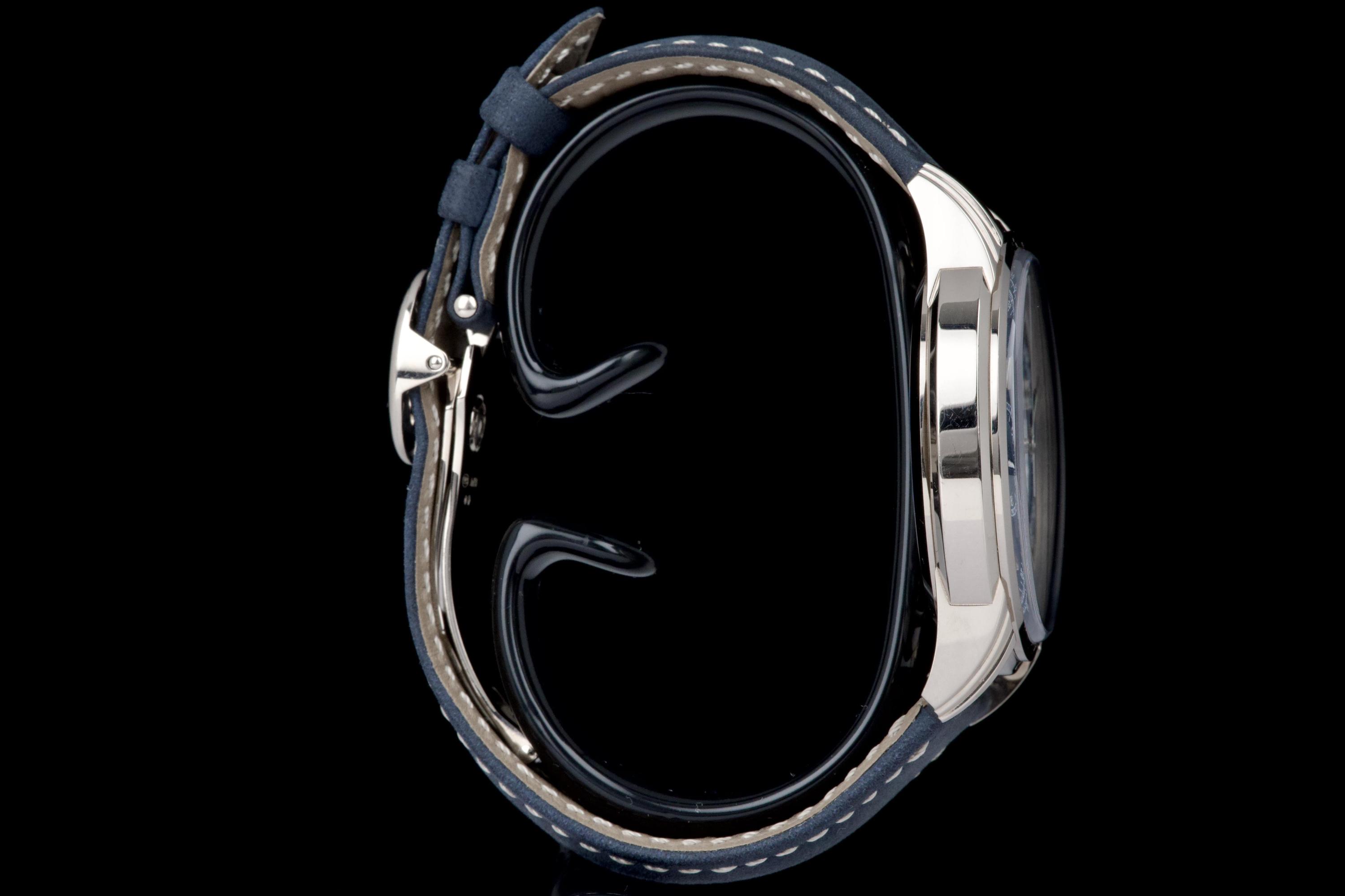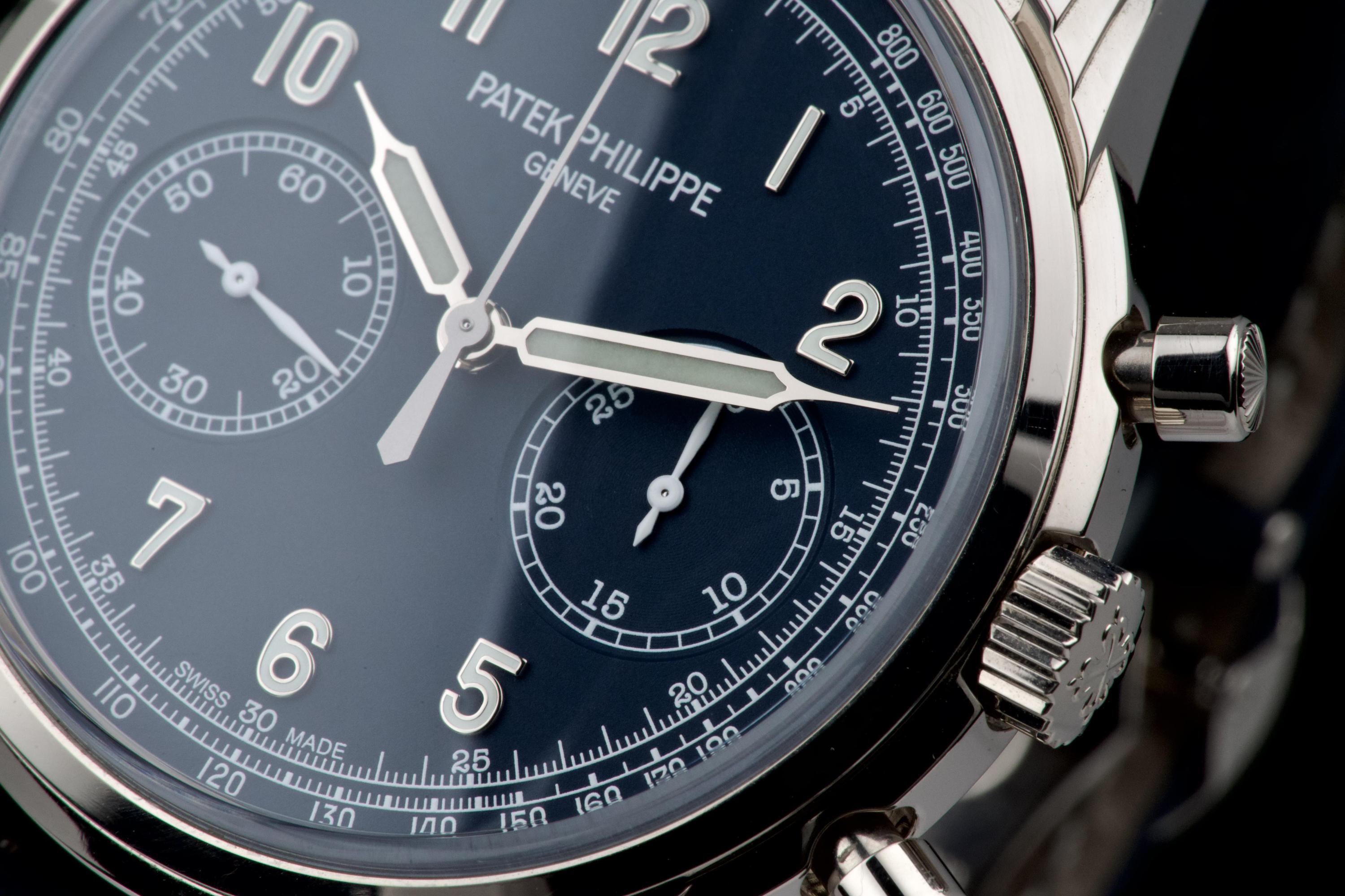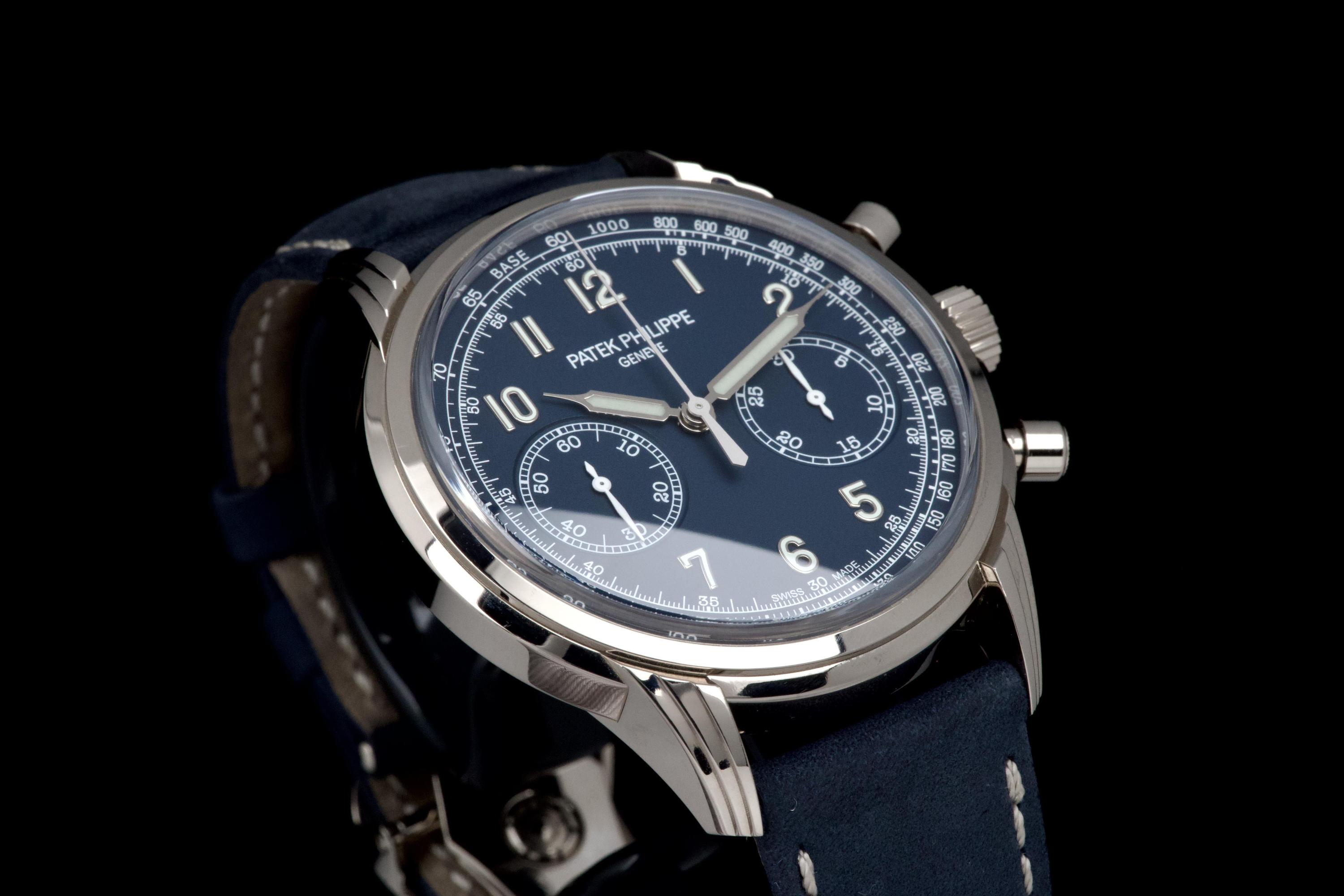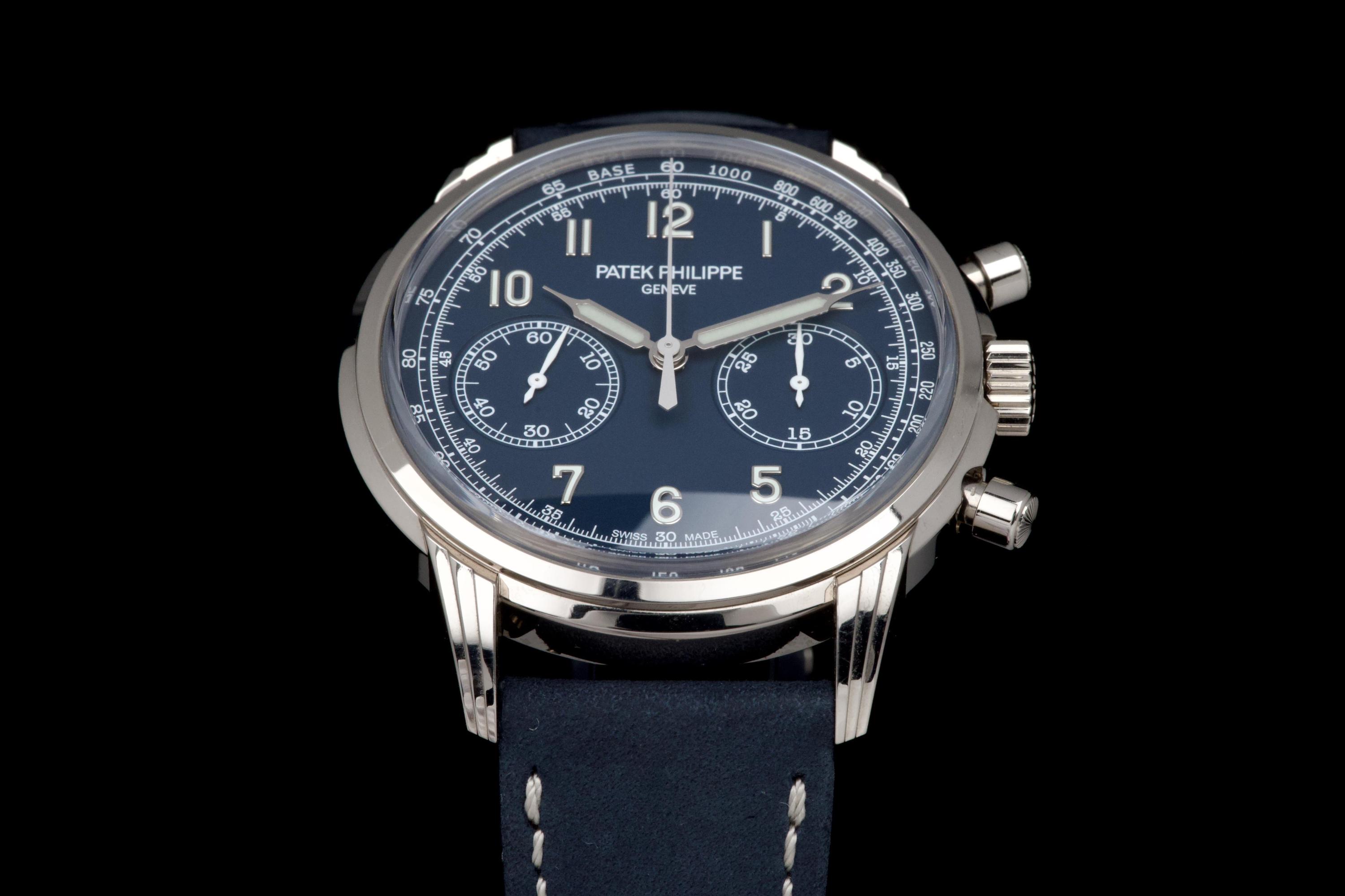 The present Patek Philippe Chronograph reference 5172G-001, featuring the highly desirable blue dial, dates to 2023 and is offered here as a complete full set. The watch has remained in the possession of a single owner since new and is preserved in near-new condition. It has never been polished and retains crisp, well-defined case edges, with only the slightest signs of handling consistent with extremely careful wear. The blue dial is particularly attractive, combining a rich sunburst finish with applied white gold Arabic numerals and syringe-style hands, offering a refined yet sporty aesthetic. The layout, with its twin chronograph subdials and tachymeter scale, ensures both excellent legibility and visual balance, in line with Patek Philippe’s modern chronograph design language. The 41 mm white gold case, with its vintage-inspired stepped lugs and concave bezel, further enhances the character of the model, blending classical inspiration with contemporary proportions. Powered by the in-house manual-winding calibre CH 29-535 PS, the watch represents the pinnacle of Patek Philippe’s chronograph expertise, combining traditional construction with advanced technical innovations for precise and reliable performance. Preserved in outstanding condition and accompanied by its full original set, this 5172G-001 represents an excellent opportunity to acquire a highly sought-after modern Patek Philippe chronograph, combining mechanical excellence, elegant design, and strong collector appeal.
