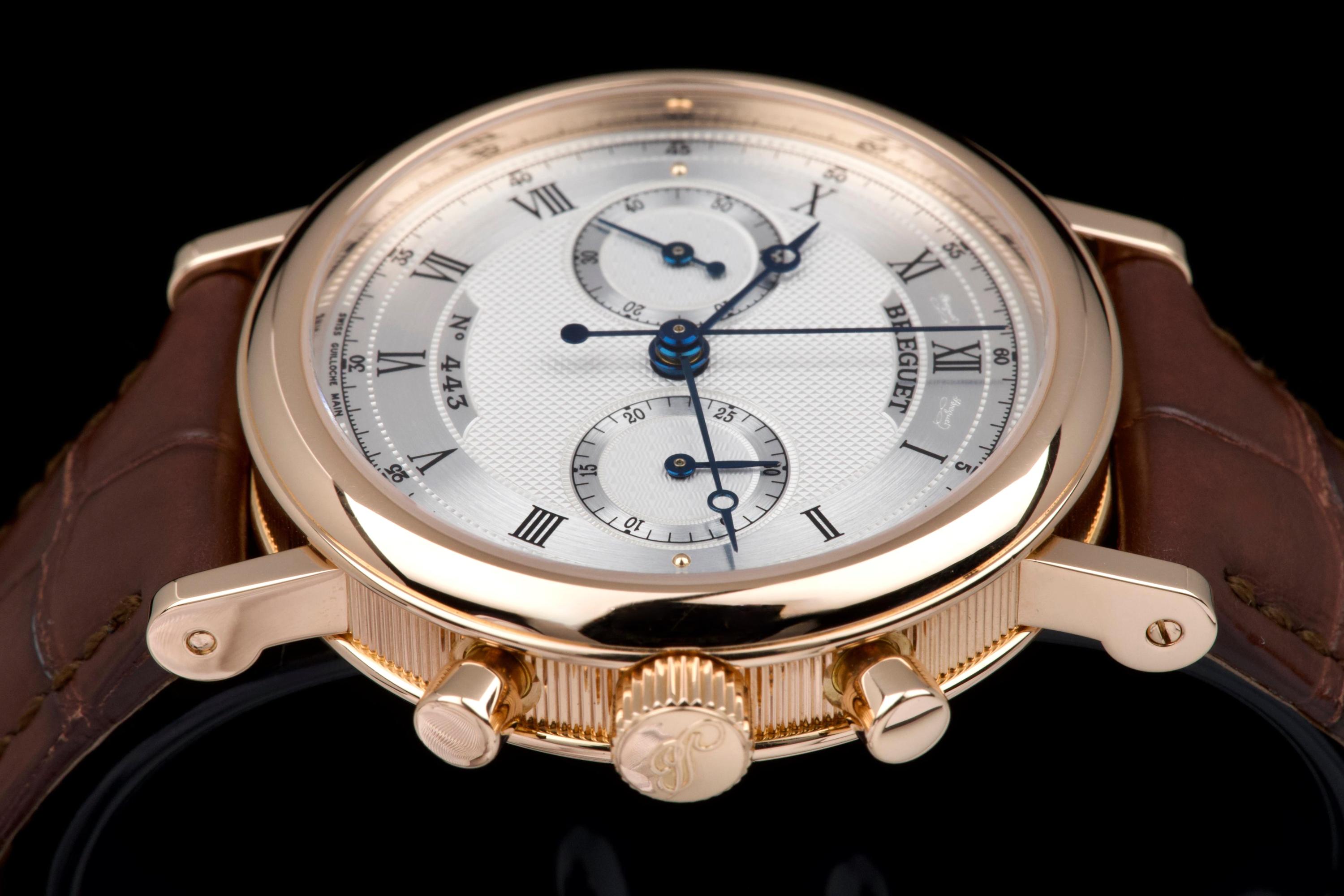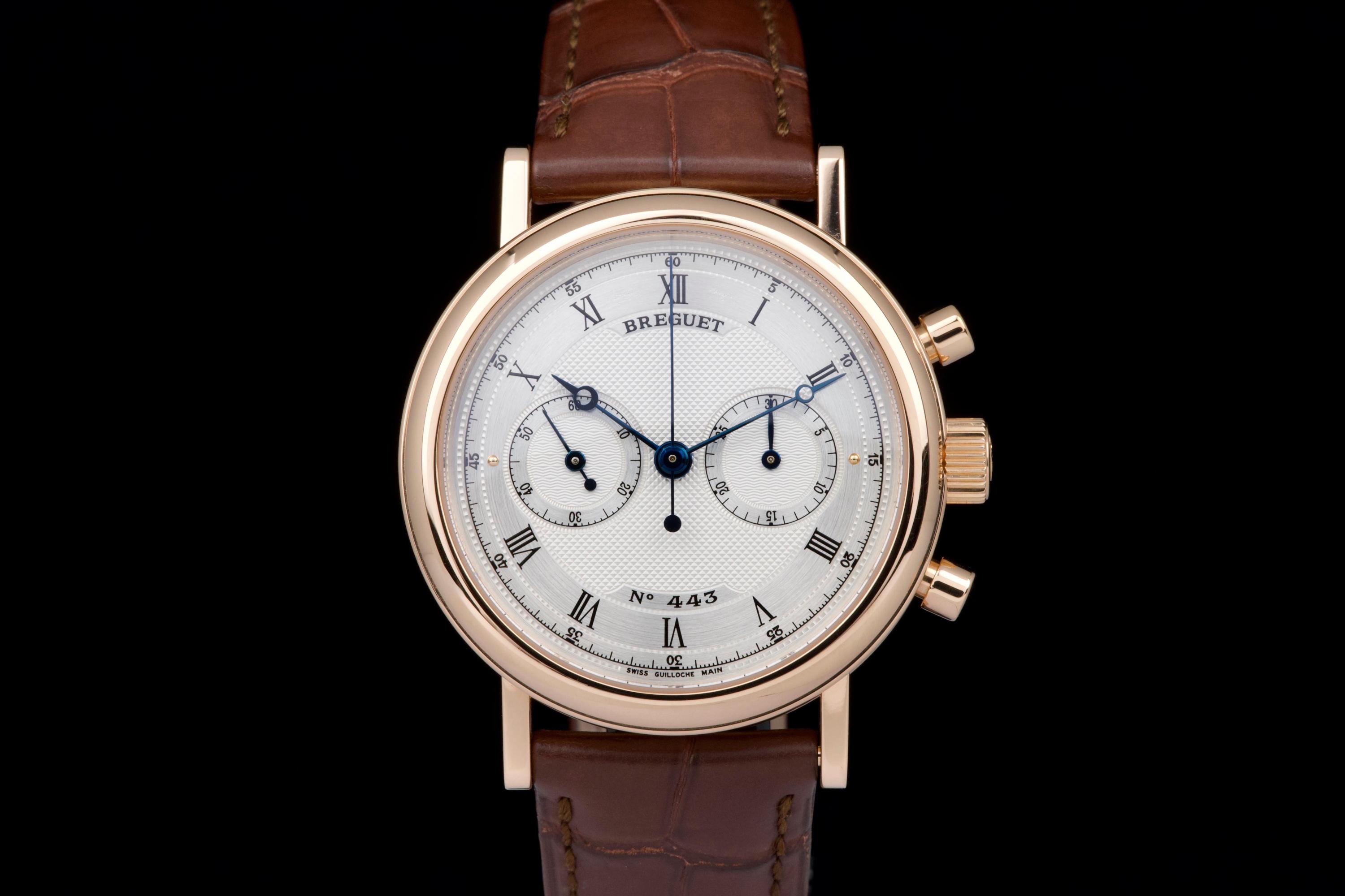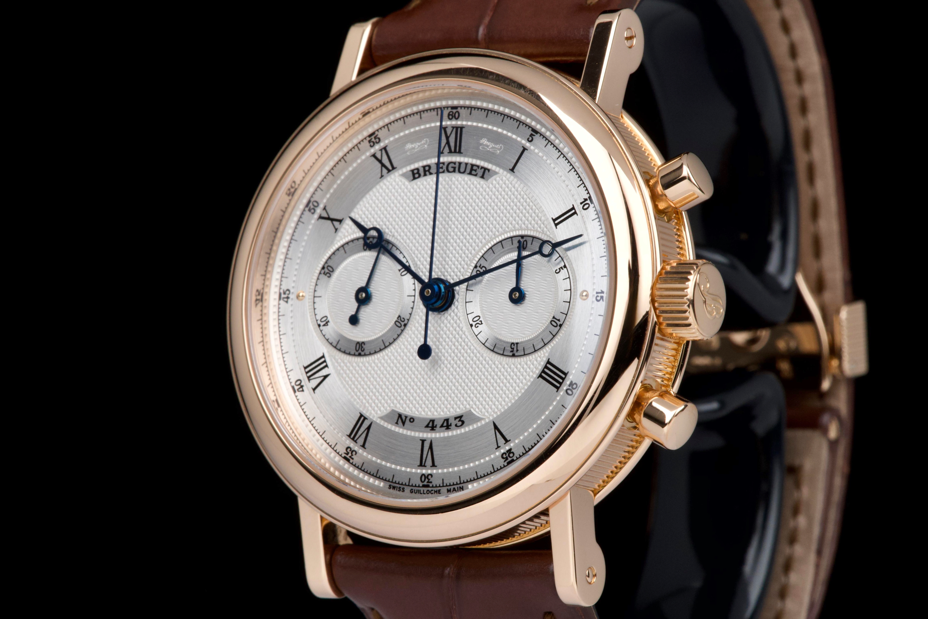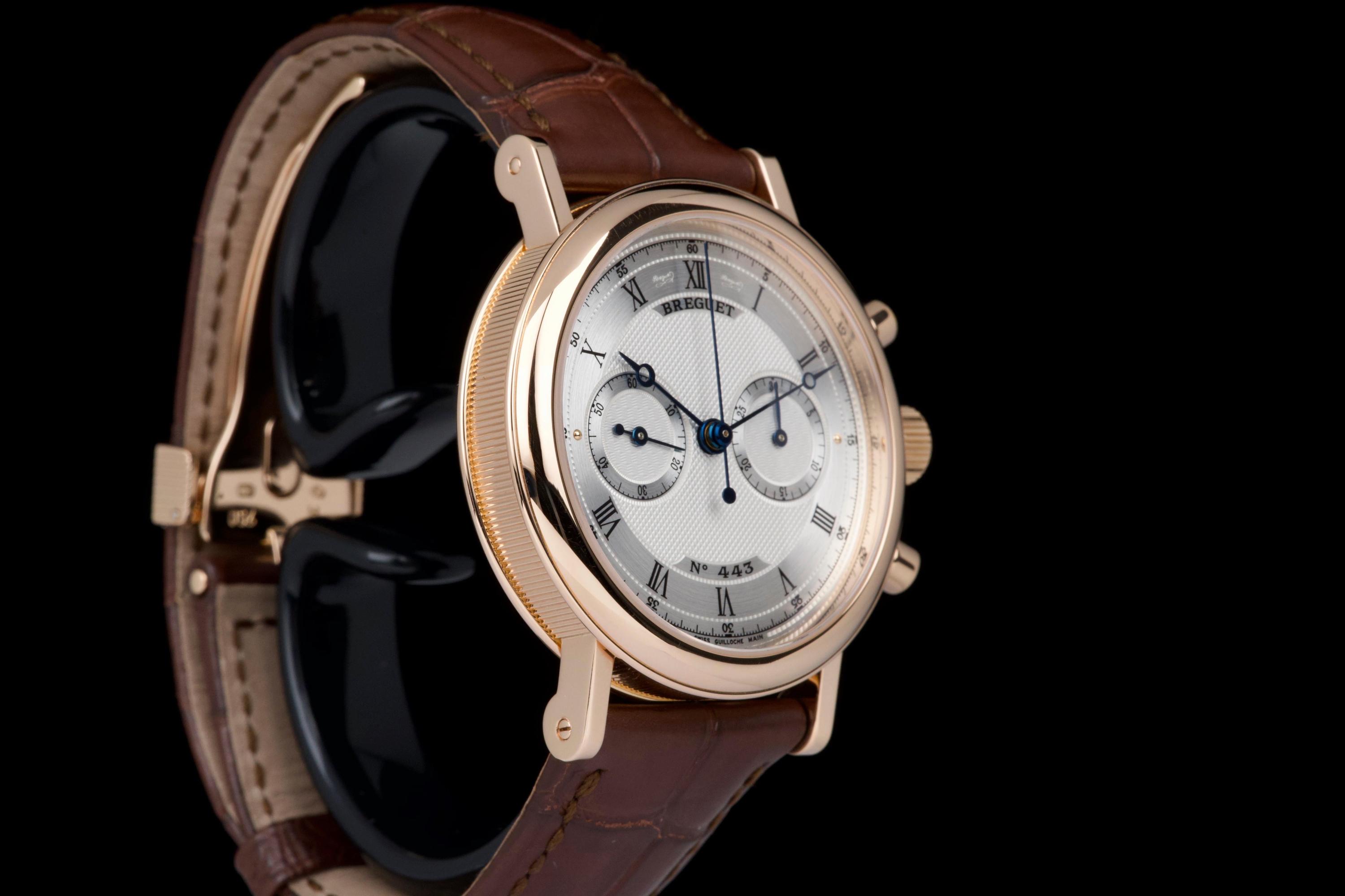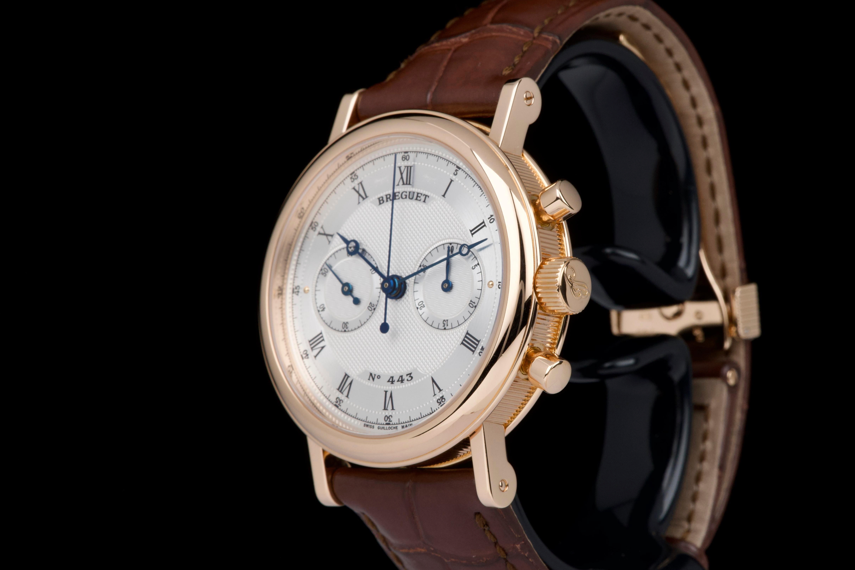 Presented here is an elegant and refined example of the Breguet Classique Chronograph reference 5327BR, crafted in rose gold and dating to circa 2003. This model perfectly illustrates the timeless aesthetic codes of Breguet, the historic manufacture founded by Abraham-Louis Breguet, widely regarded as one of the greatest watchmakers in history and often credited with advancing horology by centuries through his groundbreaking innovations. The 37 mm rose gold case features the traditional Breguet design elements, including the finely fluted caseband and the beautifully guilloché silver dial, offering exceptional depth and classical elegance. The dial remains clean and highly legible, showcasing the refined craftsmanship for which the Maison is renowned. The watch has been recently polished and presents in very good overall condition. Through the sapphire display caseback, one can admire the celebrated Lemania-based manual-winding chronograph movement, known for its reliability and traditional architecture. While there is no recorded service history, the watch is in perfect working order. It is fitted with a brown crocodile strap, complementing the warm tone of the rose gold case. A refined and relatively uncommon Breguet chronograph, combining classical aesthetics, historical significance, and the charm of traditional mechanical watchmaking.
