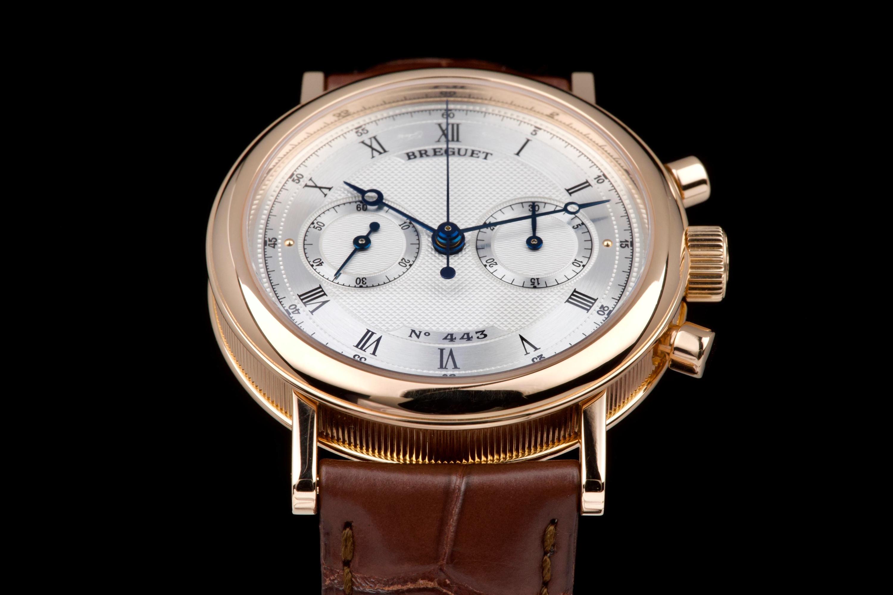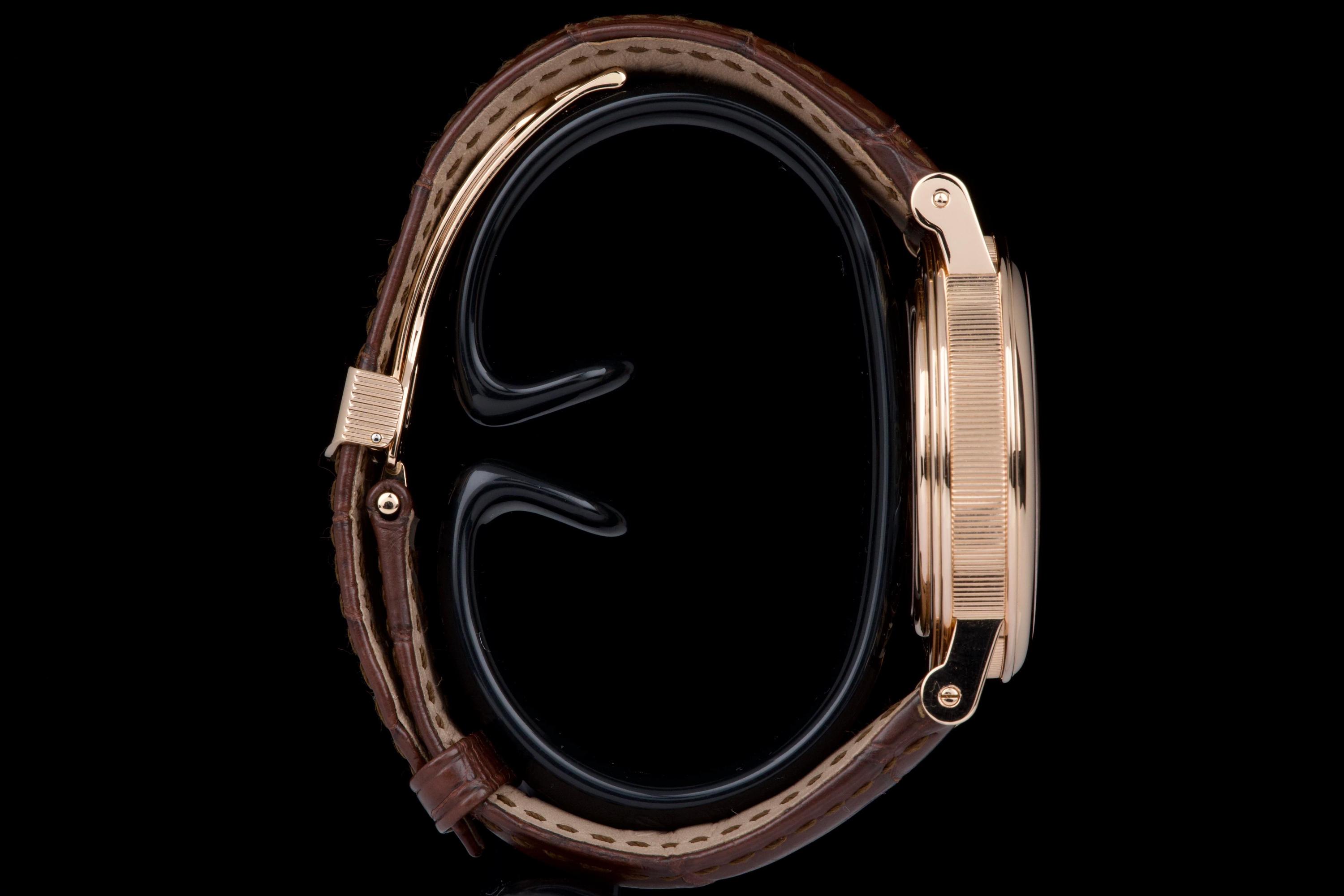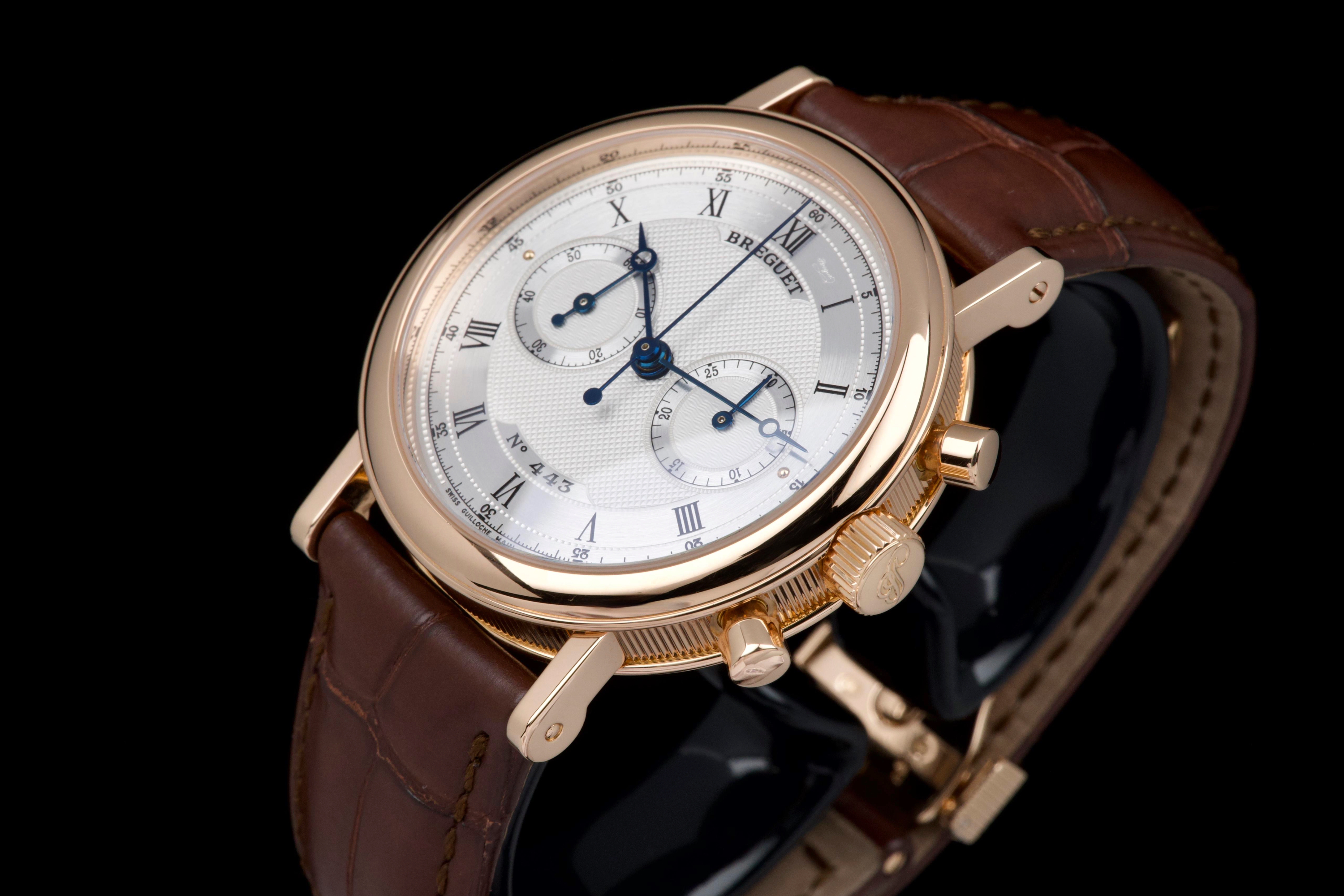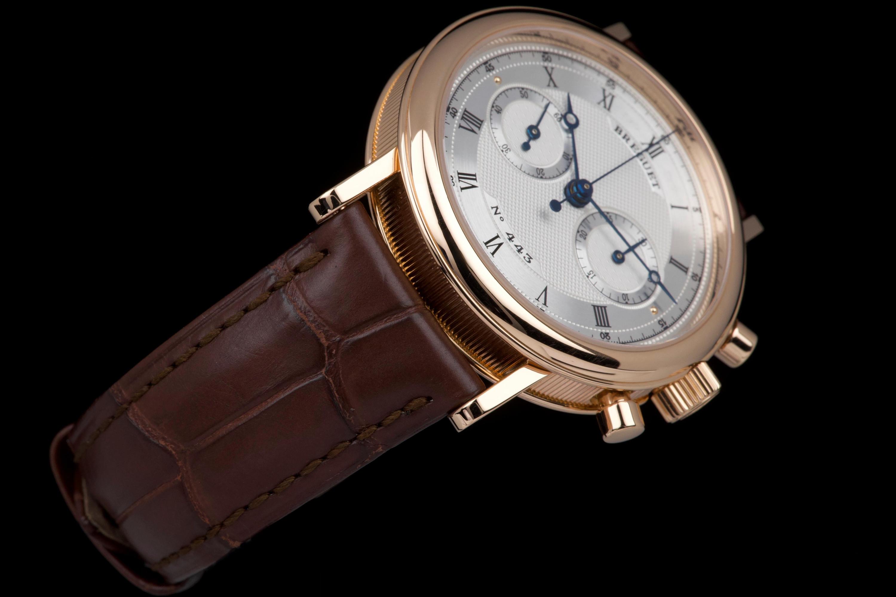 Presented here is an elegant and refined example of the Breguet Classique Chronograph reference 5327BR, crafted in rose gold and dating to circa 2003. This model perfectly illustrates the timeless aesthetic codes of Breguet, the historic manufacture founded by Abraham-Louis Breguet, widely regarded as one of the greatest watchmakers in history and often credited with advancing horology by centuries through his groundbreaking innovations. The 37 mm rose gold case features the traditional Breguet design elements, including the finely fluted caseband and the beautifully guilloché silver dial, offering exceptional depth and classical elegance. The dial remains clean and highly legible, showcasing the refined craftsmanship for which the Maison is renowned. The watch has been recently polished and presents in very good overall condition. Through the sapphire display caseback, one can admire the celebrated Lemania-based manual-winding chronograph movement, known for its reliability and traditional architecture. While there is no recorded service history, the watch is in perfect working order. It is fitted with a brown crocodile strap, complementing the warm tone of the rose gold case. A refined and relatively uncommon Breguet chronograph, combining classical aesthetics, historical significance, and the charm of traditional mechanical watchmaking.