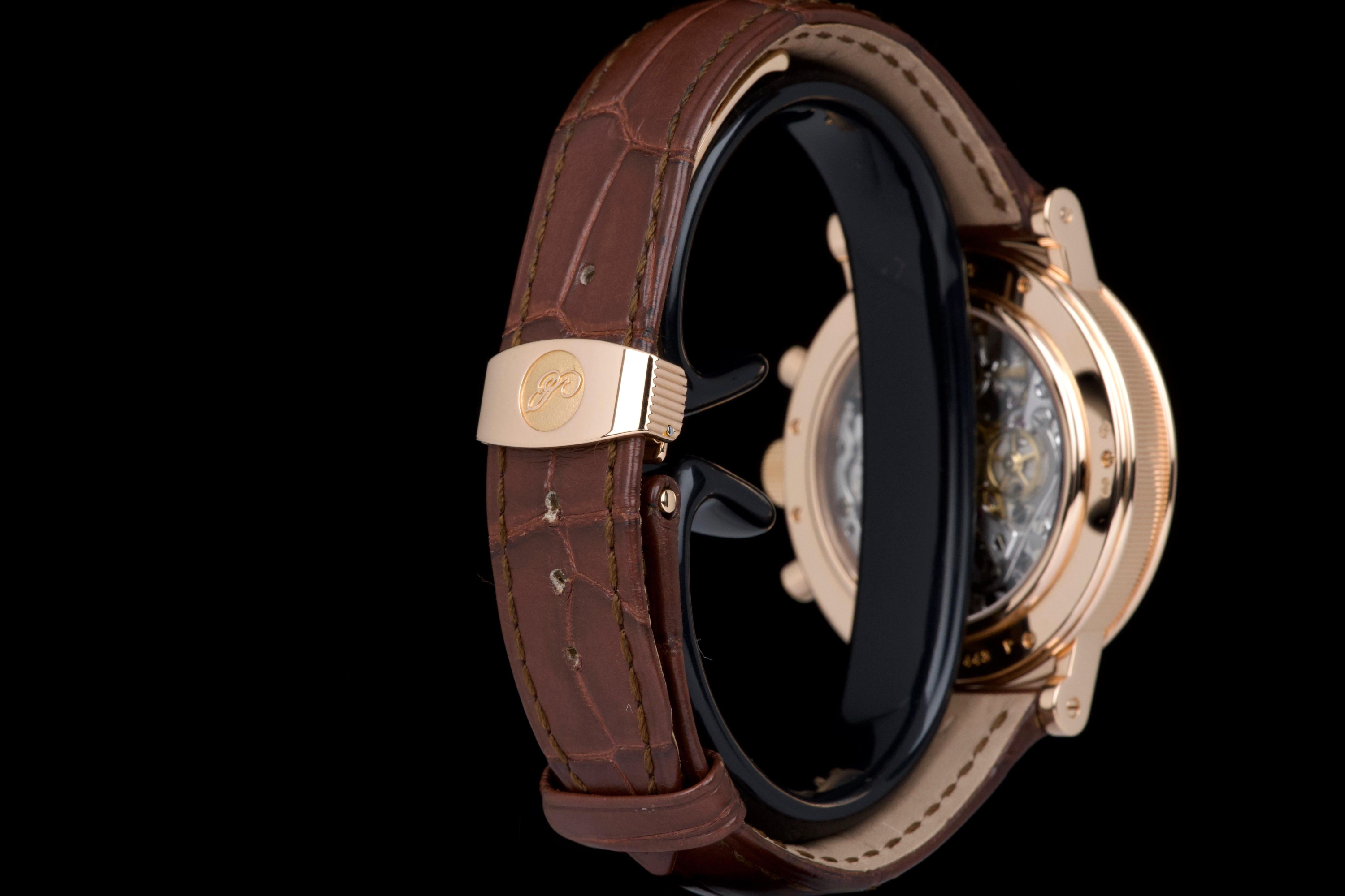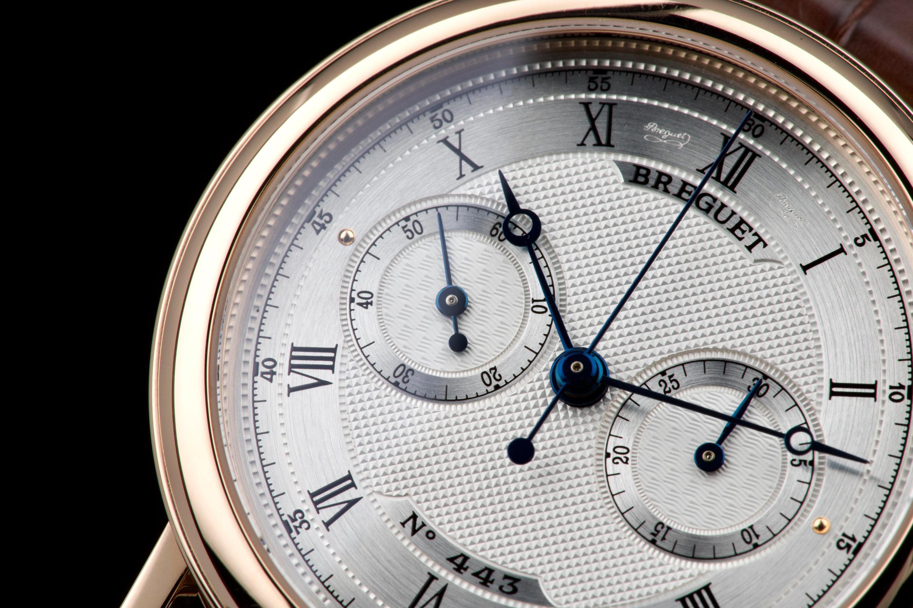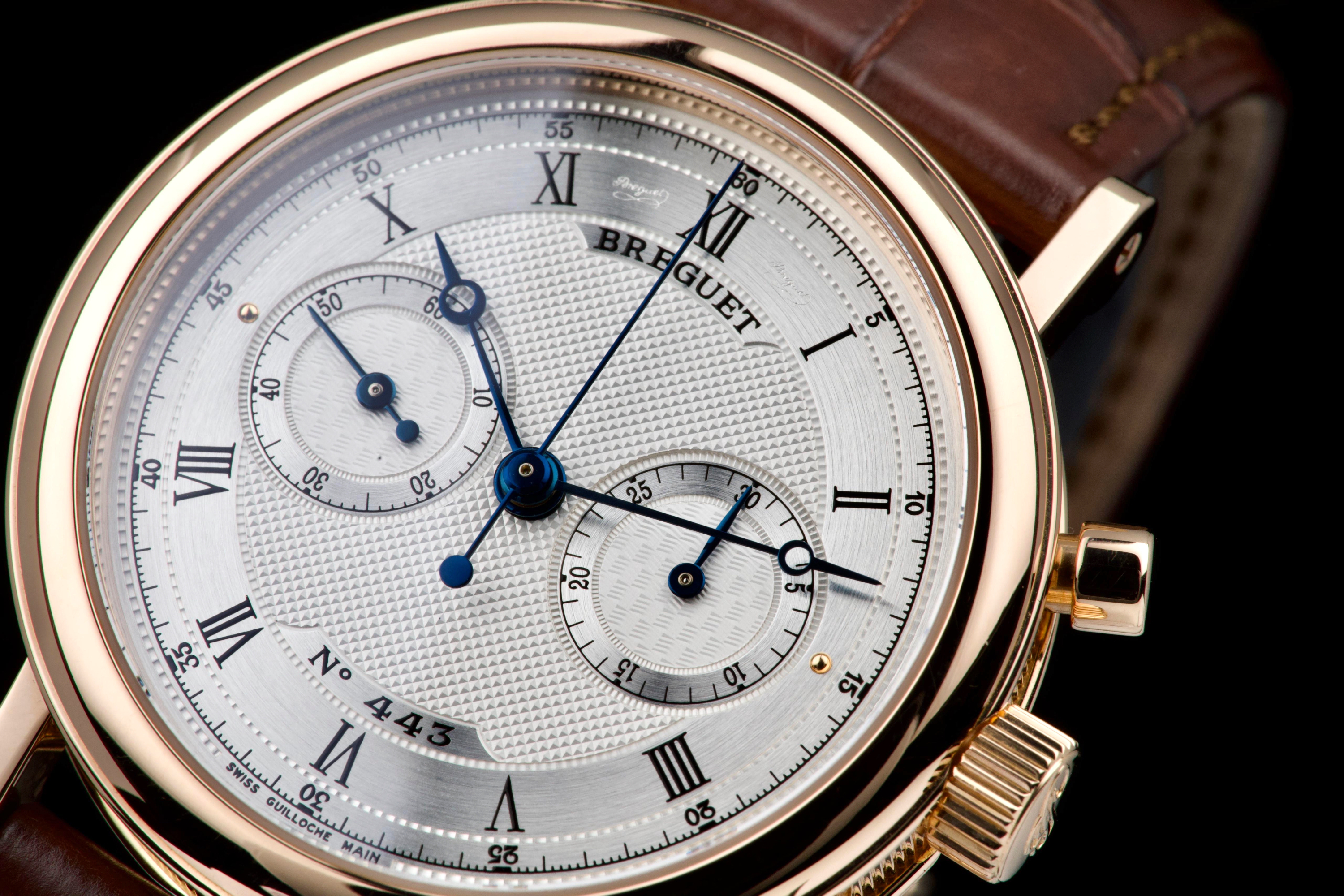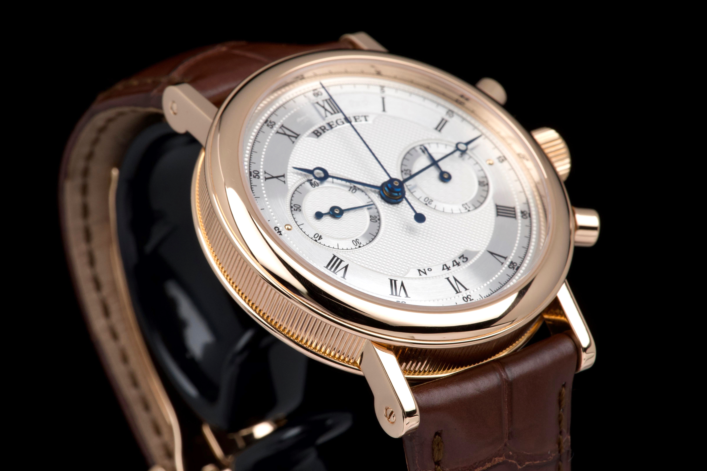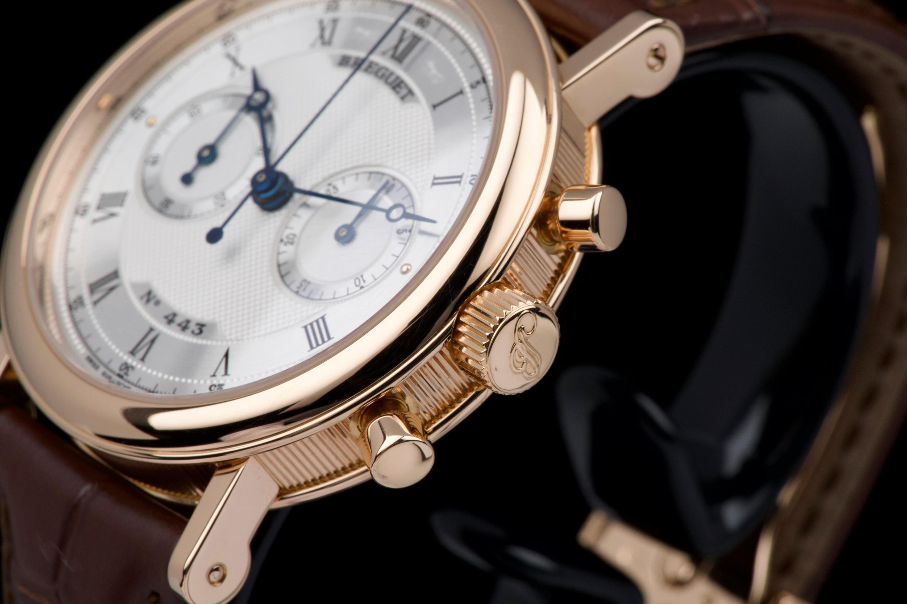 Presented here is an elegant and refined example of the Breguet Classique Chronograph reference 5327BR, crafted in rose gold and dating to circa 2003. This model perfectly illustrates the timeless aesthetic codes of Breguet, the historic manufacture founded by Abraham-Louis Breguet, widely regarded as one of the greatest watchmakers in history and often credited with advancing horology by centuries through his groundbreaking innovations. The 37 mm rose gold case features the traditional Breguet design elements, including the finely fluted caseband and the beautifully guilloché silver dial, offering exceptional depth and classical elegance. The dial remains clean and highly legible, showcasing the refined craftsmanship for which the Maison is renowned. The watch has been recently polished and presents in very good overall condition. Through the sapphire display caseback, one can admire the celebrated Lemania-based manual-winding chronograph movement, known for its reliability and traditional architecture. While there is no recorded service history, the watch is in perfect working order. It is fitted with a brown crocodile strap, complementing the warm tone of the rose gold case. A refined and relatively uncommon Breguet chronograph, combining classical aesthetics, historical significance, and the charm of traditional mechanical watchmaking.