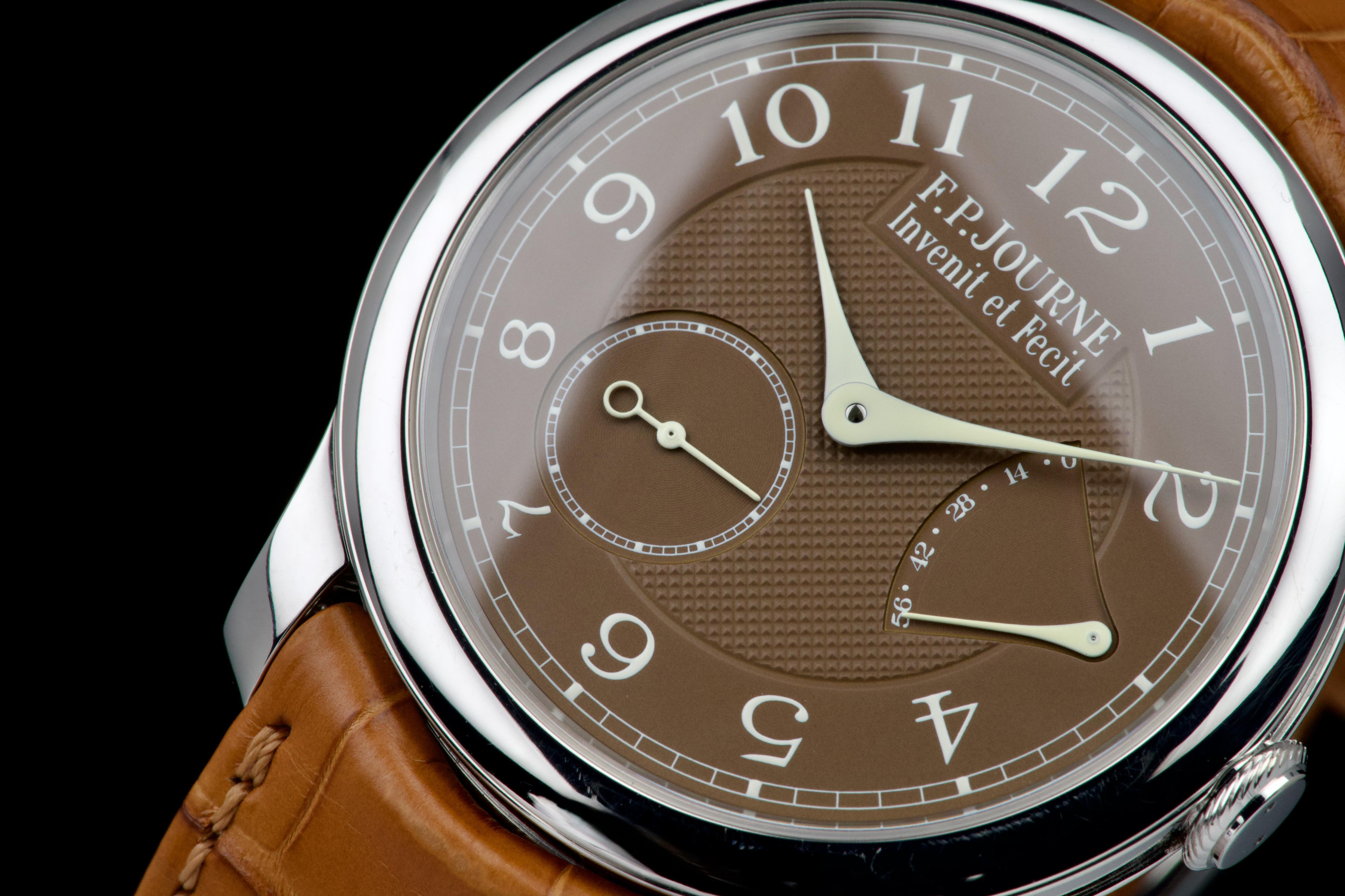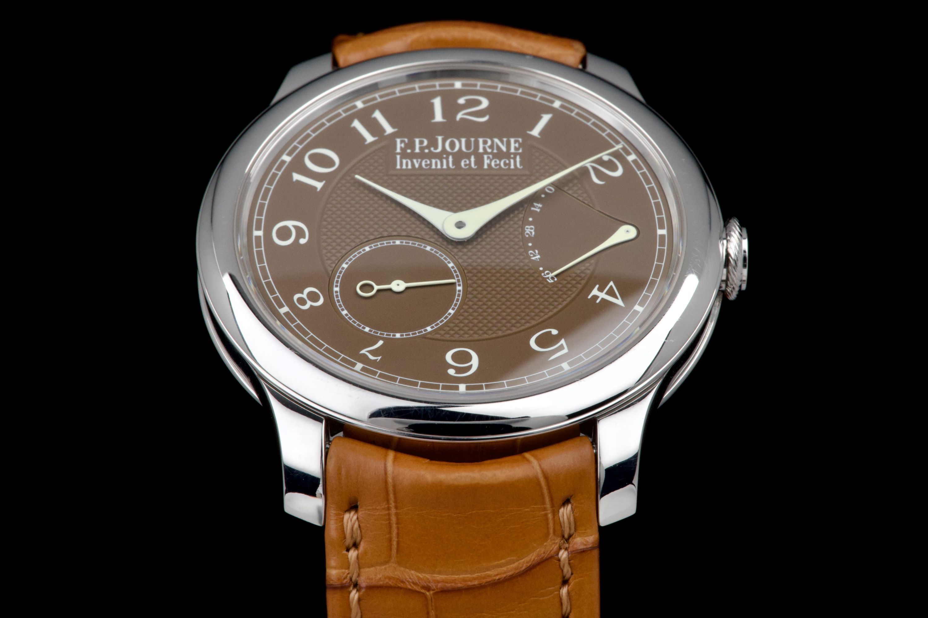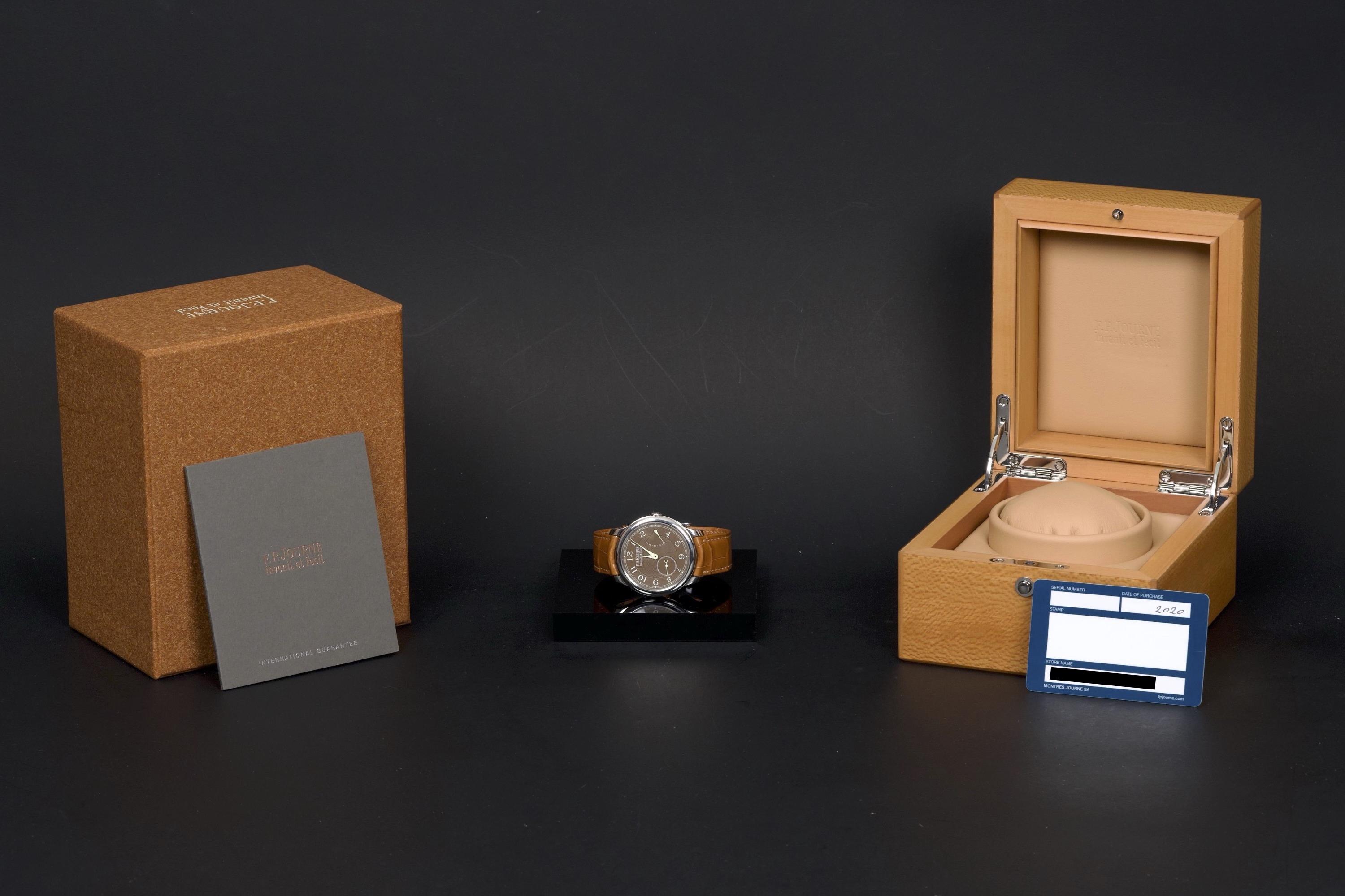 The present F.P. Journe Chronomètre Souverain Havana, dating to circa 2020, is offered here as a complete full set and represents one of the most refined expressions of the brand’s pursuit of chronometric precision. The watch has remained in the possession of a single owner since new and is preserved in near-new condition. It has never been polished and retains sharp, well-defined case edges, with only the slightest signs of handling consistent with careful wear. The Havana dial is particularly striking, distinguished by its rich and warm brown tones obtained through a complex treatment combining gold and ruthenium, giving each piece a unique and highly attractive appearance. The model features F.P. Journe’s signature asymmetrical display, combining hours and minutes with a small seconds subdial and a power reserve indicator, offering both visual balance and exceptional legibility. Its design remains one of the most recognizable and celebrated within the brand’s Classique collection. Powered by the in-house manual-winding calibre 1304, manufactured in 18k rose gold, the watch is equipped with twin barrels mounted in parallel, ensuring a highly stable delivery of energy and consistent chronometric performance over an approximate 56-hour power reserve. Preserved in outstanding condition and accompanied by its full original set, this Chronomètre Souverain Havana represents a rare opportunity to acquire one of F.P. Journe’s most iconic and sought-after models, combining technical sophistication, distinctive aesthetics, and strong collector appeal.