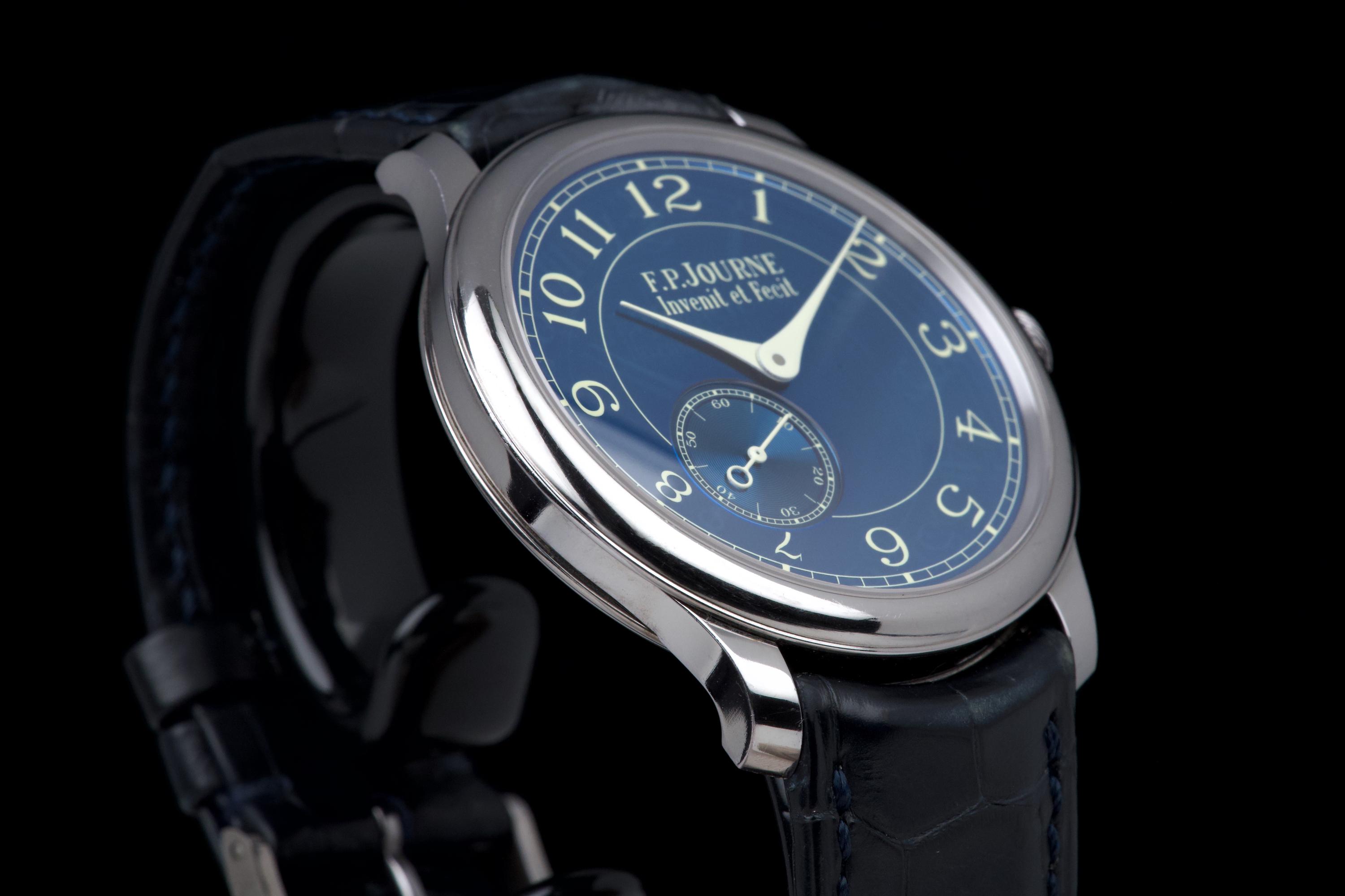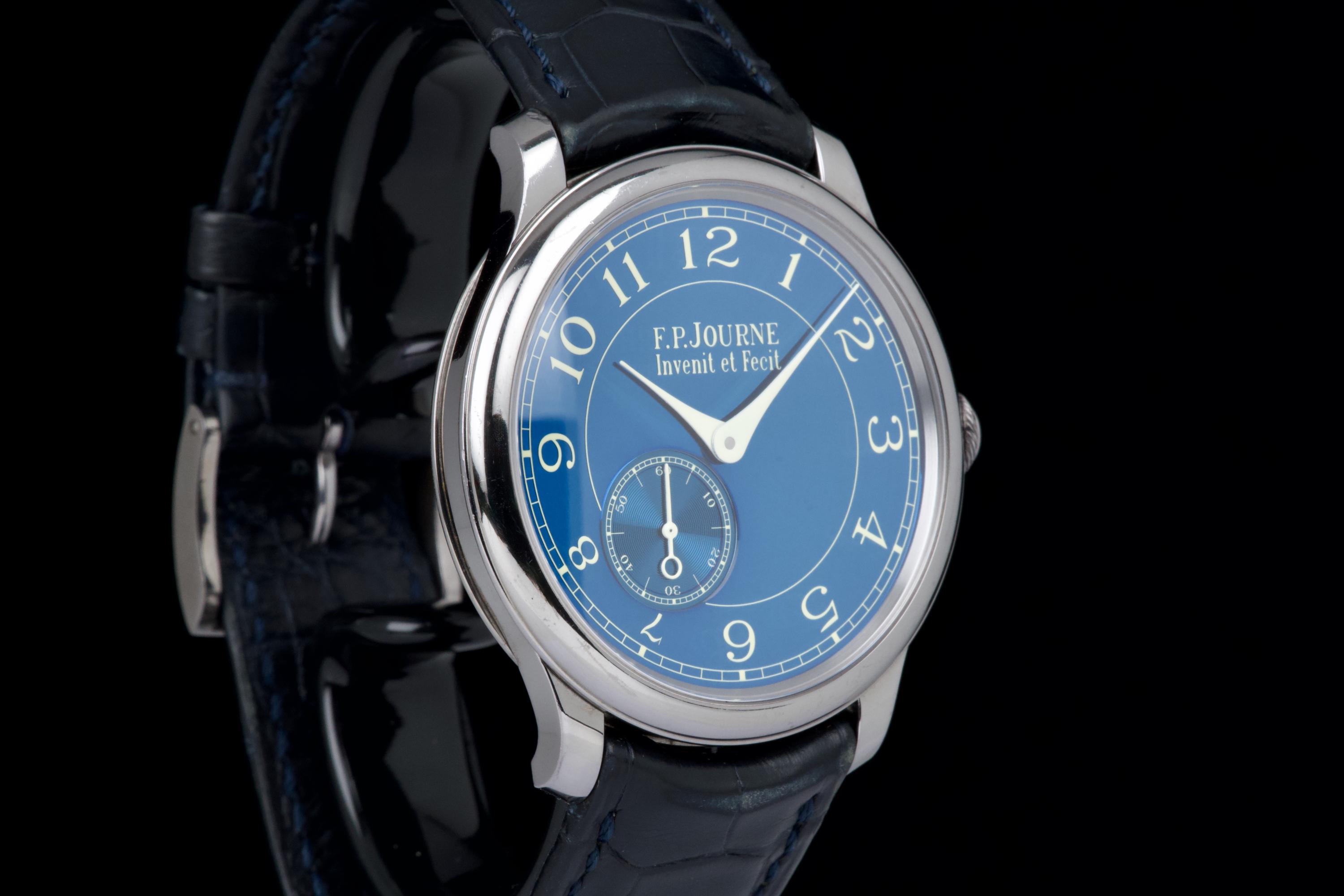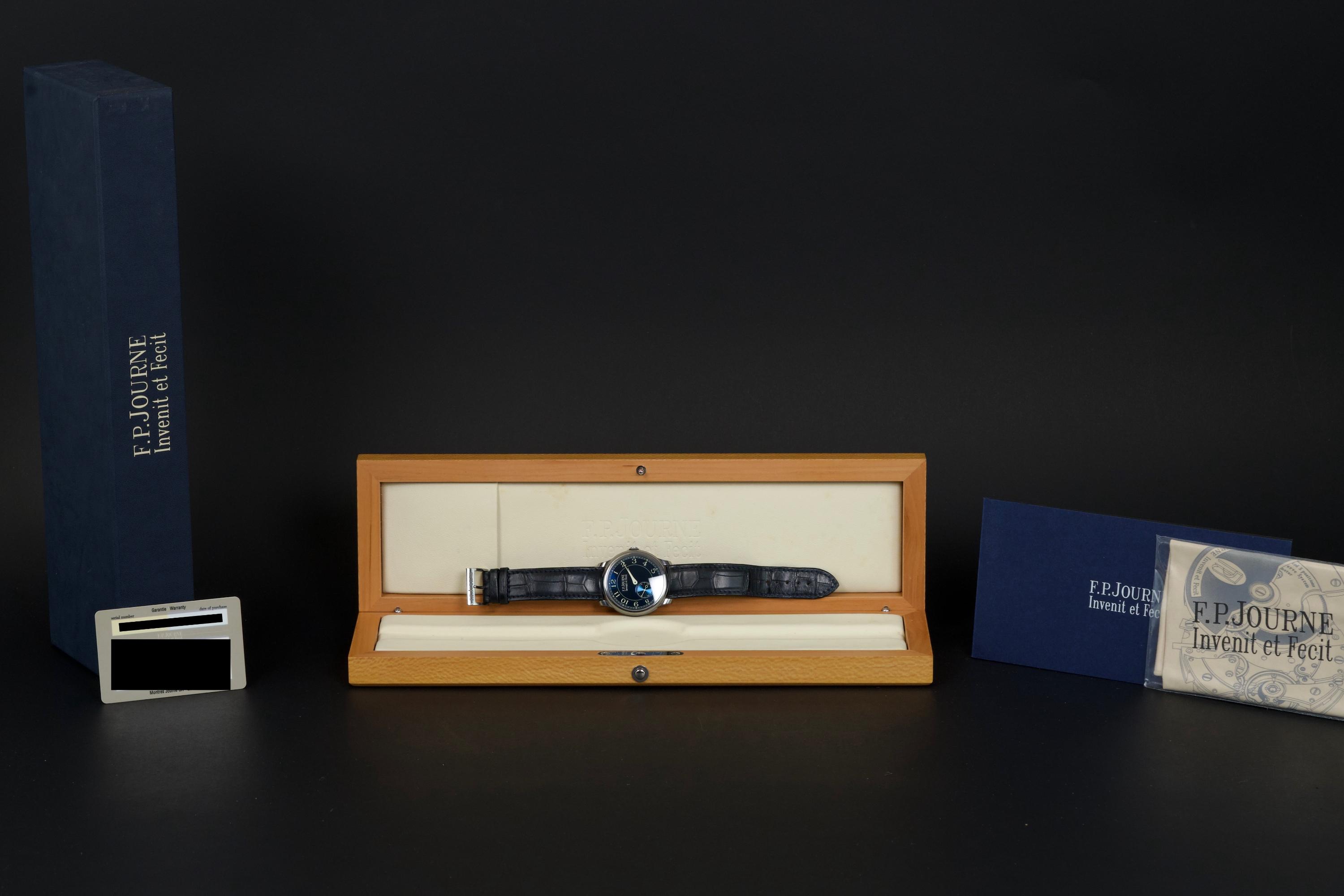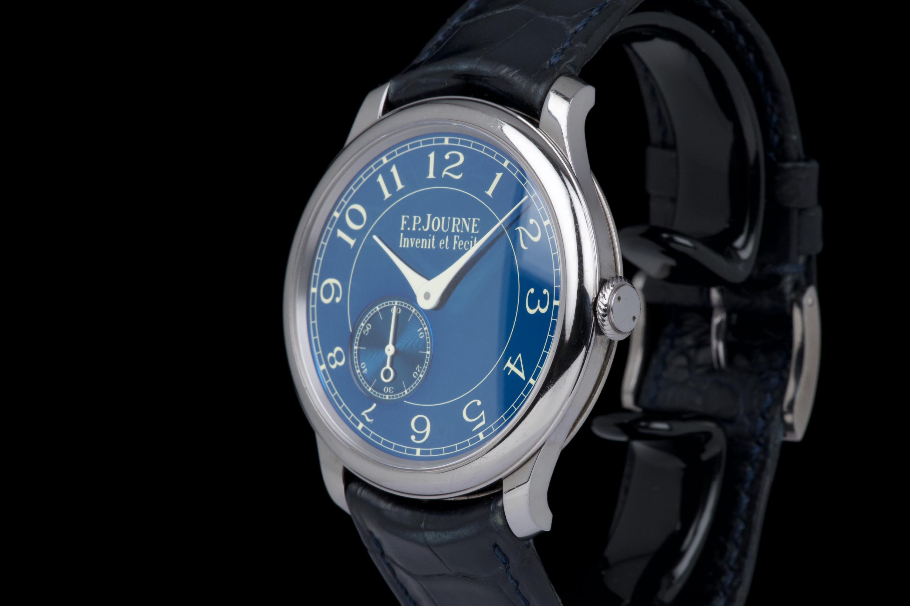 A beautiful and well-preserved example of the F.P. Journe Chronomètre Bleu, presented in very good overall condition for its age. The tantalum case remains unpolished, retaining its original shape and lustre. The deep blue chrome dial reflects light in a striking, almost liquid way — a signature of this iconic model. Powered by the manual-winding F.P. Journe caliber 1304, crafted in solid 18K rose gold, visible through the sapphire caseback. Complete with its original box, warranty card, and accessories. A timeless and highly sought-after F.P. Journe classic — elegant, minimal, and beautifully preserved.