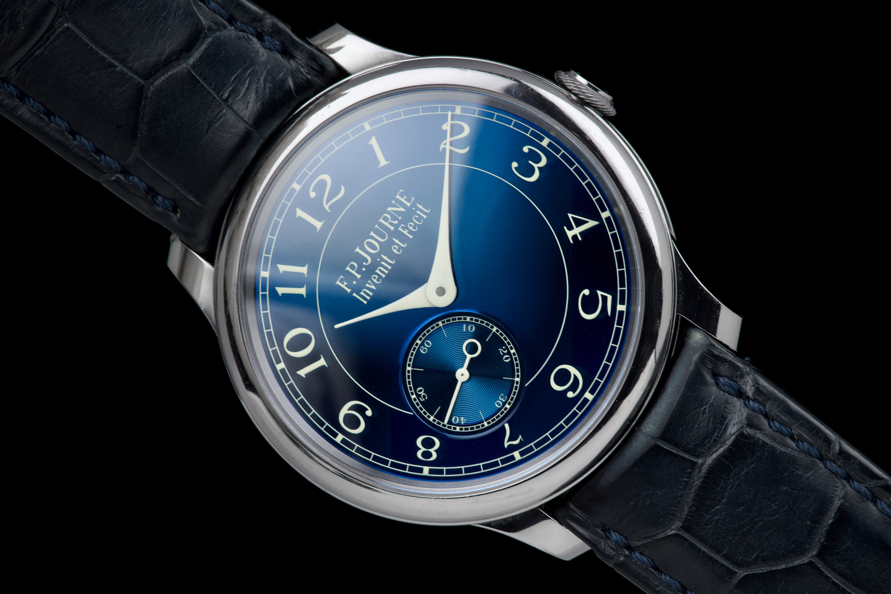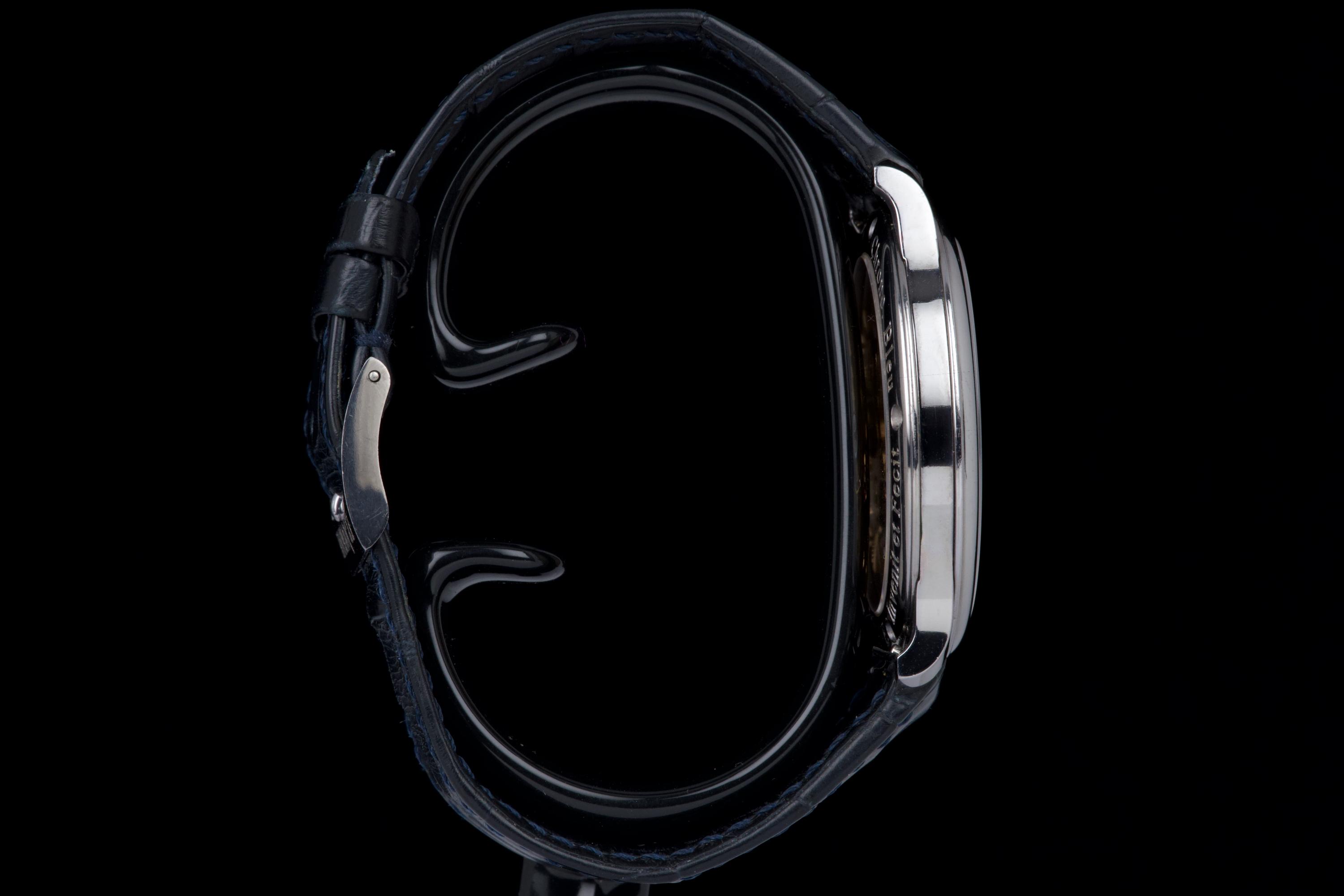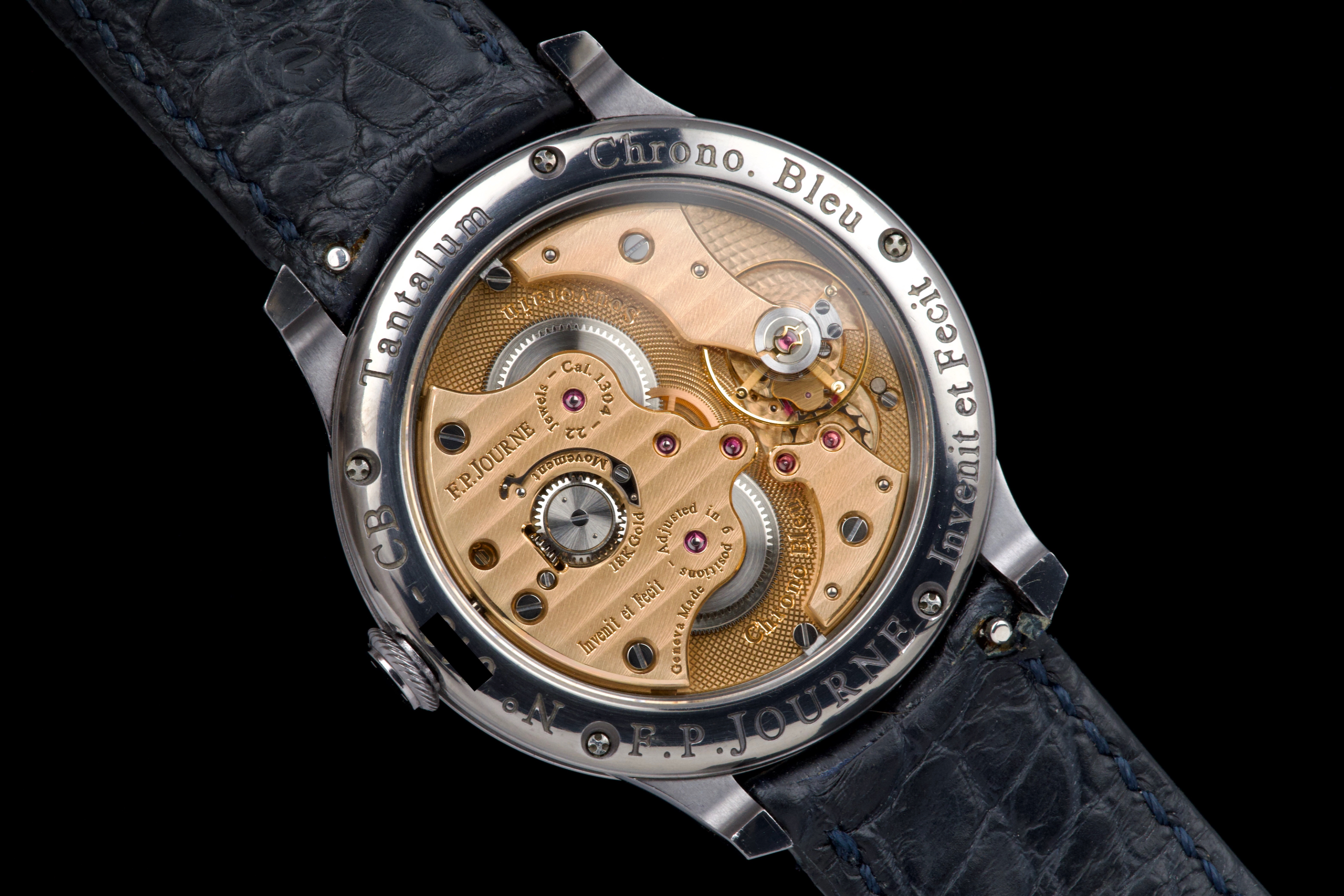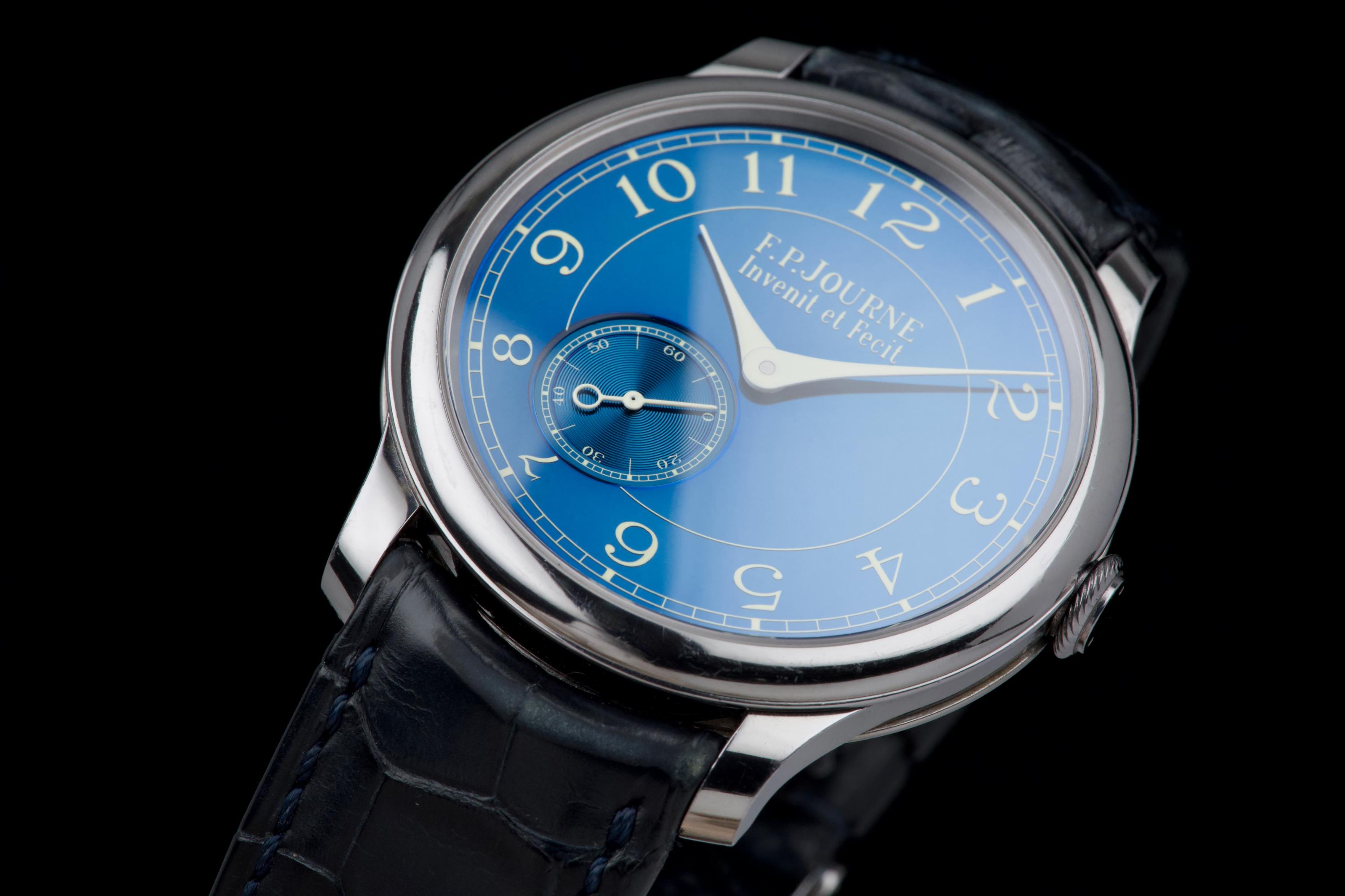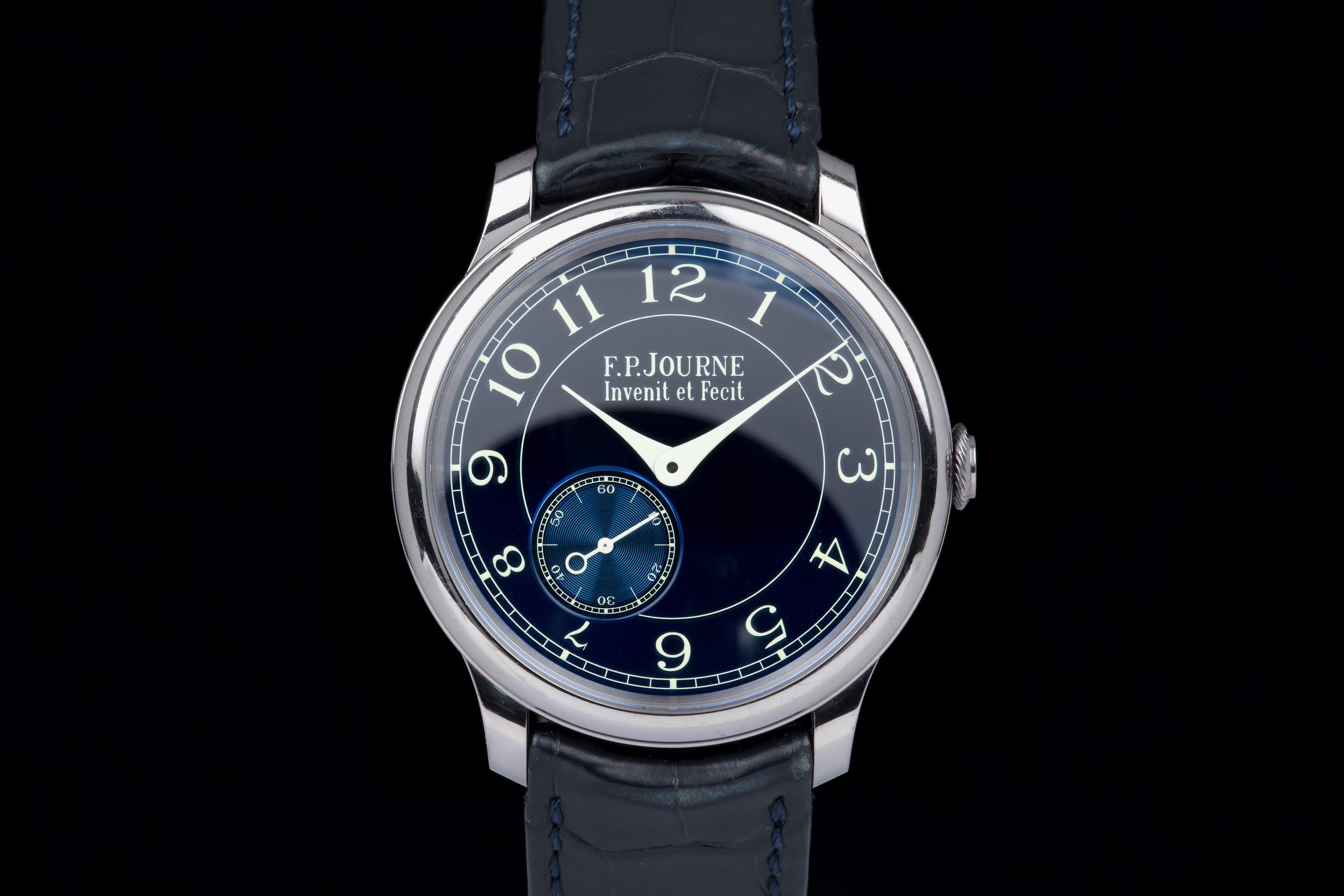 A beautiful and well-preserved example of the F.P. Journe Chronomètre Bleu, presented in very good overall condition for its age. The tantalum case remains unpolished, retaining its original shape and lustre. The deep blue chrome dial reflects light in a striking, almost liquid way — a signature of this iconic model. Powered by the manual-winding F.P. Journe caliber 1304, crafted in solid 18K rose gold, visible through the sapphire caseback. Complete with its original box, warranty card, and accessories. A timeless and highly sought-after F.P. Journe classic — elegant, minimal, and beautifully preserved.