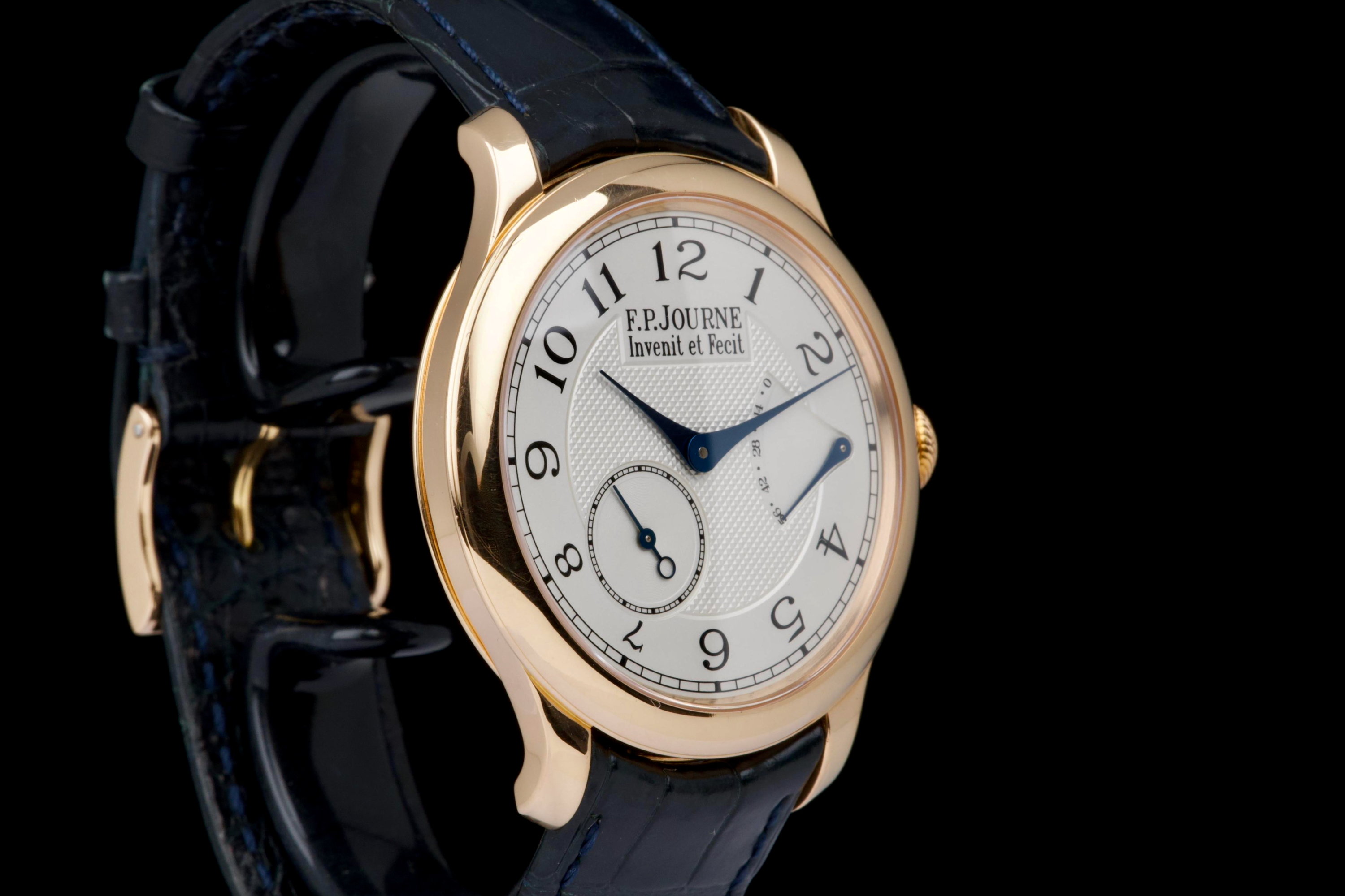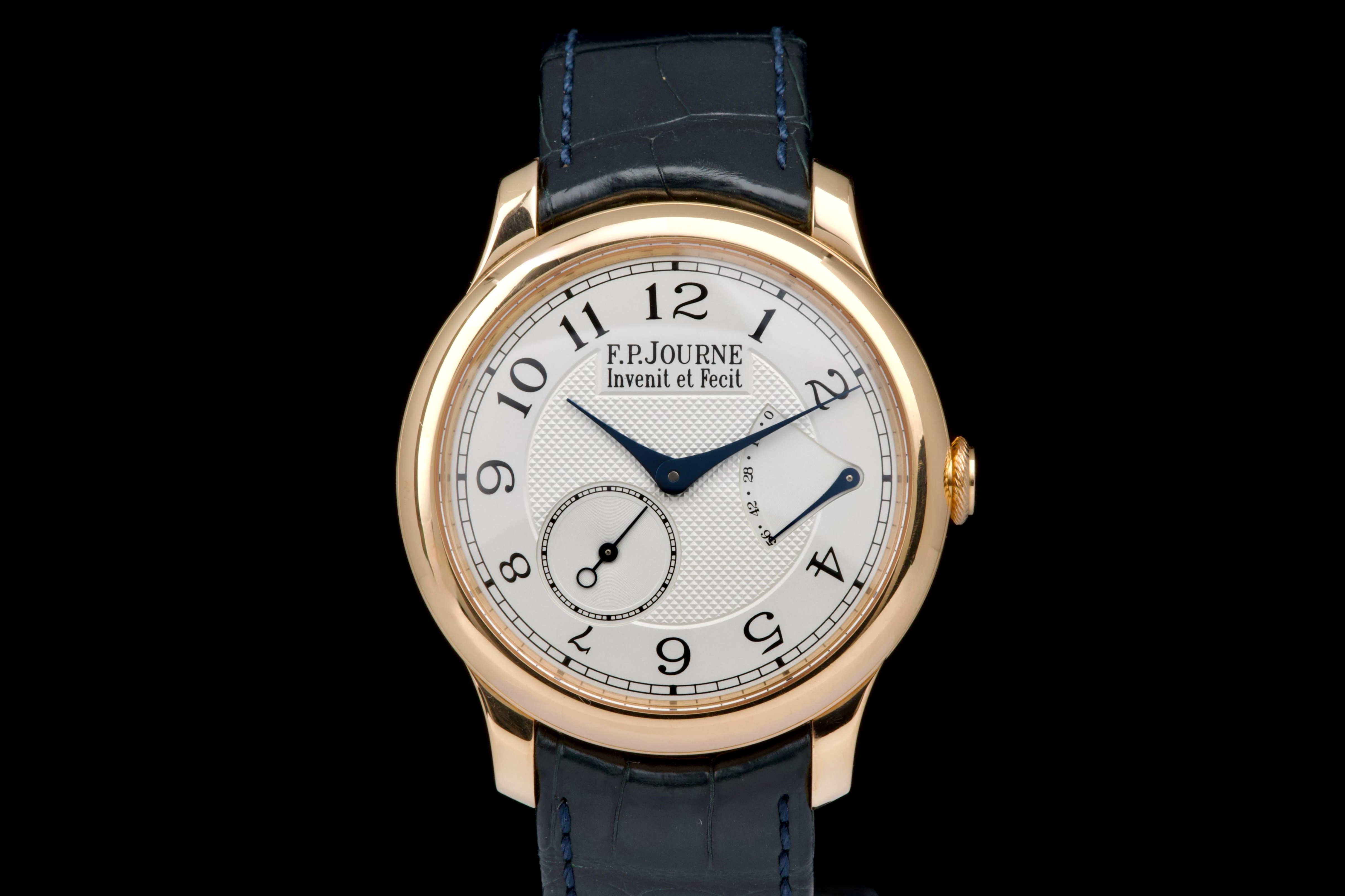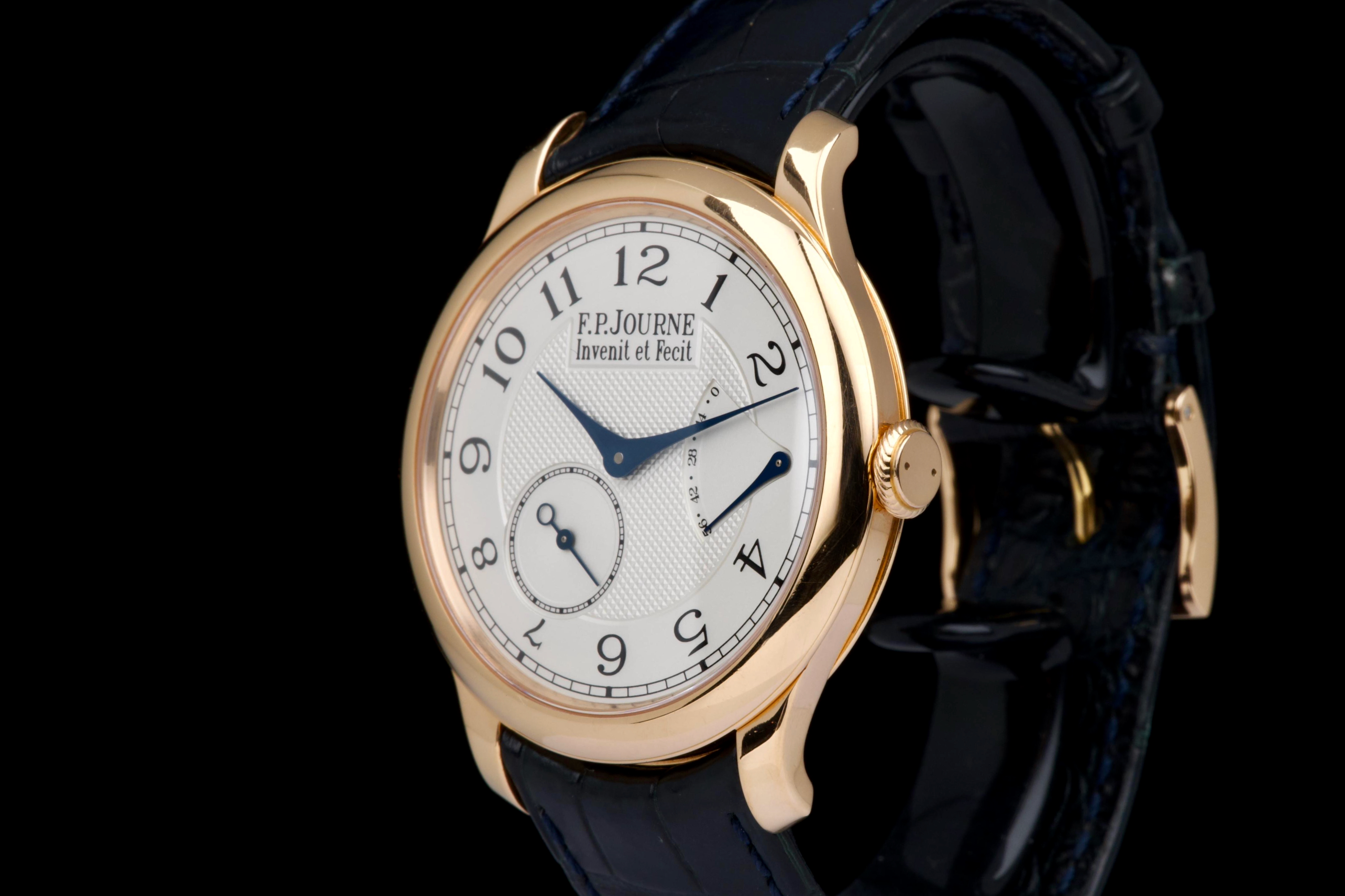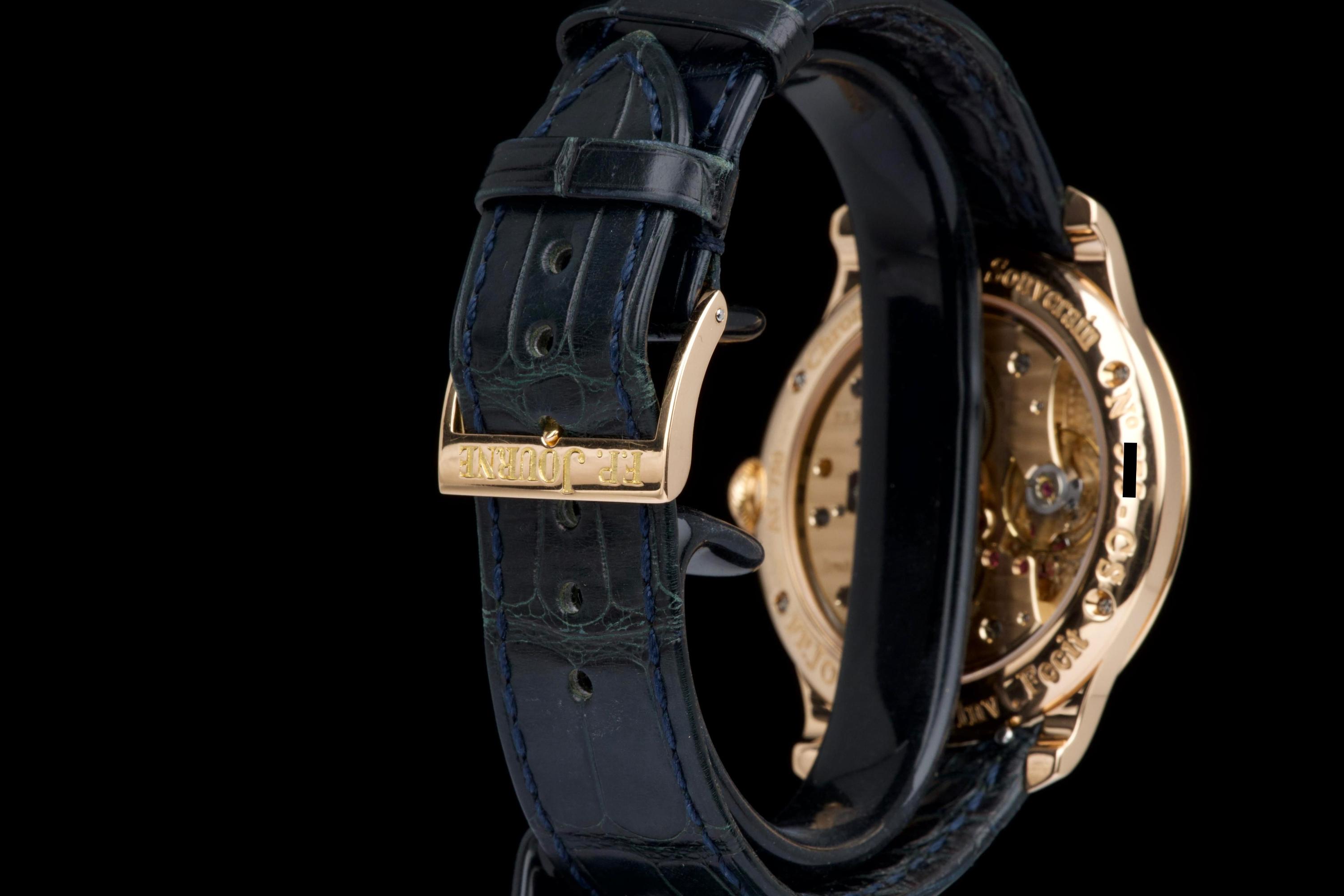 The present F.P. Journe Chronomètre Souverain in rose gold, dating to 2007, is a refined and highly desirable example of one of François-Paul Journe’s most emblematic creations. Measuring 40 mm in diameter, the watch offers ideal contemporary proportions while remaining true to Journe’s restrained and elegant design language. The watch was fully serviced and polished by F.P. Journe London in 2024, at a documented cost of £2,340, ensuring optimal mechanical performance and exceptional cosmetic presentation. The rose-gold case is now in excellent overall condition and shows only very light wear consistent with careful use since the service. The dial is executed in classic Journe style, featuring a white guilloché centre that provides depth and texture, complemented by elegant blued steel hands that offer both contrast and visual refinement. The overall aesthetic is timeless, balanced, and unmistakably Journe. The watch is fitted with a blue alligator leather strap in good condition, paired with a rose-gold ardillon buckle, maintaining full material and aesthetic coherence. It is accompanied by its original box and the recent F.P. Journe service documentation from 2024, adding significant reassurance and value. Combining recent factory service, excellent overall condition, and the enduring appeal of one of F.P. Journe’s most celebrated references, this Chronomètre Souverain represents a compelling opportunity to acquire a modern independent horological classic with strong provenance and immediate wearability.