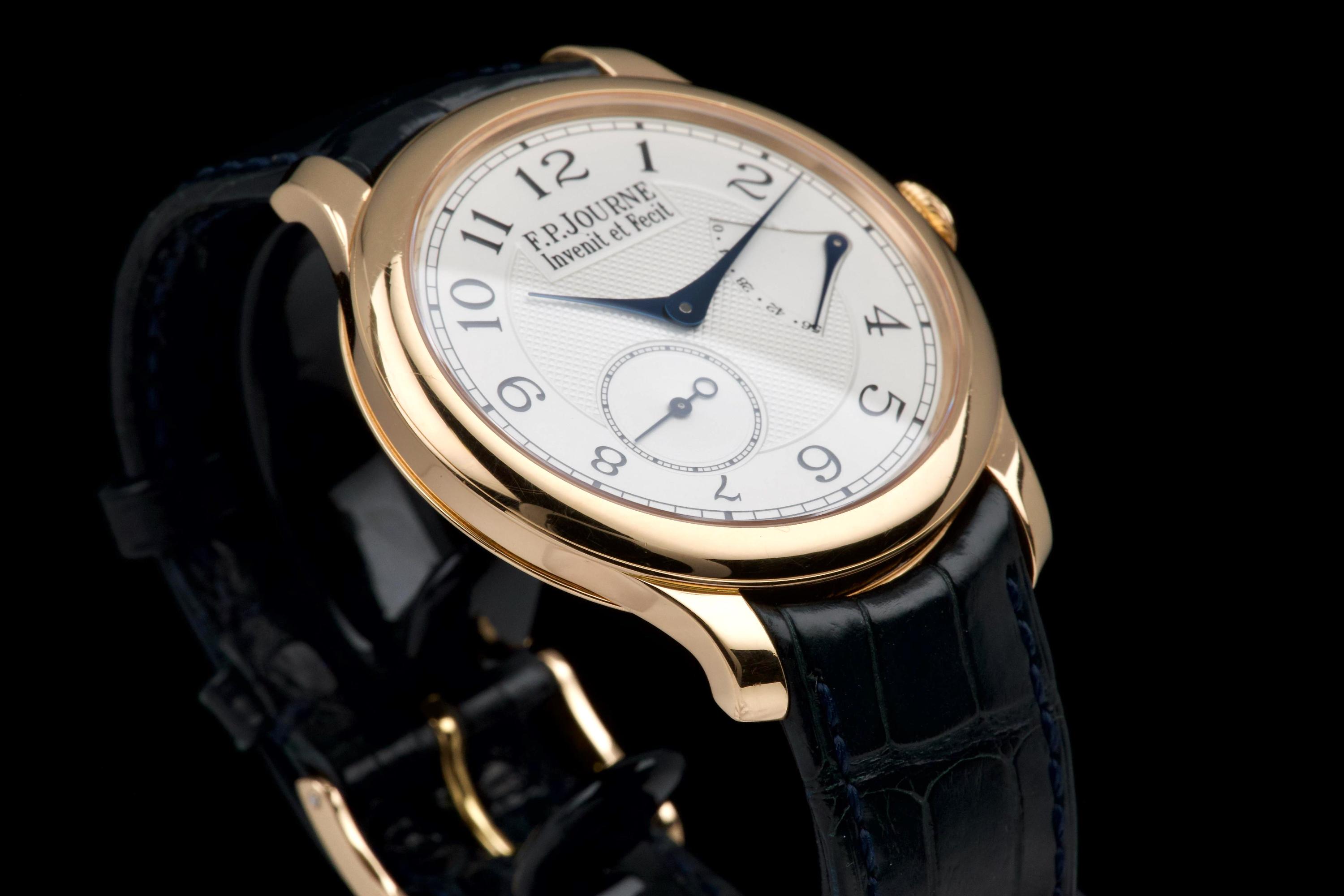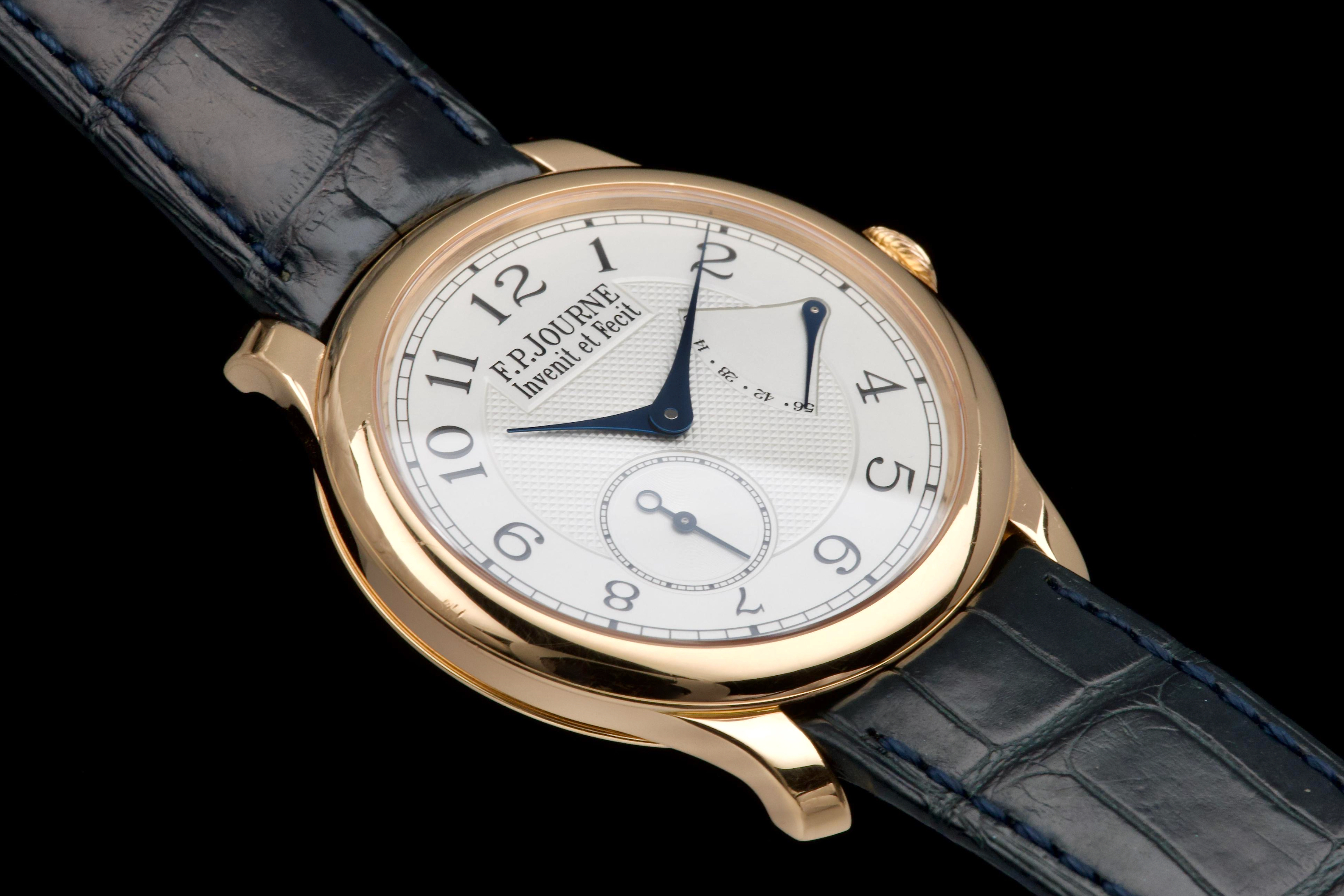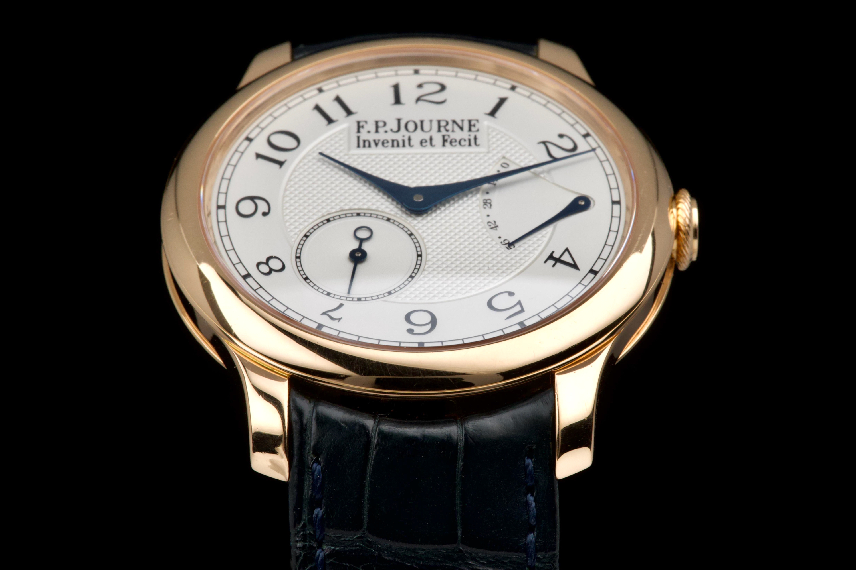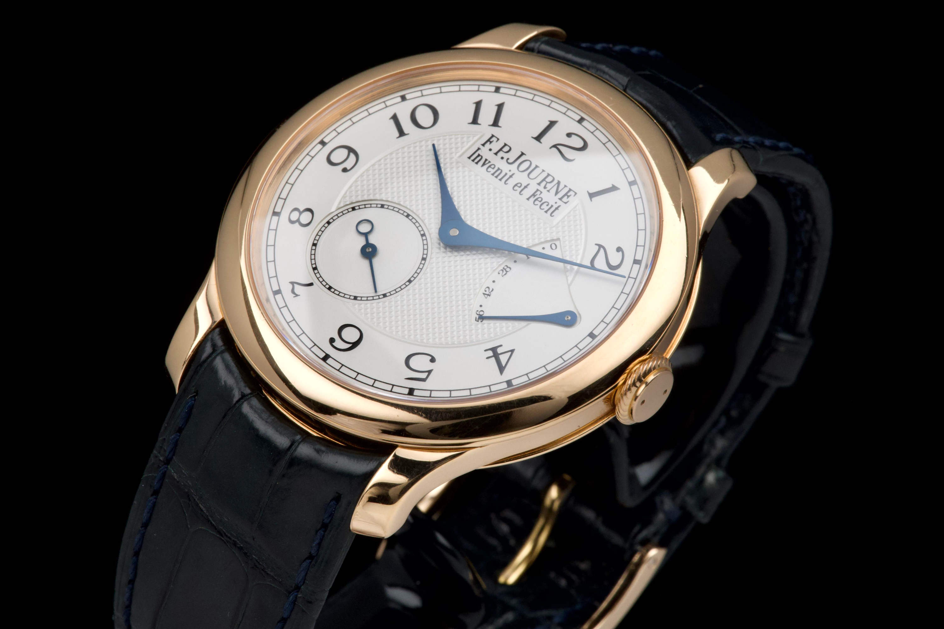The present F.P. Journe Chronomètre Souverain in rose gold, dating to 2007, is a refined and highly desirable example of one of François-Paul Journe’s most emblematic creations. Measuring 40 mm in diameter, the watch offers ideal contemporary proportions while remaining true to Journe’s restrained and elegant design language. The watch was fully serviced and polished by F.P. Journe London in 2024, at a documented cost of £2,340, ensuring optimal mechanical performance and exceptional cosmetic presentation. The rose-gold case is now in excellent overall condition and shows only very light wear consistent with careful use since the service. The dial is executed in classic Journe style, featuring a white guilloché centre that provides depth and texture, complemented by elegant blued steel hands that offer both contrast and visual refinement. The overall aesthetic is timeless, balanced, and unmistakably Journe. The watch is fitted with a blue alligator leather strap in good condition, paired with a rose-gold ardillon buckle, maintaining full material and aesthetic coherence. It is accompanied by its original box and the recent F.P. Journe service documentation from 2024, adding significant reassurance and value. Combining recent factory service, excellent overall condition, and the enduring appeal of one of F.P. Journe’s most celebrated references, this Chronomètre Souverain represents a compelling opportunity to acquire a modern independent horological classic with strong provenance and immediate wearability.
