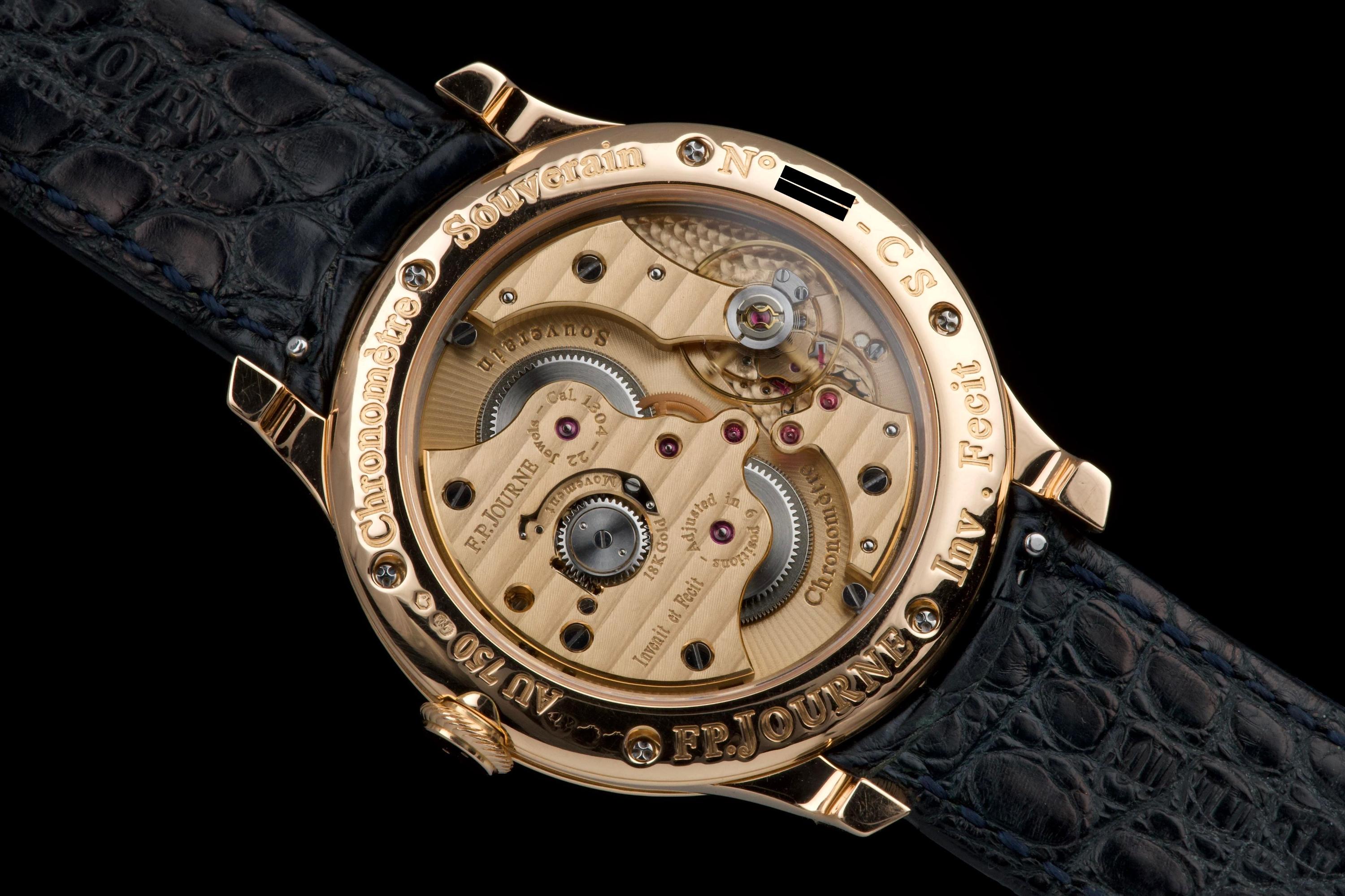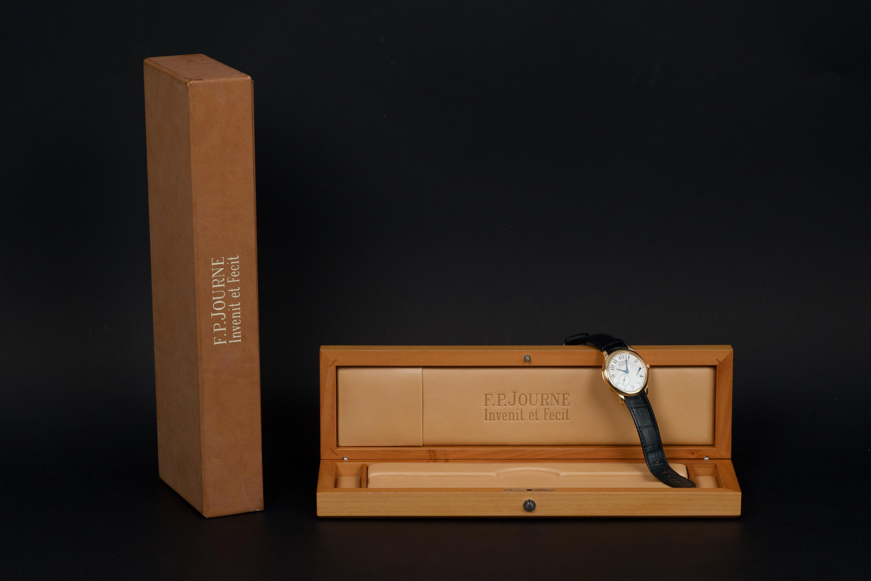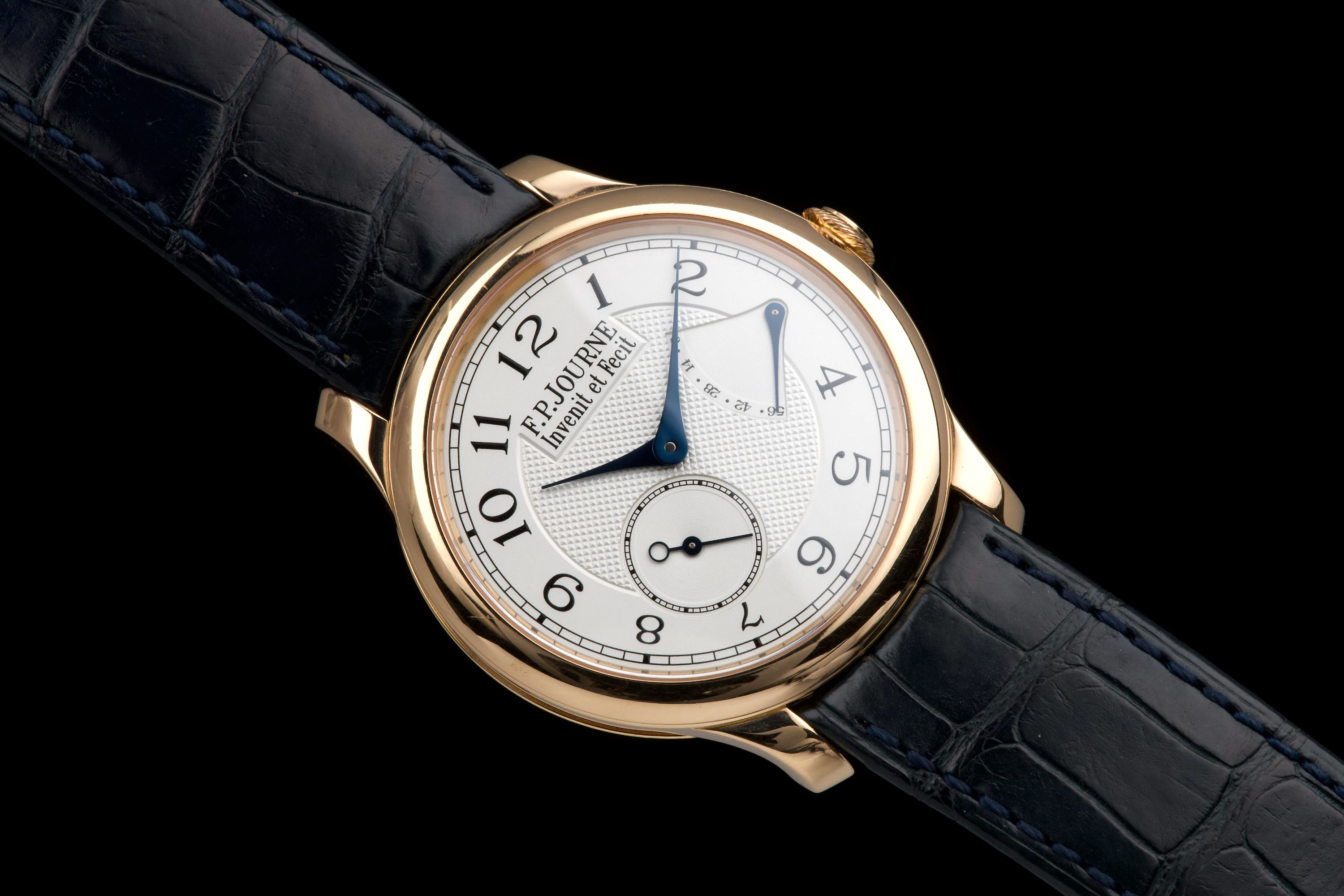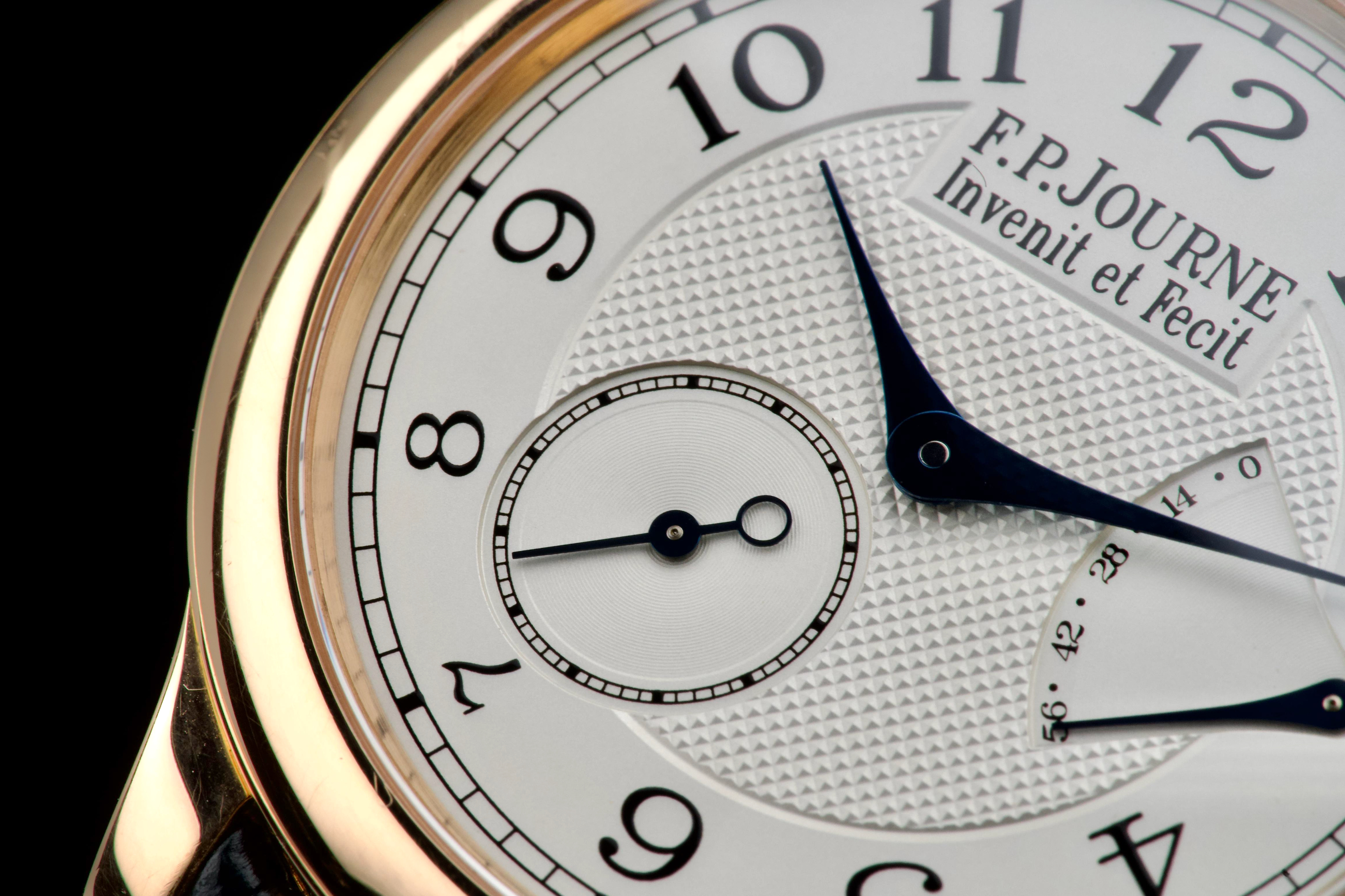 The present F.P. Journe Chronomètre Souverain in rose gold, dating to 2007, is a refined and highly desirable example of one of François-Paul Journe’s most emblematic creations. Measuring 40 mm in diameter, the watch offers ideal contemporary proportions while remaining true to Journe’s restrained and elegant design language. The watch was fully serviced and polished by F.P. Journe London in 2024, at a documented cost of £2,340, ensuring optimal mechanical performance and exceptional cosmetic presentation. The rose-gold case is now in excellent overall condition and shows only very light wear consistent with careful use since the service. The dial is executed in classic Journe style, featuring a white guilloché centre that provides depth and texture, complemented by elegant blued steel hands that offer both contrast and visual refinement. The overall aesthetic is timeless, balanced, and unmistakably Journe. The watch is fitted with a blue alligator leather strap in good condition, paired with a rose-gold ardillon buckle, maintaining full material and aesthetic coherence. It is accompanied by its original box and the recent F.P. Journe service documentation from 2024, adding significant reassurance and value. Combining recent factory service, excellent overall condition, and the enduring appeal of one of F.P. Journe’s most celebrated references, this Chronomètre Souverain represents a compelling opportunity to acquire a modern independent horological classic with strong provenance and immediate wearability.