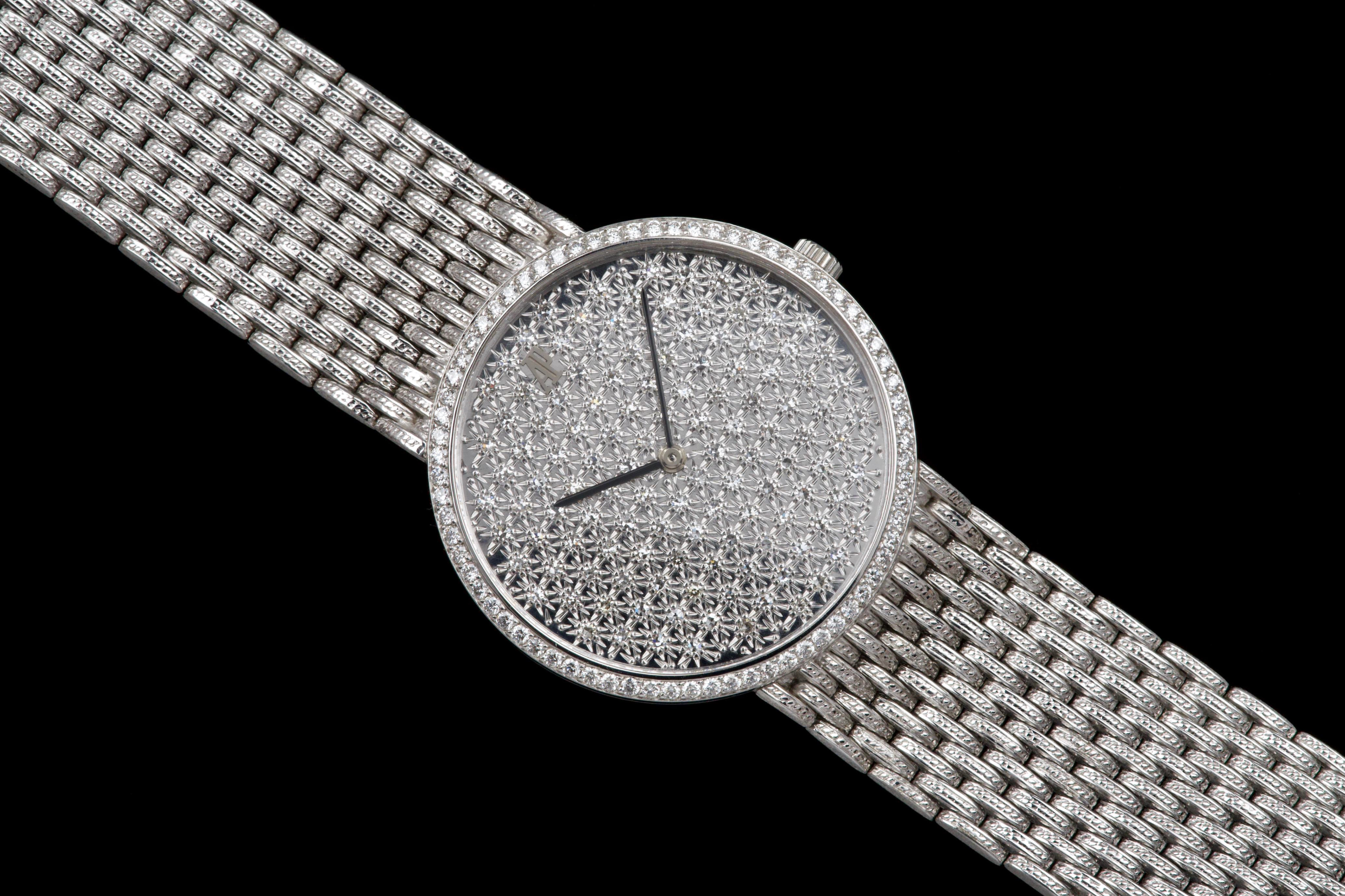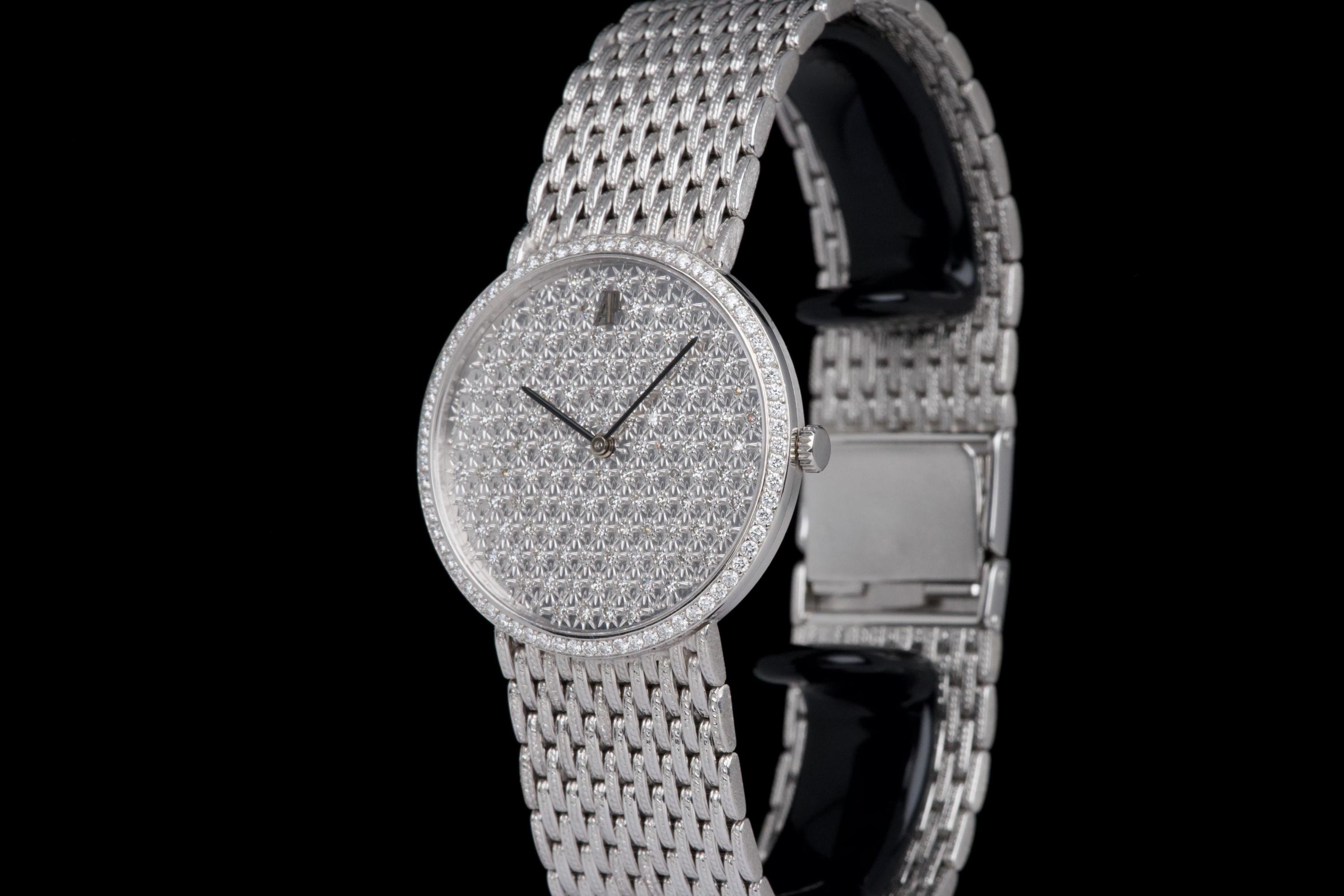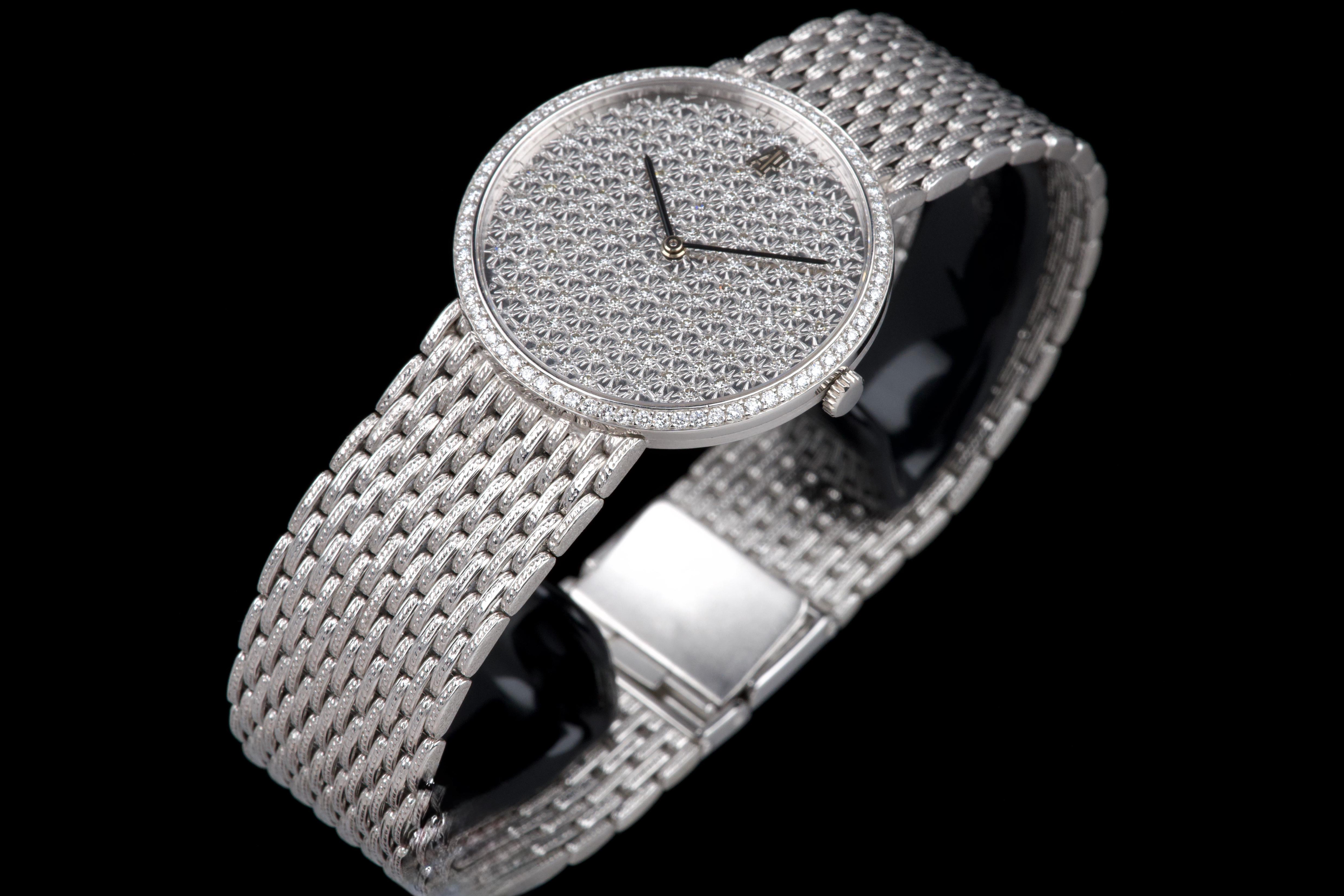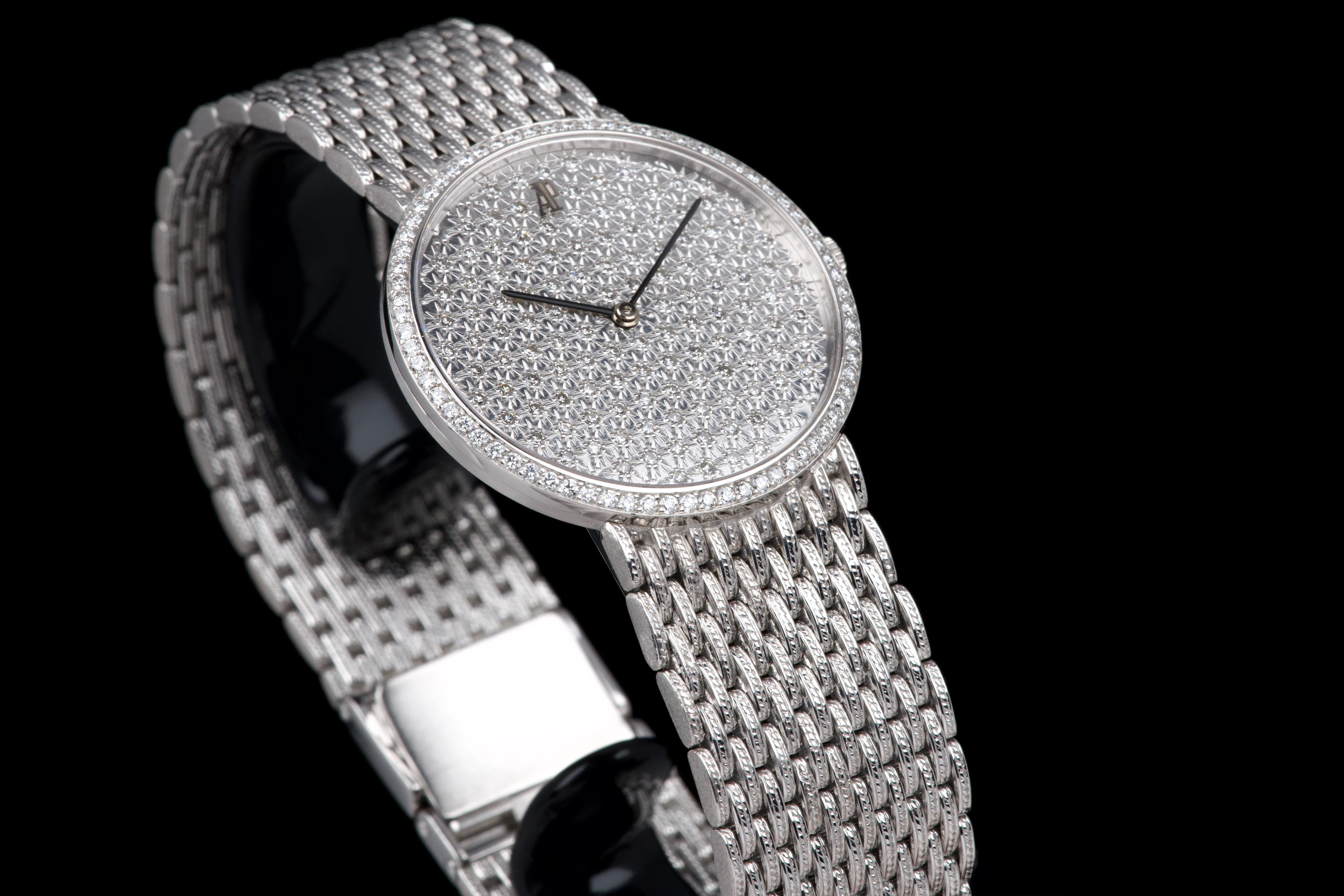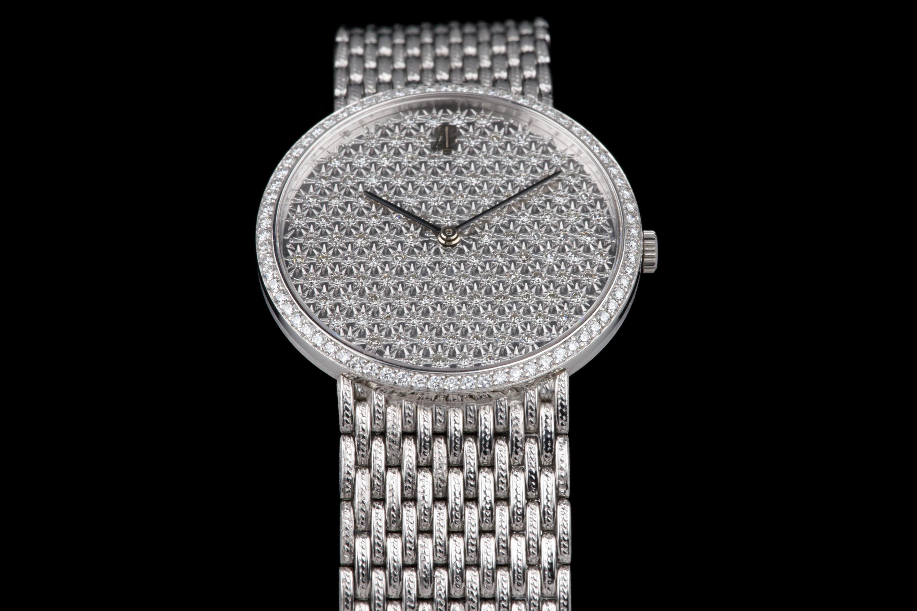 The present Audemars Piguet Classic reference 14549BC, dating to the 1970s, is an exceptionally rare and striking white-gold bracelet watch that perfectly reflects the bold and luxurious aesthetic of the era. Executed entirely in 18K white gold, the watch features a 31 mm round case set with a brilliant diamond-set bezel and a spectacular pavé diamond dial, creating a dazzling and highly refined appearance. The watch is further distinguished by its integrated “paillasson”-style white-gold bracelet, seamlessly soldered to the case and fully signed Audemars Piguet. The bracelet is generously proportioned and can accommodate wrists of up to approximately 19 cm, making it particularly comfortable despite its jewelry-like construction. The watch is powered by a manual-winding movement, consistent with the elegant, ultra-refined nature of high-jewelry watches produced by the manufacture during this period. It is likely that the watch has been recently serviced and polished by Audemars Piguet, as it is accompanied by a service presentation box, although no service invoice is present. The watch is preserved in excellent overall condition, with the diamonds, case, and bracelet presenting beautifully. Rare, luxurious, and emblematic of the daring design language of the 1970s, this Audemars Piguet reference 14549BC represents a remarkable opportunity to acquire an unusual and highly collectible vintage high-jewelry wristwatch from one of Switzerland’s most prestigious manufactures.