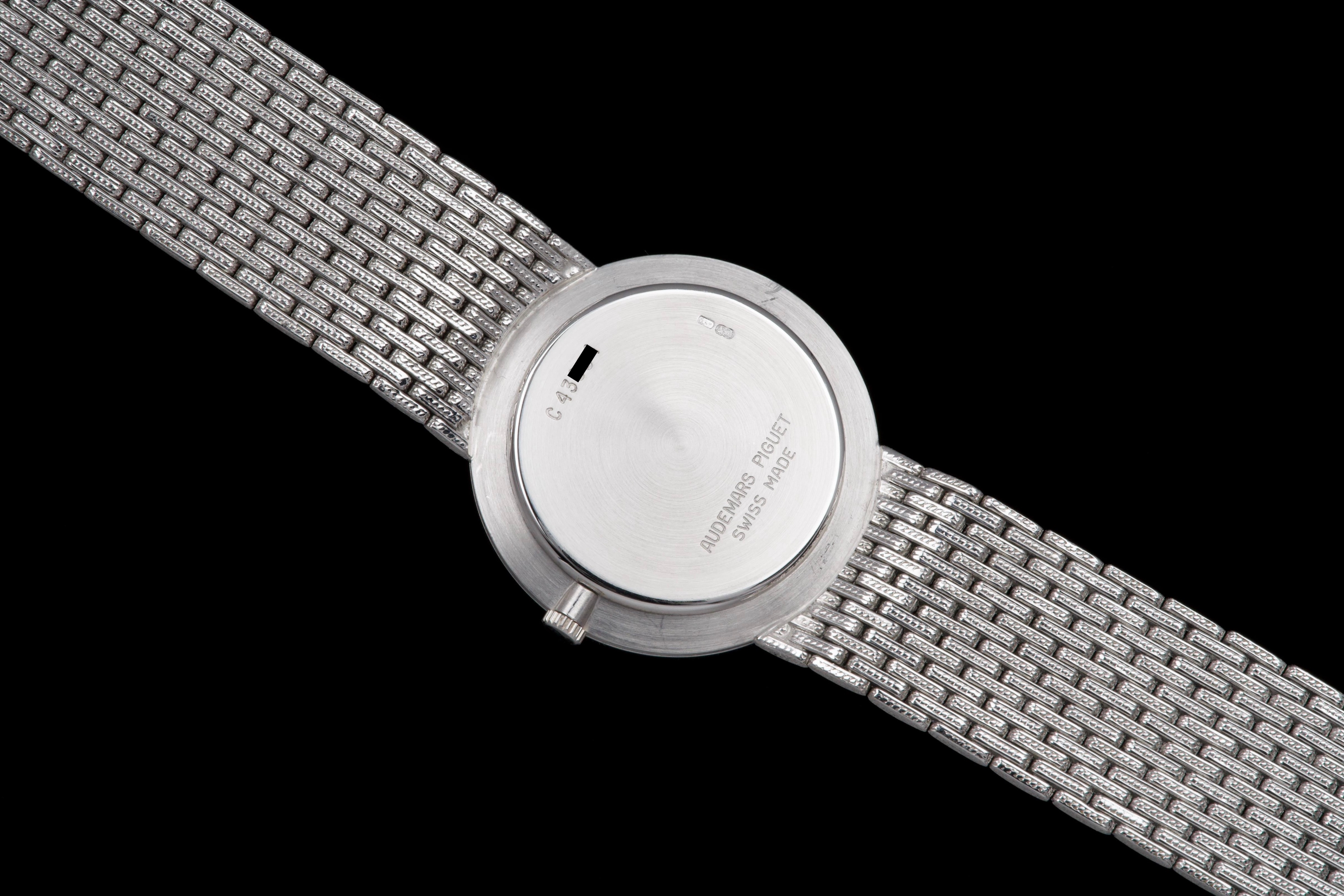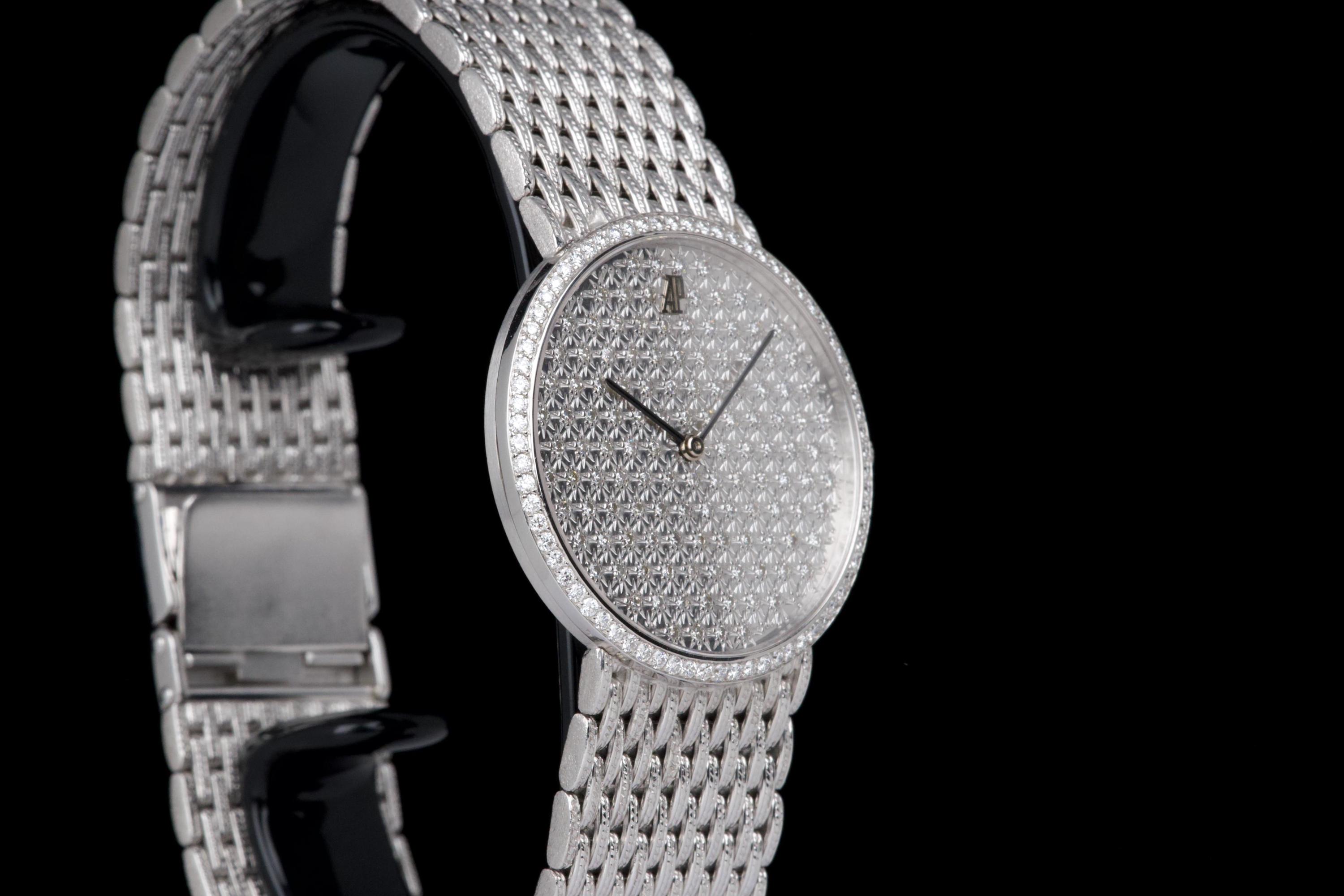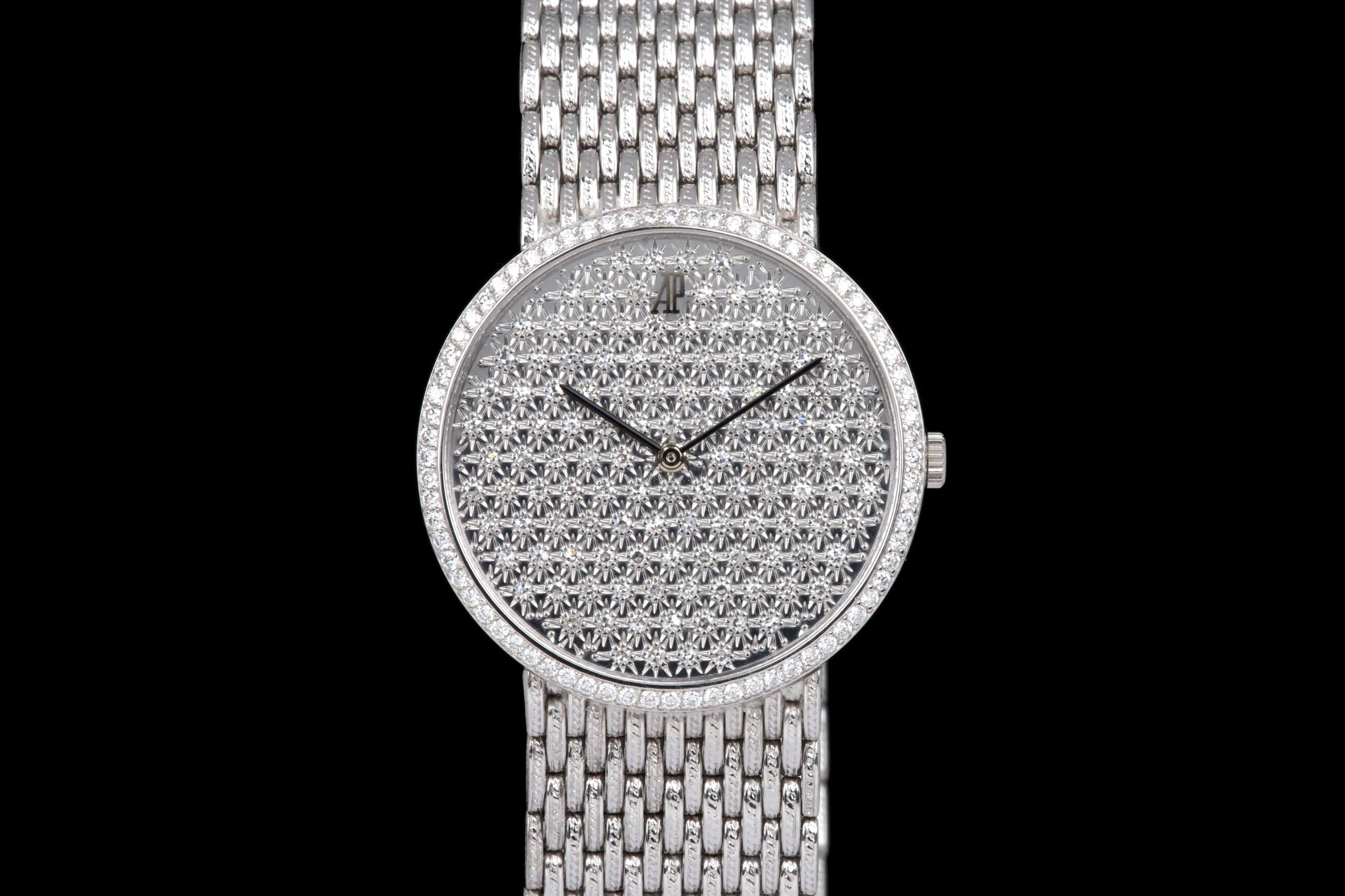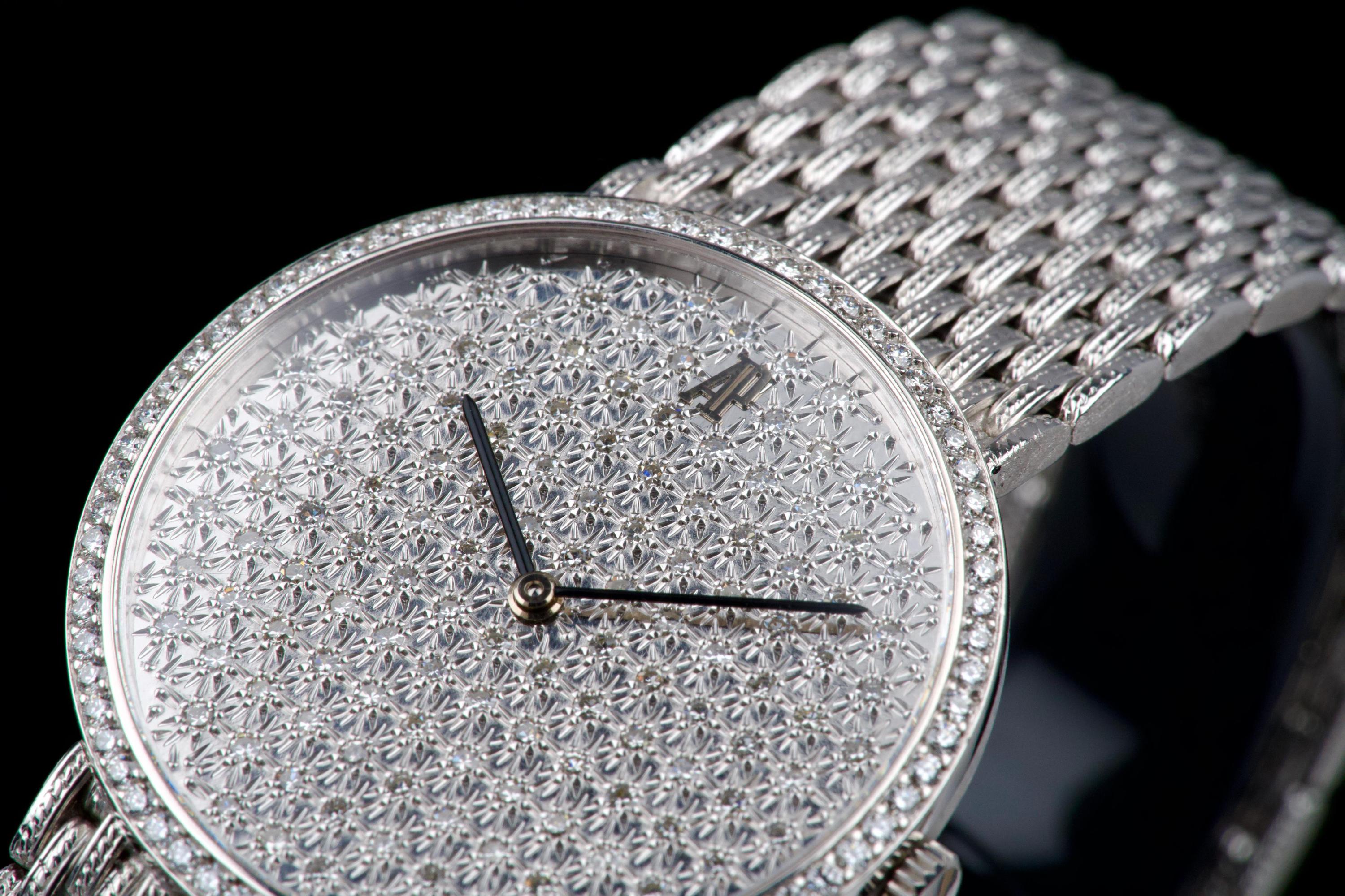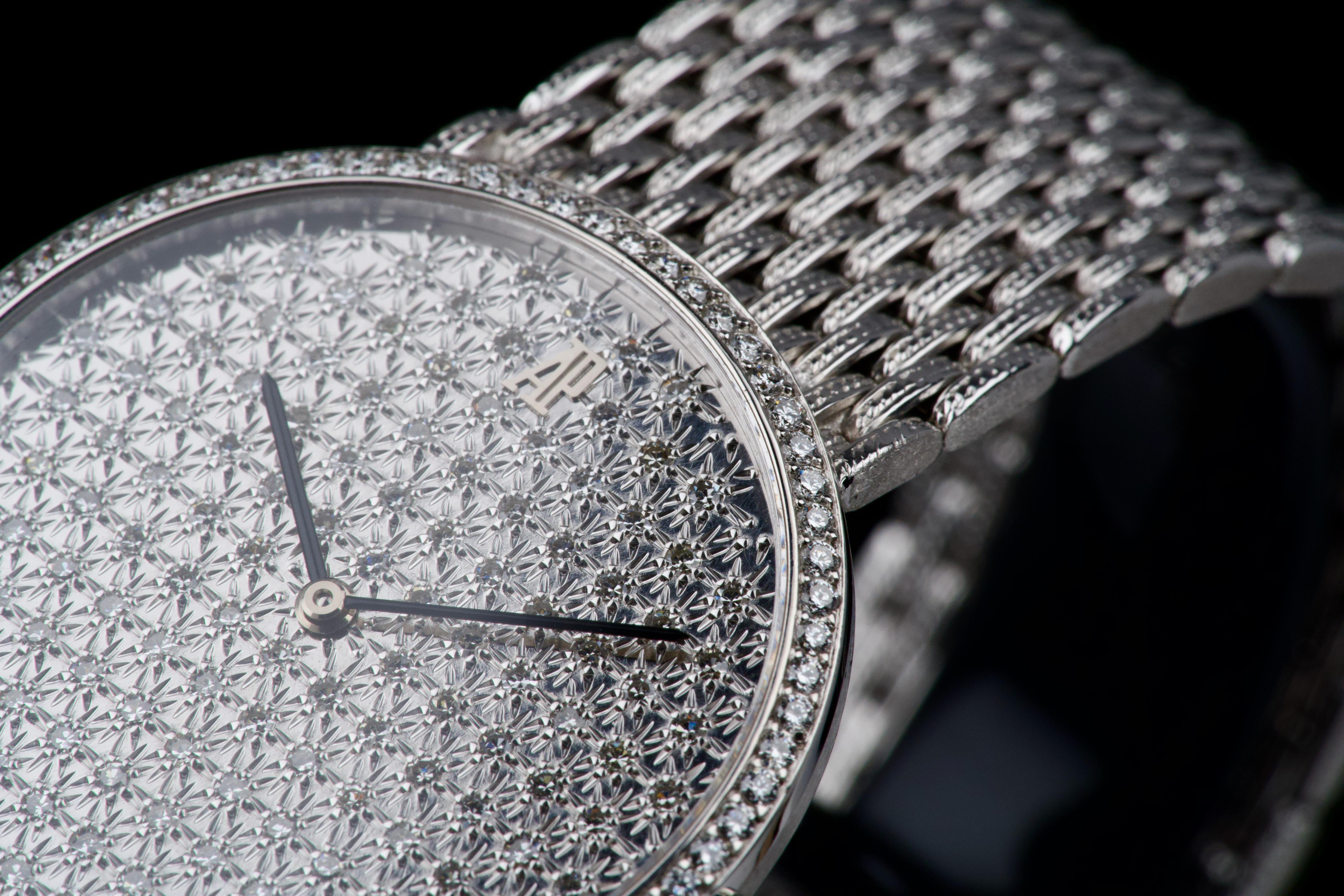 The present Audemars Piguet Classic reference 14549BC, dating to the 1970s, is an exceptionally rare and striking white-gold bracelet watch that perfectly reflects the bold and luxurious aesthetic of the era. Executed entirely in 18K white gold, the watch features a 31 mm round case set with a brilliant diamond-set bezel and a spectacular pavé diamond dial, creating a dazzling and highly refined appearance. The watch is further distinguished by its integrated “paillasson”-style white-gold bracelet, seamlessly soldered to the case and fully signed Audemars Piguet. The bracelet is generously proportioned and can accommodate wrists of up to approximately 19 cm, making it particularly comfortable despite its jewelry-like construction. The watch is powered by a manual-winding movement, consistent with the elegant, ultra-refined nature of high-jewelry watches produced by the manufacture during this period. It is likely that the watch has been recently serviced and polished by Audemars Piguet, as it is accompanied by a service presentation box, although no service invoice is present. The watch is preserved in excellent overall condition, with the diamonds, case, and bracelet presenting beautifully. Rare, luxurious, and emblematic of the daring design language of the 1970s, this Audemars Piguet reference 14549BC represents a remarkable opportunity to acquire an unusual and highly collectible vintage high-jewelry wristwatch from one of Switzerland’s most prestigious manufactures.